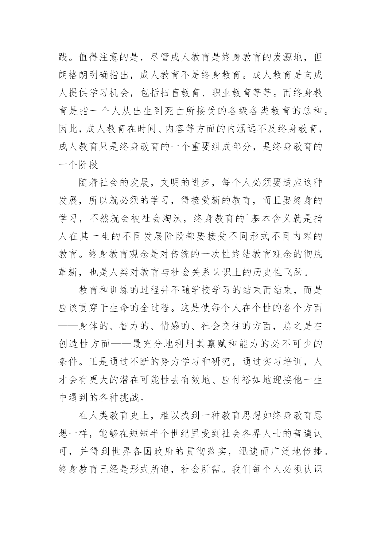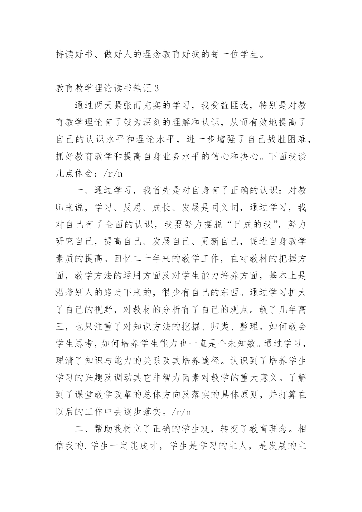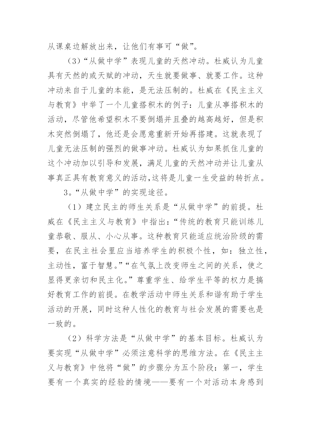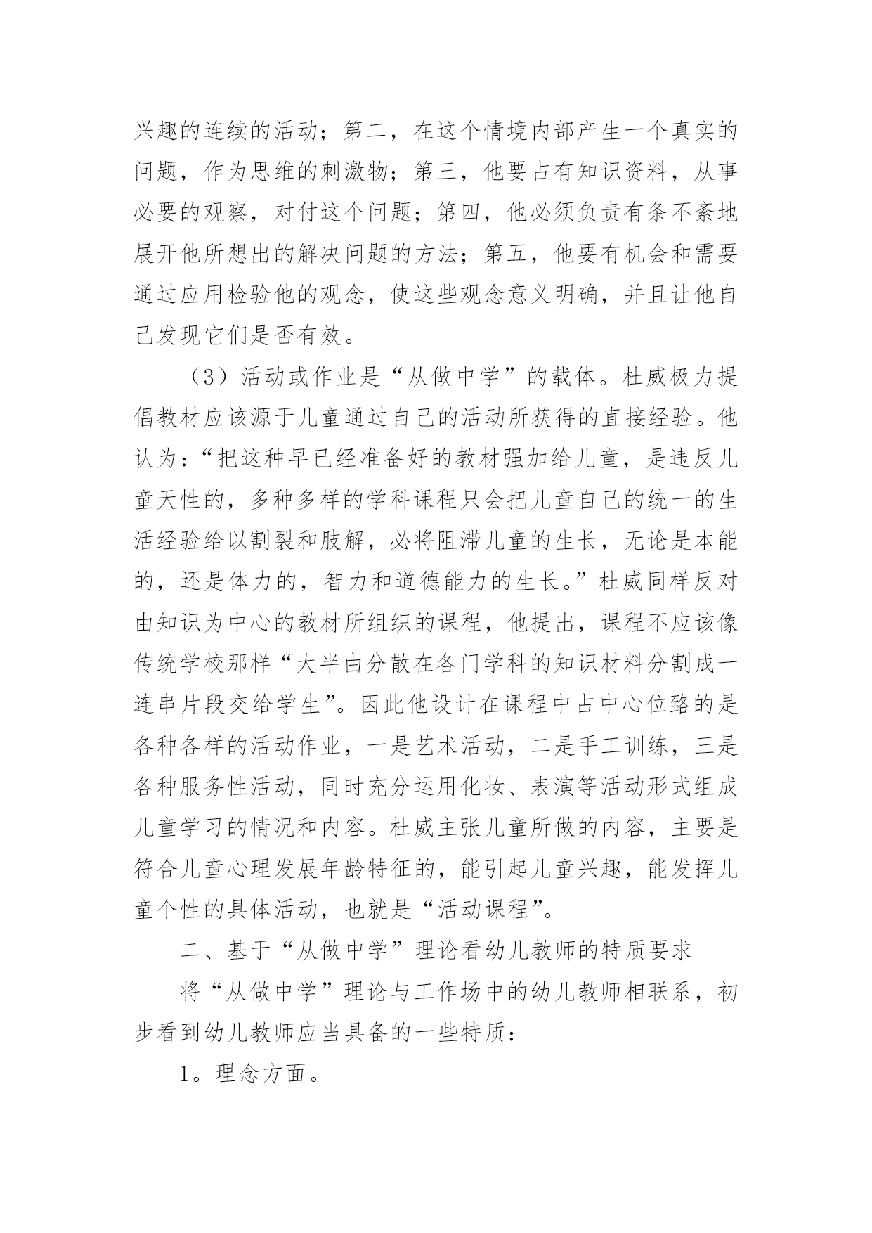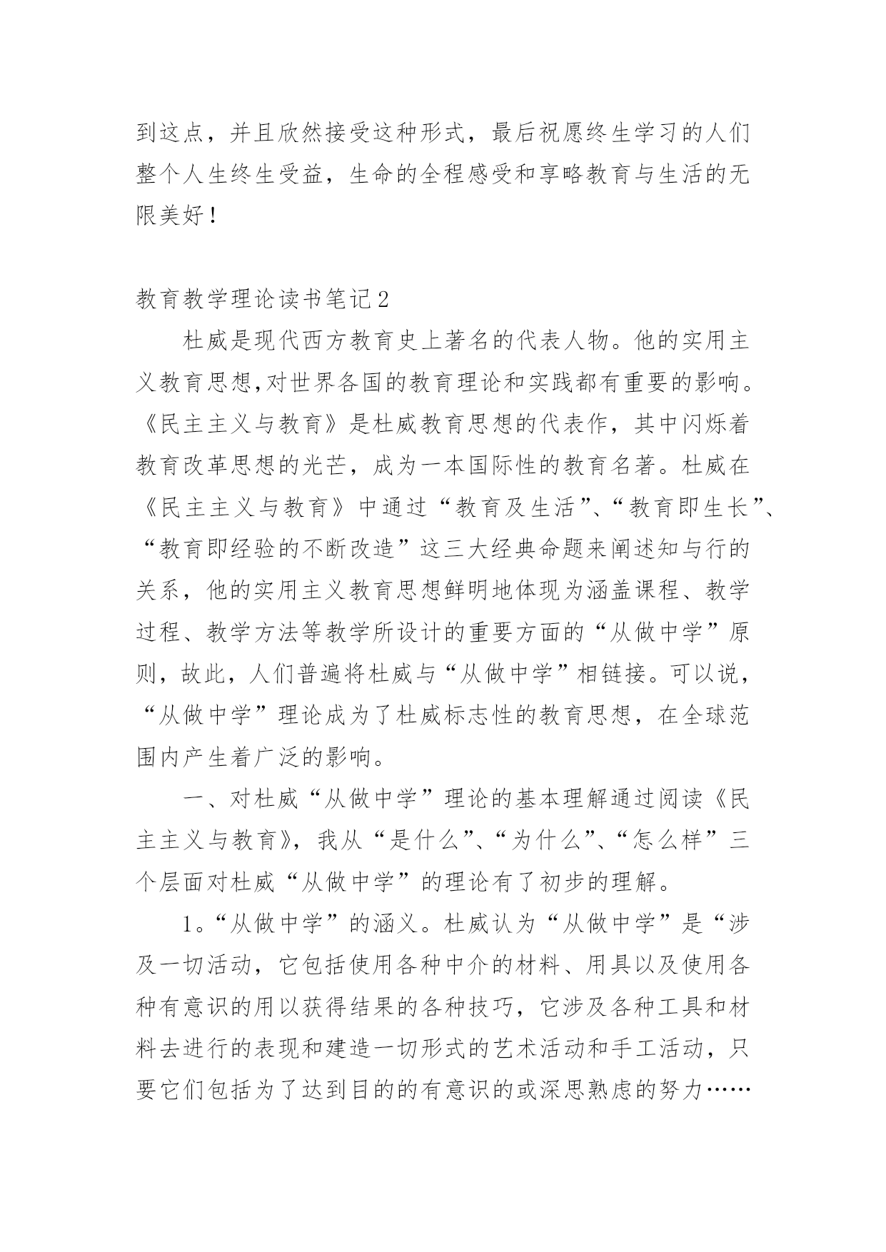 教育教学理论读书笔记细细品味一本名著后,你心中有什么感想呢?这时就有必须要写一篇读书笔记了!到底应如何写读书笔记呢?以下是小编整理的教育教学理论读书笔记,希望能够帮助到大家。教育教学理论读书笔记1这周读了法国教育家朗格朗的《终身教育引论》,感觉受益匪浅。我在读书之前喜欢了解一下作者,我觉得这样才能更好的去理解作者写的内容。保尔.朗格朗,是法国当代著名的成人教育家,终身教育理论的奠基者。1910年12月21日出生于法国加来的康普兰。大学毕业后,在中小学任教多年,积聚了丰富的教育实践经验。上世纪30年代转向成人教育实验,建立职工教育中心和“民众与文化”协会,富有成效的活动奠定了其成人教育思想基础。从1948年开始供职于联合国教科文组织秘书长,于1951年任联合国教科文组织成人科科长,后还担任继续教育科科长,终身教育科科长,教育研究所代理所长等职,于1971年从联合国教科文组织卸任。著作《终身教育引论》是终身教育思想的代表。我带着对作者的这些了解,走进了《终身教育引论》。朗格朗在《终身教育引论》中提出,成人教育是终身教育体制的“火车头”,视成人教育为终身教育体制中最有活力和潜力的部分。这一观点得益于朗格朗多年的成人教育实践。值得注意的是,尽管成人教育是终身教育的发源地,但朗格朗明确指出,成人教育不是终身教育。成人教育是向成人提供学习机会,包括扫盲教育、职业教育等等。而终身教育是指一个人从出生到死亡所接受的各级各类教育的总和。因此,成人教育在时间、内容等方面的内涵远不及终身教育,成人教育只是终身教育的一个重要组成部分,是终身教育的一个阶段随着社会的发展,文明的进步,每个人必须要适应这种发展,所以就必须的学习,得接受新的教育,而且要终身的学习,不然就会被社会淘汰,终身教育的`基本含义就是指人在其一生的不同发展阶段都要接受不同形式不同内容的教育。终身教育观念是对传统的一次性终结教育观念的彻底革新,也是人类对教育与社会关系认识上的历史性飞跃。教育和训练的过程并不随学校学习的结束而结束,而是应该贯穿于生命的全过程。这是使每个人在个性的各个方面——身体的、智力的、情感的、社会交往的方面,总之是在创造性方面——最充分地利用其禀赋和能力的必不可少的条件。正是通过不断的努力学习和研究,通过实习培训,人才会有更大的潜在可能性去有效地、应付裕如地迎接他一生中遇到的各种挑战。在人类教育史上,难以找到一种教育思想如终身教育思想一样,能够在短短半个世纪里受到社会各界人士的普遍认可,并得到世界各国政府的贯彻落实,迅速而广泛地传播。终身教育已经是形式所迫,社会所需。我们每个人必须认识到这点,并且欣然接受这种形式,最后祝愿终生学习的人们整个人生终生受益,生命的全程感受和享略教育与生活的无限美好!教育教学理论读书笔记2杜威是现代西方教育史上著名的代表人物。他的实用主义教育思想,对世界各国的教育理论和实践都有重要的影响。《民主主义与教育》是杜威教育思想的代表作,其中闪烁着教育改革思想的光芒,成为一本国际性的教育名著。杜威在《民主主义与教育》中通过“教育及生活”、“教育即生长”、“教育即经验的不断改造”这三大经典命题来阐述知与行的关系,他的实用主义教育思想鲜明地体现为涵盖课程、教学过程、教学方法等教学所设计的重要方面的“从做中学”原则,故此,人们普遍将杜威与“从做中学”相链接。可以说,“从做中学”理论成为了杜威标志性的教育思想,在全球范围内产生着广泛的影响。一、对杜威“从做中学”理论的基本理解通过阅读《民主主义与教育》,我从“是什么”、“为什么”、“怎么样”三个层面对杜威“从做中学”的理论有了初步的理解。1。“从做中学”的涵义。杜威认为“从做中学”是“涉及一切活动,它包括使用各种中介的材料、用具以及使用各种有意识的用以获得结果的各种技巧,它涉及各种工具和材料去进行的表现和建造一切形式的艺术活动和手工活动,只要它们包括为了达到目的的有意识的或深思熟虑的努力……它们还包括要动手的科学研究,对研究材料的搜集、对器具的管理、工作进行中和记录实验情况所需的活动程序”。[1]因此,杜威的“从做中学”包括艺术创作、手工活动和科学探究三层基本涵义。2。“从做中学”的合理性依据。(1)“从做中学”是儿童学习能力发展的第一个阶段。杜威在《民主主义与育》中,把儿童的学习分为三个阶段,说教学是“连续重建的工作,应从儿童现有的经验进入有组织的真理研究的阶段”。他认为儿童由4至8岁为通过活动和工作而学习的阶段,所学的是怎样做,方法是从做中学,所得的知识得自应用,并为着应用,不是为了储备。由8到12岁为自由注意学习阶段,在这第二阶段中儿童能力渐强,可以开始学习间接的知识,但间接知识必须融合在直接知识之中。第三阶段为12岁以后,属于反省注意学习时间,学生从此开始掌握系统性和理论性的科学知识或事物规律