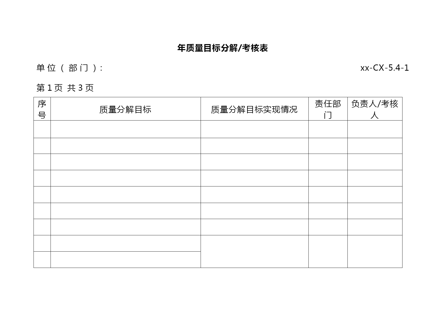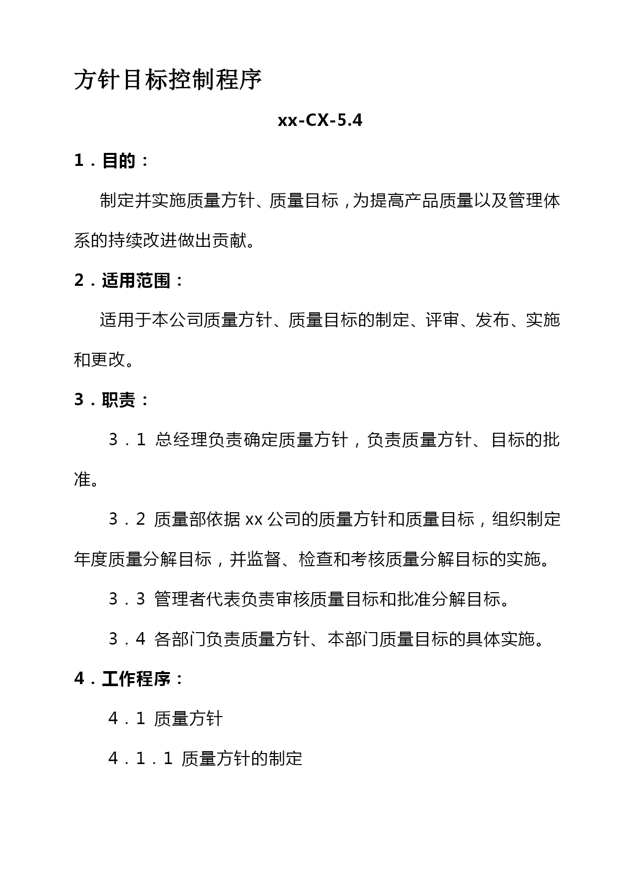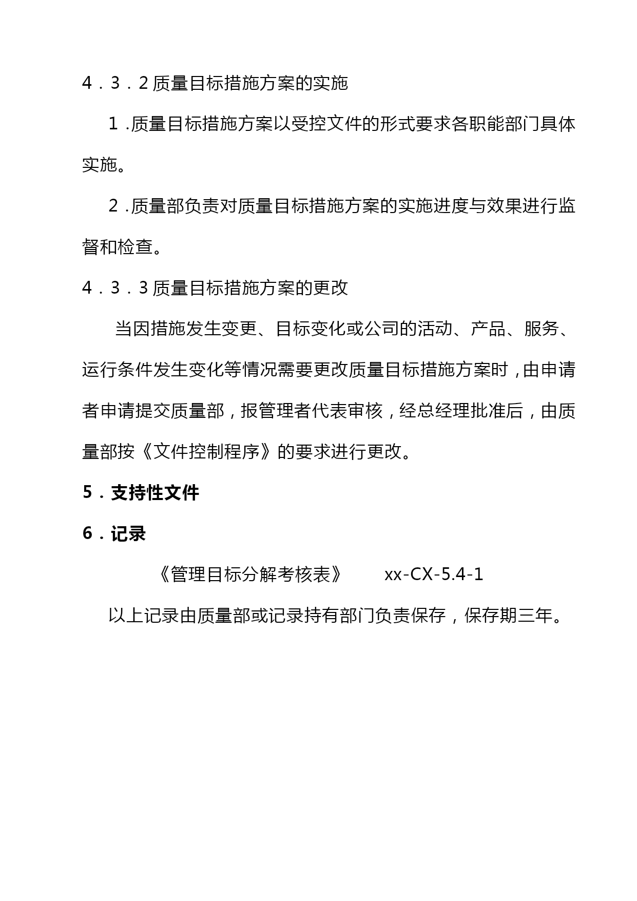 生产制造企业质量体系认证程序文件汇编(完整版)资料(可以直接使用,可编辑优秀版资料,欢迎下载)方针目标控制程序xx-CX-5.41.目的:制定并实施质量方针、质量目标,为提高产品质量以及管理体系的持续改进做出贡献。2.适用范围:适用于本公司质量方针、质量目标的制定、评审、发布、实施和更改。3.职责:3.1总经理负责确定质量方针,负责质量方针、目标的批准。3.2质量部依据xx公司的质量方针和质量目标,组织制定年度质量分解目标,并监督、检查和考核质量分解目标的实施。3.3管理者代表负责审核质量目标和批准分解目标。3.4各部门负责质量方针、本部门质量目标的具体实施。4.工作程序:4.1质量方针4.1.1质量方针的制定总经理以提高产品和服务质量为目的,针对公司实际情况,适当考虑相关方的要求,制定质量方针并形成文件,传达到全体员工。质量方针应确保:a.与组织的宗旨和经营宗旨相适应b.适合于组织活动、产品或服务的性质、规模。c.对满足顾客及其他相关方的要求,对持续改进和降低风险做出承诺;对遵守有关质量法律、法规和其他要求做出承诺。d.提出建立和评审质量目标的框架。e.与公司的其他方针相一致。4.1.2质量方针的评审、管理、更改每次管理评审,均需要对质量方针进行评价,确保其适宜性。当质量方针需要修改时,要报总经理批准,形成文件后重新向全体员工传达。4.1.3质量方针的管理a.方针的制定、修订、评审,均需听取员工的意见。b.通过文件的分发、会议、网络、宣传栏宣传等方式向全体员工宣传质量方针。c.质量部负责对全体员工进行质量方针的培训,以确保质量方针的充分理解。d.以公开宣传的方式向公众公开质量方针,并保证相关方获得质量方针。4.2质量目标和分解质量目标4.2.1质量目标和分解质量目标的制定4.2.1.1质量目标和质量分解目标制定的时机1.质量部每年初利用管理评审会议,组织各部门根据质量方针,上一年度的质量目标和分解的质量目标的实现状况以及其他外界因素的变更,制定本年度各部门新的质量目标,经总经理批准后生效。2.对建立的质目标进行分解,由质量部组织相关人员根据企业现状诊断结果,组织各部门制定质量分解目标,经管理者代表批准后予以传达和实施。4.2.1.2质量目标制定时应考虑:1.本公司的质量方针;2.产品要求及满足产品要求所需的内容;3.法律、法规和规范及其他要求;4.管理风险及其他风险;5.相关方要求、商业机会;6.技术、财务及实施的可行性;7.预防为主和持续改进的精神;8.应尽可能量化,并设置可测量参数;9.将质量目标细化到有关职能部门及层次上;10.为质量目标的实现设置完成时间。4.2.2质量目标的更改在方针、相关法律法规及其他要求,质量的状况以及其他内外界因素(包括市场、产品、活动、服务发生变化等)等发生变更时,质量目标应重新评审和修订。质量目标由质量部组织进行更改,管理者代表审核后报总经理批准后生效。4.2.3质量目标的管理1.质量部组织各部门对所属员工进行质量目标的培训,确保全体员工清楚公司及本部门的质量目标,并付诸实施。2.经总经理批准后,可向相关方或公众公开本公司的质量目标。3.按要求对质量目标进行检查,针对影响质量目标达成的原因,采取纠正和预防措施。4.每次管理评审时,均需对质量目标进行评审,确保其适宜性。4.3实现质量目标的措施方案4.3.1.质量目标实现措施方案的编制4.3.1.1质量目标实现措施方案的编制要求质量部组织公司各部门根据公司的质量目标,制定质量实现措施方案,措施方案由管理者代表审核,报总经理批准后实施。制定质量措施管理方案时,应考虑与实现质量目标有关的作业场所、过程、设备、作业组织,包括人力资源。4.3.1.2质量目标措施方案的内容,质量措施方案的内容主要包括:1.依据质量目标;2.方法措施、技术手段;3.责任部门;4.预算经费、资源要求;5.开始时间和完成时间,等等。4.3.2质量目标措施方案的实施1.质量目标措施方案以受控文件的形式要求各职能部门具体实施。2.质量部负责对质量目标措施方案的实施进度与效果进行监督和检查。4.3.3质量目标措施方案的更改当因措施发生变更、目标变化或公司的活动、产品、服务、运行条件发生变化等情况需要更改质量目标措施方案时,由申请者申请提交质量部,报管理者代表审核,经总经理批准后,由质量部按《文件控制程序》的要求进行更改。5.支持性文件6.记录《管理目标分解考核表》xx-CX-5.4-1以上记录由质量部或记录持有部门负责保存,保存期三年。年质量目标分解/考核表单位(部门):xx-CX-5.4-