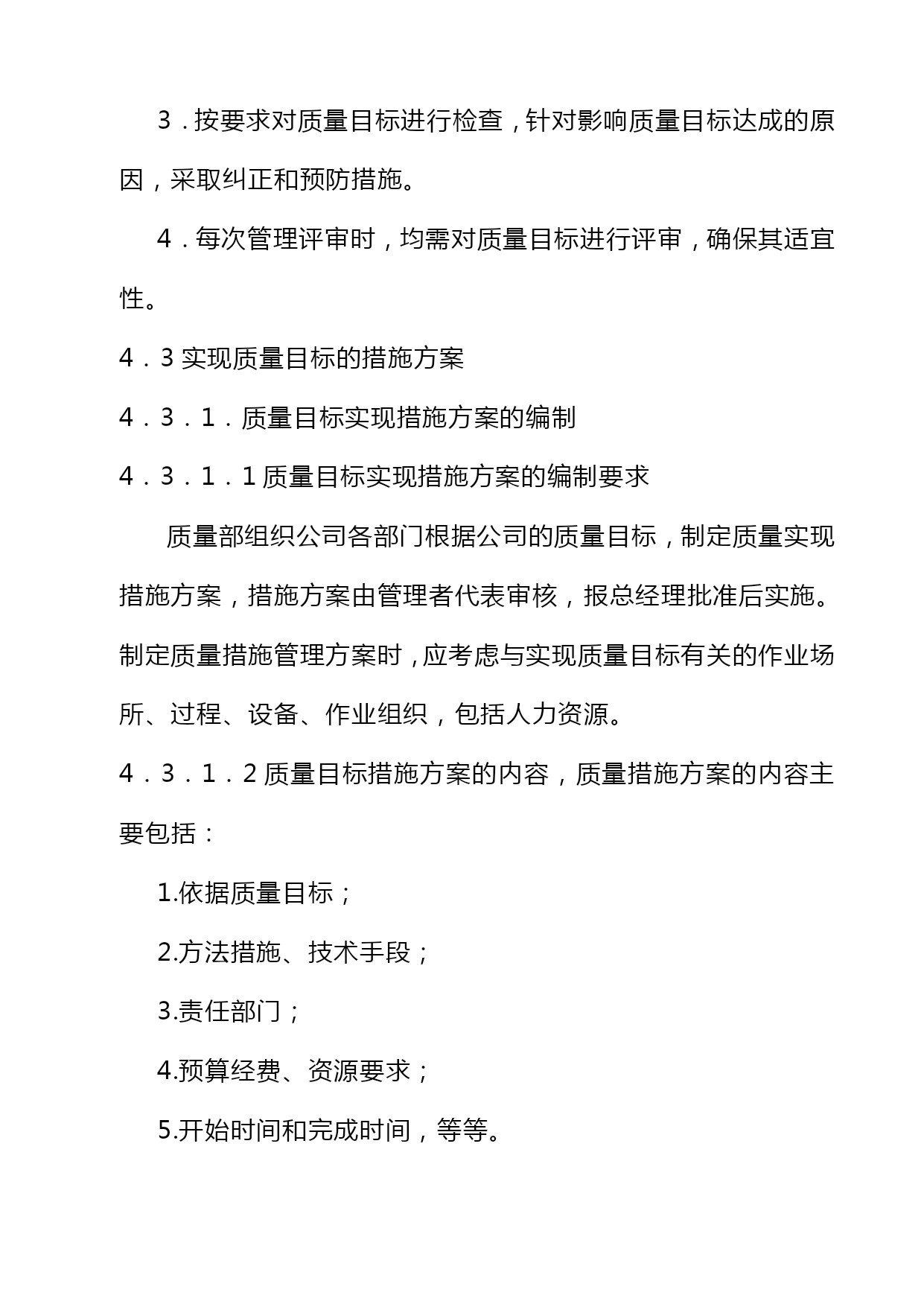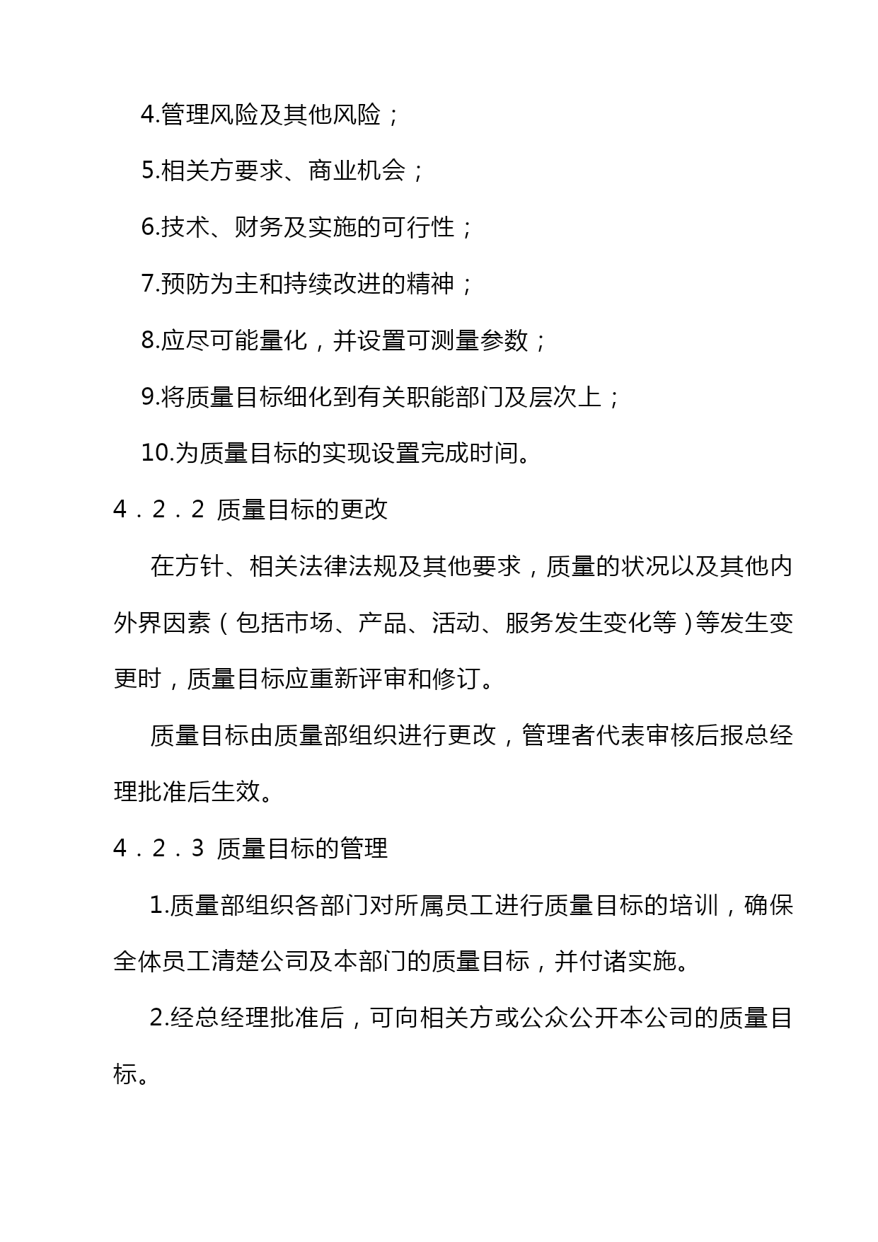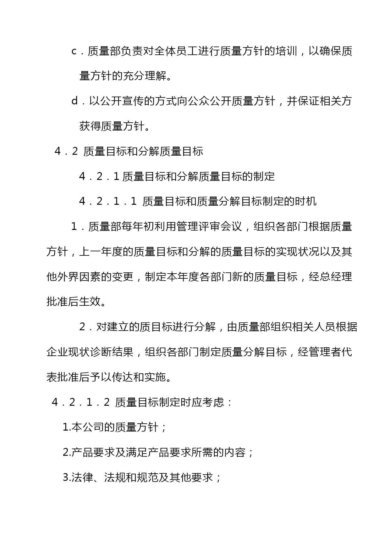 生产制造企业质量体系认证程序文件汇编(完整版)资料(可以直接使用,可编辑优秀版资料,欢迎下载)方针目标控制程序xx-CX-5.41.目的:制定并实施质量方针、质量目标,为提高产品质量以及管理体系的持续改进做出贡献。2.适用范围:适用于本公司质量方针、质量目标的制定、评审、发布、实施和更改。3.职责:3.1总经理负责确定质量方针,负责质量方针、目标的批准。3.2质量部依据xx公司的质量方针和质量目标,组织制定年度质量分解目标,并监督、检查和考核质量分解目标的实施。3.3管理者代表负责审核质量目标和批准分解目标。3.4各部门负责质量方针、本部门质量目标的具体实施。4.工作程序:4.1质量方针4.1.1质量方针的制定总经理以提高产品和服务质量为目的,针对公司实际情况,适当考虑相关方的要求,制定质量方针并形成文件,传达到全体员工。质量方针应确保:a.与组织的宗旨和经营宗旨相适应b.适合于组织活动、产品或服务的性质、规模。c.对满足顾客及其他相关方的要求,对持续改进和降低风险做出承诺;对遵守有关质量法律、法规和其他要求做出承诺。d.提出建立和评审质量目标的框架。e.与公司的其他方针相一致。4.1.2质量方针的评审、管理、更改每次管理评审,均需要对质量方针进行评价,确保其适宜性。当质量方针需要修改时,要报总经理批准,形成文件后重新向全体员工传达。4.1.3质量方针的管理a.方针的制定、修订、评审,均需听取员工的意见。b.通过文件的分发、会议、网络、宣传栏宣传等方式向全体员工宣传质量方针。c.质量部负责对全体员工进行质量方针的培训,以确保质量方针的充分理解。d.以公开宣传的方式向公众公开质量方针,并保证相关方获得质量方针。4.2质量目标和分解质量目标4.2.1质量目标和分解质量目标的制定4.2.1.1质量目标和质量分解目标制定的时机1.质量部每年初利用管理评审会议,组织各部门根据质量方针,上一年度的质量目标和分解的质量目标的实现状况以及其他外界因素的变更,制定本年度各部门新的质量目标,经总经理批准后生效。2.对建立的质目标进行分解,由质量部组织相关人员根据企业现状诊断结果,组织各部门制定质量分解目标,经管理者代表批准后予以传达和实施。4.2.1.2质量目标制定时应考虑:1.本公司的质量方针;2.产品要求及满足产品要求所需的内容;3.法律、法规和规范及其他要求;4.管理风险及其他风险;5.相关方要求、商业机会;6.技术、财务及实施的可行性;7.预防为主和持续改进的精神;8.应尽可能量化,并设置可测量参数;9.将质量目标细化到有关职能部门及层次上;10.为质量目标的实现设置完成时间。4.2.2质量目标的更改在方针、相关法律法规及其他要求,质量的状况以及其他内外界因素(包括市场、产品、活动、服务发生变化等)等发生变更时,质量目标应重新评审和修订。质量目标由质量部组织进行更改,管理者代表审核后报总经理批准后生效。4.2.3质量目标的管理1.质量部组织各部门对所属员工进行质量目标的培训,确保全体员工清楚公司及本部门的质量目标,并付诸实施。2.经总经理批准后,可向相关方或公众公开本公司的质量目标。3.按要求对质量目标进行检查,针对影响质量目标达成的原因,采取纠正和预防措施。4.每次管理评审时,均需对质量目标进行评审,确保其适宜性。4.3实现质量目标的措施方案4.3.1.质量目标实现措施方案的编制4.3.1.1质量目标实现措施方案的编制要求质量部组织公司各部门根据公司的质量目标,制定质量实现措施方案,措施方案由管理者代表审核,报总经理批准后实施。制定质量措施管理方案时,应考虑与实现质量目标有关的作业场所、过程、设备、作业组织,包括人力资源。4.3.1.2质量目标措施方案的内容,质量措施方案的内容主要包括:1.依据质量目标;2.方法措施、技术手段;3.责任部门;4.预算经费、资源要求;5.开始时间和完成时间,等等。4.3.2质量目标措施方案的实施1.质量目标措施方案以受控文件的形式要求各职能部门具体实施。2.质量部负责对质量目标措施方案的实施进度与效果进行监督和检查。4.3.3质量目标措施方案的更改当因措施发生变更、目标变化或公司的活动、产品、服务、运行条件发生变化等情况需要更改质量目标措施方案时,由申请者申请提交质量部,报管理者代表审核,经总经理批准后,由质量部按《文件控制程序》的要求进行更改。5.支持性文件6.记录《管理目标分解考核表》xx-CX-5.4-1以上记录由质量部或记录持有部门负责保存,保存期三年。年质量目标分解/考核表单位(部门):xx-CX-5.4-