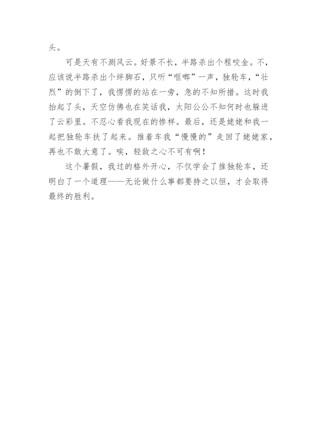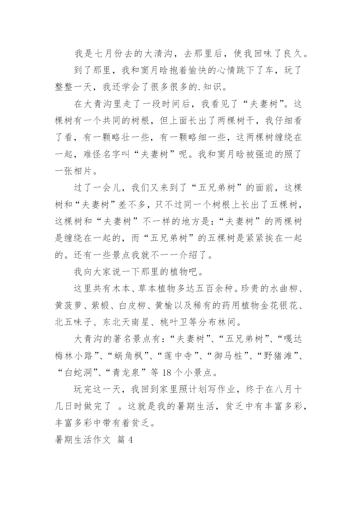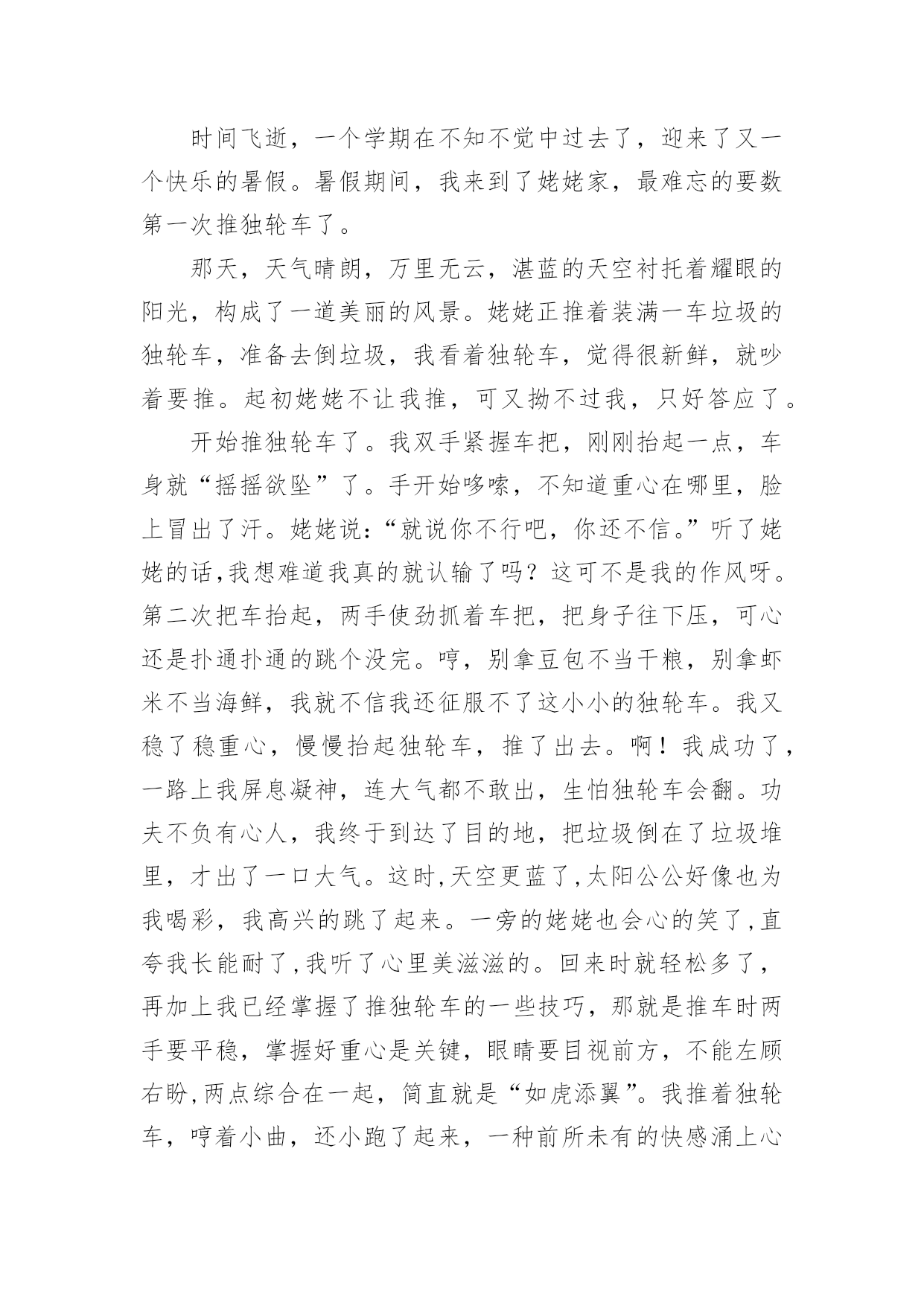 暑期生活作文【精选】暑期生活作文4篇在日常学习、工作或生活中,大家对作文都不陌生吧,借助作文可以宣泄心中的情感,调节自己的心情。作文的注意事项有许多,你确定会写吗?以下是小编为大家整理的暑期生活作文4篇,希望对大家有所帮助。暑期生活作文篇1暑假是每一位中学生期盼已久的,我也不例外。在学校里盼了这么久,终于盼来了暑期生活,心里乐极了。期末考试之后,我和妈妈还有弟弟在拿完通知书之后,一起坐长途汽车来到了爸爸打工的地方。于是在爸爸租的房子里开始了我的快乐暑期生活。自从来到这之后,整天除了吃,就是睡觉,还要写作业,玩电脑。我通常是在吃完晚饭后才玩电脑,但想要玩电脑,必须得写完作业和看完一些关于学习的视频才行。到了星期天,我们一家子就会去公园游玩,我们去了泗州公园。在公园里,有许多桥,还有一些游乐设施,我和弟弟最喜欢玩那个”太空漫步“。回到家之后,我和弟弟开始煮饭,饭煮熟之后,我和弟弟就开始和爸爸妈妈吃晚饭,吃完之后,我和弟弟就开始玩我们最喜欢的电脑游戏----造梦西游3。我和弟弟玩了一会儿就没有玩了。然后就开始放古装神话电视剧——十八罗汉。一直看到十点多才睡。我的暑假生活就是这样,日复一日,几乎每一天都一样。暑期生活作文篇2在最后一次下课铃声结束后,我们的暑假生活就开始了,我满怀高兴的心情,迎接了我的暑期生活。每天早上我七点准时起床刷牙洗脸,然后到外面长跑20分钟,7:30分我准时到家吃早饭。吃完饭我开始学习,语、数、英每天完成一个单元,每完成一个单元我会休息十分钟。然后再吹吹竖笛,在我不断的努力下竖笛吹会了五首曲子。午饭后我会看会书再去睡1小时午觉,午睡后我会接着做作业,空闲时妈妈会陪我下下棋,看看电视,有时也会到同学家玩一会。到了傍晚时天气凉快了,我就到楼下跳跳绳或溜溜冰,骑骑自行车。晚饭时妈妈说我运动后吃饭特别香,晚饭后是我最开东西,偶尔还会看场电影。8点左右我们就回到家了,妈妈会给我们准备一点水果,吃完后我就去洗澡,9点之前我准时上床睡觉。就这样日复一日,我的暑假在快乐中度过,轻松的完成了暑期作业。这就是我的暑期生活!经过了一个暑假的锻炼我的身体变得越来越强壮了,我带着兴奋迎接着新学期的到来,我相信新学期我一定会健康成长,快乐学习。暑期生活作文篇3一谈起暑期生活,我就想起一些欢乐愉快的事情,今年暑假我去了大青沟等一些地方游玩。我去那玩了一整天呢,又学到了许许多多的知识。我是七月份去的大清沟,去那里后,使我回味了良久。到了那里,我和窦月晗抱着愉快的心情跳下了车,玩了整整一天,我还学会了很多很多的.知识。在大青沟里走了一段时间后,我看见了“夫妻树”。这棵树有一个共同的树根,但上面长出了两棵树干,我仔细看了看,有一颗略壮一些,有一颗略细一些,这两棵树缠绕在一起,难怪名字叫“夫妻树”呢。我和窦月晗被强迫的照了一张相片。过了一会儿,我们又来到了“五兄弟树”的面前,这棵树和“夫妻树”差不多,只不过同一个树根上长出了五棵树,这棵树和“夫妻树”不一样的地方是:“夫妻树”的两棵树是缠绕在一起的,而“五兄弟树”的五棵树是紧紧挨在一起的。还有一些景点我就不一一介绍了。我向大家说一下那里的植物吧。这里共有木本、草本植物多达五百余种。珍贵的水曲柳、黄菠萝、紫椴、白皮柳、黄榆以及稀有的药用植物金花银花、北五味子、东北天南星、桃叶卫等分布林间。大青沟的著名景点有:“夫妻树”、“五兄弟树”、“嘎达梅林小路”、“蜗角枫”、“莲中寺”、“御马桩”、“野猪滩”、“白蛇洞”、“青龙泉”等18个小景点。玩完这一天,我回到家里照计划写作业,终于在八月十几日时做完了。这就是我的暑期生活,贫乏中有丰富多彩,丰富多彩中带有着贫乏。暑期生活作文篇4时间飞逝,一个学期在不知不觉中过去了,迎来了又一个快乐的暑假。暑假期间,我来到了姥姥家,最难忘的要数第一次推独轮车了。那天,天气晴朗,万里无云,湛蓝的天空衬托着耀眼的阳光,构成了一道美丽的风景。姥姥正推着装满一车垃圾的独轮车,准备去倒垃圾,我看着独轮车,觉得很新鲜,就吵着要推。起初姥姥不让我推,可又拗不过我,只好答应了。开始推独轮车了。我双手紧握车把,刚刚抬起一点,车身就“摇摇欲坠”了。手开始哆嗦,不知道重心在哪里,脸上冒出了汗。姥姥说:“就说你不行吧,你还不信。”听了姥姥的话,我想难道我真的就认输了吗?这可不是我的作风呀。第二次把车抬起,两手使劲抓着车把,把身子往下压,可心还是扑通扑通的跳个没完。哼,别拿豆包不当干粮,别拿虾米不当海鲜,我就不信我还征服不了这小小的独轮车。我又稳了稳重心,慢慢抬起独轮车,推了出去。啊!我成功了,一路上我屏息凝神,连大气都不敢出,生怕独轮车会翻。功夫不负有心人,我终于到达了目的地,把垃圾倒在了垃圾堆里,才出了一口大气。这时,天空更蓝了,太阳公公好像也为我喝彩,我高兴的跳了起来。一旁的姥姥也会心的笑了
