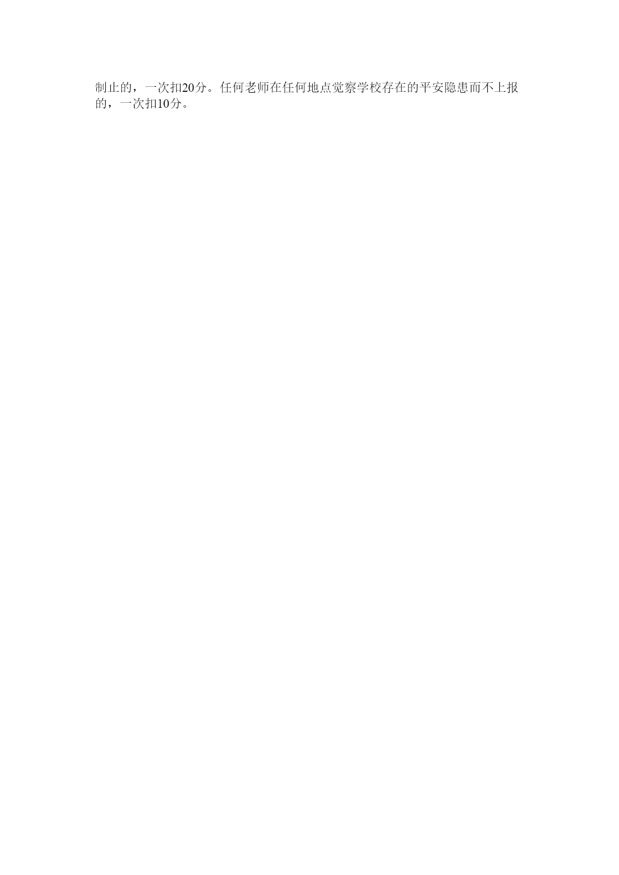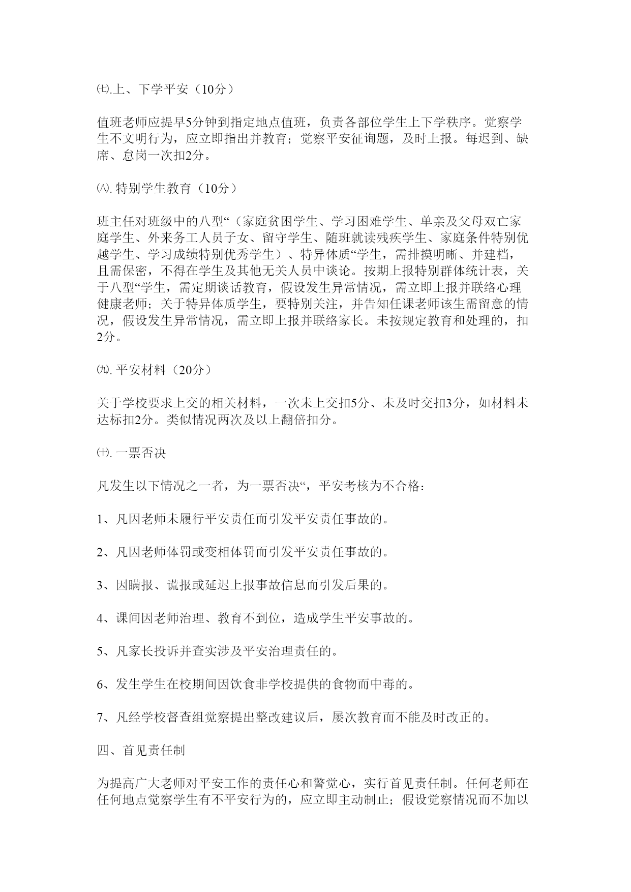 老师平安工作考核细那么为了进一步落实学校平安岗位目的责任,保障师生人身和财产平安,现按照《中小学幼儿园平安治理方法》,结合我校实际情况,特制定本平安考核细那么:一、考核原那么:公平、公正、客观二、考核方法:本考核在学校行政的指导下,实行各专项负责人考核与领导督查相结合的原那么,采取扣分制,并实行严峻平安事故一票否决案,如该岗位责任人因渎职出现严峻平安事故或责任事故的,将取消本月绩效工资,与年终绩效考核挂钩,并追查其相应的经济或法律责任。三、考核细那么㈠.学生平安教育(10分)班主任应对学生加强平安教育:交通平安、消防平安、课间平安、课外活动平安、就餐平安、集会平安、防震平安、消防平安、防雷击防溺水平安、食品卫生平安、防传染病平安、心理健康平安、特别学生的平安以及其它平安。⑴班主任应做到时时讲、事事讲,做好每周平安教育工作,有记录(查班主任手册)。每月一次平安专题的班队会(查班队会方案),缺一次扣1分。⑵教室内应有平安教育专栏,每月1次。如无记录或记录不详,一次扣1分。⑶其他任课老师应在任课范围内对学生进展平安教育。㈡.课堂平安(20分)⑴任课老师必须按时到岗,每节课前清点学生人数,看学生是否到齐。如有学生未到应及时与班主任联络,班主任必须落实学生情况。因学生缺课发生平安事故,每次扣5分,并承担相应责任。⑵所有任课老师必须负责本堂课学生的平安,不得私自调课。假设需要离开教室上课的,班主任负责送达、上课老师负责送回教室。如因工作渎职所造成平安事故,扣该任课老师5分,并承担相应责任。⑶在课堂教学中,平安工作实行任课老师课堂责任制和责任追查制。各任课老师应做到按时上下课,不迟到,不早退,不中途离开,不拖堂。如不按时到岗,老师无故离开教室等缘故造成学生损害事故的,由任课老师负全部责任,每次扣5分。⑷各科老师应严格检查学生学惯器具,不同意带各种利器(削笔刀在内),使用圆规等学惯器具时要教育学生留意平安(每天填写好学具检查记录,少一次扣1分)。老师教育学生时要讲究方法,不剥夺学生上课权利,不得采纳简单粗暴的方法,严禁体罚和变相体罚学生,觉察一次扣1分,杜绝由于教育不当而导致学生出现的不平安事故。㈢.室外课堂教学10分(体育课、大课间活动、其他室外课)1.上课铃响前,老师必须站在上课场地上等待学生的到来,实在加强责任心,对学生进展必要的平安教育。体育老师不提早到岗的每次扣1分。2.体育课、大课间活动要合理安排运动量和运动强度,关注体质较弱学生和特异体质学生。其他的室外课堂教学要组织、安排好学生的活动。3.关于因身体缘故不能上体育课和大课间的学生,在教学场地休息、旁观的学生,老师要给予关注,不可放任不管,如出现平安事故,每次老师扣5分,并承担相应责任。如遇有特别病因不能到上课场地的,班主任必须做好治理工作,坚决杜绝出现学生脱管的现象,觉察班级学生无人看管,打闹的,班主任和任课老师每人扣0.5分。4.如在课堂上,发生学生呕吐、晕倒、受伤等突发情况,应立即采取以下措施:(1)迅速通知校医、班主任和学校领导。(2)假设学生病(伤)情况较为严峻,要立即送往就近医院进展诊治或抢救。(3)班主任要及时将学生病(伤)情况通知到学生家长。(4)老师事后及时写出现场情况书面报告,并上交学校分管平安领导。学校及时组织人员进展情况调查和性质认定。如处理不及时,每次扣5分,并承担相应责任。5.教学过程中老师必须自始至终做好学生的组织工作,保证学生在预备、学习、练习等环节中队列整齐平安有序,不得出现学生散乱、老师离场等严峻违纪行为及平安征询题。觉察体育课有放羊“现象,每次扣1分;出现平安事故,任课老师每次扣5分,并承担相应责任。6.体育组老师要适时对学校的体育设备、器材进展平安检查,假设觉察不平安要素,要及时以书面方式报告后勤处,后勤处要及时对体育设备、器材进展维修或更新。㈣.课间平安(10分)1.课间巡视老师要佩戴好标志,并在所负责区域进展巡视,觉察征询题及时处理,巡视人员不到位每次扣1分,发惹事故每次扣5分,并承担相应责任。2.平安岗老师必须按时到位,对所负责区域学生进展看护和平安疏导,如平安岗不到位每次扣1分,发生平安事故,责任老师扣5分,并承担相应责任。3.遇到出操、集会或放学,学生需排队行走时,班主任(相关老师)应负责好班级队伍的秩序,按规定线路上下,做到静、齐、快;如觉察教育不到位,学生队伍散乱、纪律不严的,一次扣2分。4.课间觉察攀爬学校围墙、触碰电力开关、玩弄消防设备、在楼梯扶手滑行的学生,每生每次给班主任扣1分。㈤.活动平安(10分)1.校内平安演练等活动,全体老师必须按照学校安排,及时到岗到位,各负其责,
