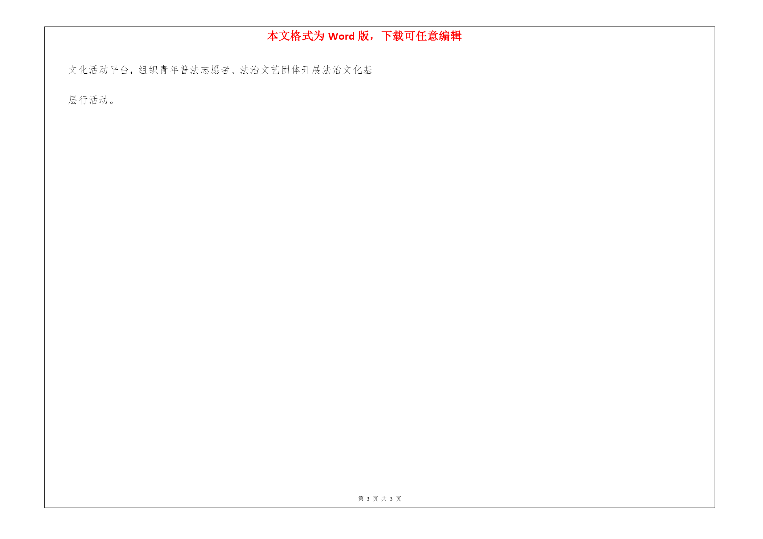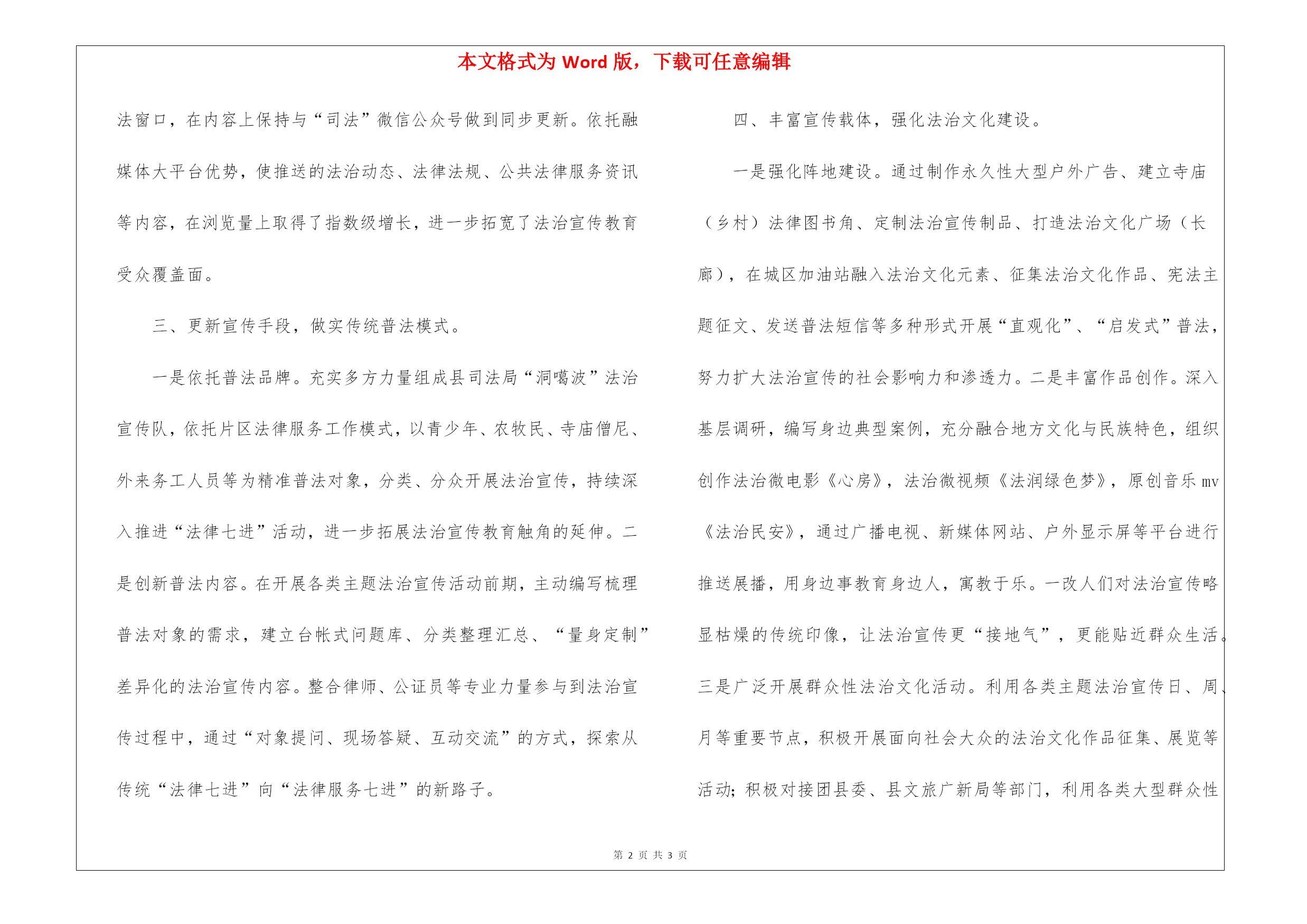 本文格式为Word版,下载可任意编辑第PAGE\*MERGEFORMAT3页共NUMPAGES\*MERGEFORMAT3页司法局法治文化基层行工作总结2021年,县司法局立足实际,不断创新理念,丰富载体,重点在新媒体普法中打开突破口,充分发挥互联网、微信、融媒体等新兴载体优势,并立足地方文化与法治文化相融合,通过多种形式,为广大群众提供更高质效的法治宣传服务,取得了显著成效,现将此项工作总结如下:一、完善分类、分众法治宣传教育机制。围绕全面依法治国新要求,认真总结梳理“七五”普法经验做法,按照中央、省委、州委、县委重大决策部署,以问题导向,结合实际,科学谋划“八五”普法规划。深入持久推进“法律七进”。探索将“法律七进”从“法治宣传七进”向“法律服务七进”拓展延伸,并最终实现“依法治理七进”。开展法律服务送进机关、学校、寺庙、乡村(社区)、企业(单位)活动,寓法治宣传于法律服务之中,实现法治宣传与法律服务的有机融合拓展。截止目前,共开展法律进乡村(社区)143场次,累计覆盖人数11319人次,累计发放法治宣传资料、制品8869份,累计解答法律咨询101人次;开展法律进寺庙14场次,累计覆盖人数81人次,累计发放法治宣传资料、制品76份,累计解答法律咨询6人次;开展法律进学校20场次,累计覆盖人数2605人次,累计发放法治宣传资料、制品3634份;法律进机关18场次,累计覆盖人数658人次,累计发放法治宣传资料、制品626份,累计解答法律咨询4人次;法律进企业(单位)7场次,累计覆盖人数171人次,累计发放法治宣传资料、制品411份。二、拓宽宣传渠道,狠抓新媒体普法。一是巩固存量。开通以法治电台“小巴说”为特色的“司法”微信公众号,通过文字、图片、语音、视频向公众宣传法律法规知识,提高法治宣传的灵活性、趣味性。并在持续引流上深下功夫,通过街面宣传,互动普法等方式,引导更多群众关注公众号,以求形成一批较为固定的普法受众群体。二是力求增量。精心打造“云上”app司法窗口,在内容上保持与“司法”微信公众号做到同步更新。依托融媒体大平台优势,使推送的法治动态、法律法规、公共法律服务资讯等内容,在浏览量上取得了指数级增长,进一步拓宽了法治宣传教育受众覆盖面。三、更新宣传手段,做实传统普法模式。一是依托普法品牌。充实多方力量组成县司法局“洞噶波”法治宣传队,依托片区法律服务工作模式,以青少年、农牧民、寺庙僧尼、外来务工人员等为精准普法对象,分类、分众开展法治宣传,持续深入推进“法律七进”活动,进一步拓展法治宣传教育触角的延伸。二是创新普法内容。在开展各类主题法治宣传活动前期,主动编写梳理普法对象的需求,建立台帐式问题库、分类整理汇总、“量身定制”差异化的法治宣传内容。整合律师、公证员等专业力量参与到法治宣传过程中,通过“对象提问、现场答疑、互动交流”的方式,探索从传统“法律七进”向“法律服务七进”的新路子。四、丰富宣传载体,强化法治文化建设。一是强化阵地建设。通过制作永久性大型户外广告、建立寺庙(乡村)法律图书角、定制法治宣传制品、打造法治文化广场(长廊),在城区加油站融入法治文化元素、征集法治文化作品、宪法主题征文、发送普法短信等多种形式开展“直观化”、“启发式”普法,努力扩大法治宣传的社会影响力和渗透力。二是丰富作品创作。深入基层调研,编写身边典型案例,充分融合地方文化与民族特色,组织创作法治微电影《心房》,法治微视频《法润绿色梦》,原创音乐mv《法治民安》,通过广播电视、新媒体网站、户外显示屏等平台进行推送展播,用身边事教育身边人,寓教于乐。一改人们对法治宣传略显枯燥的传统印像,让法治宣传更“接地气”,更能贴近群众生活。三是广泛开展群众性法治文化活动。利用各类主题法治宣传日、周、月等重要节点,积极开展面向社会大众的法治文化作品征集、展览等活动;积极对接团县委、县文旅广新局等部门,利用各类大型群众性文化活动平台,组织青年普法志愿者、法治文艺团体开展法治文化基层行活动。