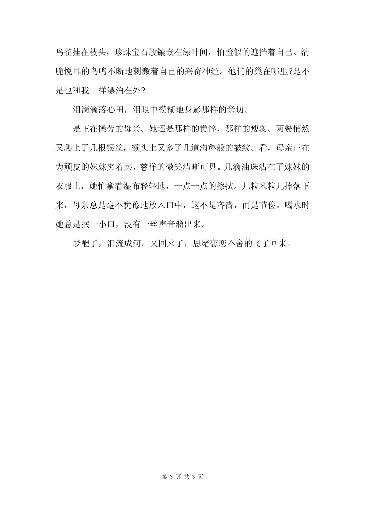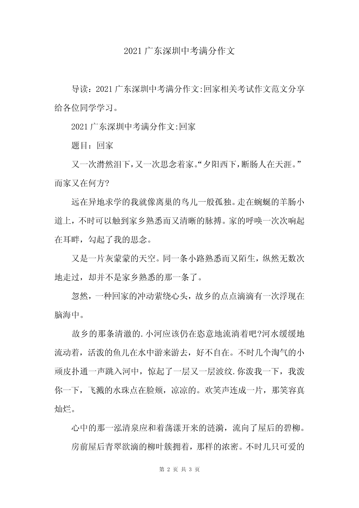 2021广东深圳中考满分作文(实用版)编制人:__________________审核人:__________________审批人:__________________编制单位:__________________编制时间:____年____月____日序言下载提示:该文档是本店铺精心编制而成的,希望大家下载后,能够帮助大家解决实际问题。文档下载后可定制修改,请根据实际需要进行调整和使用,谢谢!并且,本店铺为大家提供各种类型的实用资料,如教育随笔、日记赏析、句子摘抄、古诗大全、经典美文、话题作文、工作总结、词语解析、文案摘录、其他资料等等,想了解不同资料格式和写法,敬请关注!Downloadtips:Thisdocumentiscarefullycompiledbythiseditor.Ihopethatafteryoudownloadit,itcanhelpyousolvepracticalproblems.Thedocumentcanbecustomizedandmodifiedafterdownloading,pleaseadjustanduseitaccordingtoactualneeds,thankyou!Inaddition,thisshopprovidesyouwithvarioustypesofpracticalmaterials,suchaseducationalessays,diaryappreciation,sentenceexcerpts,ancientpoems,classicarticles,topiccomposition,worksummary,wordparsing,copyexcerpts,othermaterialsandsoon,wanttoknowdifferentdataformatsandwritingmethods,pleasepayattention!2021广东深圳中考满分作文导读:2021广东深圳中考满分作文:回家相关考试作文范文分享给各位同学学习。2021广东深圳中考满分作文:回家题目:回家又一次潸然泪下,又一次思念着家。“夕阳西下,断肠人在天涯。”而家又在何方?远在异地求学的我就像离巢的鸟儿一般孤独。走在蜿蜒的羊肠小道上,不时可以触到家乡熟悉而又清晰的脉搏。家的呼唤一次次响起在耳畔,勾起了我的思念。又是一片灰蒙蒙的天空。同一条小路熟悉而又陌生,纵然无数次地走过,却并不是家乡熟悉的那一条了。忽然,一种回家的冲动萦绕心头,故乡的点点滴滴有一次浮现在脑海中。故乡的那条清澈的.小河应该仍在恣意地流淌着吧?河水缓缓地流动着,活泼的鱼儿在水中游来游去,好不自在。不时几个淘气的小顽皮扑通一声跳入河中,惊起了一层又一层波纹.你泼我一下,我泼你一下,飞溅的水珠点在脸颊,凉凉的。欢笑声连成一片,那笑容真灿烂。心中的那一泓清泉应和着荡漾开来的涟漪,流向了屋后的碧柳。房前屋后青翠欲滴的柳叶簇拥着,那样的浓密。不时几只可爱的鸟雀挂在枝头,珍珠宝石般镶嵌在绿叶间,怕羞似的遮挡着自己。清脆悦耳的鸟鸣不断地刺激着自己的兴奋神经。他们的巢在哪里?是不是也和我一样漂泊在外?泪滴滴落心田,泪眼中模糊地身影那样的亲切。是正在操劳的母亲。她还是那样的憔悴,那样的瘦弱。两鬓悄然又爬上了几根银丝,额头上又多了几道沟壑般的皱纹。看,母亲正在为顽皮的妹妹夹着菜,慈祥的微笑清晰可见。几滴油珠沾在了妹妹的衣服上,她忙拿着湿布轻轻地,一点一点的擦拭。几粒米粒儿掉落下来,母亲总是毫不犹豫地放入口中,这不是吝啬,而是节俭。喝水时她总是抿一小口,没有一丝声音溜出来。梦醒了,泪流成河。又回来了,思绪恋恋不舍的飞了回来。