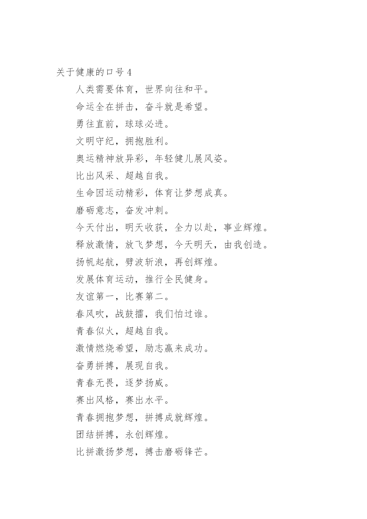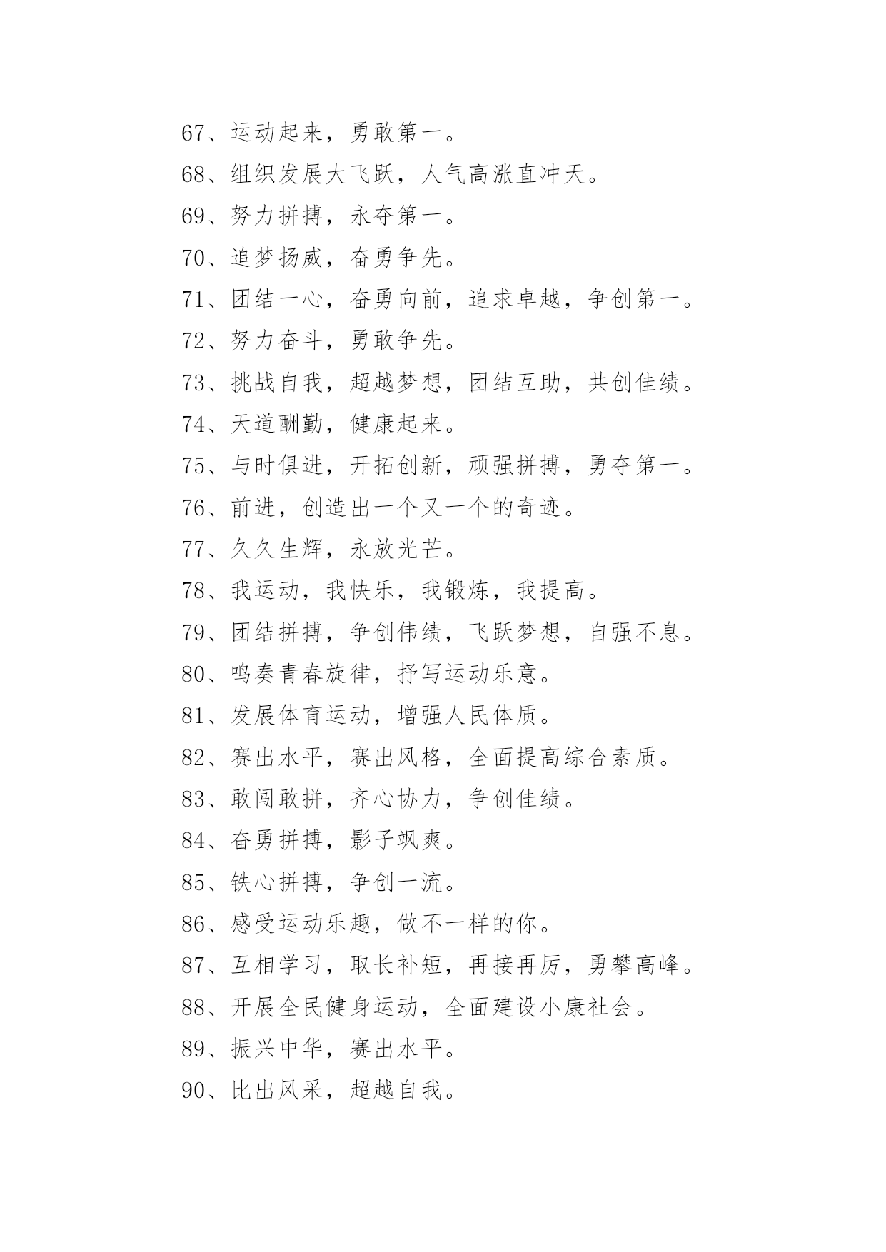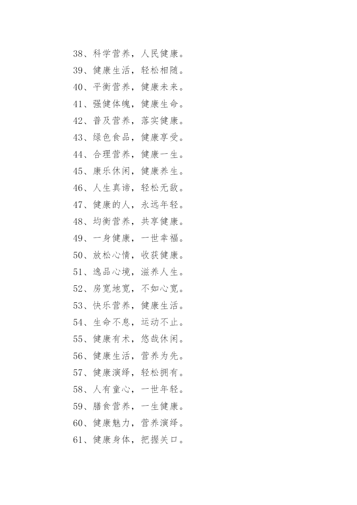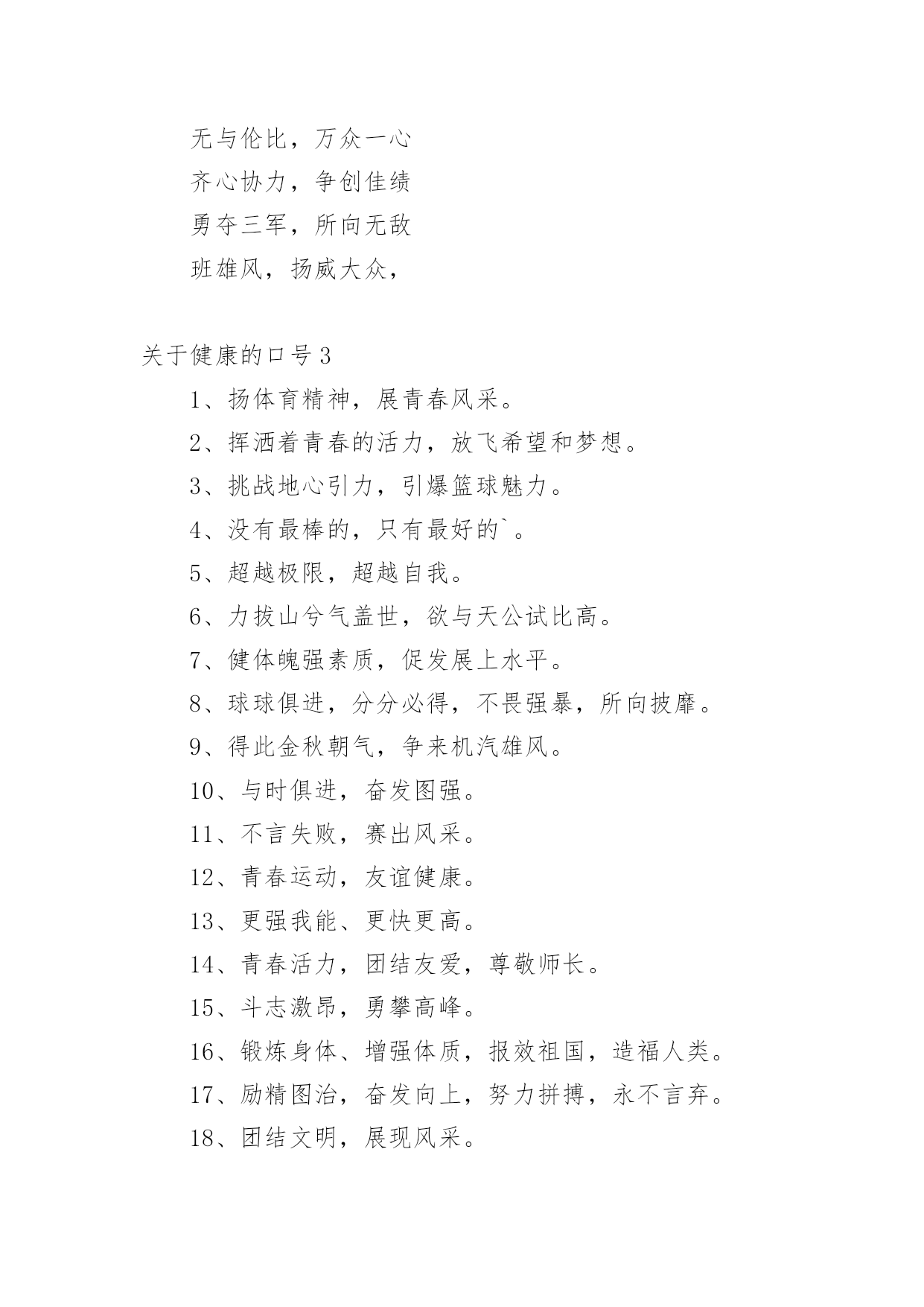 健康的口号关于健康的口号15篇无论是身处学校还是步入社会,大家总免不了要接触或使用口号吧,口号具有非常明显的时代特征和行业特色。你知道什么样的口号才能称之为经典吗?下面是小编整理的关于健康的口号,希望能够帮助到大家。关于健康的口号11、健康建立在饮食上!2、粒米虽小犹不易,莫把辛苦当儿戏。3、米饭粒粒念汗水,不惜粮食当自悔。4、饱口福还要节制保健康,聚餐饮尚须文明长精神。5、古诗《锄禾》你我读,盘中餐苦当记住。6、“合理膳食.规律起居,引领健康生活。”7、珍惜粮食,远离浪费。8、吃饭不要急,要慢慢才行。9、食堂饭菜香,买饭多谦让。10、一粥一饭当思来之不易,半丝半缕恒念物力为艰。11、吃健康,更要吃文明!12、“饮食天下,健康未来”关于健康的口号2励精图治,开拓进取九班九班,勇夺桂冠齐心协力,共创辉煌团结进取,开拓创新顽强拼搏,争创一流互相学习,取长补短再接再厉,勇攀高峰与时俱进,开拓创新顽强拼搏,勇夺第一励精图治,争创一流八年二班,猛虎出山x年二班,锐不可当奋力拼搏,扬我班风努力学习,勇争第一齐心协力,永创佳绩顽强拼搏,所向无敌山中猛虎,水中蛟龙五班,卧虎藏龙不鸣则已,一鸣惊人团结进取,争创佳绩努力拼搏,挑战自我积极进取,努力拼搏磨练意志,强健体魄龙腾虎跃,雷霆万钧无与伦比,万众一心齐心协力,争创佳绩勇夺三军,所向无敌班雄风,扬威大众,关于健康的口号31、扬体育精神,展青春风采。2、挥洒着青春的活力,放飞希望和梦想。3、挑战地心引力,引爆篮球魅力。4、没有最棒的,只有最好的`。5、超越极限,超越自我。6、力拔山兮气盖世,欲与天公试比高。7、健体魄强素质,促发展上水平。8、球球俱进,分分必得,不畏强暴,所向披靡。9、得此金秋朝气,争来机汽雄风。10、与时俱进,奋发图强。11、不言失败,赛出风采。12、青春运动,友谊健康。13、更强我能、更快更高。14、青春活力,团结友爱,尊敬师长。15、斗志激昂,勇攀高峰。16、锻炼身体、增强体质,报效祖国,造福人类。17、励精图治,奋发向上,努力拼搏,永不言弃。18、团结文明,展现风采。19、人类需要体育,世界向往和和平。20、做文明观众,树赛场新风。21、淡泊明志,宁静致远,团结友爱,顽强拼搏。22、挥动激情,放飞梦想。23、魅力永久,充满自信,赢得胜利。24、志比天高,气比山昂,机汽学子,力争更强。25、顽强拼搏,勇攀高峰。26、年轻健儿显身手,时代骄子竞风流。27、努力拼搏,自强不息。28、励精图治,争创一流,好好学习,天天向上。29、人类需要体育,世界向往和平。30、命运全在拼击,奋斗就是希望。31、勇往直前,球球必进。32、文明守纪,拥抱胜利。33、奥运精神放异彩,年轻健儿展风姿。34、比出风采、超越自我。35、生命因运动精彩,体育让梦想成真。36、磨砺意志,奋发冲刺。37、今天付出,明天收获,全力以赴,事业辉煌。38、释放激情,放飞梦想,今天明天,由我创造。39、扬帆起航,劈波斩浪,再创辉煌。40、发展体育运动,推行全民健身。41、友谊第一,比赛第二。42、春风吹,战鼓擂,我们怕过谁。43、青春似火,超越自我。44、激情燃烧希望,励志赢来成功。45、奋勇拼搏,展现自我。46、青春无畏,逐梦扬威。47、赛出风格,赛出水平。48、青春拥抱梦想,拼搏成就辉煌。49、团结拼搏,永创辉煌。50、比拼激扬梦想,搏击磨砺锋芒。51、赛体育真谛,扬奥运精神。52、磨砺意志,奋发冲刺,团结拼搏,展现自我。53、挑战运动极限,演绎健美人生。54、与时俱进,奋力拼搏,齐心协力,争创一流。55、勇争第一,团结一心,共创佳绩。56、全民健身,阳光体育;锻炼身体,积极参与。57、经营客户,加大回访,用心专业,客户至上。58、体育使城市充满活力,城市因体育勃发生机。59、人人关心体育,体育造福人人。60、团结拼搏,拼搏前进。61、挥动激情,放飞梦想,团结拼搏,树我雄风。62、我运动,我健康,我快乐。63、怀学生心,做最强人。64、你参与了,你坚持了,你胜利了。65、团结拼搏,拼搏进取。66、赛出成绩,安全第一。67、运动起来,勇敢第一。68、组织发展大飞跃,人气高涨直冲天。69、努力拼搏,永夺第一。70、追梦扬威,奋勇争先。71、团结一心,奋勇向前,追求卓越,争创第一。72、努力奋斗,勇敢争先。73、挑战自我,超越梦想,团结互助,共创佳绩。74、天道酬勤,健康起来。75、与时俱进,开拓创新,顽强拼搏,勇夺第一。76、前进,创造出一个又一个的奇迹。77、久久生辉,永放光芒。78、我运动,我快乐,我锻炼,我提高。79、团结拼搏,争创伟绩,飞跃梦想,自强不息。80、鸣奏青春旋律,抒写运动乐意。81、发展体育运动,增强人民体质。82、赛出水平,赛出风格,全面提高综合素质。83、敢闯敢拼,齐心协力,争创佳绩。84、