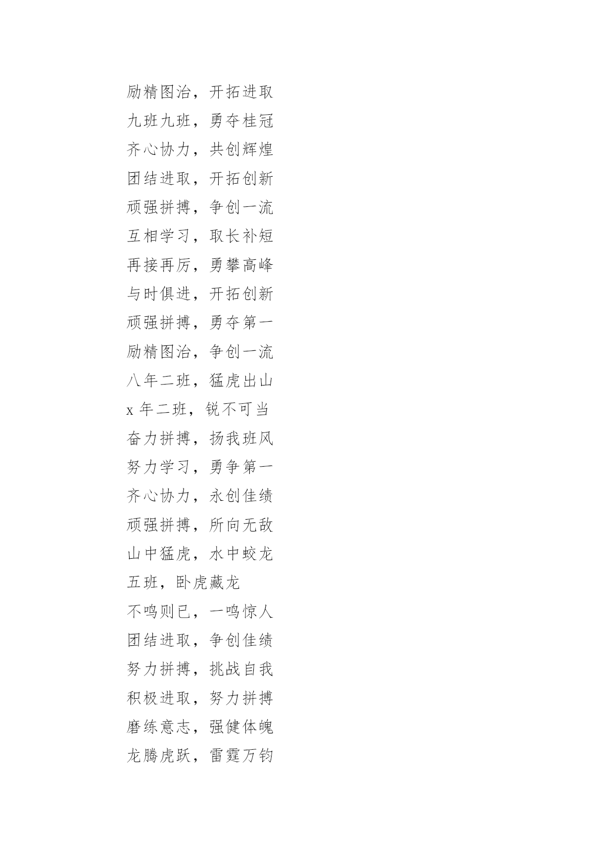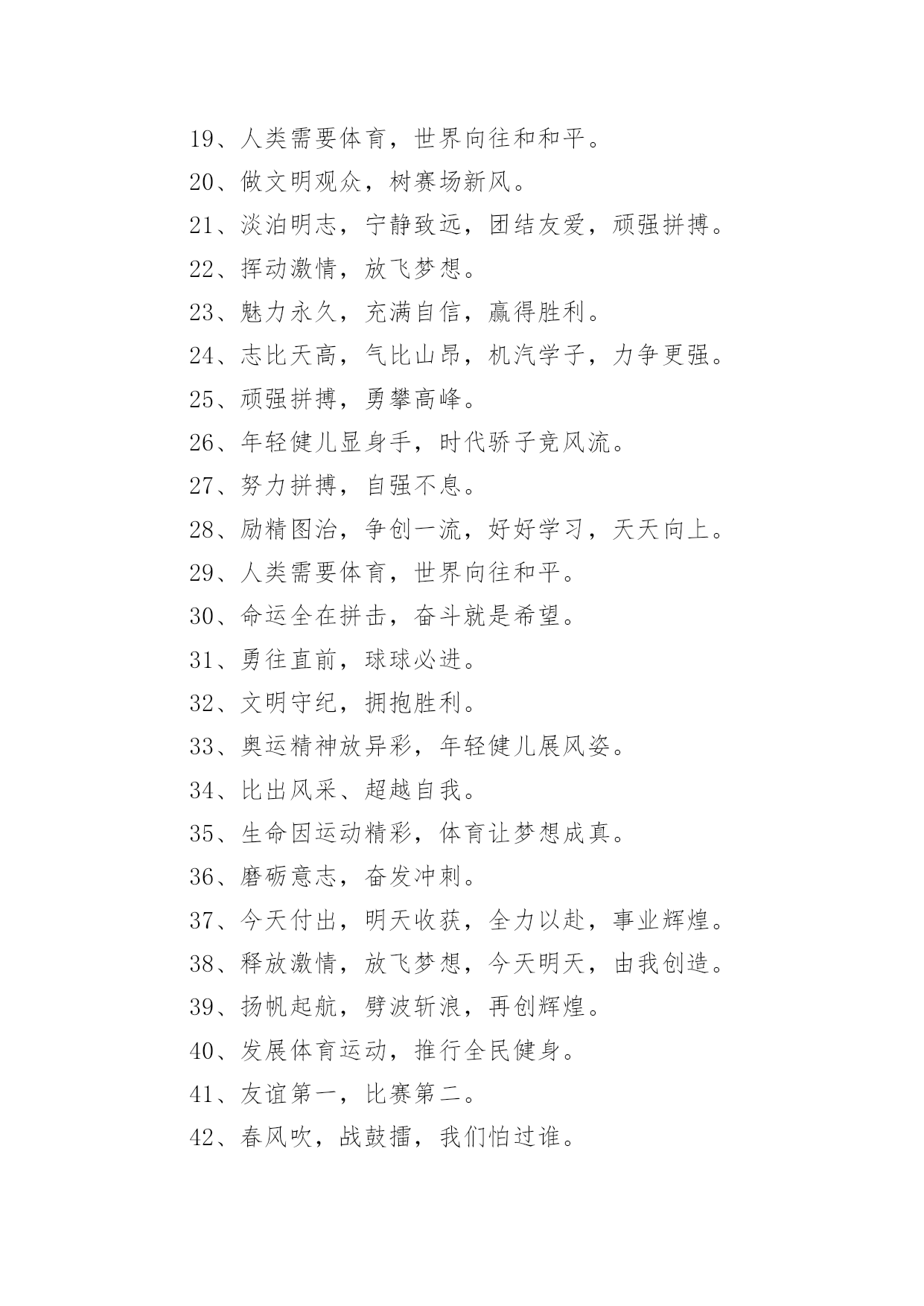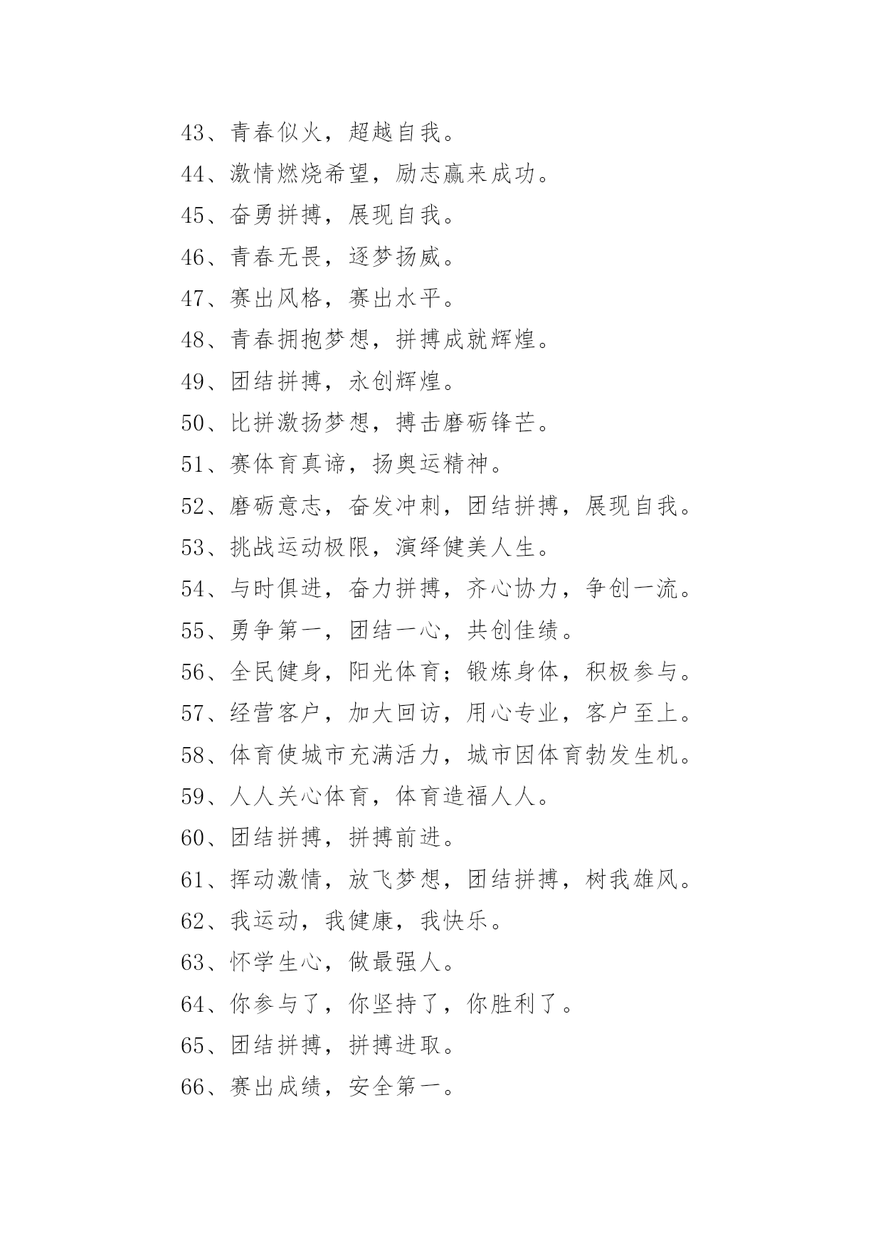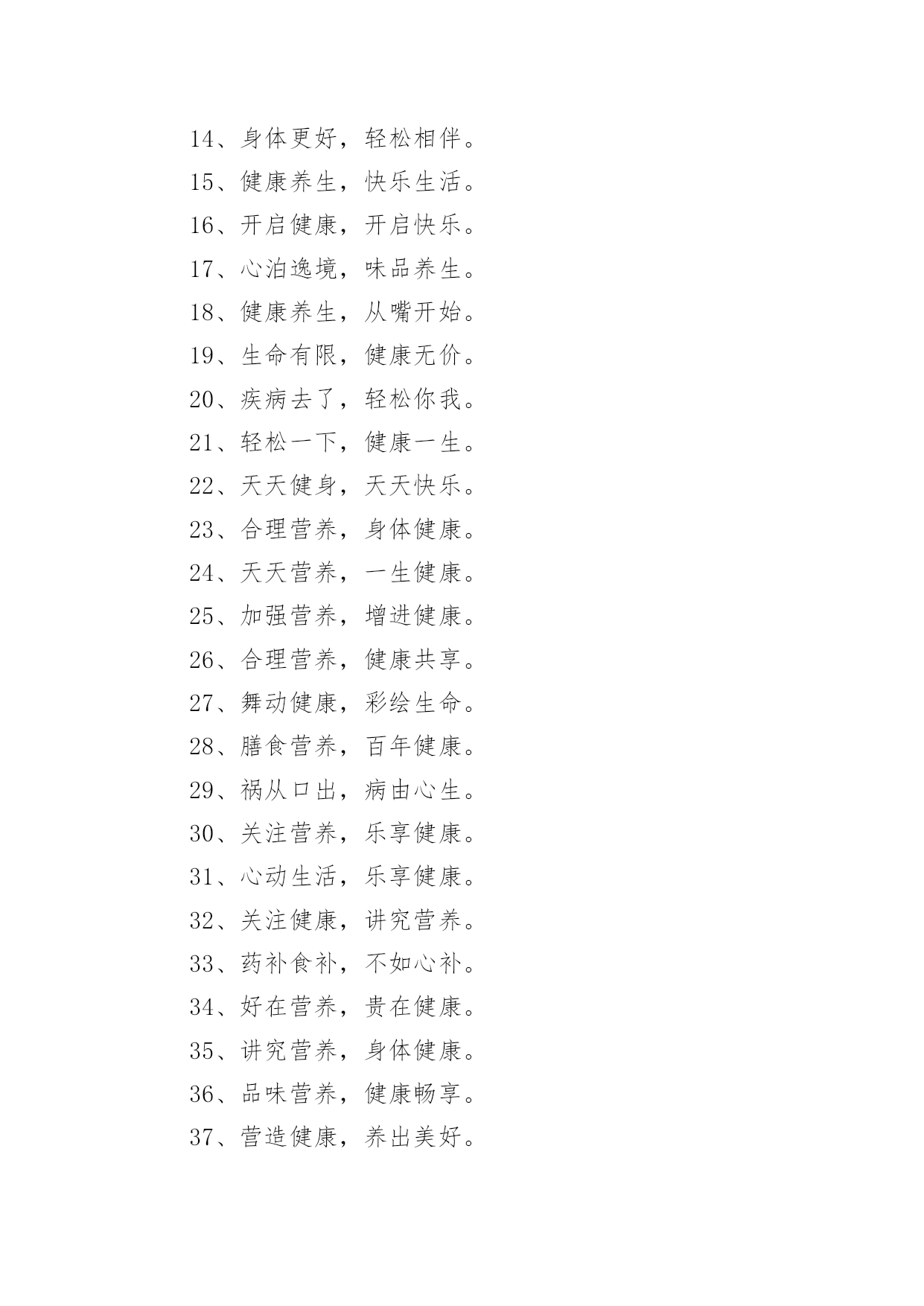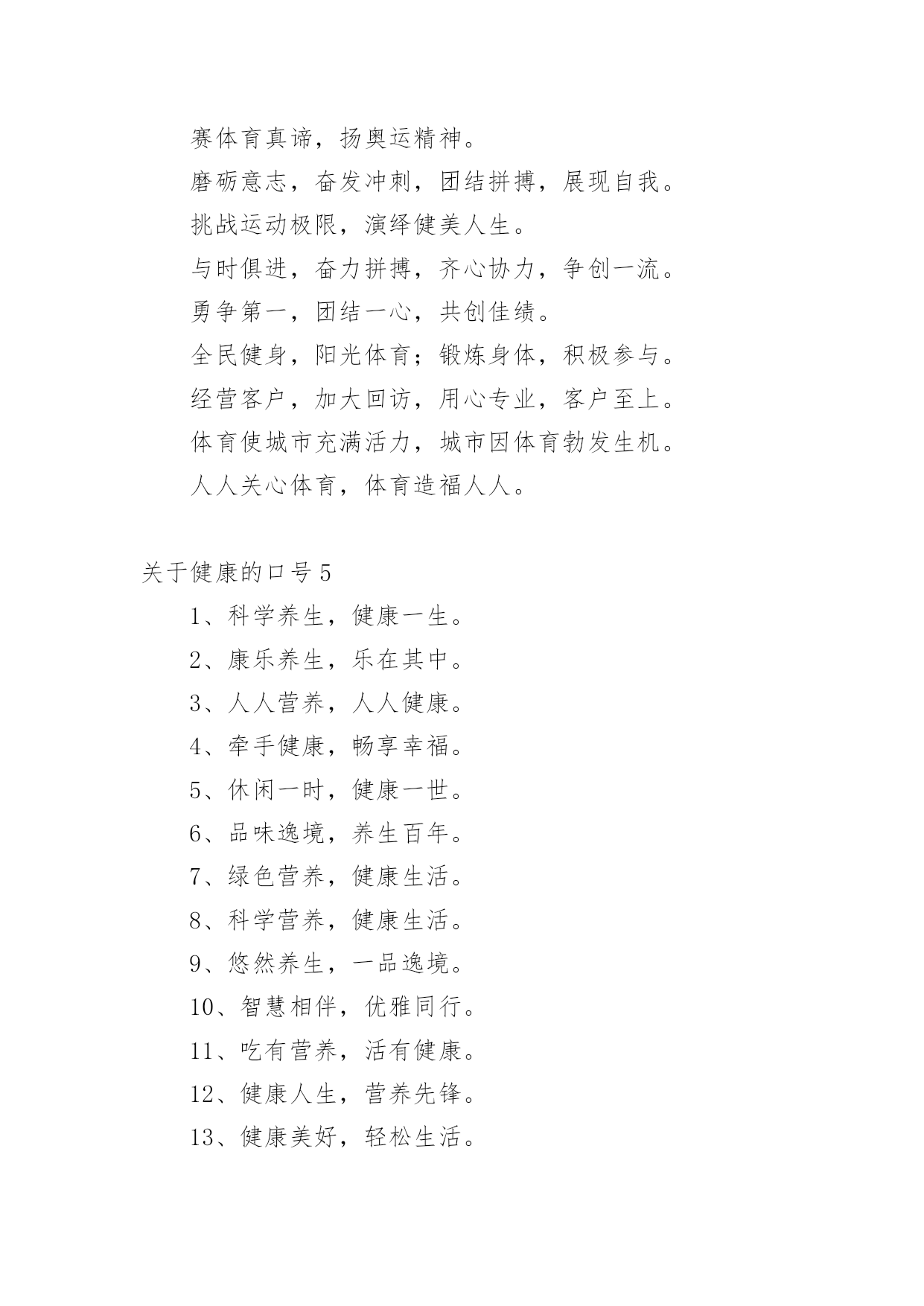 健康的口号关于健康的口号15篇无论是身处学校还是步入社会,大家总免不了要接触或使用口号吧,口号具有非常明显的时代特征和行业特色。你知道什么样的口号才能称之为经典吗?下面是小编整理的关于健康的口号,希望能够帮助到大家。关于健康的口号11、健康建立在饮食上!2、粒米虽小犹不易,莫把辛苦当儿戏。3、米饭粒粒念汗水,不惜粮食当自悔。4、饱口福还要节制保健康,聚餐饮尚须文明长精神。5、古诗《锄禾》你我读,盘中餐苦当记住。6、“合理膳食.规律起居,引领健康生活。”7、珍惜粮食,远离浪费。8、吃饭不要急,要慢慢才行。9、食堂饭菜香,买饭多谦让。10、一粥一饭当思来之不易,半丝半缕恒念物力为艰。11、吃健康,更要吃文明!12、“饮食天下,健康未来”关于健康的口号2励精图治,开拓进取九班九班,勇夺桂冠齐心协力,共创辉煌团结进取,开拓创新顽强拼搏,争创一流互相学习,取长补短再接再厉,勇攀高峰与时俱进,开拓创新顽强拼搏,勇夺第一励精图治,争创一流八年二班,猛虎出山x年二班,锐不可当奋力拼搏,扬我班风努力学习,勇争第一齐心协力,永创佳绩顽强拼搏,所向无敌山中猛虎,水中蛟龙五班,卧虎藏龙不鸣则已,一鸣惊人团结进取,争创佳绩努力拼搏,挑战自我积极进取,努力拼搏磨练意志,强健体魄龙腾虎跃,雷霆万钧无与伦比,万众一心齐心协力,争创佳绩勇夺三军,所向无敌班雄风,扬威大众,关于健康的口号31、扬体育精神,展青春风采。2、挥洒着青春的活力,放飞希望和梦想。3、挑战地心引力,引爆篮球魅力。4、没有最棒的,只有最好的`。5、超越极限,超越自我。6、力拔山兮气盖世,欲与天公试比高。7、健体魄强素质,促发展上水平。8、球球俱进,分分必得,不畏强暴,所向披靡。9、得此金秋朝气,争来机汽雄风。10、与时俱进,奋发图强。11、不言失败,赛出风采。12、青春运动,友谊健康。13、更强我能、更快更高。14、青春活力,团结友爱,尊敬师长。15、斗志激昂,勇攀高峰。16、锻炼身体、增强体质,报效祖国,造福人类。17、励精图治,奋发向上,努力拼搏,永不言弃。18、团结文明,展现风采。19、人类需要体育,世界向往和和平。20、做文明观众,树赛场新风。21、淡泊明志,宁静致远,团结友爱,顽强拼搏。22、挥动激情,放飞梦想。23、魅力永久,充满自信,赢得胜利。24、志比天高,气比山昂,机汽学子,力争更强。25、顽强拼搏,勇攀高峰。26、年轻健儿显身手,时代骄子竞风流。27、努力拼搏,自强不息。28、励精图治,争创一流,好好学习,天天向上。29、人类需要体育,世界向往和平。30、命运全在拼击,奋斗就是希望。31、勇往直前,球球必进。32、文明守纪,拥抱胜利。33、奥运精神放异彩,年轻健儿展风姿。34、比出风采、超越自我。35、生命因运动精彩,体育让梦想成真。36、磨砺意志,奋发冲刺。37、今天付出,明天收获,全力以赴,事业辉煌。38、释放激情,放飞梦想,今天明天,由我创造。39、扬帆起航,劈波斩浪,再创辉煌。40、发展体育运动,推行全民健身。41、友谊第一,比赛第二。42、春风吹,战鼓擂,我们怕过谁。43、青春似火,超越自我。44、激情燃烧希望,励志赢来成功。45、奋勇拼搏,展现自我。46、青春无畏,逐梦扬威。47、赛出风格,赛出水平。48、青春拥抱梦想,拼搏成就辉煌。49、团结拼搏,永创辉煌。50、比拼激扬梦想,搏击磨砺锋芒。51、赛体育真谛,扬奥运精神。52、磨砺意志,奋发冲刺,团结拼搏,展现自我。53、挑战运动极限,演绎健美人生。54、与时俱进,奋力拼搏,齐心协力,争创一流。55、勇争第一,团结一心,共创佳绩。56、全民健身,阳光体育;锻炼身体,积极参与。57、经营客户,加大回访,用心专业,客户至上。58、体育使城市充满活力,城市因体育勃发生机。59、人人关心体育,体育造福人人。60、团结拼搏,拼搏前进。61、挥动激情,放飞梦想,团结拼搏,树我雄风。62、我运动,我健康,我快乐。63、怀学生心,做最强人。64、你参与了,你坚持了,你胜利了。65、团结拼搏,拼搏进取。66、赛出成绩,安全第一。67、运动起来,勇敢第一。68、组织发展大飞跃,人气高涨直冲天。69、努力拼搏,永夺第一。70、追梦扬威,奋勇争先。71、团结一心,奋勇向前,追求卓越,争创第一。72、努力奋斗,勇敢争先。73、挑战自我,超越梦想,团结互助,共创佳绩。74、天道酬勤,健康起来。75、与时俱进,开拓创新,顽强拼搏,勇夺第一。76、前进,创造出一个又一个的奇迹。77、久久生辉,永放光芒。78、我运动,我快乐,我锻炼,我提高。79、团结拼搏,争创伟绩,飞跃梦想,自强不息。80、鸣奏青春旋律,抒写运动乐意。81、发展体育运动,增强人民体质。82、赛出水平,赛出风格,全面提高综合素质。83、敢闯敢拼,齐心协力,争创佳绩。84、