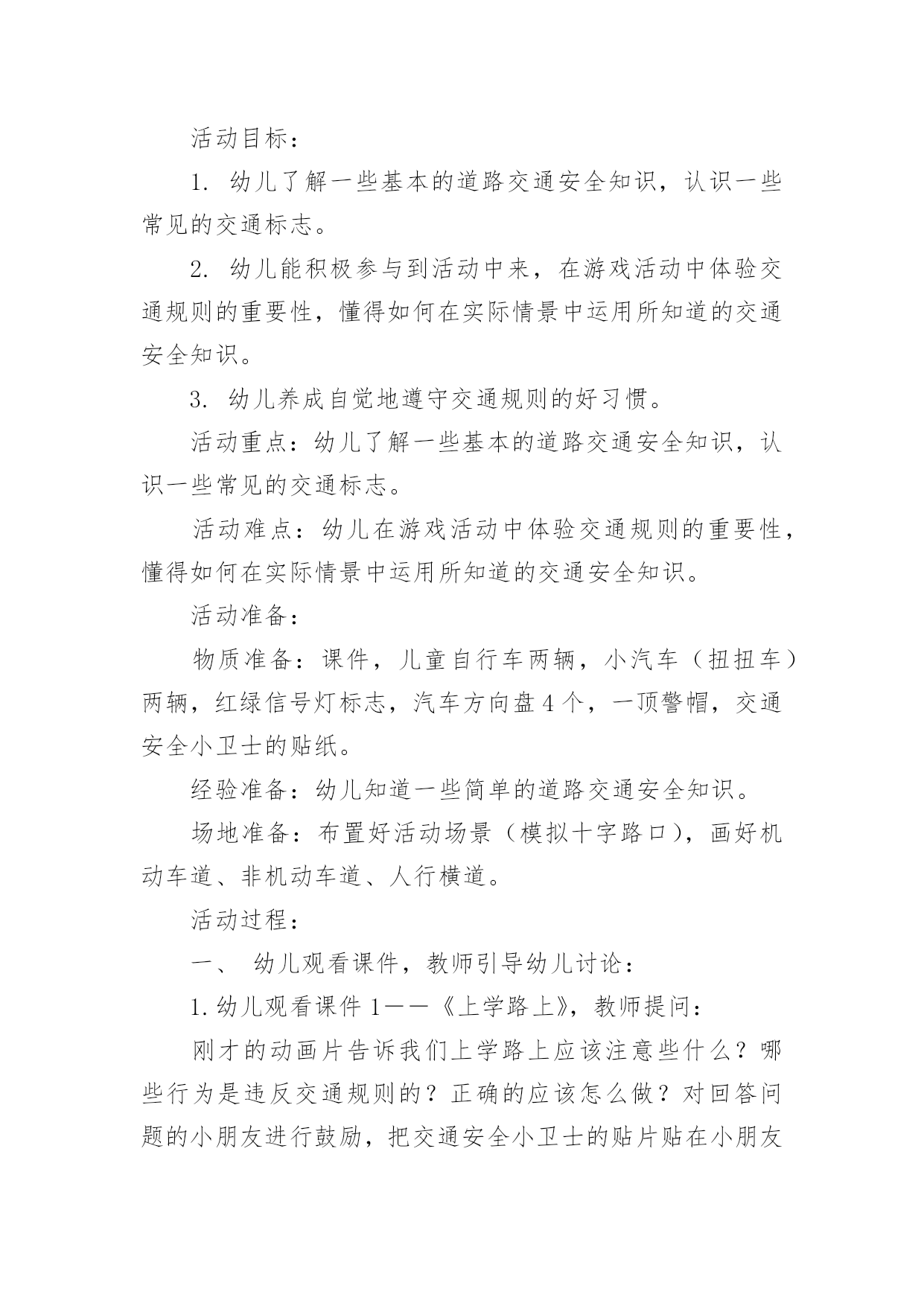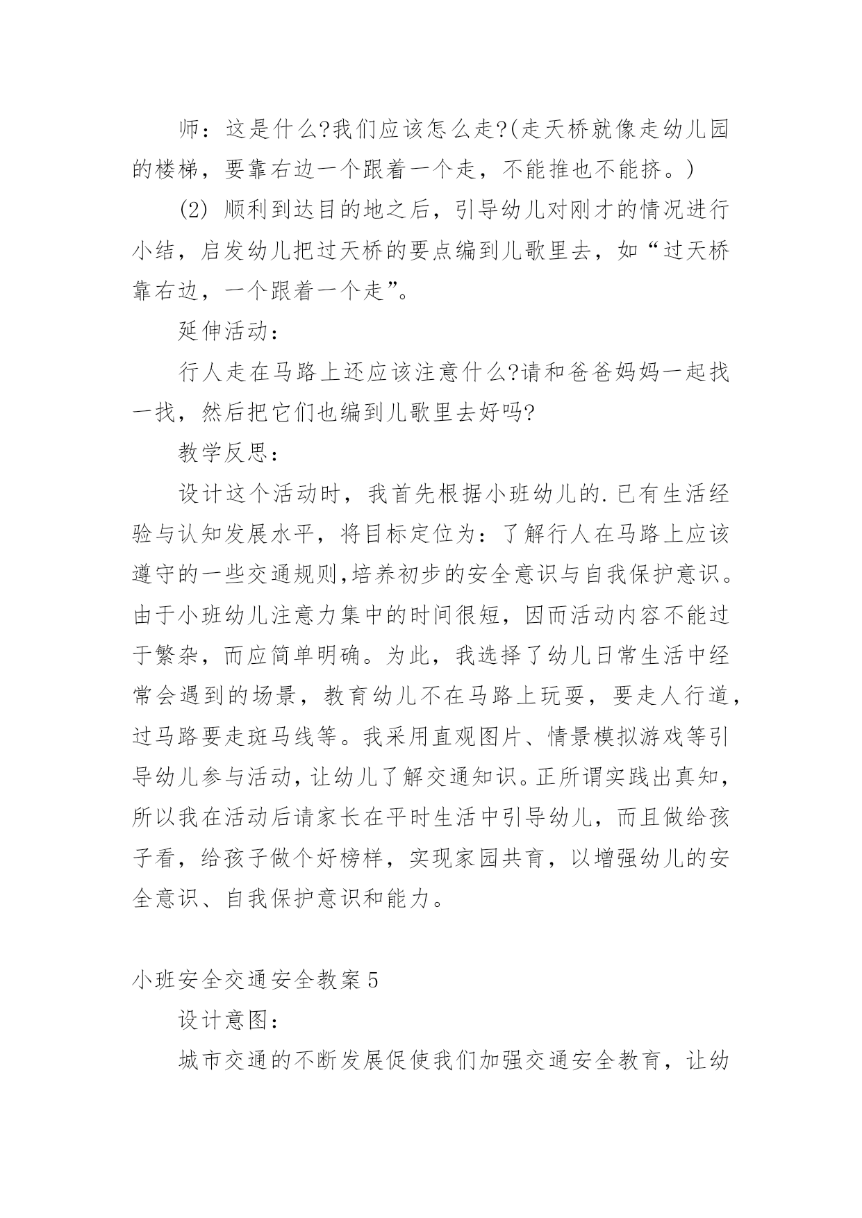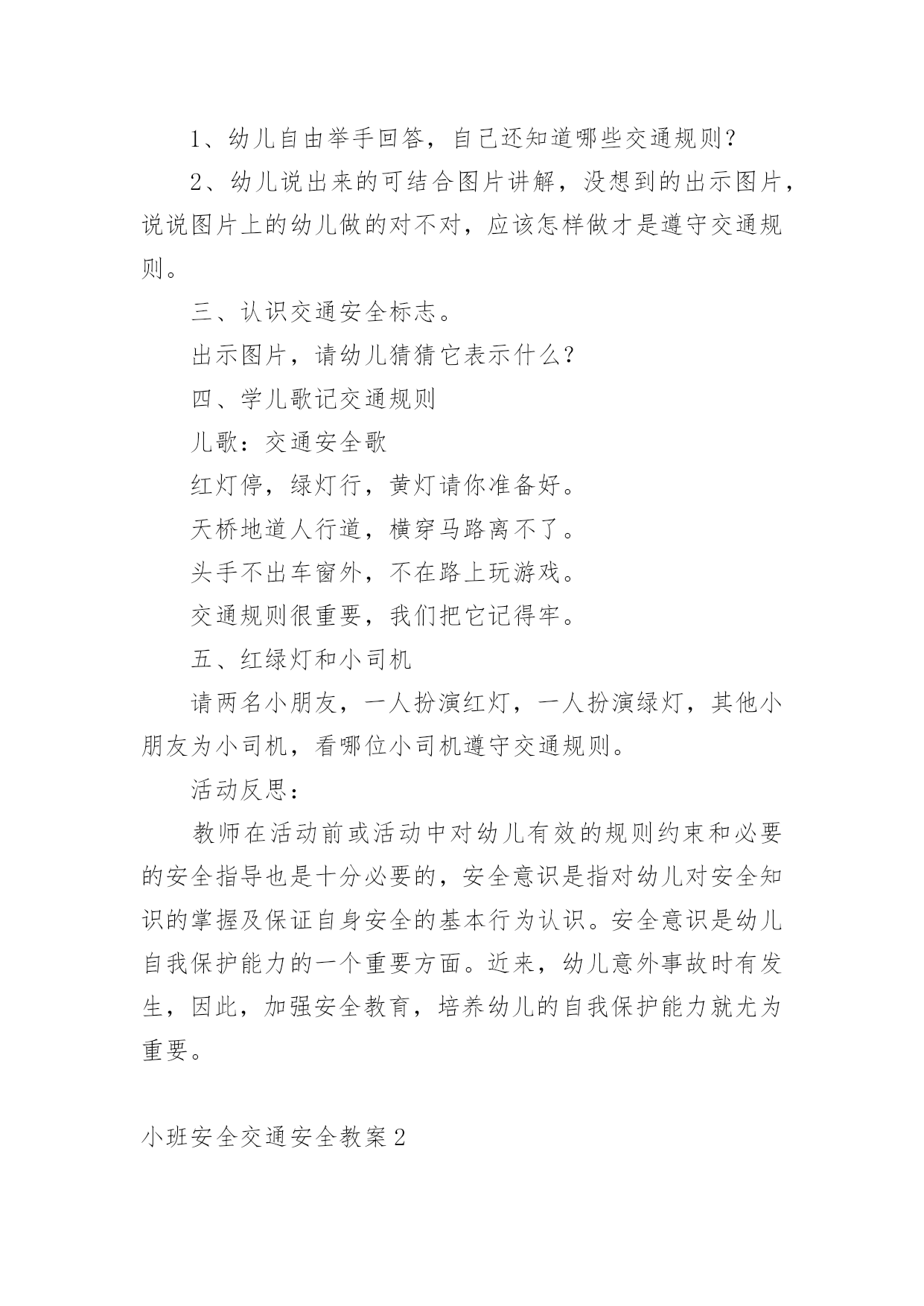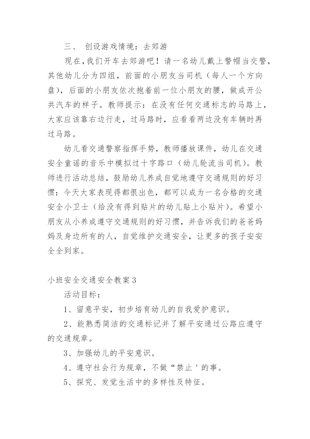 小班安全交通安全教案小班安全交通安全教案15篇作为一位优秀的人民教师,有必要进行细致的教案准备工作,教案是实施教学的主要依据,有着至关重要的作用。如何把教案做到重点突出呢?以下是小编精心整理的小班安全交通安全教案,欢迎大家借鉴与参考,希望对大家有所帮助。小班安全交通安全教案1活动目标:1、教幼儿学习一些交通规则,认识一些交通安全标志。2、幼儿能从小养成遵守交通规则的习惯。3、培养幼儿敏锐的观察能力。4、遵守社会行为规则,不做“禁止”的事。5、加强幼儿的安全意识。活动准备:情景图片五张。红绿灯标志各一张,交通标志图五张。活动过程:一、猜谜语,导入新课。红绿灯和斑马线,可结合班内墙上的.斑马线图案介绍斑马线的作用。二、结合情景图片,学习交通规则。1、幼儿自由举手回答,自己还知道哪些交通规则?2、幼儿说出来的可结合图片讲解,没想到的出示图片,说说图片上的幼儿做的对不对,应该怎样做才是遵守交通规则。三、认识交通安全标志。出示图片,请幼儿猜猜它表示什么?四、学儿歌记交通规则儿歌:交通安全歌红灯停,绿灯行,黄灯请你准备好。天桥地道人行道,横穿马路离不了。头手不出车窗外,不在路上玩游戏。交通规则很重要,我们把它记得牢。五、红绿灯和小司机请两名小朋友,一人扮演红灯,一人扮演绿灯,其他小朋友为小司机,看哪位小司机遵守交通规则。活动反思:教师在活动前或活动中对幼儿有效的规则约束和必要的安全指导也是十分必要的,安全意识是指对幼儿对安全知识的掌握及保证自身安全的基本行为认识。安全意识是幼儿自我保护能力的一个重要方面。近来,幼儿意外事故时有发生,因此,加强安全教育,培养幼儿的自我保护能力就尤为重要。小班安全交通安全教案2活动目标:1.幼儿了解一些基本的道路交通安全知识,认识一些常见的交通标志。2.幼儿能积极参与到活动中来,在游戏活动中体验交通规则的重要性,懂得如何在实际情景中运用所知道的交通安全知识。3.幼儿养成自觉地遵守交通规则的好习惯。活动重点:幼儿了解一些基本的道路交通安全知识,认识一些常见的交通标志。活动难点:幼儿在游戏活动中体验交通规则的重要性,懂得如何在实际情景中运用所知道的交通安全知识。活动准备:物质准备:课件,儿童自行车两辆,小汽车(扭扭车)两辆,红绿信号灯标志,汽车方向盘4个,一顶警帽,交通安全小卫士的贴纸。经验准备:幼儿知道一些简单的道路交通安全知识。场地准备:布置好活动场景(模拟十字路口),画好机动车道、非机动车道、人行横道。活动过程:一、幼儿观看课件,教师引导幼儿讨论:1.幼儿观看课件1――《上学路上》,教师提问:刚才的动画片告诉我们上学路上应该注意些什么?哪些行为是违反交通规则的?正确的应该怎么做?对回答问题的小朋友进行鼓励,把交通安全小卫士的贴片贴在小朋友的胸前。2.幼儿观看课件2――认识一些常见的.交通标志,教师提问:你认识这些标志吗?你知道它们是什么意思吗?(禁止非机动车行驶,行人走道,禁止行人通过,减速慢行、注意行人)二、设置情境,幼儿模拟过十字路口:1.组织幼儿按十字型分组坐在画好的场地上。幼儿认识斑马线、非机动车道,机动车道。2.幼儿游戏,模拟看信号灯过马路:两个小朋友开扭扭车当司机,两个小朋友骑单车以及四个行人模拟过十字路口。幼儿在没有指挥的情况下过十字路口,车辆和行人任意穿行。引导幼儿讨论:小朋友,刚才你们看到了什么?他们做得对吗?他们应该怎么做?教师小结幼儿讲述,出示红绿信号灯,请出一位幼儿来当指挥,幼儿再次有序地过马路。3.幼儿模拟看现场指挥过十字路口刚才我们认识的红绿灯和交通标志对维护交通安全起着重要的作用。但不是每个路口都有红绿灯,没有红绿灯的路口由谁来指挥交通呢?(交通警察)交通警察怎么指挥交通呢?你们想学交通指挥手势吗?幼儿学习几种简单的交通指挥手势。请一名幼儿戴上警帽当交警,幼儿模拟看现场指挥过十字路口。三、创设游戏情境:去郊游现在,我们开车去郊游吧!请一名幼儿戴上警帽当交警,其他幼儿分为四组,前面的小朋友当司机(每人一个方向盘),后面的小朋友依次抱着前一位小朋友的腰,做成开公共汽车的样子。教师提示:在没有任何交通标志的马路上,大家应该靠右边行走,过马路时,应看看两边没有车辆时再过马路。幼儿看交通警察指挥手势,教师播放课件,幼儿在交通安全童谣的音乐中模拟过十字路口(幼儿轮流当司机)。教师进行活动总结,鼓励幼儿养成自觉地遵守交通规则的好习惯:今天大家表现得都很出色,都可以成为一名合格的交通安全小卫士(给没有得到贴片的幼儿贴上小贴片)。希望小朋友从小养成遵守交通规则的好习惯,并告诉我们的爸爸妈妈及身边所有的人,自觉维护交通安全,让更多的孩子安安全全到家。小班安全交通安全教案3活动目标:1、留意平安,初步培育幼儿的自我爱护意识。2、能熟悉简洁的交通标记并了解平安通过公路应遵守的交通规章。3、加强幼儿