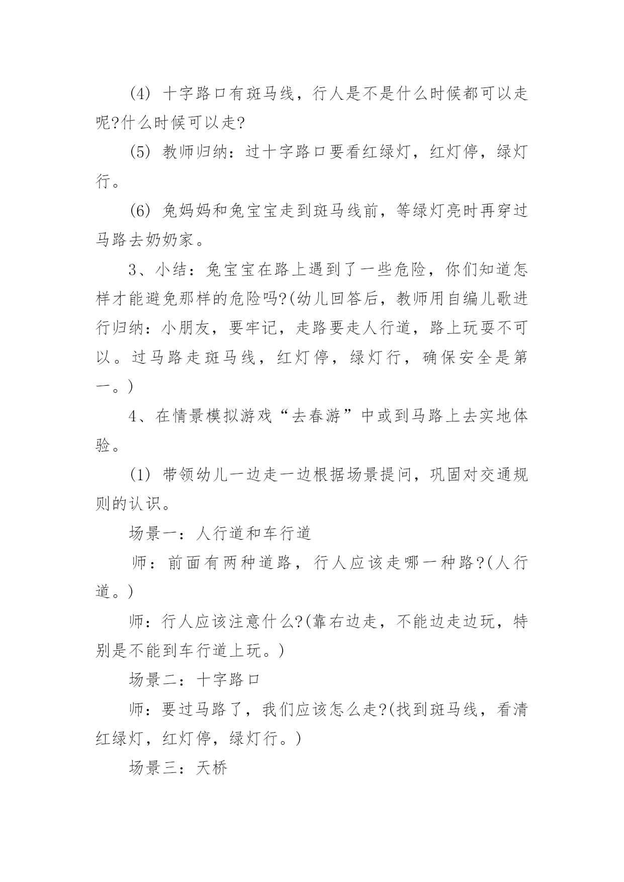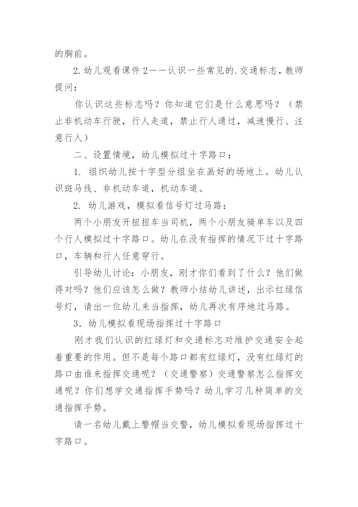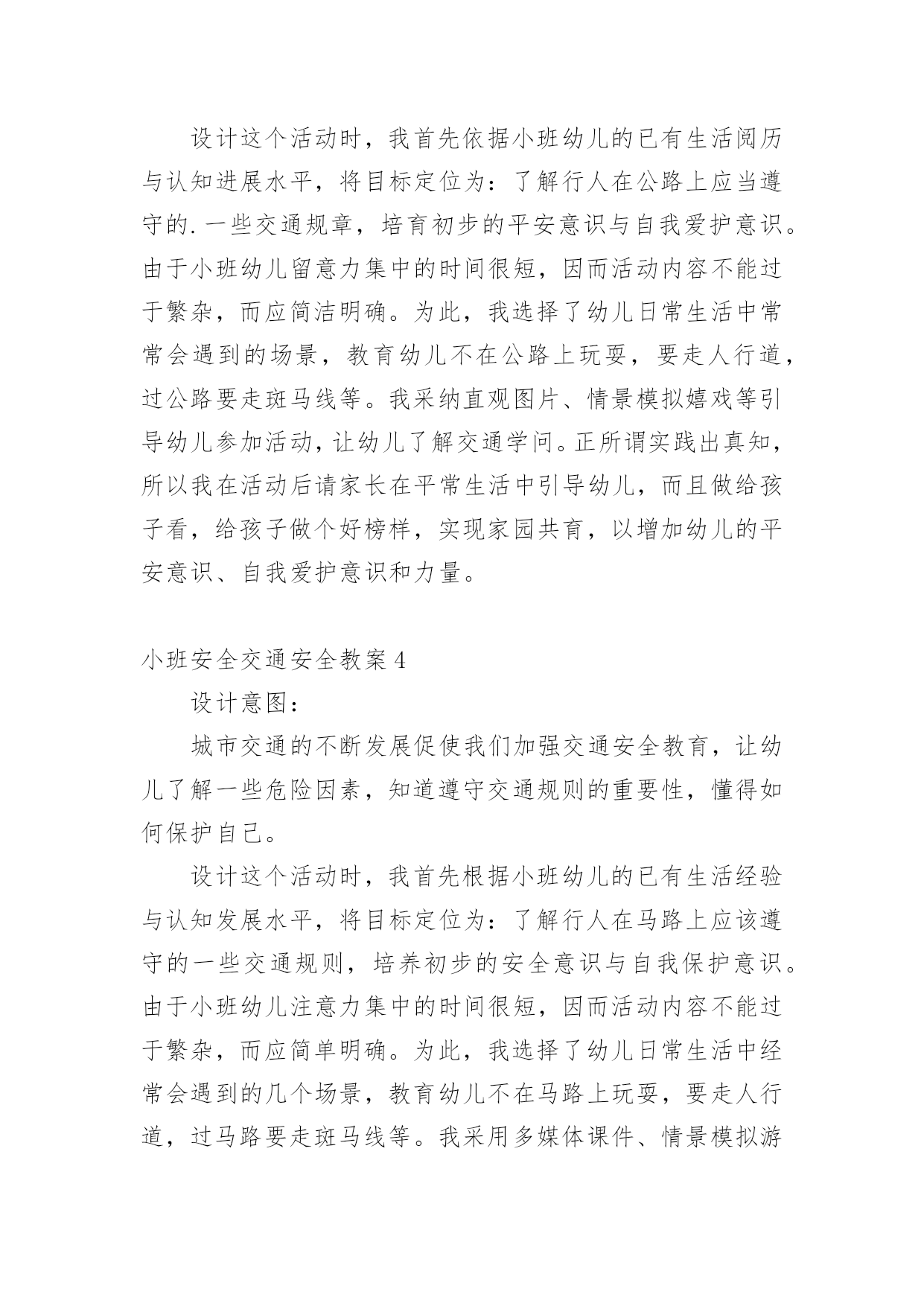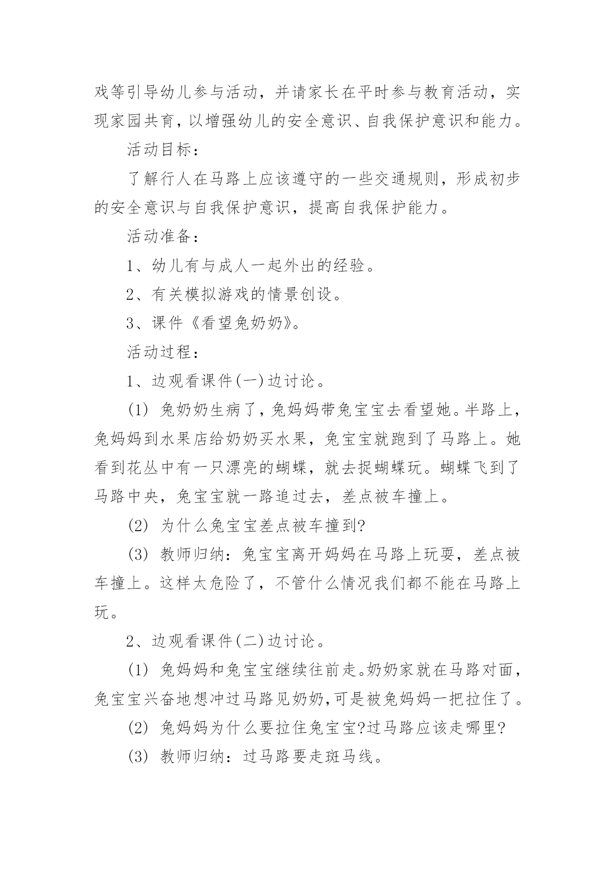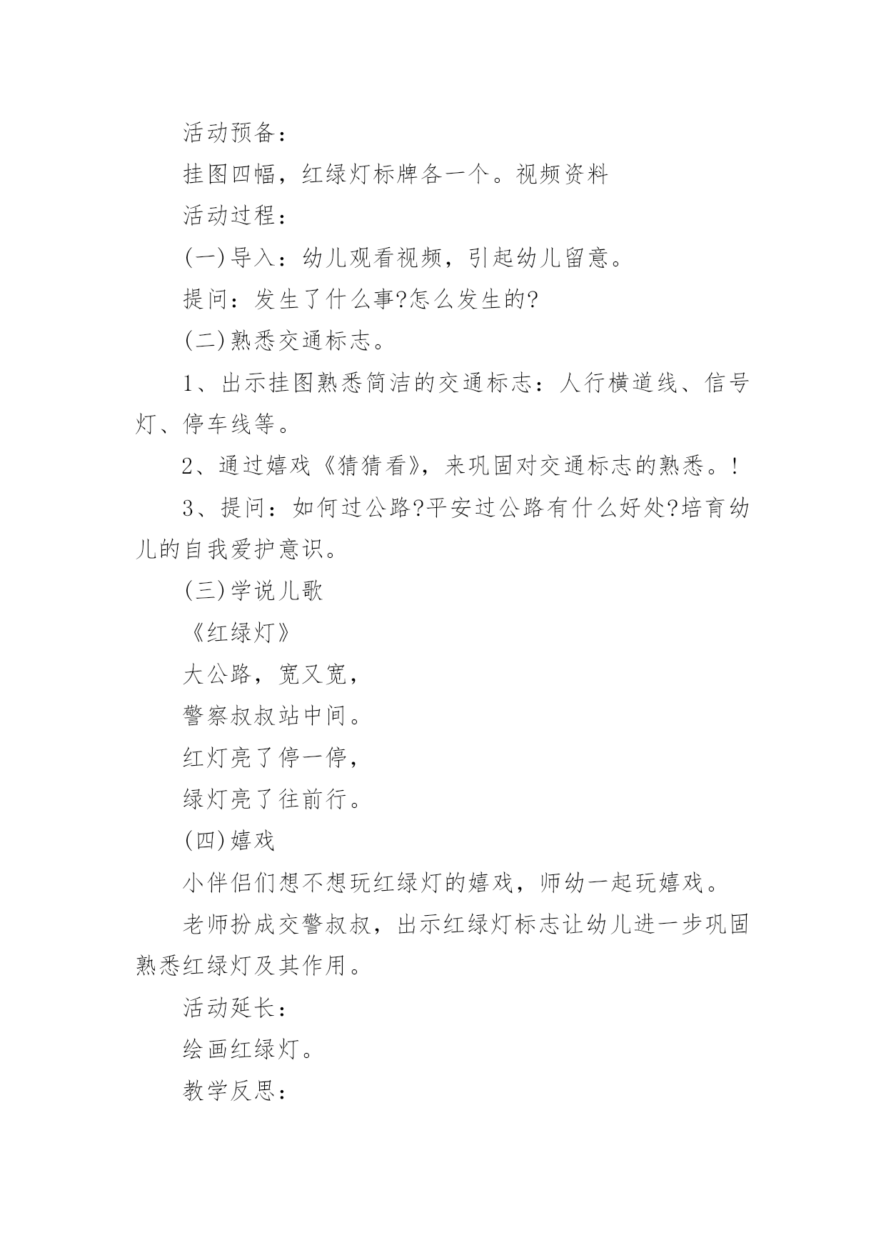 小班安全交通安全教案小班安全交通安全教案15篇作为一位优秀的人民教师,有必要进行细致的教案准备工作,教案是实施教学的主要依据,有着至关重要的作用。如何把教案做到重点突出呢?以下是小编精心整理的小班安全交通安全教案,欢迎大家借鉴与参考,希望对大家有所帮助。小班安全交通安全教案1活动目标:1、教幼儿学习一些交通规则,认识一些交通安全标志。2、幼儿能从小养成遵守交通规则的习惯。3、培养幼儿敏锐的观察能力。4、遵守社会行为规则,不做“禁止”的事。5、加强幼儿的安全意识。活动准备:情景图片五张。红绿灯标志各一张,交通标志图五张。活动过程:一、猜谜语,导入新课。红绿灯和斑马线,可结合班内墙上的.斑马线图案介绍斑马线的作用。二、结合情景图片,学习交通规则。1、幼儿自由举手回答,自己还知道哪些交通规则?2、幼儿说出来的可结合图片讲解,没想到的出示图片,说说图片上的幼儿做的对不对,应该怎样做才是遵守交通规则。三、认识交通安全标志。出示图片,请幼儿猜猜它表示什么?四、学儿歌记交通规则儿歌:交通安全歌红灯停,绿灯行,黄灯请你准备好。天桥地道人行道,横穿马路离不了。头手不出车窗外,不在路上玩游戏。交通规则很重要,我们把它记得牢。五、红绿灯和小司机请两名小朋友,一人扮演红灯,一人扮演绿灯,其他小朋友为小司机,看哪位小司机遵守交通规则。活动反思:教师在活动前或活动中对幼儿有效的规则约束和必要的安全指导也是十分必要的,安全意识是指对幼儿对安全知识的掌握及保证自身安全的基本行为认识。安全意识是幼儿自我保护能力的一个重要方面。近来,幼儿意外事故时有发生,因此,加强安全教育,培养幼儿的自我保护能力就尤为重要。小班安全交通安全教案2活动目标:1.幼儿了解一些基本的道路交通安全知识,认识一些常见的交通标志。2.幼儿能积极参与到活动中来,在游戏活动中体验交通规则的重要性,懂得如何在实际情景中运用所知道的交通安全知识。3.幼儿养成自觉地遵守交通规则的好习惯。活动重点:幼儿了解一些基本的道路交通安全知识,认识一些常见的交通标志。活动难点:幼儿在游戏活动中体验交通规则的重要性,懂得如何在实际情景中运用所知道的交通安全知识。活动准备:物质准备:课件,儿童自行车两辆,小汽车(扭扭车)两辆,红绿信号灯标志,汽车方向盘4个,一顶警帽,交通安全小卫士的贴纸。经验准备:幼儿知道一些简单的道路交通安全知识。场地准备:布置好活动场景(模拟十字路口),画好机动车道、非机动车道、人行横道。活动过程:一、幼儿观看课件,教师引导幼儿讨论:1.幼儿观看课件1――《上学路上》,教师提问:刚才的动画片告诉我们上学路上应该注意些什么?哪些行为是违反交通规则的?正确的应该怎么做?对回答问题的小朋友进行鼓励,把交通安全小卫士的贴片贴在小朋友的胸前。2.幼儿观看课件2――认识一些常见的.交通标志,教师提问:你认识这些标志吗?你知道它们是什么意思吗?(禁止非机动车行驶,行人走道,禁止行人通过,减速慢行、注意行人)二、设置情境,幼儿模拟过十字路口:1.组织幼儿按十字型分组坐在画好的场地上。幼儿认识斑马线、非机动车道,机动车道。2.幼儿游戏,模拟看信号灯过马路:两个小朋友开扭扭车当司机,两个小朋友骑单车以及四个行人模拟过十字路口。幼儿在没有指挥的情况下过十字路口,车辆和行人任意穿行。引导幼儿讨论:小朋友,刚才你们看到了什么?他们做得对吗?他们应该怎么做?教师小结幼儿讲述,出示红绿信号灯,请出一位幼儿来当指挥,幼儿再次有序地过马路。3.幼儿模拟看现场指挥过十字路口刚才我们认识的红绿灯和交通标志对维护交通安全起着重要的作用。但不是每个路口都有红绿灯,没有红绿灯的路口由谁来指挥交通呢?(交通警察)交通警察怎么指挥交通呢?你们想学交通指挥手势吗?幼儿学习几种简单的交通指挥手势。请一名幼儿戴上警帽当交警,幼儿模拟看现场指挥过十字路口。三、创设游戏情境:去郊游现在,我们开车去郊游吧!请一名幼儿戴上警帽当交警,其他幼儿分为四组,前面的小朋友当司机(每人一个方向盘),后面的小朋友依次抱着前一位小朋友的腰,做成开公共汽车的样子。教师提示:在没有任何交通标志的马路上,大家应该靠右边行走,过马路时,应看看两边没有车辆时再过马路。幼儿看交通警察指挥手势,教师播放课件,幼儿在交通安全童谣的音乐中模拟过十字路口(幼儿轮流当司机)。教师进行活动总结,鼓励幼儿养成自觉地遵守交通规则的好习惯:今天大家表现得都很出色,都可以成为一名合格的交通安全小卫士(给没有得到贴片的幼儿贴上小贴片)。希望小朋友从小养成遵守交通规则的好习惯,并告诉我们的爸爸妈妈及身边所有的人,自觉维护交通安全,让更多的孩子安安全全到家。小班安全交通安全教案3活动目标:1、留意平安,初步培育幼儿的自我爱护意识。2、能熟悉简洁的交通标记并了解平安通过公路应遵守的交通规章。3、加强幼儿
