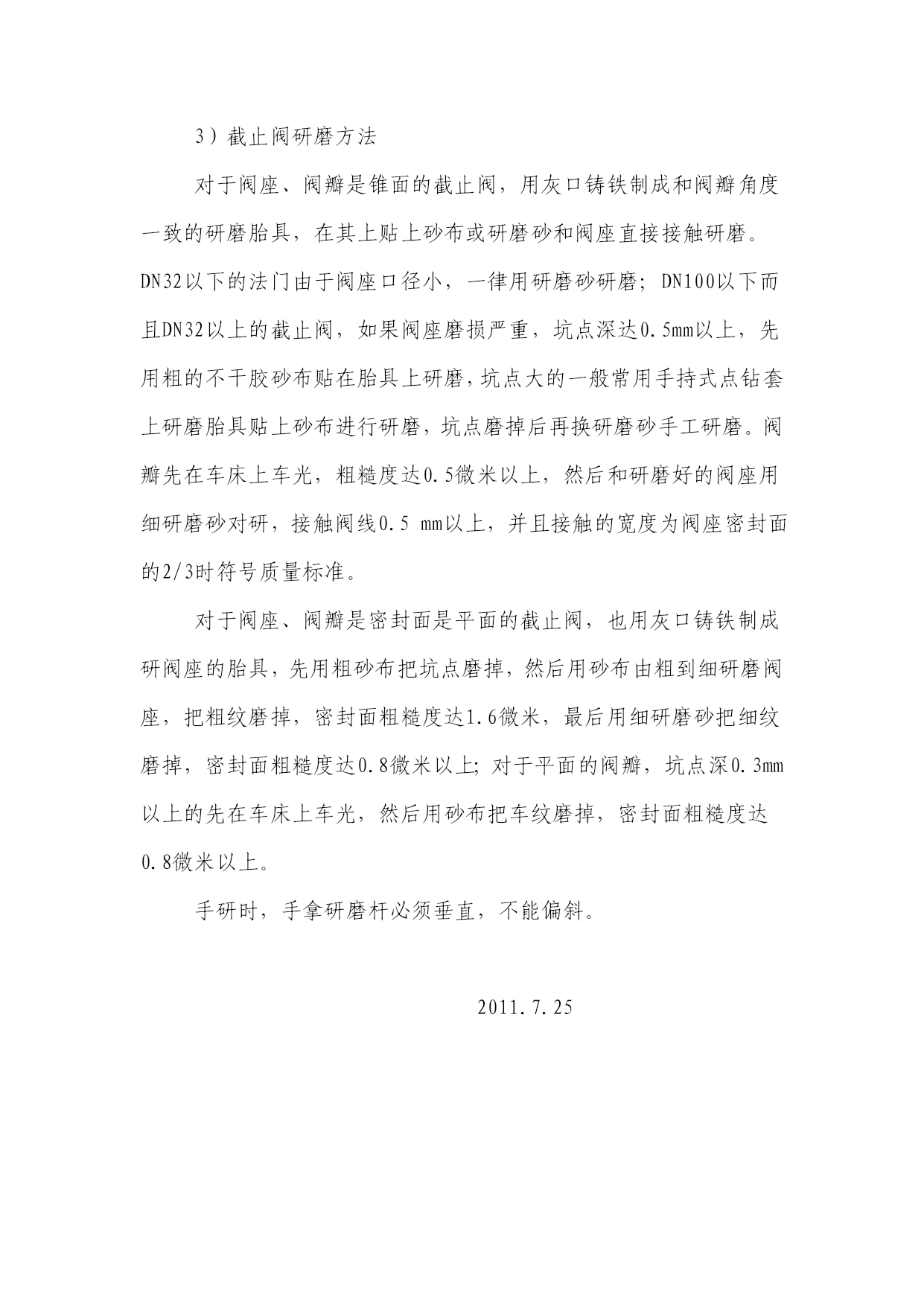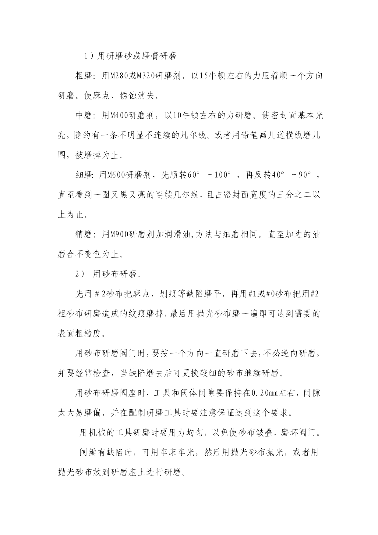 阀门研磨培训讲义阀门是锅炉管路的重要附件,是装配在管道和其他设备上,用来控制(启闭、调节)工质,即接通或切断流通介质的通路,改变介质的流动方向,调节介质的流量和压力,以及保持压力容器和管道的工作压力不超限。1、阀门研磨材料阀门密封面的研磨并不是研磨头或研磨座和被研磨的阀瓣、阀座直接接触对磨,而是要垫或抹上一层研磨材料,以利用研磨材料硬度高的微粒将被研磨件磨光。经过多年的实践证明,常用的研磨材料有砂布、水磨砂纸、研磨膏等。机研的有砂轮、金刚砂轮、不干胶砂布等。研磨砂的型号有80号,120号,150号,220号,240号,300号,500号,800号,1000号,1500号,2000号,3000号,5000号,6000号,表示每平方厘米含颗粒数,6000号最细,砂纸型号有36号,50号,80号,120号,180号,200号,220号,240号,320号,360号,400号,600号,1000号,1500号以及金像砂纸。2、研磨工具1)常用的手工研磨工具有手摇钻、根据不同阀门类型自制的研磨胎具、研磨杆等。2)机研有各种不同类型进口、国产的研磨机、如气动研磨机、电动动研磨机。3、研磨方法:1)用研磨砂或磨膏研磨粗磨:用M280或M320研磨剂,以15牛顿左右的力压着顺一个方向研磨。使麻点、锈蚀消失。中磨:用M400研磨剂,以10牛顿左右的力研磨。使密封面基本光亮,隐约有一条不明显不连续的凡尔线。或者用铅笔画几道横线磨几圈,被磨掉为止。细磨:用M600研磨剂,先顺转60°~100°,再反转40°~90°,直至看到一圈又黑又亮的连续几尔线,且占密封面宽度的三分之二以上为止。精磨:用M900研磨剂加润滑油,方法与细磨相同。直至加进的油磨合不变色为止。2)用砂布研磨。先用#2砂布把麻点、划痕等缺陷磨平,再用#1或#0砂布把用#2粗砂布研磨造成的纹痕磨掉,最后用抛光砂布磨一遍即可达到需要的表面粗糙度。用砂布研磨阀门时,要按一个方向一直研磨下去,不必逆向研磨,并要经常检查,当缺陷磨去后可更换较细的砂布继续研磨。用砂布研磨阀座时,工具和阀体间隙要保持在0.20mm左右,间隙太大易磨偏,并在配制研磨工具时要注意保证达到这个要求。用机械的工具研磨时要用力均匀,以免使砂布皱叠,磨坏阀门。阀瓣有缺陷时,可用车床车光,然后用抛光砂布抛光,或者用抛光砂布放到研磨座上进行研磨。3)截止阀研磨方法对于阀座、阀瓣是锥面的截止阀,用灰口铸铁制成和阀瓣角度一致的研磨胎具,在其上贴上砂布或研磨砂和阀座直接接触研磨。DN32以下的法门由于阀座口径小,一律用研磨砂研磨;DN100以下而且DN32以上的截止阀,如果阀座磨损严重,坑点深达0.5mm以上,先用粗的不干胶砂布贴在胎具上研磨,坑点大的一般常用手持式点钻套上研磨胎具贴上砂布进行研磨,坑点磨掉后再换研磨砂手工研磨。阀瓣先在车床上车光,粗糙度达0.5微米以上,然后和研磨好的阀座用细研磨砂对研,接触阀线0.5mm以上,并且接触的宽度为阀座密封面的2/3时符号质量标准。对于阀座、阀瓣是密封面是平面的截止阀,也用灰口铸铁制成研阀座的胎具,先用粗砂布把坑点磨掉,然后用砂布由粗到细研磨阀座,把粗纹磨掉,密封面粗糙度达1.6微米,最后用细研磨砂把细纹磨掉,密封面粗糙度达0.8微米以上;对于平面的阀瓣,坑点深0.3mm以上的先在车床上车光,然后用砂布把车纹磨掉,密封面粗糙度达0.8微米以上。手研时,手拿研磨杆必须垂直,不能偏斜。2011.7.25