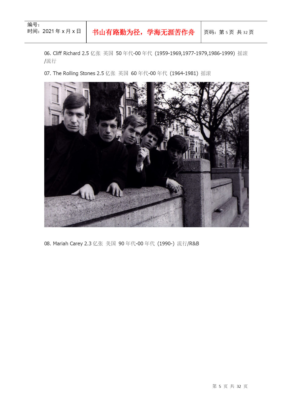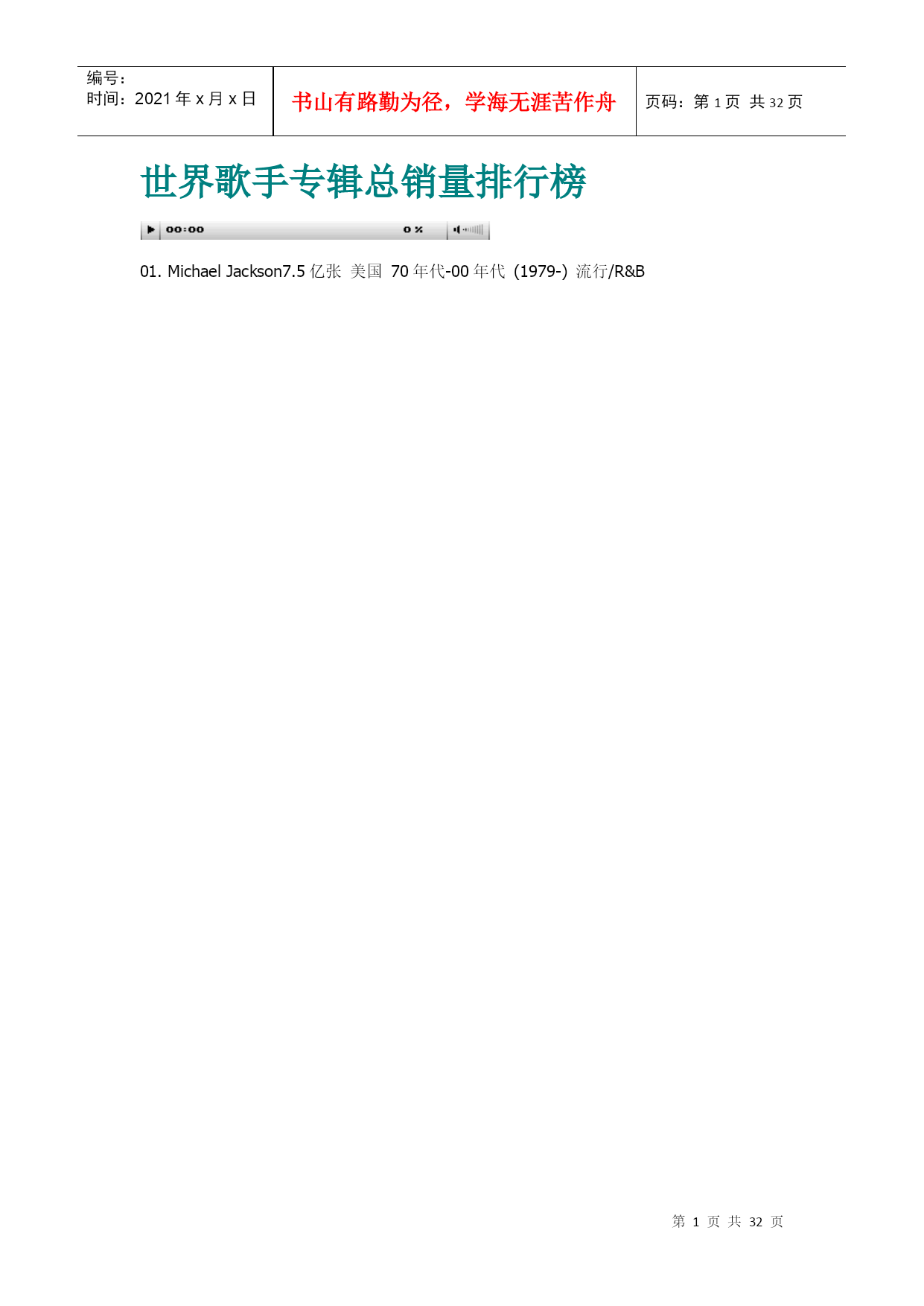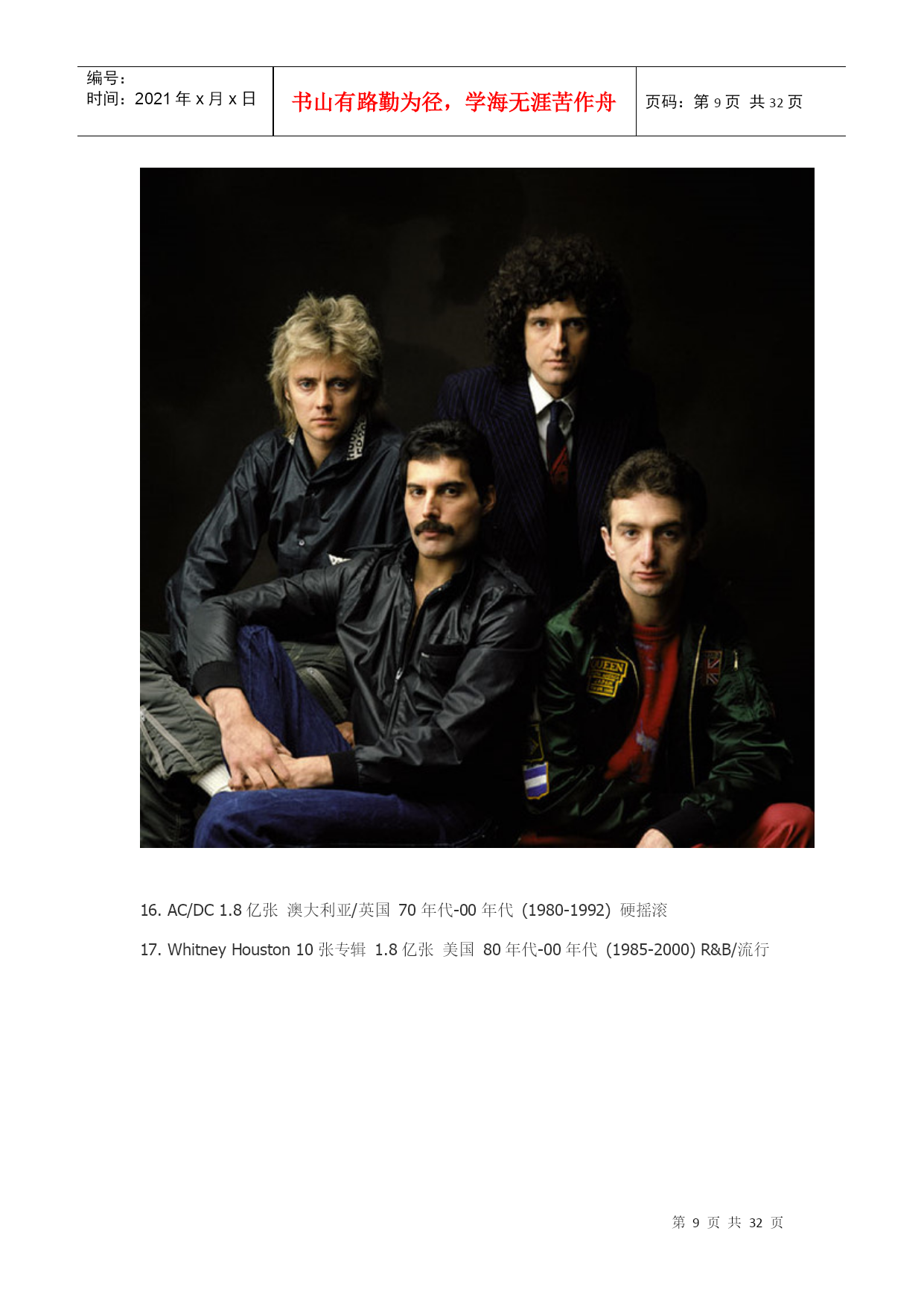 编号:时间:2021年x月x日书山有路勤为径,学海无涯苦作舟页码:第PAGE32页共NUMPAGES32页第PAGE\*MERGEFORMAT32页共NUMPAGES\*MERGEFORMAT32页世界歌手专辑总销量排行榜01.MichaelJackson7.5亿张美国70年代-00年代(1979-)流行/R&B02.TheBeatles4亿张英国60年代(1962-1970)摇滚/流行03.ElvisPresley3亿张美国50年代-70年代(1956-1977)乡村/摇滚04.Madonna2.75亿张美国80年代-00年代(1984-)流行05.NanaMouskouri2.5亿张希腊60年代-00年代(1959-)流行06.CliffRichard2.5亿张英国50年代-00年代(1959-1969,1977-1979,1986-1999)摇滚/流行07.TheRollingStones2.5亿张英国60年代-00年代(1964-1981)摇滚08.MariahCarey2.3亿张美国90年代-00年代(1990-)流行/R&B09.EltonJohn2.2亿张英国70年代-00年代(1972-1976,1989-1991,1997-)流行10.CelineDion2.2亿张加拿大80年代-00年代(1990-)流行十至一佰:11.PinkFloyd2.1亿张英国60年代-00年代(1970-1983,1994-1995)摇滚12.LedZeppelin2亿张英国60年代-70年代(1969-1979)摇滚/布鲁斯13.Metallica2亿张美国80's-00's(1991-1997)硬摇滚14.JulioIglesias2亿张西班牙70年代-00年代(1969-)拉丁/流行15.Queen1.8亿张英国70年代-00年代(1975-1995)摇滚16.AC/DC1.8亿张澳大利亚/英国70年代-00年代(1980-1992)硬摇滚17.WhitneyHouston10张专辑1.8亿张美国80年代-00年代(1985-2000)R&B/流行18.ABBA1.6亿张瑞典70年代-80年代(1974-1982)迪斯科/流行19.U21.5亿张Ireland80年代-00年代(1983-)摇滚/流行20.TheJacksons1.5亿张美国60年代-80年代(1969-1980)R&B21.GarthBrooks1.45亿张美国80年代-00年代(1989-2001)乡村22.JanetJackson11张专辑1.3亿张美国80年代-00年代(1986-)R&B/流行23.TheEagles1.2亿张美国70年代-00年代(1974-1979)乡村/摇滚24.张学友1.2亿张中国80年代-00年代(1984-)流行25.TheBeeGees1.1亿张英国/澳大利亚60年代-00年代(1975-1979)流行/迪斯科26.BonJovi1.1亿张美国80年代-00年代(1986-2000)摇滚/硬摇滚27.R.E.M.1.1亿张美国80年代-00年代(1991-)摇滚28.KennyRogers1.05亿张美国60年代-00年代乡村/流行/摇滚29.BlackSabbath1亿张美国70年代-00年代硬摇滚/金属30.BarbraStreisand1亿张美国60年代-00年代流行31.MireilleMathieu37张专辑1亿张法国60年代-00年代流行32.AllaPugacheva1亿张R美国sia70年代-00年代摇滚/流行33.Prince1亿张美国70年代-00年代摇滚/流行34.RickyNelson1亿张美国50年代-80年代流行/乡村/摇滚35.LucianoPavarotti1亿张意大利60年代-00年代歌剧36.BrendaLee1亿张美国50年代-60年代流行/乡村37.OmPrakash1亿张印度90年代-00年代38.Illayaraja1亿张印度70年代-00年代39.JohnnyMathis1亿张英国60年代-00年代摇滚/流行40.LionelRichie1亿张美国80年代-00年代流行/R&B41.DollyParton1亿张美国60年代-00年代乡村42.DonnaSummer1亿张美国70年代-90年代迪斯科43.Aerosmith1亿张美国70年代-00年代硬摇滚44.BillyJoel1亿张美国70年代-00年代流行/摇滚45.FleetwoodMac1亿张英国/美国60年代-00年代流行/摇滚46.JohnnyHallyda