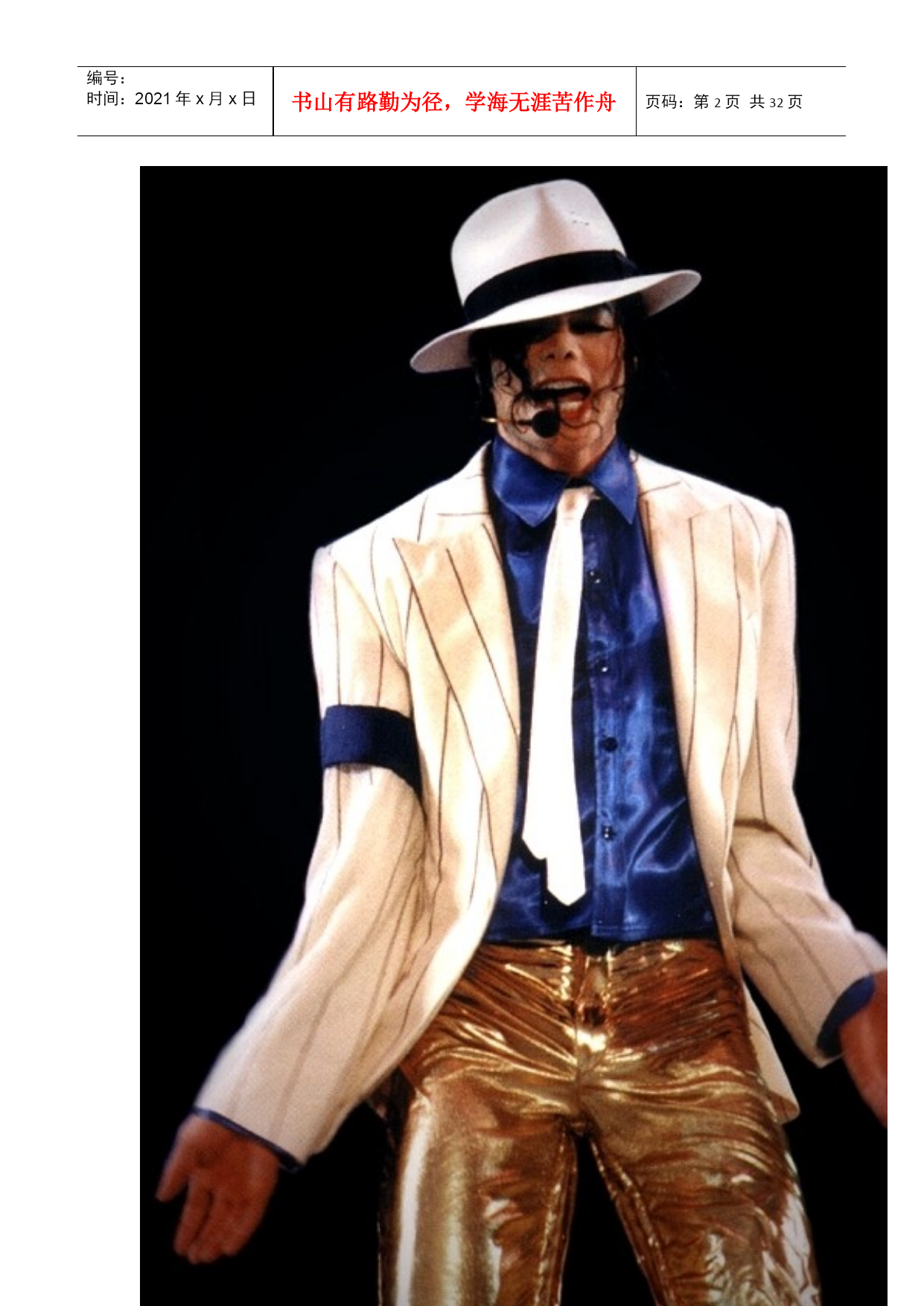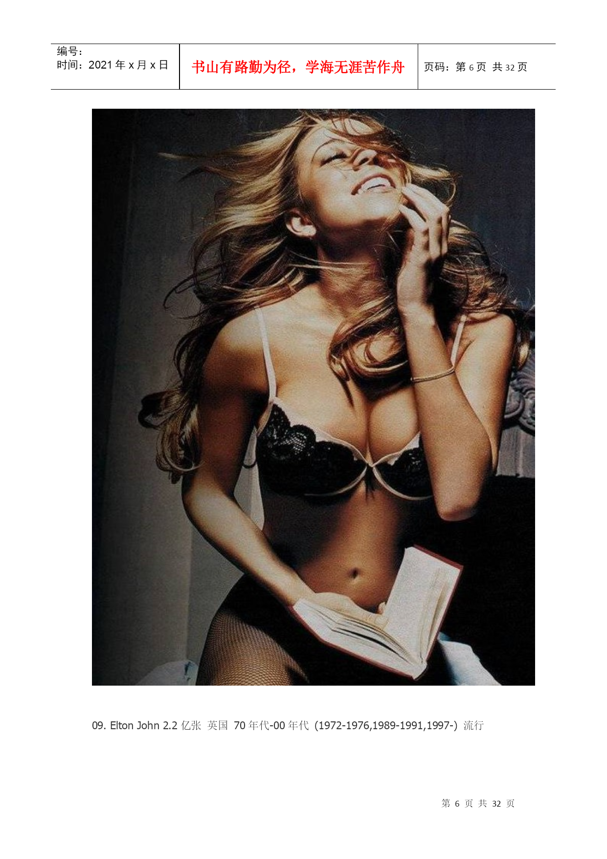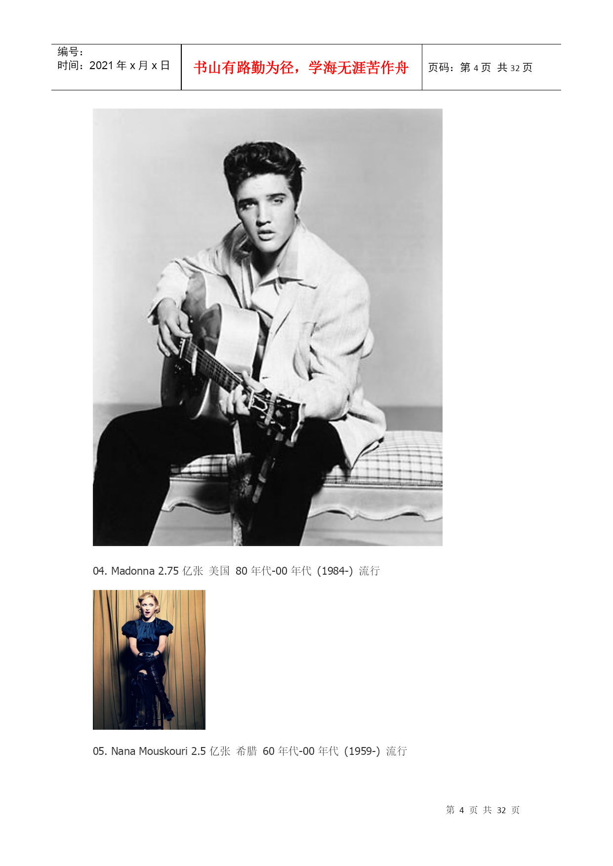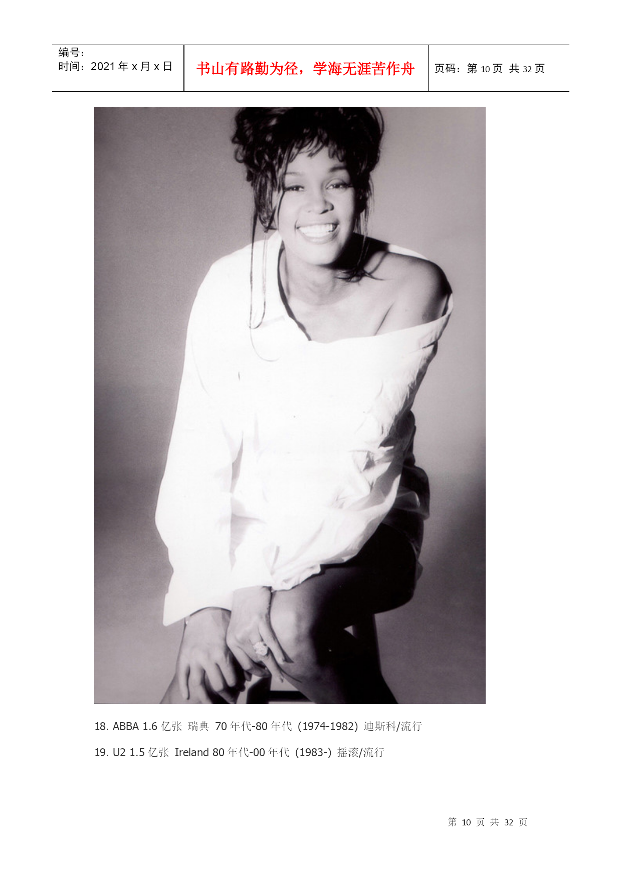 编号:时间:2021年x月x日书山有路勤为径,学海无涯苦作舟页码:第PAGE32页共NUMPAGES32页第PAGE\*MERGEFORMAT32页共NUMPAGES\*MERGEFORMAT32页世界歌手专辑总销量排行榜01.MichaelJackson7.5亿张美国70年代-00年代(1979-)流行/R&B02.TheBeatles4亿张英国60年代(1962-1970)摇滚/流行03.ElvisPresley3亿张美国50年代-70年代(1956-1977)乡村/摇滚04.Madonna2.75亿张美国80年代-00年代(1984-)流行05.NanaMouskouri2.5亿张希腊60年代-00年代(1959-)流行06.CliffRichard2.5亿张英国50年代-00年代(1959-1969,1977-1979,1986-1999)摇滚/流行07.TheRollingStones2.5亿张英国60年代-00年代(1964-1981)摇滚08.MariahCarey2.3亿张美国90年代-00年代(1990-)流行/R&B09.EltonJohn2.2亿张英国70年代-00年代(1972-1976,1989-1991,1997-)流行10.CelineDion2.2亿张加拿大80年代-00年代(1990-)流行十至一佰:11.PinkFloyd2.1亿张英国60年代-00年代(1970-1983,1994-1995)摇滚12.LedZeppelin2亿张英国60年代-70年代(1969-1979)摇滚/布鲁斯13.Metallica2亿张美国80's-00's(1991-1997)硬摇滚14.JulioIglesias2亿张西班牙70年代-00年代(1969-)拉丁/流行15.Queen1.8亿张英国70年代-00年代(1975-1995)摇滚16.AC/DC1.8亿张澳大利亚/英国70年代-00年代(1980-1992)硬摇滚17.WhitneyHouston10张专辑1.8亿张美国80年代-00年代(1985-2000)R&B/流行18.ABBA1.6亿张瑞典70年代-80年代(1974-1982)迪斯科/流行19.U21.5亿张Ireland80年代-00年代(1983-)摇滚/流行20.TheJacksons1.5亿张美国60年代-80年代(1969-1980)R&B21.GarthBrooks1.45亿张美国80年代-00年代(1989-2001)乡村22.JanetJackson11张专辑1.3亿张美国80年代-00年代(1986-)R&B/流行23.TheEagles1.2亿张美国70年代-00年代(1974-1979)乡村/摇滚24.张学友1.2亿张中国80年代-00年代(1984-)流行25.TheBeeGees1.1亿张英国/澳大利亚60年代-00年代(1975-1979)流行/迪斯科26.BonJovi1.1亿张美国80年代-00年代(1986-2000)摇滚/硬摇滚27.R.E.M.1.1亿张美国80年代-00年代(1991-)摇滚28.KennyRogers1.05亿张美国60年代-00年代乡村/流行/摇滚29.BlackSabbath1亿张美国70年代-00年代硬摇滚/金属30.BarbraStreisand1亿张美国60年代-00年代流行31.MireilleMathieu37张专辑1亿张法国60年代-00年代流行32.AllaPugacheva1亿张R美国sia70年代-00年代摇滚/流行33.Prince1亿张美国70年代-00年代摇滚/流行34.RickyNelson1亿张美国50年代-80年代流行/乡村/摇滚35.LucianoPavarotti1亿张意大利60年代-00年代歌剧36.BrendaLee1亿张美国50年代-60年代流行/乡村37.OmPrakash1亿张印度90年代-00年代38.Illayaraja1亿张印度70年代-00年代39.JohnnyMathis1亿张英国60年代-00年代摇滚/流行40.LionelRichie1亿张美国80年代-00年代流行/R&B41.DollyParton1亿张美国60年代-00年代乡村42.DonnaSummer1亿张美国70年代-90年代迪斯科43.Aerosmith1亿张美国70年代-00年代硬摇滚44.BillyJoel1亿张美国70年代-00年代流行/摇滚45.FleetwoodMac1亿张英国/美国60年代-00年代流行/摇滚46.JohnnyHallyda