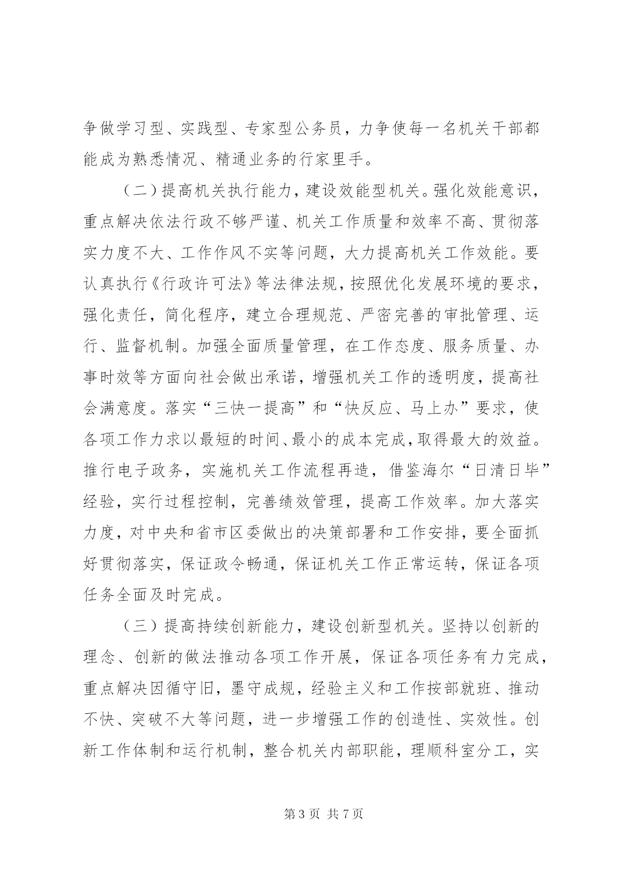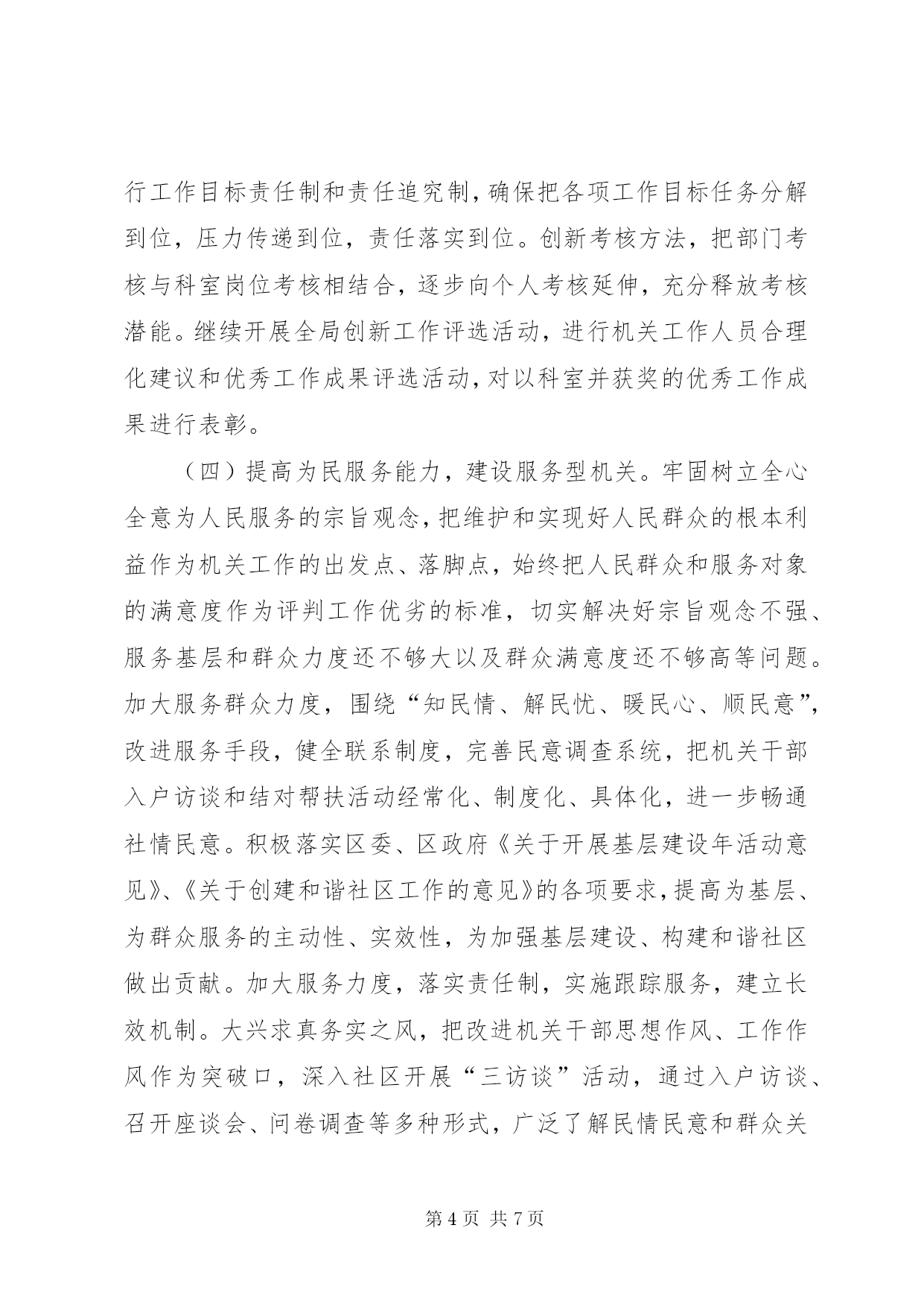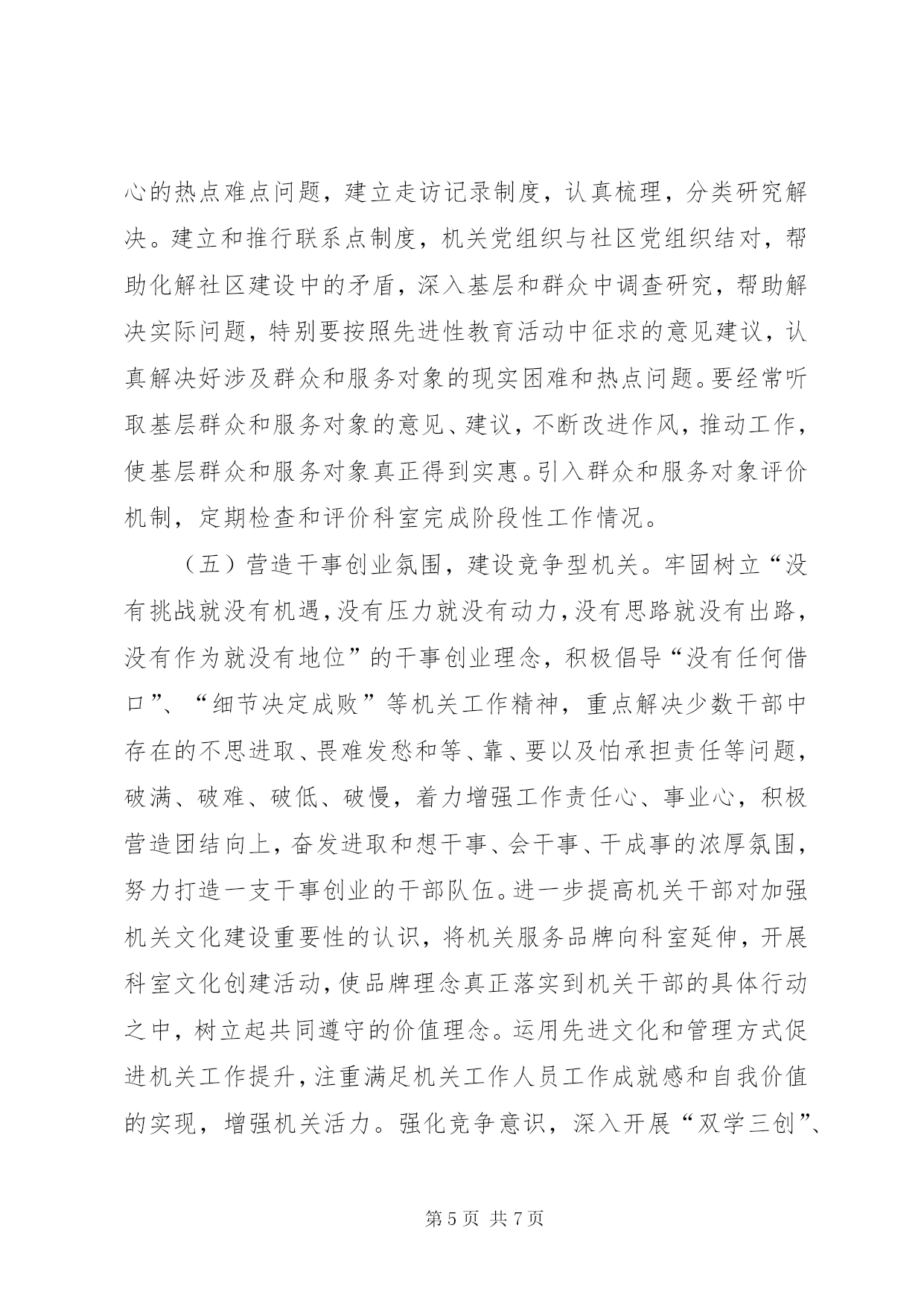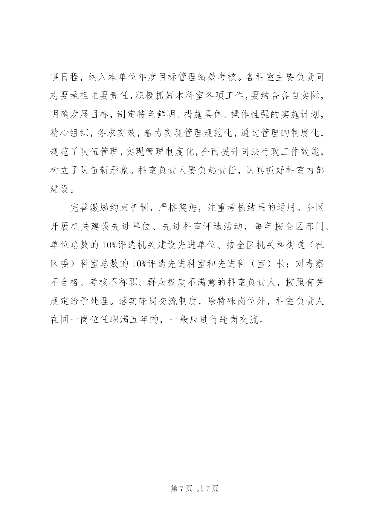 第PAGE\*Arabic\*MERGEFORMAT7页共NUMPAGES\*MERGEFORMAT7页司法局科室建设安排意见为深入贯彻落实党的十六大和十六届四中全会精神,切实加强全局机关执政能力建设,提高机关建设水平,加快建设繁荣、平安、洁净、温馨和诚信,努力实现把我区建设成为全国重点中心城市和世界知名特色城市的中心XX县区的目标,根据机关工委《关于加强全区机关建设的意见》和《2012年区机关处(科)室建设实施方案》有关精神,就加强全局机关建设提出以下意见:一、指导思想总体目标和主要任务指导思想。坚持以邓小平理论和“三个代表”重要思想为指导,深入贯彻落实党的十六大和十六届四中全会精神,以廉洁高效公正为核心,以服务中心、服务大局、服务基层、服务群众为根本,以提高机关干部素质为基础,以建立和落实制度为关键,以创新工作机制为重点,以基层和群众满意为最高标准,解放思想,干事创业,努力开创各项工作新局面。总体目标。以“创建高绩效机关,做人民满意公务员”为目标,立足现实,着眼长远,整体推进,创建团结和谐、行为规范、运转协调、依法行政、公正透明、廉洁高效机关。主要任务。围绕增强素质、解决问题、提高效能、改进作风,抓好学习型、效能型、创新型、服务型、竞争型和廉洁型机关建设,不断增强全局机关促进发展的能力、维护稳定的能力、持续创新的能力和科学、民主、依法行政的能力。二、工作措施(一)提高干部整体素质,建设学习型机关。提高机关干部队伍的整体素质,是加强机关建设的基础。局机关党组、各支部要把加强学习、提高学习能力、提升处(科)室人员综合素质作为基础工程来抓,重点培养学习能力和学习习惯。认真落实“四个一”(读一本好书、建立一本读书笔记、写一篇调研文章、解决一个工作中的突出问题)学习制度,经常组织在处(科)室之间、机关干部之间,开展机关工作基本常识、基本技能、基本方法、工作流程等内容的研讨交流,经常进行时事政策、廉政法规和区情、社情以及办文、办会、待人接物等综合知识、业务知识的培训,重点解决政治理论和专业学习不深入、理论联系实际不足、对新事物新经验吸收慢等问题,在运用理论指导实践上下功夫,着力提高局机关干部的思想政治素质、政策理论水平和专业知识技能,不断提高局机关围绕改革、发展、稳定解决现实问题的能力。要加强现代公共管理知识学习培训,进一步强化为民、服务、成本、效率、民主、法治、持续创新理念,努力提升服务本领。对局机关干部专题进行培训和岗位技能培训,提高培训工作的普及性、针对性和时效性。开展创建学习型机关、学习型科室活动,教育引导干部养成终身学习的理念,把工作学习化,学习工作化变为现实,自觉学习新知识、熟悉新领域、掌握新技能,争做学习型、实践型、专家型公务员,力争使每一名机关干部都能成为熟悉情况、精通业务的行家里手。(二)提高机关执行能力,建设效能型机关。强化效能意识,重点解决依法行政不够严谨、机关工作质量和效率不高、贯彻落实力度不大、工作作风不实等问题,大力提高机关工作效能。要认真执行《行政许可法》等法律法规,按照优化发展环境的要求,强化责任,简化程序,建立合理规范、严密完善的审批管理、运行、监督机制。加强全面质量管理,在工作态度、服务质量、办事时效等方面向社会做出承诺,增强机关工作的透明度,提高社会满意度。落实“三快一提高”和“快反应、马上办”要求,使各项工作力求以最短的时间、最小的成本完成,取得最大的效益。推行电子政务,实施机关工作流程再造,借鉴海尔“日清日毕”经验,实行过程控制,完善绩效管理,提高工作效率。加大落实力度,对中央和省市区委做出的决策部署和工作安排,要全面抓好贯彻落实,保证政令畅通,保证机关工作正常运转,保证各项任务全面及时完成。(三)提高持续创新能力,建设创新型机关。坚持以创新的理念、创新的做法推动各项工作开展,保证各项任务有力完成,重点解决因循守旧,墨守成规,经验主义和工作按部就班、推动不快、突破不大等问题,进一步增强工作的创造性、实效性。创新工作体制和运行机制,整合机关内部职能,理顺科室分工,实行工作目标责任制和责任追究制,确保把各项工作目标任务分解到位,压力传递到位,责任落实到位。创新考核方法,把部门考核与科室岗位考核相结合,逐步向个人考核延伸,充分释放考核潜能。继续开展全局创新工作评选活动,进行机关工作人员合理化建议和优秀工作成果评选活动,对以科室并获奖的优秀工作成果进行表彰。(四)提高为民服务能力,建设服务型机关。牢固树立全心全意为人民服务的宗旨观念,把维护和实现好人民群众的根本利益作为机关工作的出发点、落脚点,始终把人民群众和服务对象的满意度作为评判工作优劣的标准,切实解决好宗旨观念不强、服务基层和群众力度还不够大以及群众满意度还不够高等问题。加大服务群众力度,围绕“知民情、解民忧、暖民心、