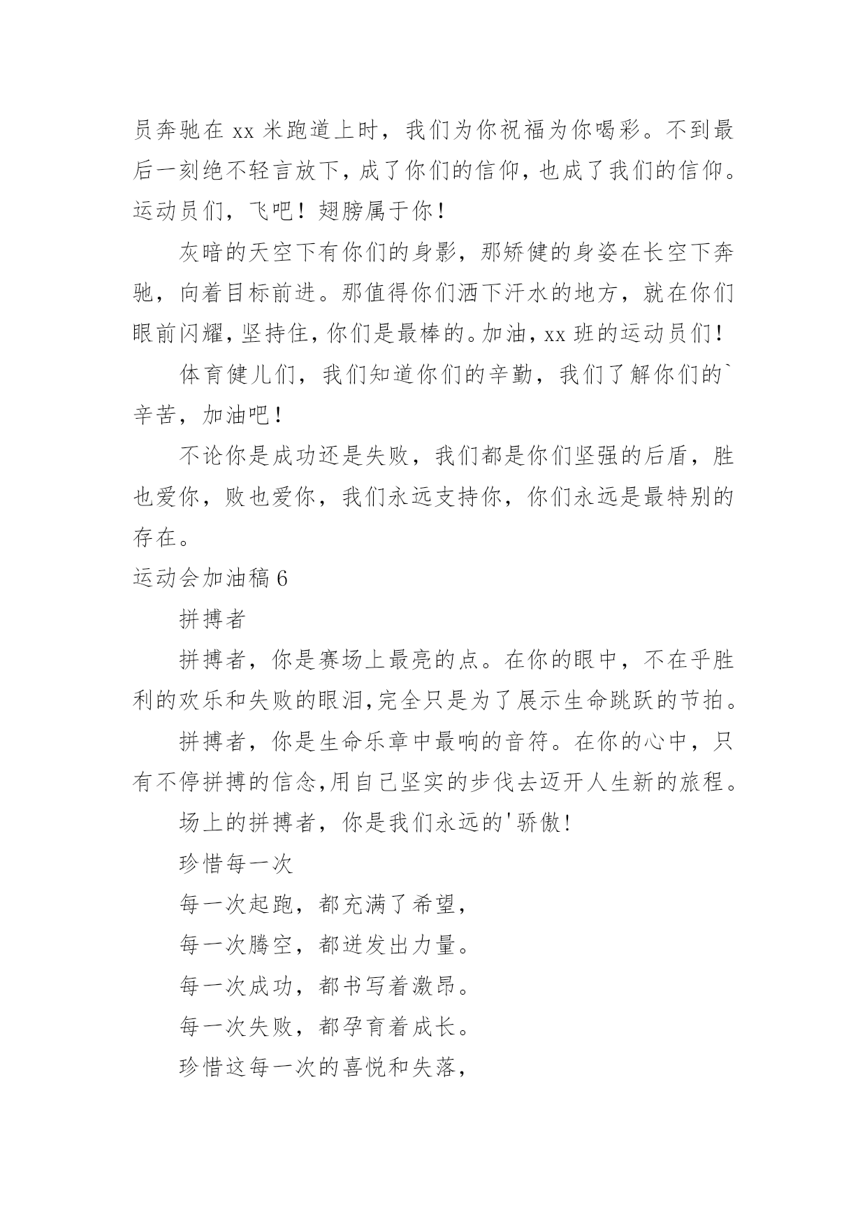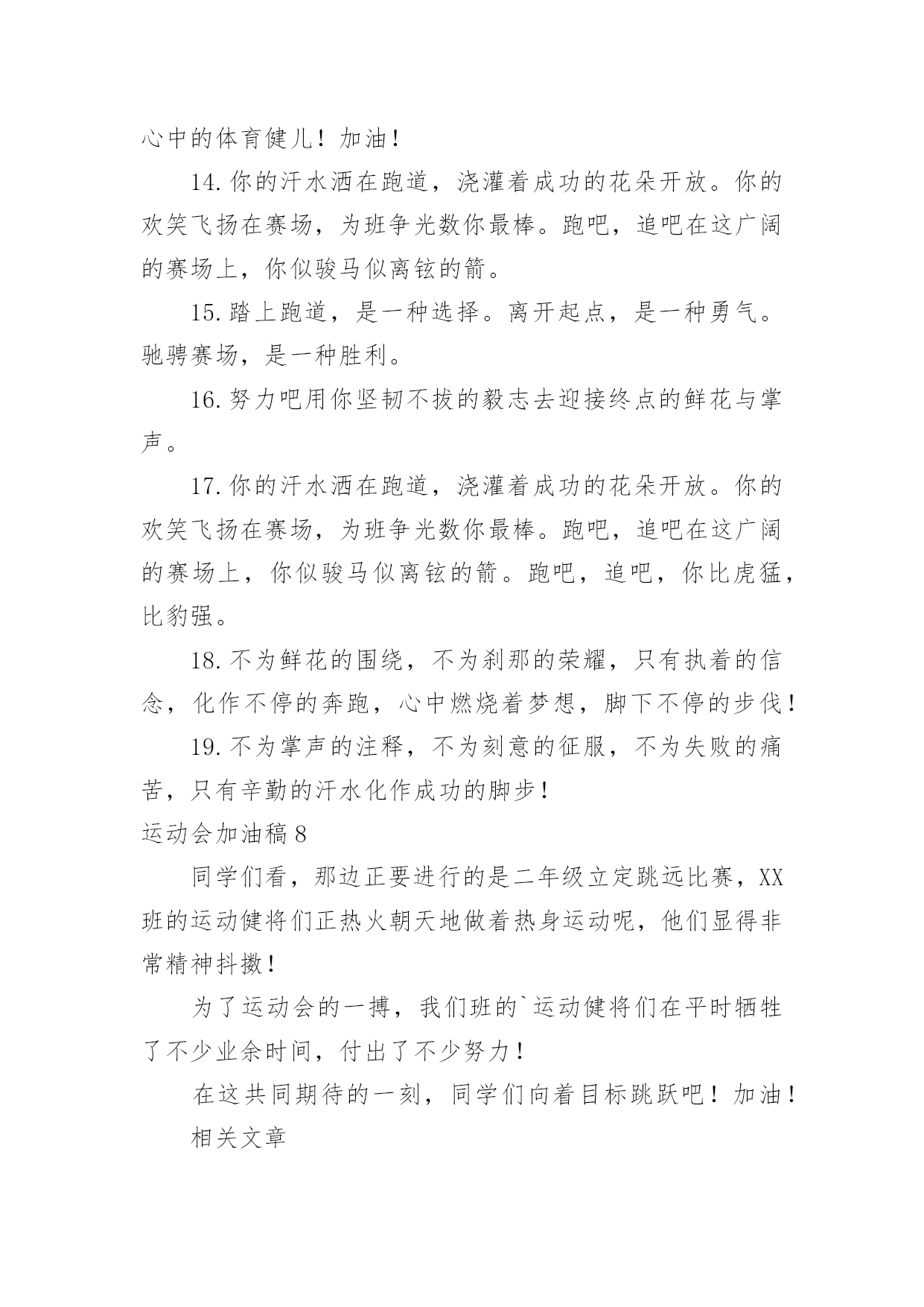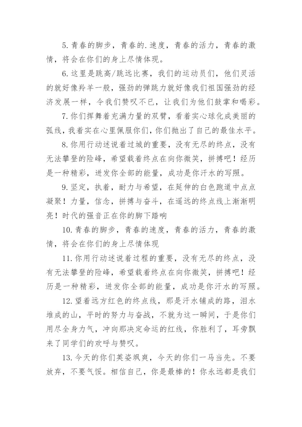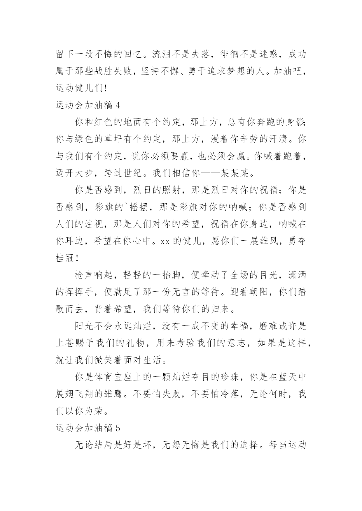 运动会加油稿运动会加油稿15篇【合集】在日新月异的现代社会中,用到加油稿的地方越来越多,加油稿是鼓励激励对方的文稿。怎么写加油稿才能避免踩雷呢?下面是小编整理的运动会加油稿,仅供参考,希望能够帮助到大家。运动会加油稿1努力、努力、再努力!加油、加油、再加油!你一定可以像苍龙一样,光耀九州,也可以像孤鹰一样翱翔世界,相信自己。超越自我,胜利永远属于努力的拼搏的你!他们朝气蓬勃,勇往直前;他们同甘共苦,团结一心,不一样的脚步,同一样的声音,是他们团结的心声在召唤。我们的运动健儿,摩拳擦掌,跃跃欲试,要在运动场上一显身手,互论短长。运动场上,显露竞争精神,展现我辈英雄本色;运动场下,友谊第一,比赛第二;增进感情,健身才可以健康。运动健儿最漂亮!青春是不老的誓言,飞扬是年轻的'梦想,金色的十月,让我们在这长长的跑道上青春飞扬,现出飒爽的风姿,亮出真我的风采,带上同学们的热情,载着同伴们的期望,背负老师的嘱托,在这活力四射的校园里,放飞你的青春活力和运动激情。运动会加油稿2大海如此的浩淼,鼓声多么美妙,运动员们,你们不再像平时那样渺小,我们默默的祈祷,以你们为骄傲,我们会永远为你们叫好。青春的脚步,青春的速度,青春的活力,青春的激情,将会在你们的身上尽情体现。迎接自我,挑战自我,战胜自我!我们坚信你们一定能行,加油吧,运动员!终点就在眼前!年轻的我们自信飞扬,青春的气息如同初升的朝阳,蓬勃的力量如同阳光的挥洒。此时此刻,跑道便是我们精彩的'舞台,声声加油便是我们的奖项!论何成功,谈何荣辱,心中的信念只有一个:拼搏!萧瑟的秋风,挡不住你们破竹的锐气。毅力与精神活跃在会场上,湿透的衣衫,满头的大汗,无限追求,奋力追赶,我们为你欢呼跳跃。运动会加油稿31、温暖的阳光洒在赛场上,男子乙组标枪的比赛即将开始。赛场上,一道道优美的弧线将轻盈地划过天空。健儿们用手中的标枪向距离的权限发起一轮又一轮的挑战。标枪在空中轻盈的姿态,是健儿们强健的力量和熟练的技巧的结合。谁能在这场激烈的竞争中获胜?让我们拭目以待,让我们为他们呐喊、助威吧!只有将力量与技巧合二为一的人,才能获得胜利的桂冠!2、有多少次挥汗如雨,伤痛曾添满记忆,只因为始终相信,去拼搏才能胜利。总在鼓舞自己,要成功就得努力。热血在赛场沸腾,巨人在赛场升起。相信自己,你将赢得胜利,创造奇迹;相信自己,梦想在你手中,这是你的天地。当一切过去,你们将是第一。相信自己,你们将超越极限,超越自己!相信自己,加油吧,健儿们,相信你自己。3、也许流星并不少见,但它燃烧的刹那,留给人间最美丽的.回忆!也许笑脸并不少见,但胜利的喜悦,总会留给世界精彩的一瞬!是的,那些曾经美妙的东西只有短短的一瞬间,但那却把最辉煌的一刻留给了人间。胜利,是每个人所追求的,胜利的喜悦,是胜利与重新开始的转折,胜利是新的开始!4、迎接你的,是800米跑道,勇敢的冲吧,勇士们,不要畏惧对手的强大,你的对手只有自己勇敢的冲吧。800米算不得什么,付出的汗水就要得到回报,胜利的泪水就要顺颊而下!也许你心里忐忑不安,我们的心里早已热血沸腾。不在乎泪水和汗水,因为你心里有一种坚定的信念。为了班级,我能行。5、《成功属于奋斗者》给予的越多.收获的越多.奋斗的越多收获的越多坚韧的毅力坚定的信念收获闪光的金牌成功属于谁人生的路,有坦途,也有坎坷;做过的岁月,有欢笑,也有苦涩,泪水告诉我一个跌倒的故事,汗水使我多了一份沉重,几多成熟。理想毕竟不同于现实,失败是生活的一部分,谁也无法选择,无法拒绝。人生要自己去拼搏,去奋斗,在风雨中百折不挠勇往前进,在集资的每个驿站上都留下一段不悔的回忆。流泪不是失落,徘徊不是迷惑,成功属于那些战胜失败,坚持不懈、勇于追求梦想的人。加油吧,运动健儿们!运动会加油稿4你和红色的地面有个约定,那上方,总有你奔跑的身影;你与绿色的草坪有个约定,那上方,浸着你辛劳的汗渍。你与我们有个约定,说你必须要赢,也必须会赢。你喊着跑着,迈开大步,跨过世纪。我们相信你——某某某。你是否感到,烈日的照射,那是烈日对你的祝福;你是否感到,彩旗的`摇摆,那是彩旗对你的呐喊;你是否感到人们的注视,那是人们对你的希望,祝福在你身边,呐喊在你耳边,希望在你心中。xx的健儿,愿你们一展雄风,勇夺桂冠!枪声响起,轻轻的一抬脚,便牵动了全场的目光,潇洒的挥挥手,便满足了那一份无言的等待。迎着朝阳,你们踏歌而去,背着希望,我们等待你们的归来。阳光不会永远灿烂,没有一成不变的幸福,磨难或许是上苍赐予我们的礼物,用来考验我们的意志,如果是这样,就让我们微笑着面对生活。你是体育宝座上的一颗灿烂夺目的珍珠,你是在蓝天中展翅飞翔的雏鹰。不要怕失败,不要怕冷落,无论何时,我们以你为荣。运动会加油稿5无论结局是好是坏,无怨无悔是我们的选择。每当运动员奔驰在xx米跑道上时
