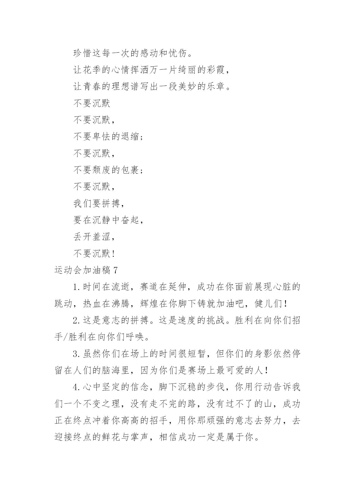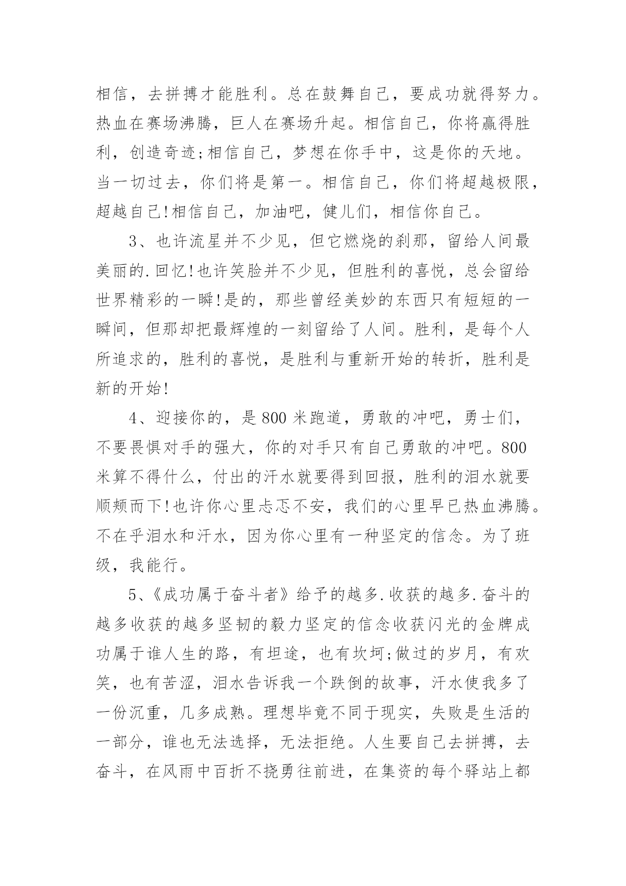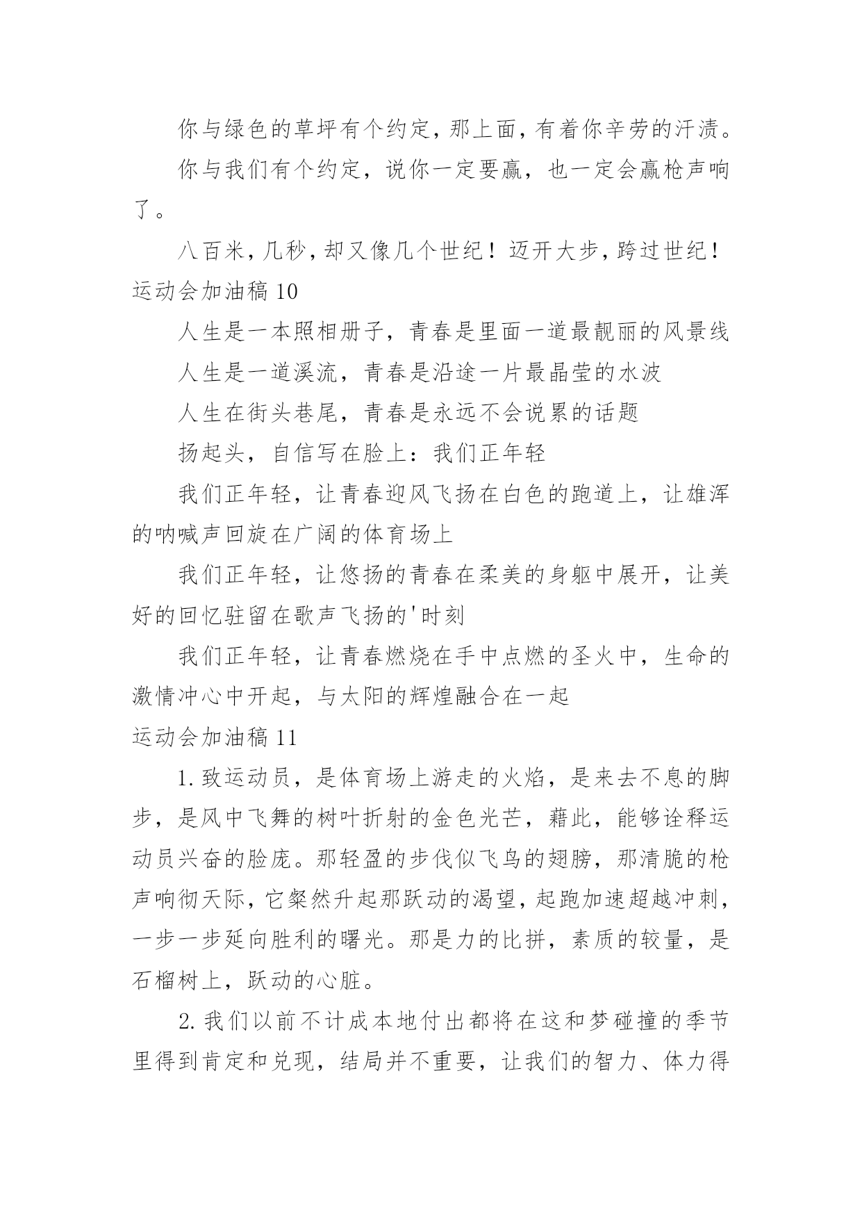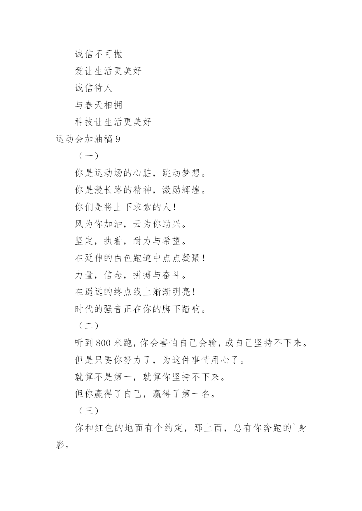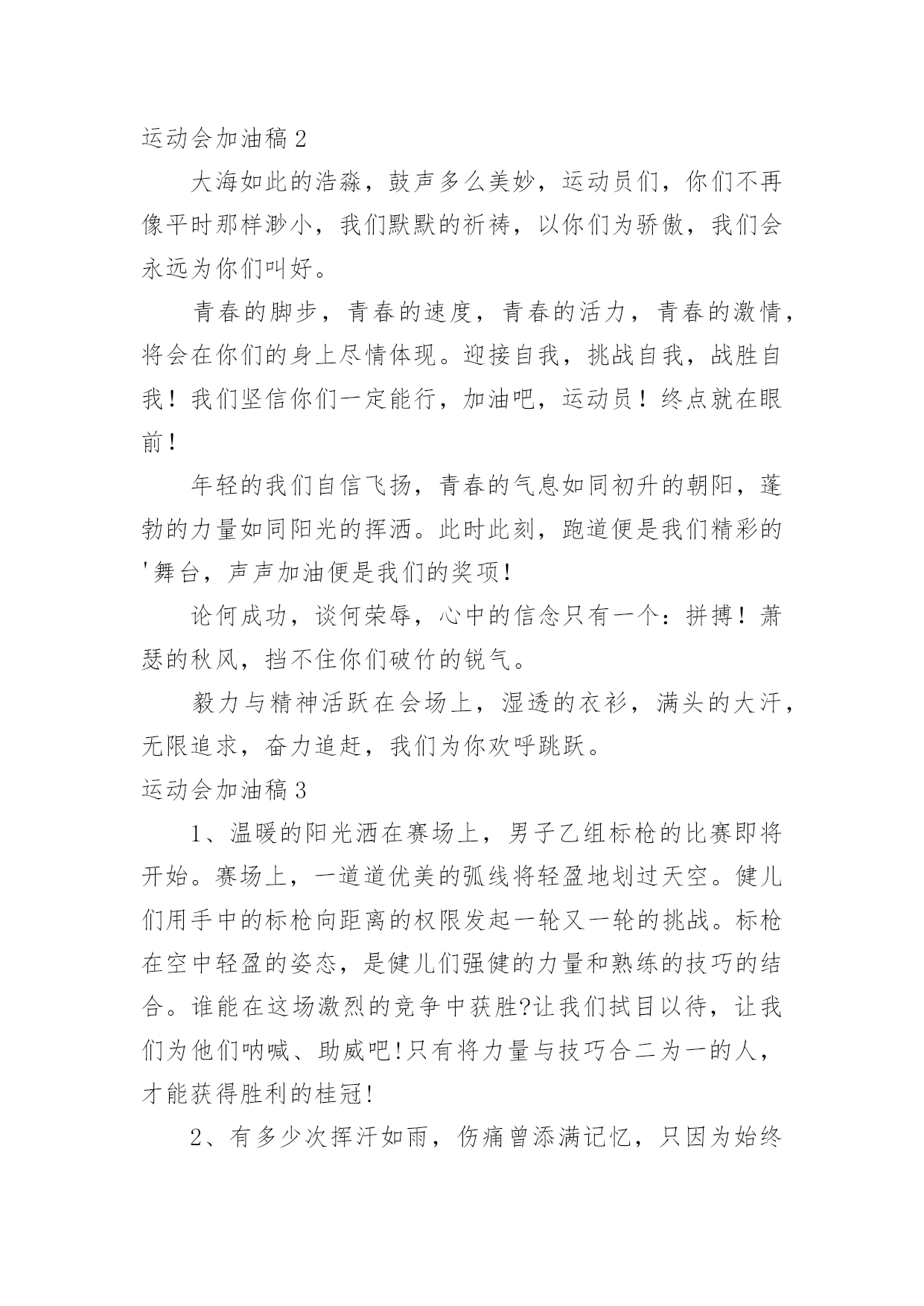 运动会加油稿运动会加油稿15篇【合集】在日新月异的现代社会中,用到加油稿的地方越来越多,加油稿是鼓励激励对方的文稿。怎么写加油稿才能避免踩雷呢?下面是小编整理的运动会加油稿,仅供参考,希望能够帮助到大家。运动会加油稿1努力、努力、再努力!加油、加油、再加油!你一定可以像苍龙一样,光耀九州,也可以像孤鹰一样翱翔世界,相信自己。超越自我,胜利永远属于努力的拼搏的你!他们朝气蓬勃,勇往直前;他们同甘共苦,团结一心,不一样的脚步,同一样的声音,是他们团结的心声在召唤。我们的运动健儿,摩拳擦掌,跃跃欲试,要在运动场上一显身手,互论短长。运动场上,显露竞争精神,展现我辈英雄本色;运动场下,友谊第一,比赛第二;增进感情,健身才可以健康。运动健儿最漂亮!青春是不老的誓言,飞扬是年轻的'梦想,金色的十月,让我们在这长长的跑道上青春飞扬,现出飒爽的风姿,亮出真我的风采,带上同学们的热情,载着同伴们的期望,背负老师的嘱托,在这活力四射的校园里,放飞你的青春活力和运动激情。运动会加油稿2大海如此的浩淼,鼓声多么美妙,运动员们,你们不再像平时那样渺小,我们默默的祈祷,以你们为骄傲,我们会永远为你们叫好。青春的脚步,青春的速度,青春的活力,青春的激情,将会在你们的身上尽情体现。迎接自我,挑战自我,战胜自我!我们坚信你们一定能行,加油吧,运动员!终点就在眼前!年轻的我们自信飞扬,青春的气息如同初升的朝阳,蓬勃的力量如同阳光的挥洒。此时此刻,跑道便是我们精彩的'舞台,声声加油便是我们的奖项!论何成功,谈何荣辱,心中的信念只有一个:拼搏!萧瑟的秋风,挡不住你们破竹的锐气。毅力与精神活跃在会场上,湿透的衣衫,满头的大汗,无限追求,奋力追赶,我们为你欢呼跳跃。运动会加油稿31、温暖的阳光洒在赛场上,男子乙组标枪的比赛即将开始。赛场上,一道道优美的弧线将轻盈地划过天空。健儿们用手中的标枪向距离的权限发起一轮又一轮的挑战。标枪在空中轻盈的姿态,是健儿们强健的力量和熟练的技巧的结合。谁能在这场激烈的竞争中获胜?让我们拭目以待,让我们为他们呐喊、助威吧!只有将力量与技巧合二为一的人,才能获得胜利的桂冠!2、有多少次挥汗如雨,伤痛曾添满记忆,只因为始终相信,去拼搏才能胜利。总在鼓舞自己,要成功就得努力。热血在赛场沸腾,巨人在赛场升起。相信自己,你将赢得胜利,创造奇迹;相信自己,梦想在你手中,这是你的天地。当一切过去,你们将是第一。相信自己,你们将超越极限,超越自己!相信自己,加油吧,健儿们,相信你自己。3、也许流星并不少见,但它燃烧的刹那,留给人间最美丽的.回忆!也许笑脸并不少见,但胜利的喜悦,总会留给世界精彩的一瞬!是的,那些曾经美妙的东西只有短短的一瞬间,但那却把最辉煌的一刻留给了人间。胜利,是每个人所追求的,胜利的喜悦,是胜利与重新开始的转折,胜利是新的开始!4、迎接你的,是800米跑道,勇敢的冲吧,勇士们,不要畏惧对手的强大,你的对手只有自己勇敢的冲吧。800米算不得什么,付出的汗水就要得到回报,胜利的泪水就要顺颊而下!也许你心里忐忑不安,我们的心里早已热血沸腾。不在乎泪水和汗水,因为你心里有一种坚定的信念。为了班级,我能行。5、《成功属于奋斗者》给予的越多.收获的越多.奋斗的越多收获的越多坚韧的毅力坚定的信念收获闪光的金牌成功属于谁人生的路,有坦途,也有坎坷;做过的岁月,有欢笑,也有苦涩,泪水告诉我一个跌倒的故事,汗水使我多了一份沉重,几多成熟。理想毕竟不同于现实,失败是生活的一部分,谁也无法选择,无法拒绝。人生要自己去拼搏,去奋斗,在风雨中百折不挠勇往前进,在集资的每个驿站上都留下一段不悔的回忆。流泪不是失落,徘徊不是迷惑,成功属于那些战胜失败,坚持不懈、勇于追求梦想的人。加油吧,运动健儿们!运动会加油稿4你和红色的地面有个约定,那上方,总有你奔跑的身影;你与绿色的草坪有个约定,那上方,浸着你辛劳的汗渍。你与我们有个约定,说你必须要赢,也必须会赢。你喊着跑着,迈开大步,跨过世纪。我们相信你——某某某。你是否感到,烈日的照射,那是烈日对你的祝福;你是否感到,彩旗的`摇摆,那是彩旗对你的呐喊;你是否感到人们的注视,那是人们对你的希望,祝福在你身边,呐喊在你耳边,希望在你心中。xx的健儿,愿你们一展雄风,勇夺桂冠!枪声响起,轻轻的一抬脚,便牵动了全场的目光,潇洒的挥挥手,便满足了那一份无言的等待。迎着朝阳,你们踏歌而去,背着希望,我们等待你们的归来。阳光不会永远灿烂,没有一成不变的幸福,磨难或许是上苍赐予我们的礼物,用来考验我们的意志,如果是这样,就让我们微笑着面对生活。你是体育宝座上的一颗灿烂夺目的珍珠,你是在蓝天中展翅飞翔的雏鹰。不要怕失败,不要怕冷落,无论何时,我们以你为荣。运动会加油稿5无论结局是好是坏,无怨无悔是我们的选择。每当运动员奔驰在xx米跑道上时