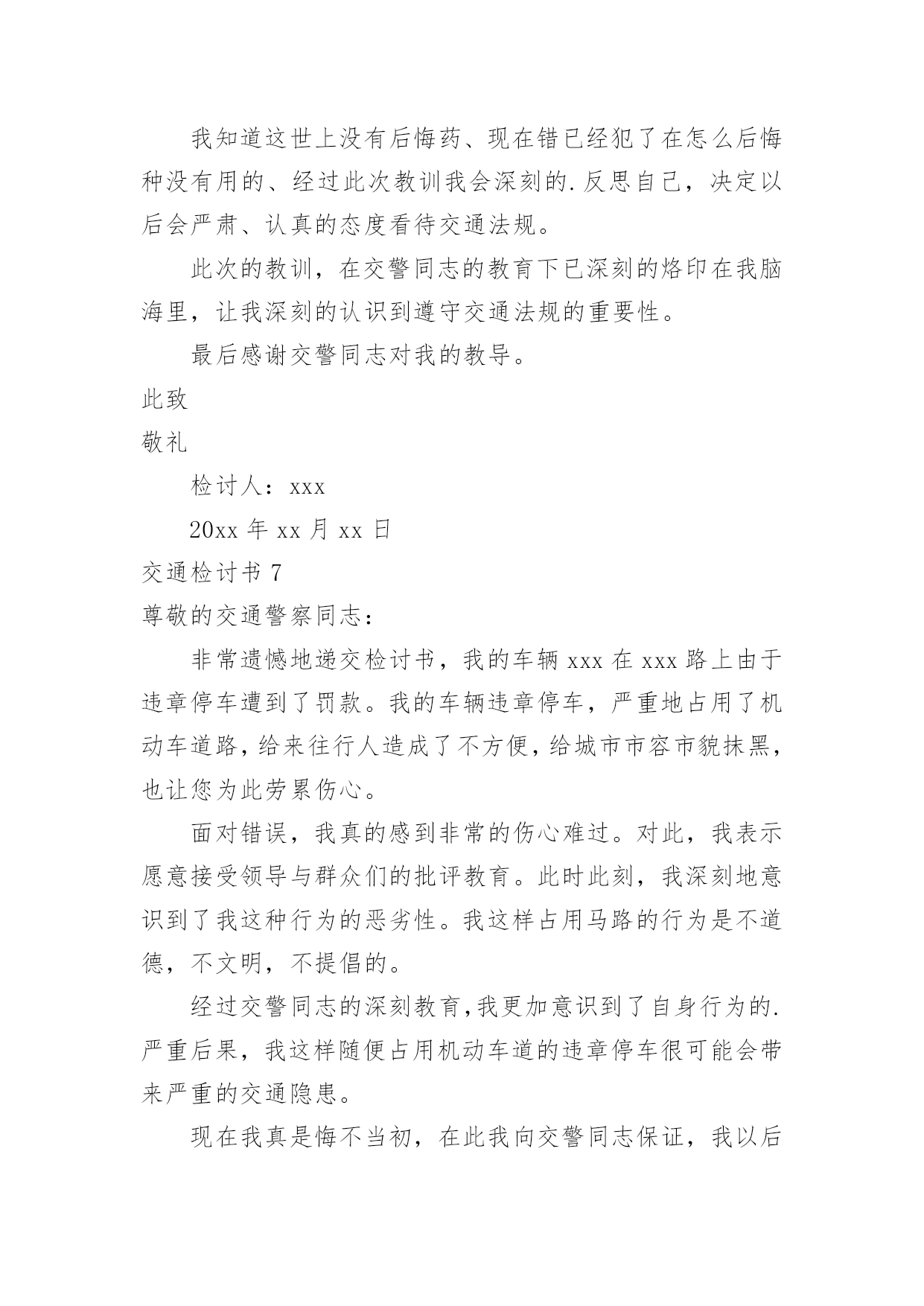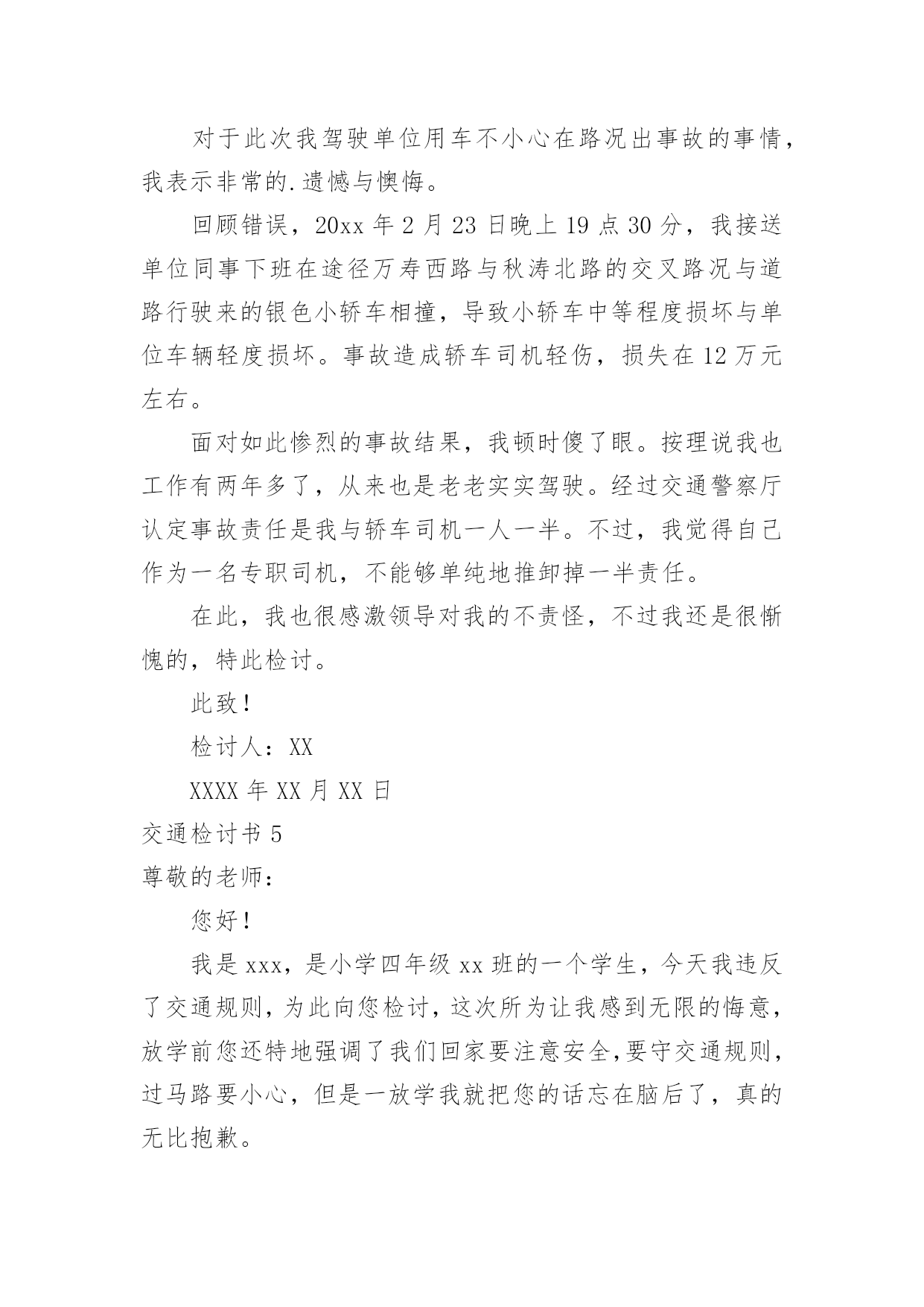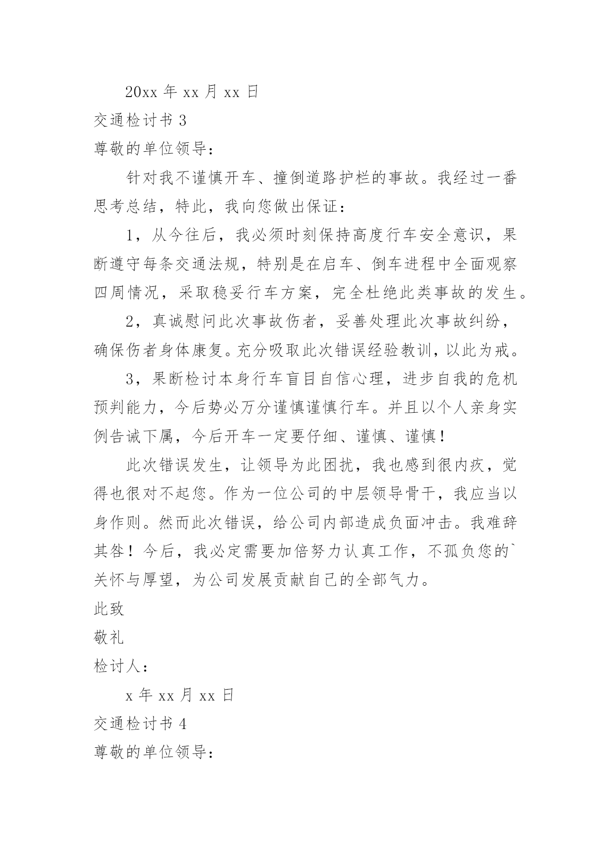交通检讨书交通检讨书在不小心犯错后,为了避免再犯,就需要写一份自我检讨书好好进行自我检讨,在写检讨书时要注意用语,切忌自由散漫。大家知道正规的检讨书怎么写吗?下面是小编为大家整理的交通检讨书,仅供参考,希望能够帮助到大家。交通检讨书1尊敬的交警同志:由于本人于xx年xx月xx日在颍州路至林阴路驱车逆行违章行驶,违反了交通规则,给正常行驶的'车辆及行人造成了不便,构成了严重的交通安全隐患。如若发生交通事故,后果将不堪设想,重则危及他人及自己的生命安全,轻则也会造成一定的经济损失。我怎么能无视交通法规,在交警同志众目睽睽之下违反交通法规呢?扪心自问我对道路交通安全法非常小心谨慎,每次行车都是非常小心,从不违章闯红灯,并深知每年交通事故伤对家庭对社会的违害,但轮到自己我怎么就对交通法规没引起充分的重视呢。事已至此请交警同志给我一次反醒改过的机会,保证今后不再犯类似错误,并严格遵守交通规则,如有再犯,敬请交警同志处罚。不甚感激,谢谢。此致敬礼!检讨人:xxxxxx年xx月xx日交通检讨书2尊敬的单位领导:随着雨季来临,为了确保乡镇道路稳固畅通,我们建筑施工队伍在一个月之前就前往了乡镇__区段开展道理加固工作,期间由于我小组成员没有按照施工违反操作,急于赶进度,导致了路基出现严重塌陷,重型机车掐在泥土,部分上体滑坡导致两名工人受重伤的严重后果。事故发生以后,我们尽管采取了第一时间的抢救,两名工人经过紧急治疗脱离了生命危险,可是最终还是受了重伤,给工人家庭造成了严重伤害。对于这次事故的发生,我作为施工小组负责人,自身负有不可推卸的'责任。针对此次情况,我违反了单位职工日常操作行为规范,没有按照标准化施工作业程序,片面地强调了高效施工水准,忽视了道路路基的承受能力。同时,我在潜意识里也没有对工人施工安全环境有足够充分的认知,忽视了工人的生命安全保障工作,使得事故发生导致了工人的人身安全遭到了伤害。无论如何,我定要深刻检讨、自纠错误,尽一切努力弥补错误,并且愿意承担这次事故的大部分责任。检讨人:xxx20xx年xx月xx日交通检讨书3尊敬的单位领导:针对我不谨慎开车、撞倒道路护栏的事故。我经过一番思考总结,特此,我向您做出保证:1,从今往后,我必须时刻保持高度行车安全意识,果断遵守每条交通法规,特别是在启车、倒车进程中全面观察四周情况,采取稳妥行车方案,完全杜绝此类事故的发生。2,真诚慰问此次事故伤者,妥善处理此次事故纠纷,确保伤者身体康复。充分吸取此次错误经验教训,以此为戒。3,果断检讨本身行车盲目自信心理,进步自我的危机预判能力,今后势必万分谨慎谨慎行车。并且以个人亲身实例告诫下属,今后开车一定要仔细、谨慎、谨慎!此次错误发生,让领导为此困扰,我也感到很内疚,觉得也很对不起您。作为一位公司的中层领导骨干,我应当以身作则。然而此次错误,给公司内部造成负面冲击。我难辞其咎!今后,我必定需要加倍努力认真工作,不孤负您的`关怀与厚望,为公司发展贡献自己的全部气力。此致敬礼检讨人:x年xx月xx日交通检讨书4尊敬的单位领导:对于此次我驾驶单位用车不小心在路况出事故的事情,我表示非常的.遗憾与懊悔。回顾错误,20xx年2月23日晚上19点30分,我接送单位同事下班在途径万寿西路与秋涛北路的交叉路况与道路行驶来的银色小轿车相撞,导致小轿车中等程度损坏与单位车辆轻度损坏。事故造成轿车司机轻伤,损失在12万元左右。面对如此惨烈的事故结果,我顿时傻了眼。按理说我也工作有两年多了,从来也是老老实实驾驶。经过交通警察厅认定事故责任是我与轿车司机一人一半。不过,我觉得自己作为一名专职司机,不能够单纯地推卸掉一半责任。在此,我也很感激领导对我的不责怪,不过我还是很惭愧的,特此检讨。此致!检讨人:XXXXXX年XX月XX日交通检讨书5尊敬的老师:您好!我是xxx,是小学四年级xx班的一个学生,今天我违反了交通规则,为此向您检讨,这次所为让我感到无限的悔意,放学前您还特地强调了我们回家要注意安全,要守交通规则,过马路要小心,但是一放学我就把您的话忘在脑后了,真的无比抱歉。今天放学回家路上,因为赶着回家玩游戏,所以就特别着急,过斑马线的时候看到没有车辆就直接过去了,没有看红绿灯,而且没发现还是绿灯,也没有看两边的情况,就直往前冲,冲到一半的时候,就有车开过来,幸好值班的交警叔叔及时的拉住了我,不然后果简直不敢想象。这次我险些酿成大错了,过马路时您跟我们说过无数遍一定要遵守交通的规则,绝对不可以随便的过马路。可是我这次却把您的话全部都忘了,直想着快点回家玩游戏,因为朋友都在等我了,所以就没有去顾忌自己的安全,就横穿过马路,也不去注意庄边的车辆情况。这是作为一个小学生的最大失职,没有做到听从老师的话,把老师您的`关心都扔掉了,是不尊重您的教育。这次的事件给了我一个很大的教