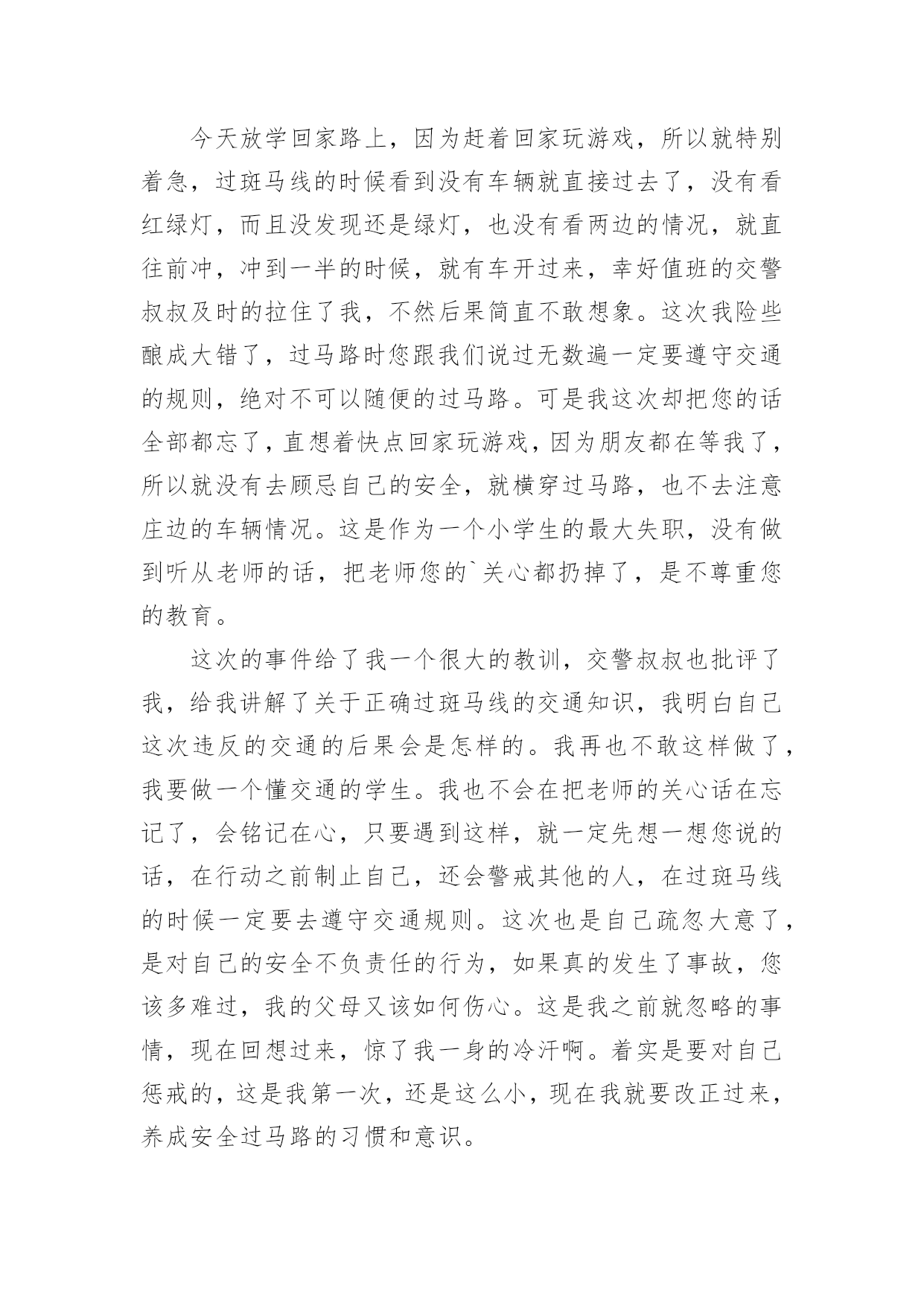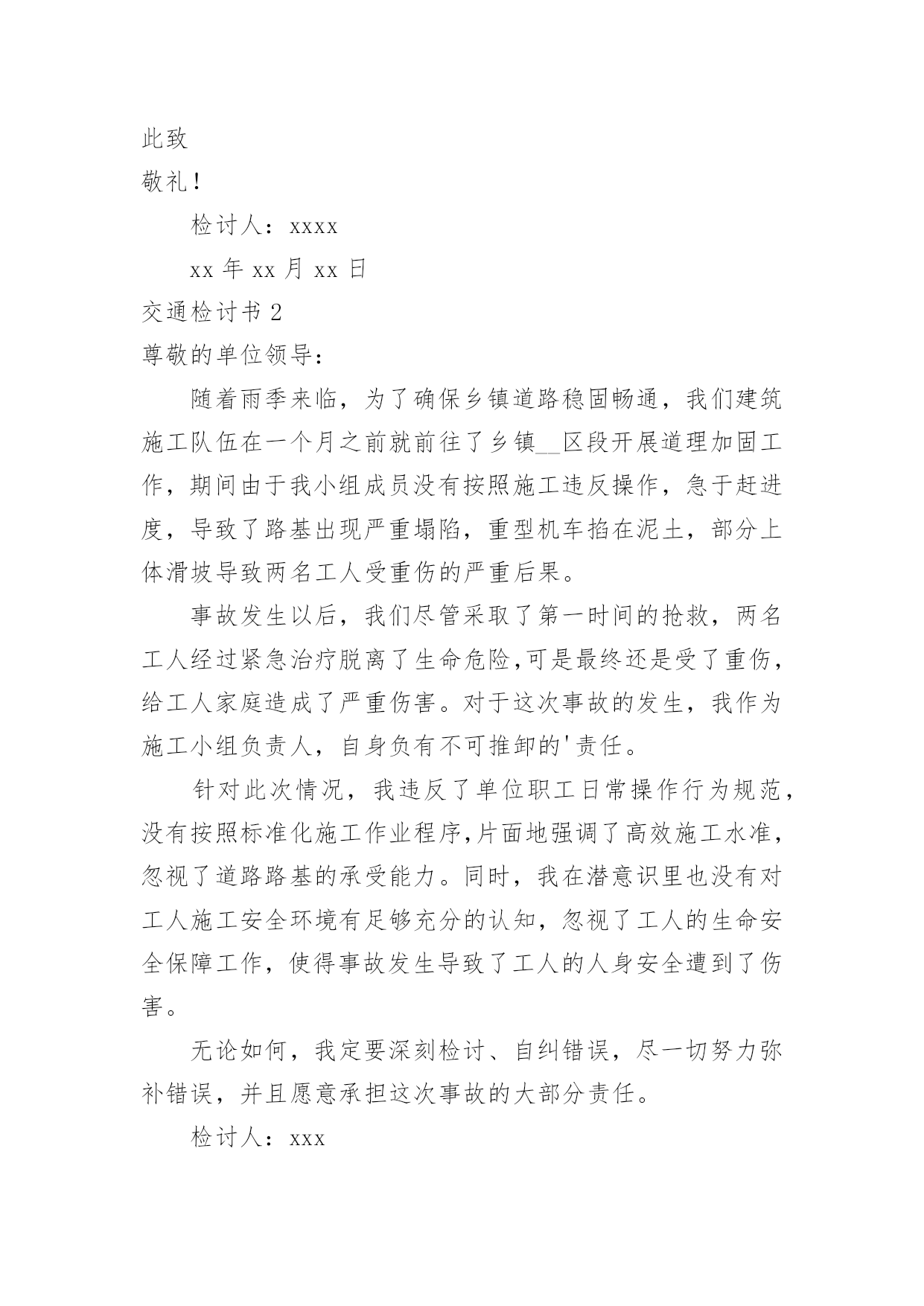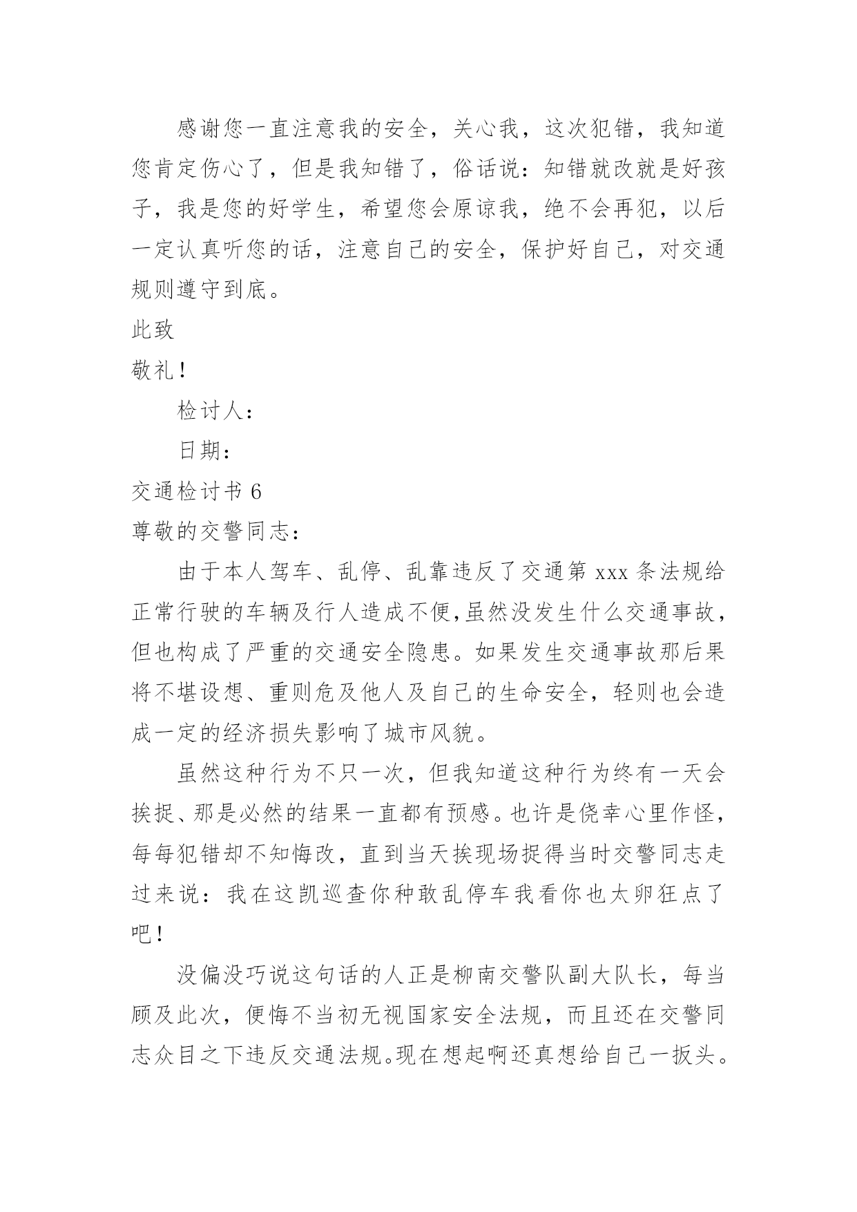 交通检讨书交通检讨书在不小心犯错后,为了避免再犯,就需要写一份自我检讨书好好进行自我检讨,在写检讨书时要注意用语,切忌自由散漫。大家知道正规的检讨书怎么写吗?下面是小编为大家整理的交通检讨书,仅供参考,希望能够帮助到大家。交通检讨书1尊敬的交警同志:由于本人于xx年xx月xx日在颍州路至林阴路驱车逆行违章行驶,违反了交通规则,给正常行驶的'车辆及行人造成了不便,构成了严重的交通安全隐患。如若发生交通事故,后果将不堪设想,重则危及他人及自己的生命安全,轻则也会造成一定的经济损失。我怎么能无视交通法规,在交警同志众目睽睽之下违反交通法规呢?扪心自问我对道路交通安全法非常小心谨慎,每次行车都是非常小心,从不违章闯红灯,并深知每年交通事故伤对家庭对社会的违害,但轮到自己我怎么就对交通法规没引起充分的重视呢。事已至此请交警同志给我一次反醒改过的机会,保证今后不再犯类似错误,并严格遵守交通规则,如有再犯,敬请交警同志处罚。不甚感激,谢谢。此致敬礼!检讨人:xxxxxx年xx月xx日交通检讨书2尊敬的单位领导:随着雨季来临,为了确保乡镇道路稳固畅通,我们建筑施工队伍在一个月之前就前往了乡镇__区段开展道理加固工作,期间由于我小组成员没有按照施工违反操作,急于赶进度,导致了路基出现严重塌陷,重型机车掐在泥土,部分上体滑坡导致两名工人受重伤的严重后果。事故发生以后,我们尽管采取了第一时间的抢救,两名工人经过紧急治疗脱离了生命危险,可是最终还是受了重伤,给工人家庭造成了严重伤害。对于这次事故的发生,我作为施工小组负责人,自身负有不可推卸的'责任。针对此次情况,我违反了单位职工日常操作行为规范,没有按照标准化施工作业程序,片面地强调了高效施工水准,忽视了道路路基的承受能力。同时,我在潜意识里也没有对工人施工安全环境有足够充分的认知,忽视了工人的生命安全保障工作,使得事故发生导致了工人的人身安全遭到了伤害。无论如何,我定要深刻检讨、自纠错误,尽一切努力弥补错误,并且愿意承担这次事故的大部分责任。检讨人:xxx20xx年xx月xx日交通检讨书3尊敬的单位领导:针对我不谨慎开车、撞倒道路护栏的事故。我经过一番思考总结,特此,我向您做出保证:1,从今往后,我必须时刻保持高度行车安全意识,果断遵守每条交通法规,特别是在启车、倒车进程中全面观察四周情况,采取稳妥行车方案,完全杜绝此类事故的发生。2,真诚慰问此次事故伤者,妥善处理此次事故纠纷,确保伤者身体康复。充分吸取此次错误经验教训,以此为戒。3,果断检讨本身行车盲目自信心理,进步自我的危机预判能力,今后势必万分谨慎谨慎行车。并且以个人亲身实例告诫下属,今后开车一定要仔细、谨慎、谨慎!此次错误发生,让领导为此困扰,我也感到很内疚,觉得也很对不起您。作为一位公司的中层领导骨干,我应当以身作则。然而此次错误,给公司内部造成负面冲击。我难辞其咎!今后,我必定需要加倍努力认真工作,不孤负您的`关怀与厚望,为公司发展贡献自己的全部气力。此致敬礼检讨人:x年xx月xx日交通检讨书4尊敬的单位领导:对于此次我驾驶单位用车不小心在路况出事故的事情,我表示非常的.遗憾与懊悔。回顾错误,20xx年2月23日晚上19点30分,我接送单位同事下班在途径万寿西路与秋涛北路的交叉路况与道路行驶来的银色小轿车相撞,导致小轿车中等程度损坏与单位车辆轻度损坏。事故造成轿车司机轻伤,损失在12万元左右。面对如此惨烈的事故结果,我顿时傻了眼。按理说我也工作有两年多了,从来也是老老实实驾驶。经过交通警察厅认定事故责任是我与轿车司机一人一半。不过,我觉得自己作为一名专职司机,不能够单纯地推卸掉一半责任。在此,我也很感激领导对我的不责怪,不过我还是很惭愧的,特此检讨。此致!检讨人:XXXXXX年XX月XX日交通检讨书5尊敬的老师:您好!我是xxx,是小学四年级xx班的一个学生,今天我违反了交通规则,为此向您检讨,这次所为让我感到无限的悔意,放学前您还特地强调了我们回家要注意安全,要守交通规则,过马路要小心,但是一放学我就把您的话忘在脑后了,真的无比抱歉。今天放学回家路上,因为赶着回家玩游戏,所以就特别着急,过斑马线的时候看到没有车辆就直接过去了,没有看红绿灯,而且没发现还是绿灯,也没有看两边的情况,就直往前冲,冲到一半的时候,就有车开过来,幸好值班的交警叔叔及时的拉住了我,不然后果简直不敢想象。这次我险些酿成大错了,过马路时您跟我们说过无数遍一定要遵守交通的规则,绝对不可以随便的过马路。可是我这次却把您的话全部都忘了,直想着快点回家玩游戏,因为朋友都在等我了,所以就没有去顾忌自己的安全,就横穿过马路,也不去注意庄边的车辆情况。这是作为一个小学生的最大失职,没有做到听从老师的话,把老师您的`关心都扔掉了,是不尊重您的教育。这次的事件给了我一个很大的教