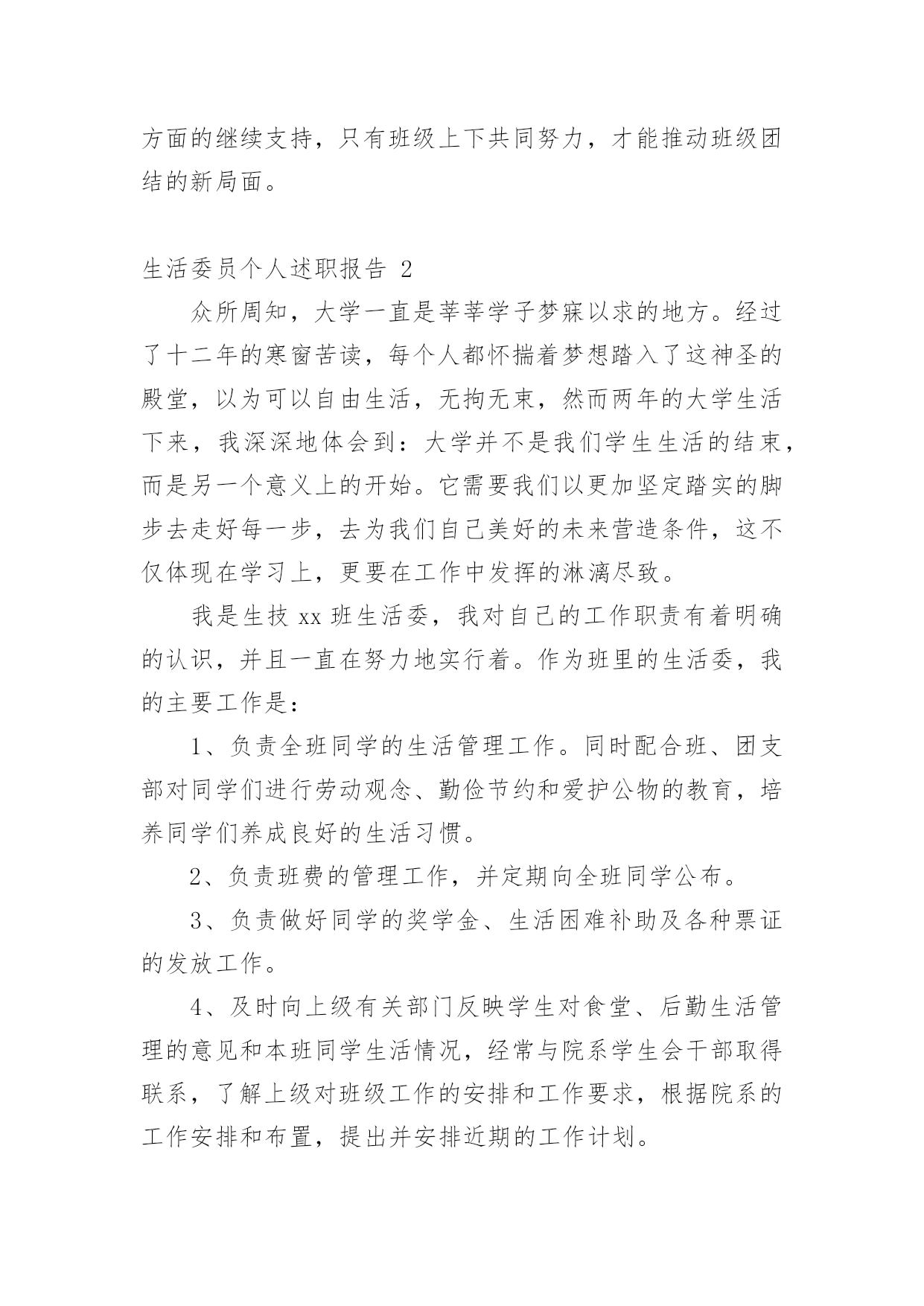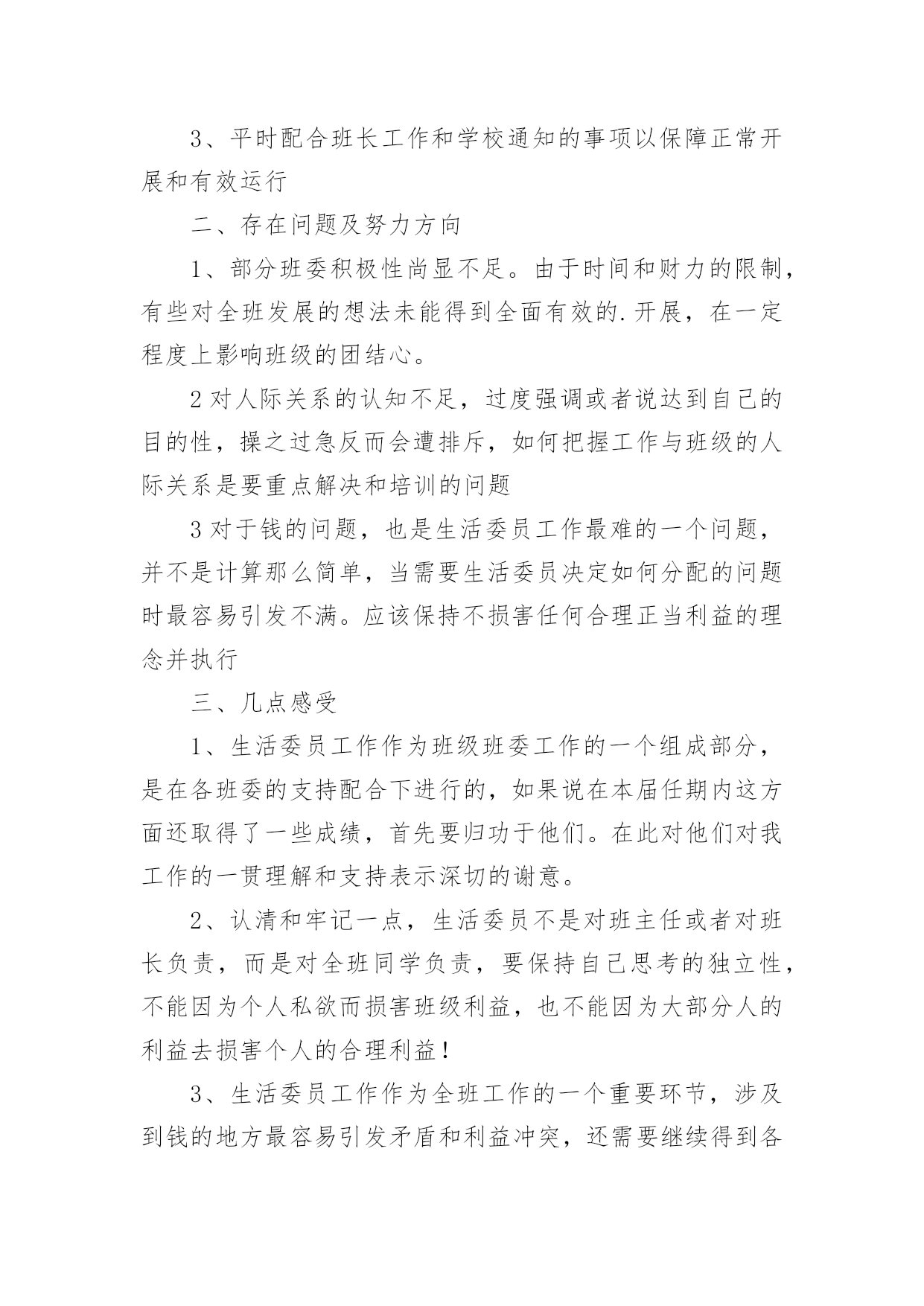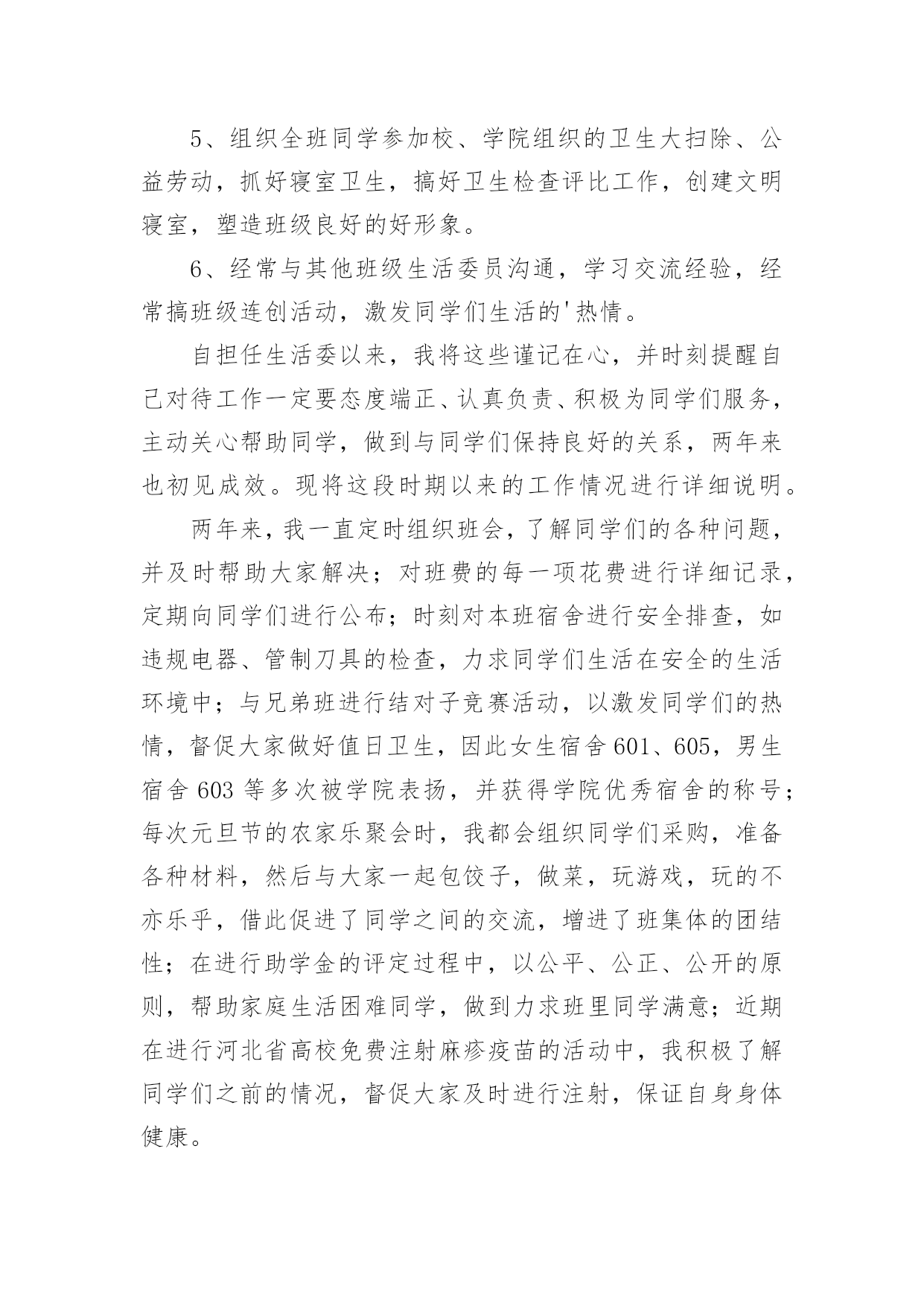 生活委员个人述职报告在生活中,报告对我们来说并不陌生,报告中提到的所有信息应该是准确无误的。一听到写报告就拖延症懒癌齐复发?以下是小编整理的生活委员个人述职报告,欢迎阅读与收藏。生活委员个人述职报告1自xx任职已2年。任期内,在班主任的指导和领导下,依靠全体班委的共同努力,在自己担任生活委员的职责等方面开展了一些工作。现将有关情况简要汇报如下:一、主要工作完成情况(一)学习与自律1认真学习新知识,努力提高自己的学识水平,同时,关注时事政治,能紧跟形势,做到用学到的知识来分析现实现象,让学到的知识不脱离实际。2能按照校规要求自己,遵守纪律,起到带头作用,自觉接受群众监督,任期内没有违规违纪行为。(二)班委与生活委员工作1、本职,即生活委员工作方面,做好管理班费和督促寝室卫生,同时定期约谈生活条件困难学生,安慰并将其困难反映给学校。2、同时在班主任指导及班委和请教学长学姐下,制定出游计划并组织实施,3次出游没有一次出现安全问题。3、平时配合班长工作和学校通知的事项以保障正常开展和有效运行二、存在问题及努力方向1、部分班委积极性尚显不足。由于时间和财力的限制,有些对全班发展的想法未能得到全面有效的.开展,在一定程度上影响班级的团结心。2对人际关系的认知不足,过度强调或者说达到自己的目的性,操之过急反而会遭排斥,如何把握工作与班级的人际关系是要重点解决和培训的问题3对于钱的问题,也是生活委员工作最难的一个问题,并不是计算那么简单,当需要生活委员决定如何分配的问题时最容易引发不满。应该保持不损害任何合理正当利益的理念并执行三、几点感受1、生活委员工作作为班级班委工作的一个组成部分,是在各班委的支持配合下进行的,如果说在本届任期内这方面还取得了一些成绩,首先要归功于他们。在此对他们对我工作的一贯理解和支持表示深切的谢意。2、认清和牢记一点,生活委员不是对班主任或者对班长负责,而是对全班同学负责,要保持自己思考的独立性,不能因为个人私欲而损害班级利益,也不能因为大部分人的利益去损害个人的合理利益!3、生活委员工作作为全班工作的一个重要环节,涉及到钱的地方最容易引发矛盾和利益冲突,还需要继续得到各方面的继续支持,只有班级上下共同努力,才能推动班级团结的新局面。生活委员个人述职报告2众所周知,大学一直是莘莘学子梦寐以求的地方。经过了十二年的寒窗苦读,每个人都怀揣着梦想踏入了这神圣的殿堂,以为可以自由生活,无拘无束,然而两年的大学生活下来,我深深地体会到:大学并不是我们学生生活的结束,而是另一个意义上的开始。它需要我们以更加坚定踏实的脚步去走好每一步,去为我们自己美好的未来营造条件,这不仅体现在学习上,更要在工作中发挥的淋漓尽致。我是生技xx班生活委,我对自己的工作职责有着明确的认识,并且一直在努力地实行着。作为班里的生活委,我的主要工作是:1、负责全班同学的生活管理工作。同时配合班、团支部对同学们进行劳动观念、勤俭节约和爱护公物的教育,培养同学们养成良好的生活习惯。2、负责班费的管理工作,并定期向全班同学公布。3、负责做好同学的奖学金、生活困难补助及各种票证的发放工作。4、及时向上级有关部门反映学生对食堂、后勤生活管理的意见和本班同学生活情况,经常与院系学生会干部取得联系,了解上级对班级工作的安排和工作要求,根据院系的工作安排和布置,提出并安排近期的工作计划。5、组织全班同学参加校、学院组织的卫生大扫除、公益劳动,抓好寝室卫生,搞好卫生检查评比工作,创建文明寝室,塑造班级良好的好形象。6、经常与其他班级生活委员沟通,学习交流经验,经常搞班级连创活动,激发同学们生活的'热情。自担任生活委以来,我将这些谨记在心,并时刻提醒自己对待工作一定要态度端正、认真负责、积极为同学们服务,主动关心帮助同学,做到与同学们保持良好的关系,两年来也初见成效。现将这段时期以来的工作情况进行详细说明。两年来,我一直定时组织班会,了解同学们的各种问题,并及时帮助大家解决;对班费的每一项花费进行详细记录,定期向同学们进行公布;时刻对本班宿舍进行安全排查,如违规电器、管制刀具的检查,力求同学们生活在安全的生活环境中;与兄弟班进行结对子竞赛活动,以激发同学们的热情,督促大家做好值日卫生,因此女生宿舍601、605,男生宿舍603等多次被学院表扬,并获得学院优秀宿舍的称号;每次元旦节的农家乐聚会时,我都会组织同学们采购,准备各种材料,然后与大家一起包饺子,做菜,玩游戏,玩的不亦乐乎,借此促进了同学之间的交流,增进了班集体的团结性;在进行助学金的评定过程中,以公平、公正、公开的原则,帮助家庭生活困难同学,做到力求班里同学满意;近期在进行河北省高校免费注射麻疹疫苗的活动中,我积极了解同学们之前的情况,督促大家及时进行注射,保证自身身体健康。当然在这过程中,我也有做的不足的地方。在