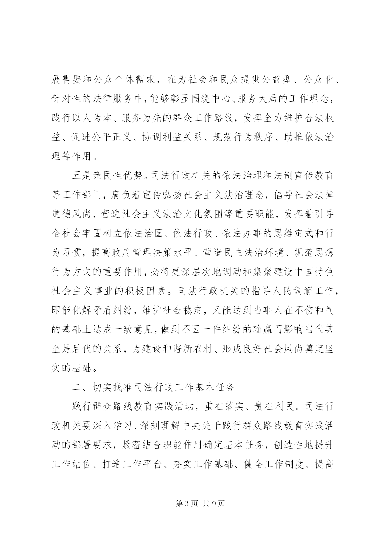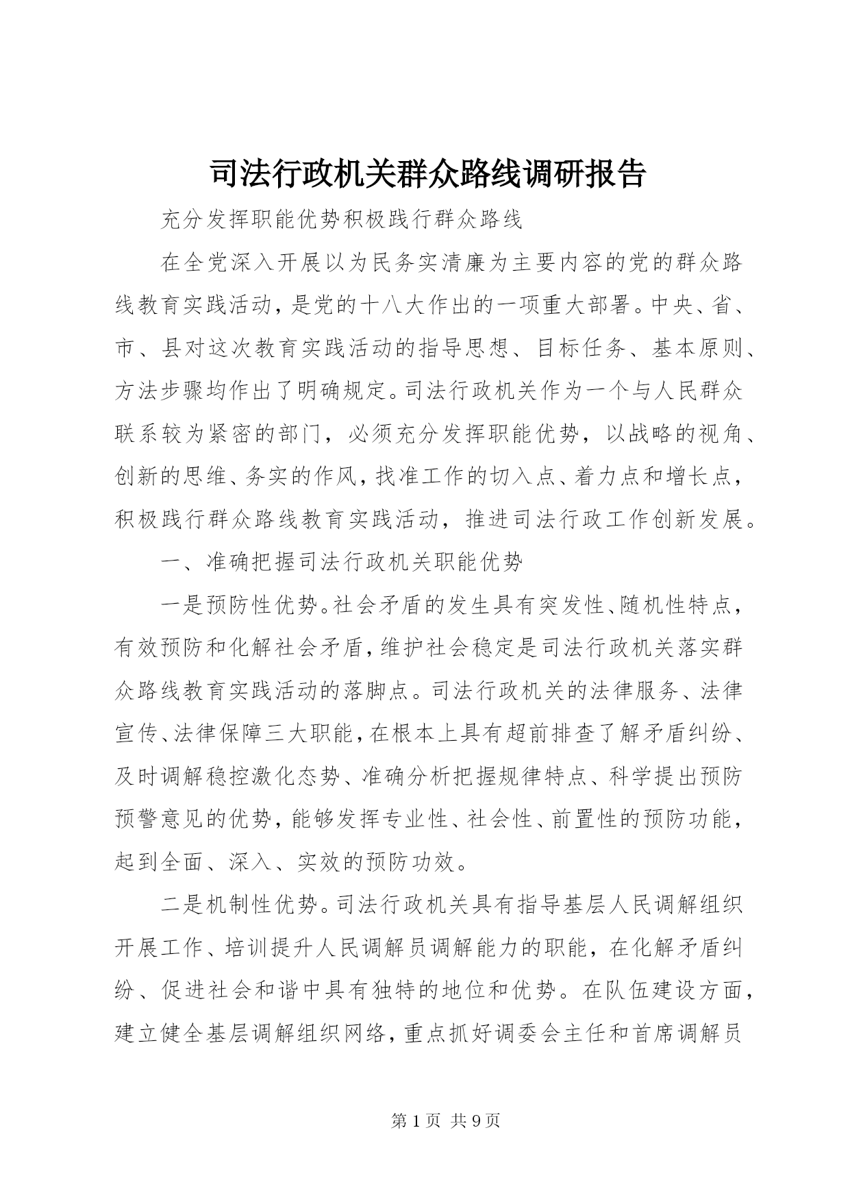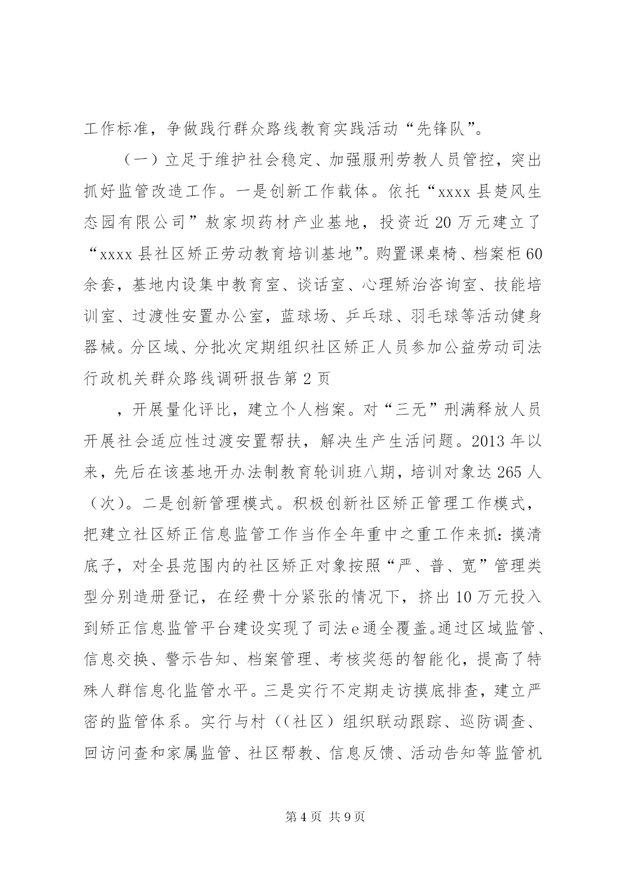 第PAGE\*Arabic\*MERGEFORMAT9页共NUMPAGES\*MERGEFORMAT9页司法行政机关群众路线调研报告充分发挥职能优势积极践行群众路线在全党深入开展以为民务实清廉为主要内容的党的群众路线教育实践活动,是党的十八大作出的一项重大部署。中央、省、市、县对这次教育实践活动的指导思想、目标任务、基本原则、方法步骤均作出了明确规定。司法行政机关作为一个与人民群众联系较为紧密的部门,必须充分发挥职能优势,以战略的视角、创新的思维、务实的作风,找准工作的切入点、着力点和增长点,积极践行群众路线教育实践活动,推进司法行政工作创新发展。一、准确把握司法行政机关职能优势一是预防性优势。社会矛盾的发生具有突发性、随机性特点,有效预防和化解社会矛盾,维护社会稳定是司法行政机关落实群众路线教育实践活动的落脚点。司法行政机关的法律服务、法律宣传、法律保障三大职能,在根本上具有超前排查了解矛盾纠纷、及时调解稳控激化态势、准确分析把握规律特点、科学提出预防预警意见的优势,能够发挥专业性、社会性、前置性的预防功能,起到全面、深入、实效的预防功效。二是机制性优势。司法行政机关具有指导基层人民调解组织开展工作、培训提升人民调解员调解能力的职能,在化解矛盾纠纷、促进社会和谐中具有独特的地位和优势。在队伍建设方面,建立健全基层调解组织网络,重点抓好调委会主任和首席调解员的培训,不断提高调解员的政治、业务素质,进一步加强人民调解工作;在机制建设方面,健全完善了矛盾纠纷排查预警机制,立足于抓小、抓早、抓苗头和早发现、早介入、早调处的工作原则,依托基层调委会,组织广大民调员和信息员经常进村入户,了解信息掌握情况,对于发现的个别苗头性纠纷信息要及时反馈,对辖区内的稳定状况要定期通报,对于一些倾向性并可能引发群体性的矛盾纠纷信息,在及时上报的同时,建立应急预案和防范机制,做到超前谋划,超前防范,把事态控制在可控范围之内,搞好矛盾纠纷源头预防,变被动调解为主动介入,变事后调处为事先防范,及时把矛盾纠纷解决在当地、化解在基层、解决在萌芽状态。三是资源性优势。社会管理涉及执政兴国的各方面,深及科学发展的各环节,触及和谐建设的各领域,需要整合各种资源,形成合力。司法行政机关职能较多又相对分散,一方面造成管理不便,工作职能不能交叉;另一方面也成为司法行政机关的优势所在,主要表现在,司法行政机关参与社会管理的领域广、对象多、手段全,各方面的行家里手多,律师、法律服务工作者、鉴定执业人员、公证员、人民调解能手等等,可以说是众多的优秀人才都齐聚司法行政这个大家庭,呈现出“点多、线长、面广”的资源性优势。四是服务性优势。司法行政机关的各项职能,在跟进社会发展需要和公众个体需求,在为社会和民众提供公益型、公众化、针对性的法律服务中,能够彰显围绕中心、服务大局的工作理念,践行以人为本、服务为先的群众工作路线,发挥全力维护合法权益、促进公平正义、协调利益关系、规范行为秩序、助推依法治理等作用。五是亲民性优势。司法行政机关的依法治理和法制宣传教育等工作部门,肩负着宣传弘扬社会主义法治理念,倡导社会法律道德风尚,营造社会主义法治文化氛围等重要职能,发挥着引导全社会牢固树立依法治国、依法行政、依法办事的思维定式和行为习惯,提高政府管理决策水平、营造民主法治环境、规范思想行为方式的重要作用,必将更深层次地调动和集聚建设中国特色社会主义事业的积极因素。司法行政机关的指导人民调解工作,即能化解矛盾纠纷,维护社会稳定,又能达到当事人在不伤和气的基础上达成一致意见,做到不因一件纠纷的输赢而影响当代甚至是后代的关系,为建设和谐新农村、形成良好社会风尚奠定坚实的基础。二、切实找准司法行政工作基本任务践行群众路线教育实践活动,重在落实、贵在利民。司法行政机关要深入学习、深刻理解中央关于践行群众路线教育实践活动的部署要求,紧密结合职能作用确定基本任务,创造性地提升工作站位、打造工作平台、夯实工作基础、健全工作制度、提高工作标准,争做践行群众路线教育实践活动“先锋队”。(一)立足于维护社会稳定、加强服刑劳教人员管控,突出抓好监管改造工作。一是创新工作载体。依托“xxxx县楚风生态园有限公司”敖家坝药材产业基地,投资近20万元建立了“xxxx县社区矫正劳动教育培训基地”。购置课桌椅、档案柜60余套,基地内设集中教育室、谈话室、心理矫治咨询室、技能培训室、过渡性安置办公室,蓝球场、乒乓球、羽毛球等活动健身器械。分区域、分批次定期组织社区矫正人员参加公益劳动司法行政机关群众路线调研报告,开展量化评比,建立个人档案。对“三无”刑满释放人员开展社会适应性过渡安置帮扶,解决生产生活问题。2013年以来,先后在该基地开办法制教育轮训班八期,培训对象达265人(次)。二是创新管理模式。积