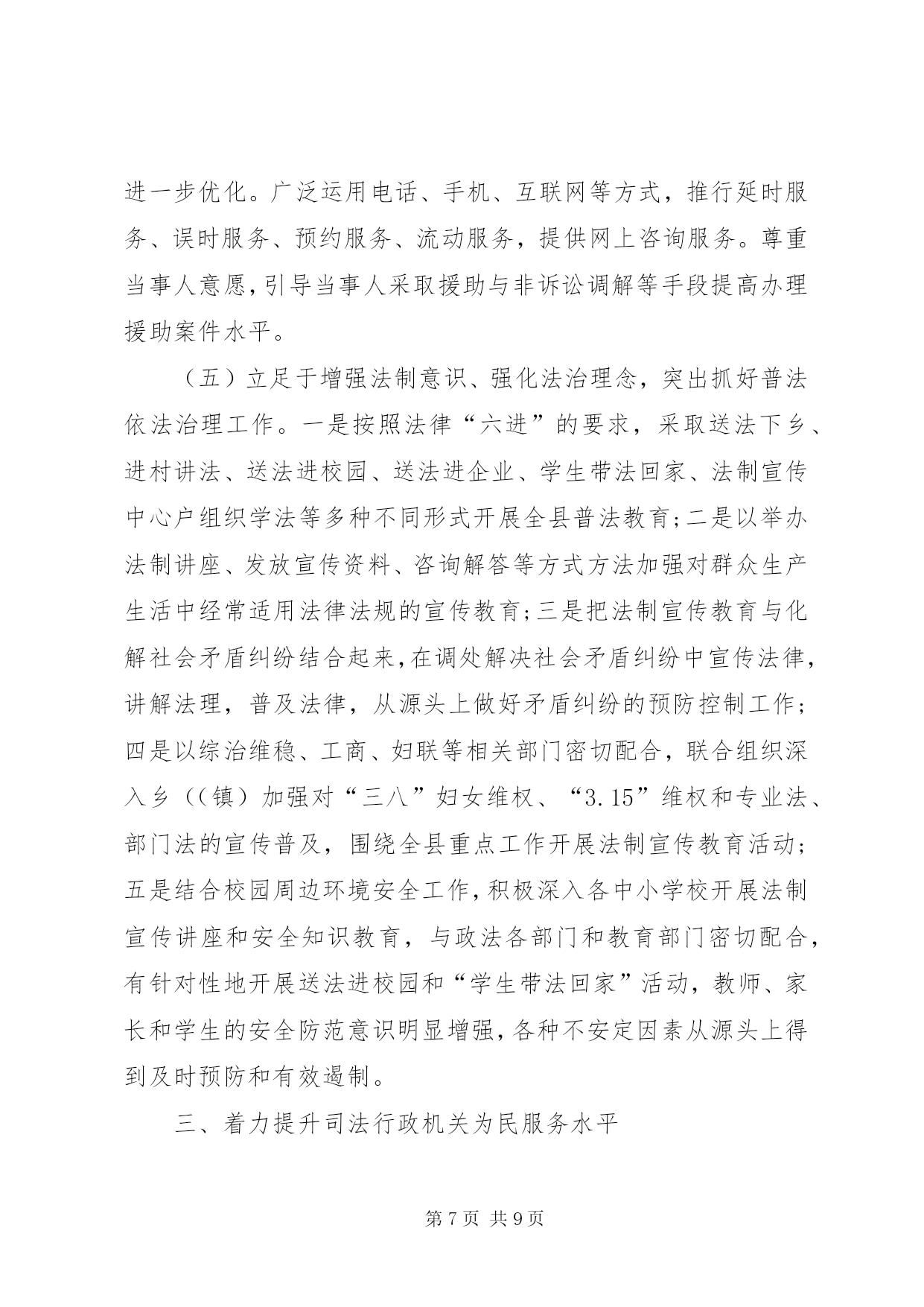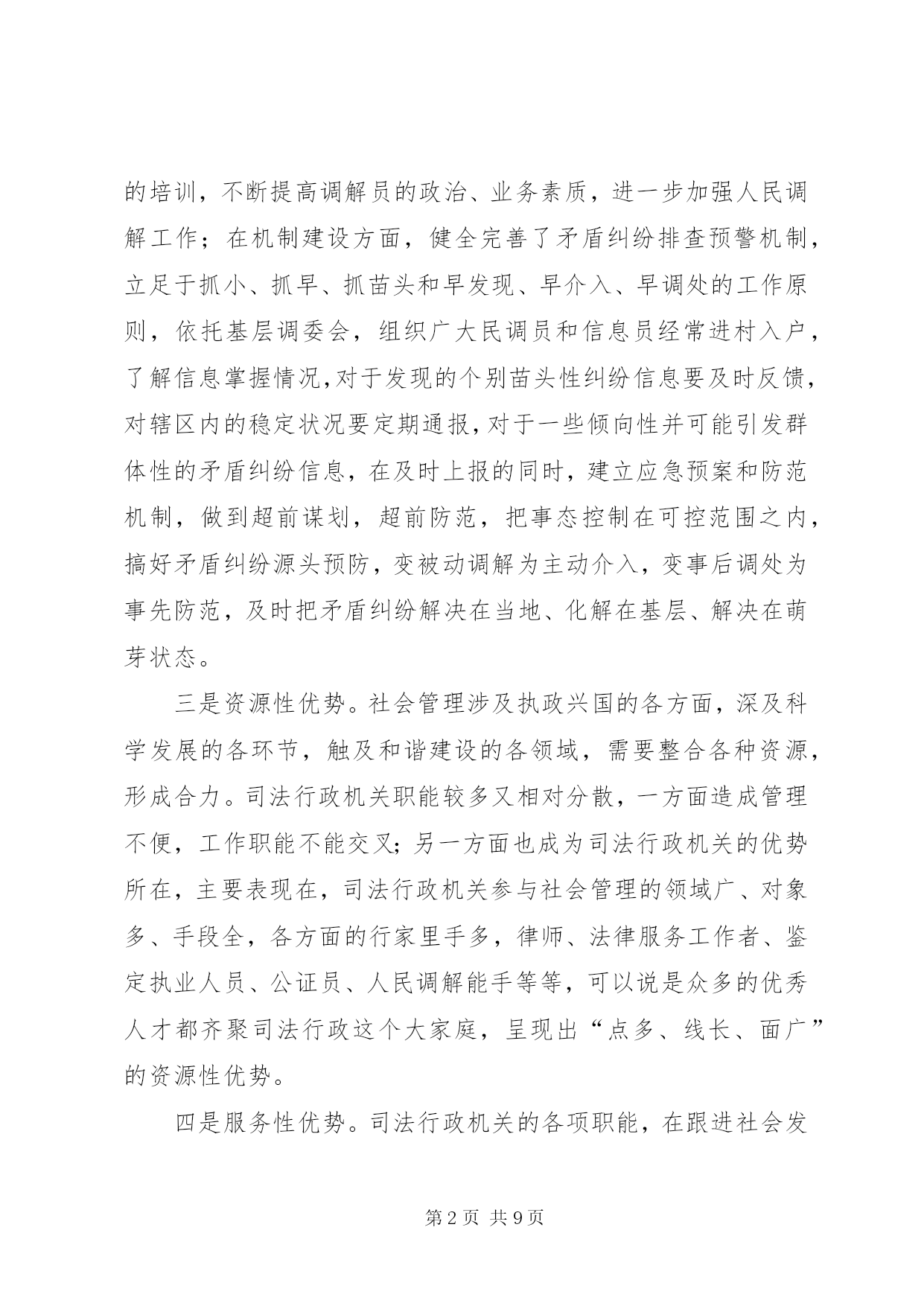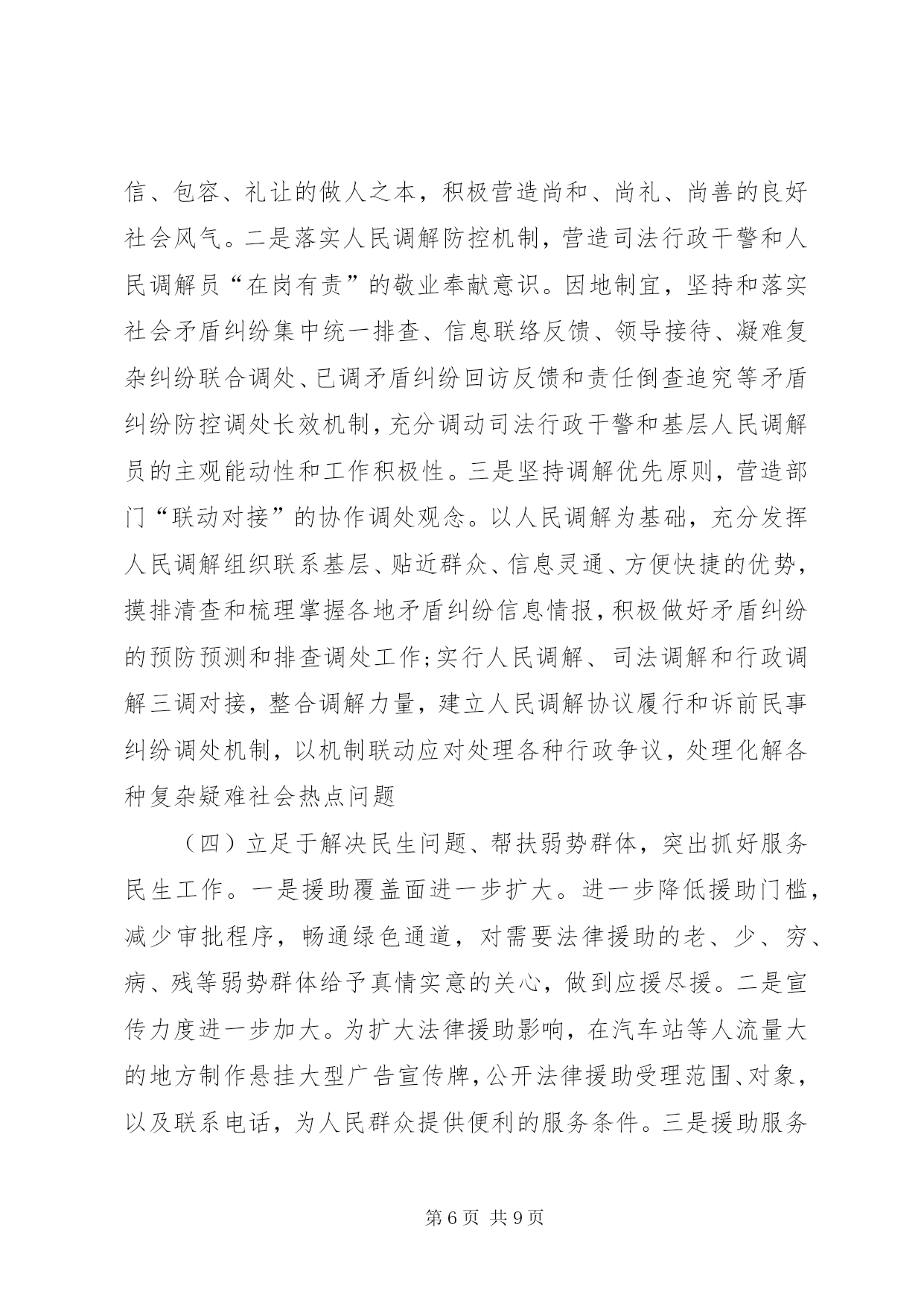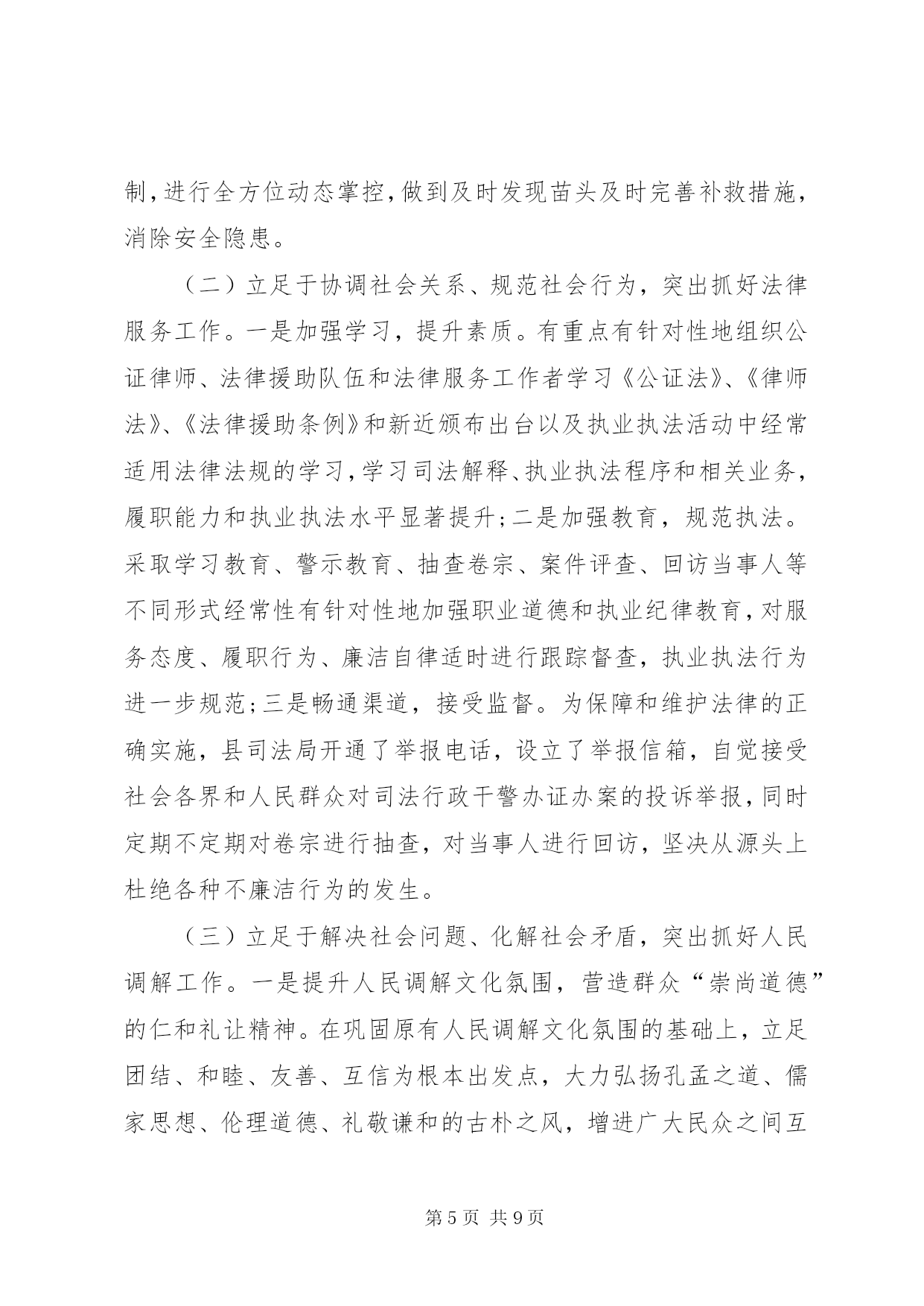 第PAGE\*Arabic\*MERGEFORMAT9页共NUMPAGES\*MERGEFORMAT9页司法行政机关群众路线调研报告充分发挥职能优势积极践行群众路线在全党深入开展以为民务实清廉为主要内容的党的群众路线教育实践活动,是党的十八大作出的一项重大部署。中央、省、市、县对这次教育实践活动的指导思想、目标任务、基本原则、方法步骤均作出了明确规定。司法行政机关作为一个与人民群众联系较为紧密的部门,必须充分发挥职能优势,以战略的视角、创新的思维、务实的作风,找准工作的切入点、着力点和增长点,积极践行群众路线教育实践活动,推进司法行政工作创新发展。一、准确把握司法行政机关职能优势一是预防性优势。社会矛盾的发生具有突发性、随机性特点,有效预防和化解社会矛盾,维护社会稳定是司法行政机关落实群众路线教育实践活动的落脚点。司法行政机关的法律服务、法律宣传、法律保障三大职能,在根本上具有超前排查了解矛盾纠纷、及时调解稳控激化态势、准确分析把握规律特点、科学提出预防预警意见的优势,能够发挥专业性、社会性、前置性的预防功能,起到全面、深入、实效的预防功效。二是机制性优势。司法行政机关具有指导基层人民调解组织开展工作、培训提升人民调解员调解能力的职能,在化解矛盾纠纷、促进社会和谐中具有独特的地位和优势。在队伍建设方面,建立健全基层调解组织网络,重点抓好调委会主任和首席调解员的培训,不断提高调解员的政治、业务素质,进一步加强人民调解工作;在机制建设方面,健全完善了矛盾纠纷排查预警机制,立足于抓小、抓早、抓苗头和早发现、早介入、早调处的工作原则,依托基层调委会,组织广大民调员和信息员经常进村入户,了解信息掌握情况,对于发现的个别苗头性纠纷信息要及时反馈,对辖区内的稳定状况要定期通报,对于一些倾向性并可能引发群体性的矛盾纠纷信息,在及时上报的同时,建立应急预案和防范机制,做到超前谋划,超前防范,把事态控制在可控范围之内,搞好矛盾纠纷源头预防,变被动调解为主动介入,变事后调处为事先防范,及时把矛盾纠纷解决在当地、化解在基层、解决在萌芽状态。三是资源性优势。社会管理涉及执政兴国的各方面,深及科学发展的各环节,触及和谐建设的各领域,需要整合各种资源,形成合力。司法行政机关职能较多又相对分散,一方面造成管理不便,工作职能不能交叉;另一方面也成为司法行政机关的优势所在,主要表现在,司法行政机关参与社会管理的领域广、对象多、手段全,各方面的行家里手多,律师、法律服务工作者、鉴定执业人员、公证员、人民调解能手等等,可以说是众多的优秀人才都齐聚司法行政这个大家庭,呈现出“点多、线长、面广”的资源性优势。四是服务性优势。司法行政机关的各项职能,在跟进社会发展需要和公众个体需求,在为社会和民众提供公益型、公众化、针对性的法律服务中,能够彰显围绕中心、服务大局的工作理念,践行以人为本、服务为先的群众工作路线,发挥全力维护合法权益、促进公平正义、协调利益关系、规范行为秩序、助推依法治理等作用。五是亲民性优势。司法行政机关的依法治理和法制宣传教育等工作部门,肩负着宣传弘扬社会主义法治理念,倡导社会法律道德风尚,营造社会主义法治文化氛围等重要职能,发挥着引导全社会牢固树立依法治国、依法行政、依法办事的思维定式和行为习惯,提高政府管理决策水平、营造民主法治环境、规范思想行为方式的重要作用,必将更深层次地调动和集聚建设中国特色社会主义事业的积极因素。司法行政机关的指导人民调解工作,即能化解矛盾纠纷,维护社会稳定,又能达到当事人在不伤和气的基础上达成一致意见,做到不因一件纠纷的输赢而影响当代甚至是后代的关系,为建设和谐新农村、形成良好社会风尚奠定坚实的基础。二、切实找准司法行政工作基本任务践行群众路线教育实践活动,重在落实、贵在利民。司法行政机关要深入学习、深刻理解中央关于践行群众路线教育实践活动的部署要求,紧密结合职能作用确定基本任务,创造性地提升工作站位、打造工作平台、夯实工作基础、健全工作制度、提高工作标准,争做践行群众路线教育实践活动“先锋队”。(一)立足于维护社会稳定、加强服刑劳教人员管控,突出抓好监管改造工作。一是创新工作载体。依托“xxxx县楚风生态园有限公司”敖家坝药材产业基地,投资近20万元建立了“xxxx县社区矫正劳动教育培训基地”。购置课桌椅、档案柜60余套,基地内设集中教育室、谈话室、心理矫治咨询室、技能培训室、过渡性安置办公室,蓝球场、乒乓球、羽毛球等活动健身器械。分区域、分批次定期组织社区矫正人员参加公益劳动司法行政机关群众路线调研报告,开展量化评比,建立个人档案。对“三无”刑满释放人员开展社会适应性过渡安置帮扶,解决生产生活问题。2013年以来,先后在该基地开办法制教育轮训班八期,培训对象达265人(次)。二是创新管理模式。积