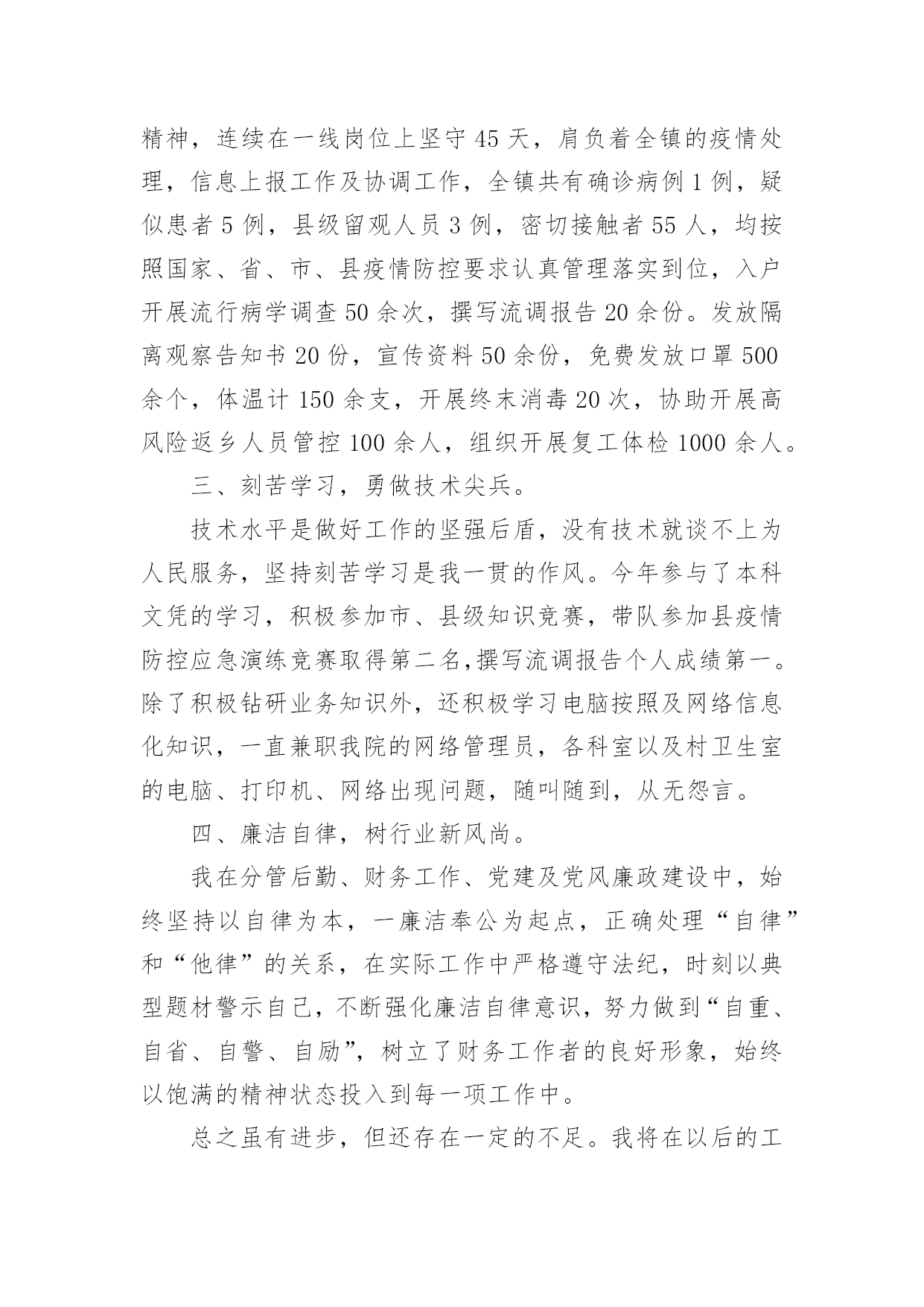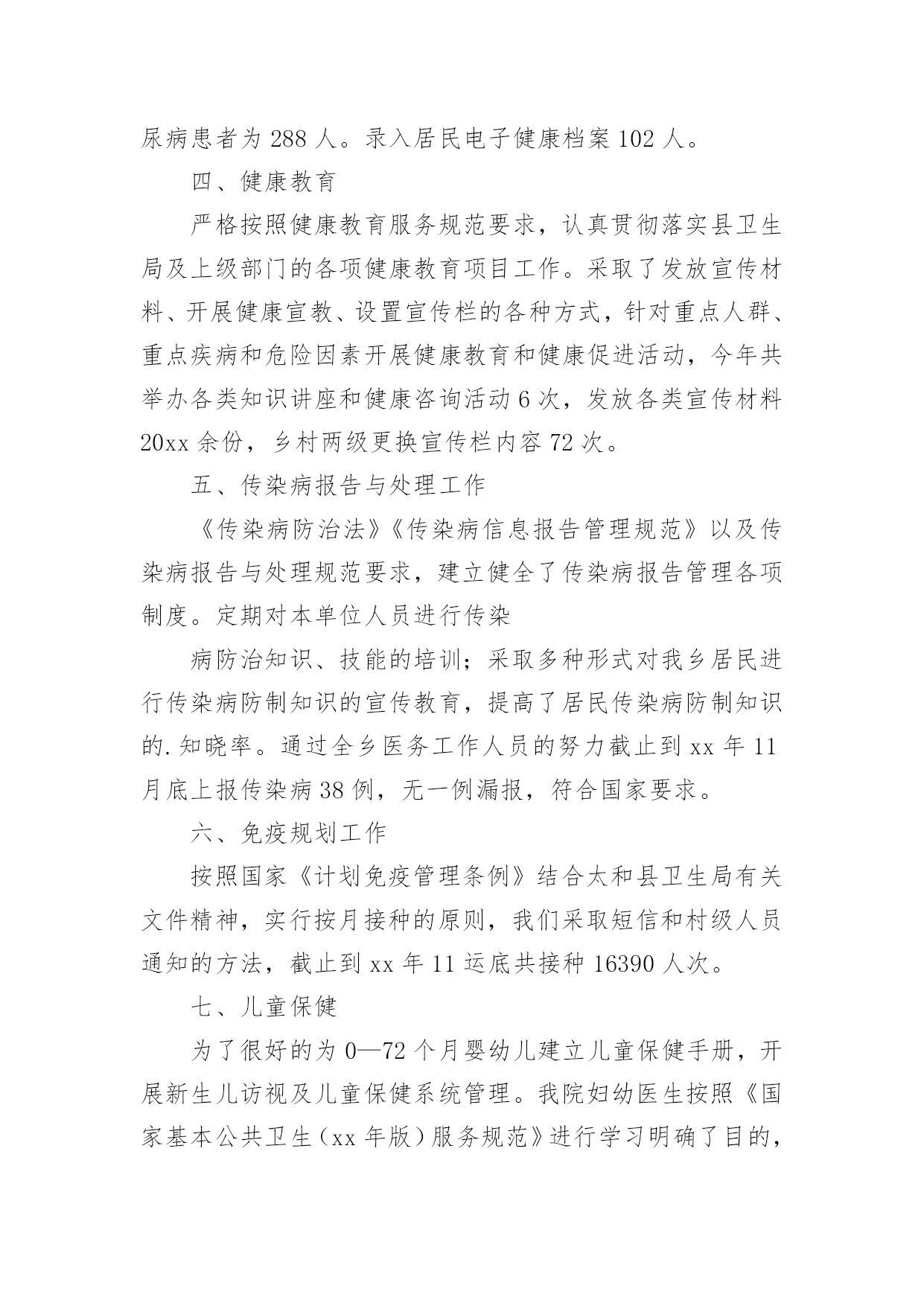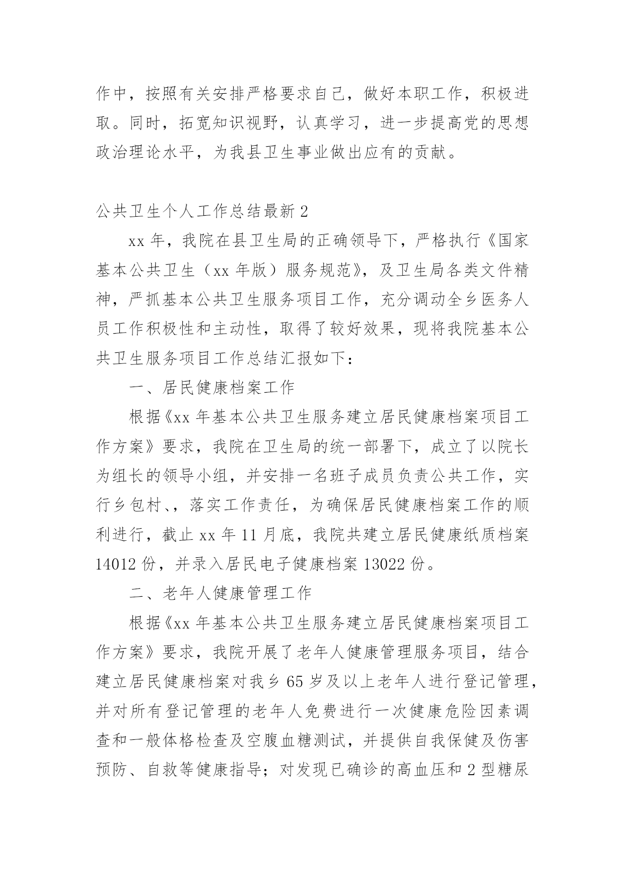 公共卫生个人工作总结最新总结就是把一个时段的学习、工作或其完成情况进行一次全面系统的总结,通过它可以正确认识以往学习和工作中的优缺点,让我们抽出时间写写总结吧。你想知道总结怎么写吗?以下是小编帮大家整理的公共卫生个人工作总结最新,供大家参考借鉴,希望可以帮助到有需要的朋友。公共卫生个人工作总结最新1一直以来,本人在党组织和单位领导的培养教育下,在同事们的支持下,始终以一名党员的标准来严格要求自己,牢记自己使命和责任,坚持全心全意为人民服务的宗旨,在自己平凡的岗位上,遵纪守法,爱岗敬业,努力拼搏,任劳任怨,得到了领导、同志们的赞誉,为峡口镇的卫生事业的发展以及经济建设作出了应有的贡献。一、爱岗敬业,尽显党员风范。一年来,带领公共卫生科工作人员认真研读《国家基本公共卫生服务规范》,召开乡村医生培训,拟定各项规章制度,制定工作方案,想尽一切办法认真落实14大项46小项的基本公共卫生服务,得到老百姓的认可,将基本公共卫生服务逐渐成为了一项老百姓看得见摸得着的惠民工程。二、身先士卒,争做疫情防控的“逆行者”。一场百年不遇的.重大疫情不期而至,面对疫情,他毅然选择了逆向而行。从1月27日下午接到县卫健局的指示精神,连续在一线岗位上坚守45天,肩负着全镇的疫情处理,信息上报工作及协调工作,全镇共有确诊病例1例,疑似患者5例,县级留观人员3例,密切接触者55人,均按照国家、省、市、县疫情防控要求认真管理落实到位,入户开展流行病学调查50余次,撰写流调报告20余份。发放隔离观察告知书20份,宣传资料50余份,免费发放口罩500余个,体温计150余支,开展终末消毒20次,协助开展高风险返乡人员管控100余人,组织开展复工体检1000余人。三、刻苦学习,勇做技术尖兵。技术水平是做好工作的坚强后盾,没有技术就谈不上为人民服务,坚持刻苦学习是我一贯的作风。今年参与了本科文凭的学习,积极参加市、县级知识竞赛,带队参加县疫情防控应急演练竞赛取得第二名,撰写流调报告个人成绩第一。除了积极钻研业务知识外,还积极学习电脑按照及网络信息化知识,一直兼职我院的网络管理员,各科室以及村卫生室的电脑、打印机、网络出现问题,随叫随到,从无怨言。四、廉洁自律,树行业新风尚。我在分管后勤、财务工作、党建及党风廉政建设中,始终坚持以自律为本,一廉洁奉公为起点,正确处理“自律”和“他律”的关系,在实际工作中严格遵守法纪,时刻以典型题材警示自己,不断强化廉洁自律意识,努力做到“自重、自省、自警、自励”,树立了财务工作者的良好形象,始终以饱满的精神状态投入到每一项工作中。总之虽有进步,但还存在一定的不足。我将在以后的工作中,按照有关安排严格要求自己,做好本职工作,积极进取。同时,拓宽知识视野,认真学习,进一步提高党的思想政治理论水平,为我县卫生事业做出应有的贡献。公共卫生个人工作总结最新2xx年,我院在县卫生局的正确领导下,严格执行《国家基本公共卫生(xx年版)服务规范》,及卫生局各类文件精神,严抓基本公共卫生服务项目工作,充分调动全乡医务人员工作积极性和主动性,取得了较好效果,现将我院基本公共卫生服务项目工作总结汇报如下:一、居民健康档案工作根据《xx年基本公共卫生服务建立居民健康档案项目工作方案》要求,我院在卫生局的统一部署下,成立了以院长为组长的领导小组,并安排一名班子成员负责公共工作,实行乡包村、,落实工作责任,为确保居民健康档案工作的顺利进行,截止xx年11月底,我院共建立居民健康纸质档案14012份,并录入居民电子健康档案13022份。二、老年人健康管理工作根据《xx年基本公共卫生服务建立居民健康档案项目工作方案》要求,我院开展了老年人健康管理服务项目,结合建立居民健康档案对我乡65岁及以上老年人进行登记管理,并对所有登记管理的老年人免费进行一次健康危险因素调查和一般体格检查及空腹血糖测试,并提供自我保健及伤害预防、自救等健康指导;对发现已确诊的高血压和2型糖尿病患者纳入相应的慢性病患者进行管理;对存在危险因素且未纳入其他疾病管理的老年居民进行定期随访,并告知该居民一年后进行下一次免费健康检查。截止xx年11月,我院共登记管理65岁及以上老年3012人。并录入居民电子健康档案1690份。三、慢病管理工作1、高血压患者管理一是通过开展35岁及以上居民首诊测血压;居民诊疗过程测血压;健康体检测血压;和健康档案建立过程中询问等方式发现高血压患者。二是对确诊的高血压患者进行登记管理,并提供面对面随访,每次随访询问病情测量血压,对用药、饮食、运动、心理等提供健康指导。三是对已经登记管理的高血压患者进行一次免费的健康体检(含一般体格检查和随机血糖测试。截止xx年11月,我院共登记管理并提供随访高血压患者为1376人。录入居民电子健康档案684人。2、2型糖尿病患者管理一是通过健康