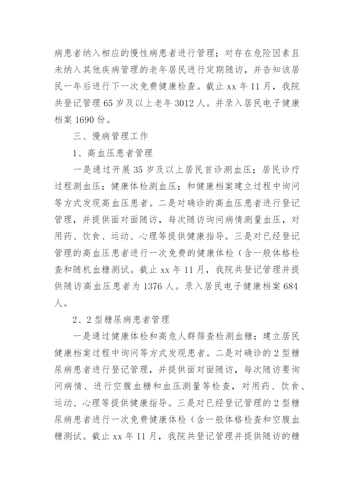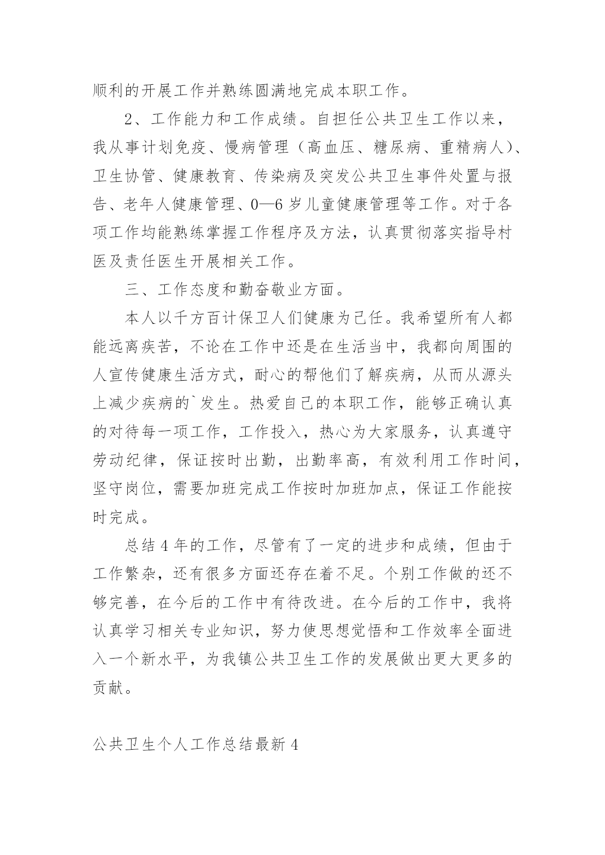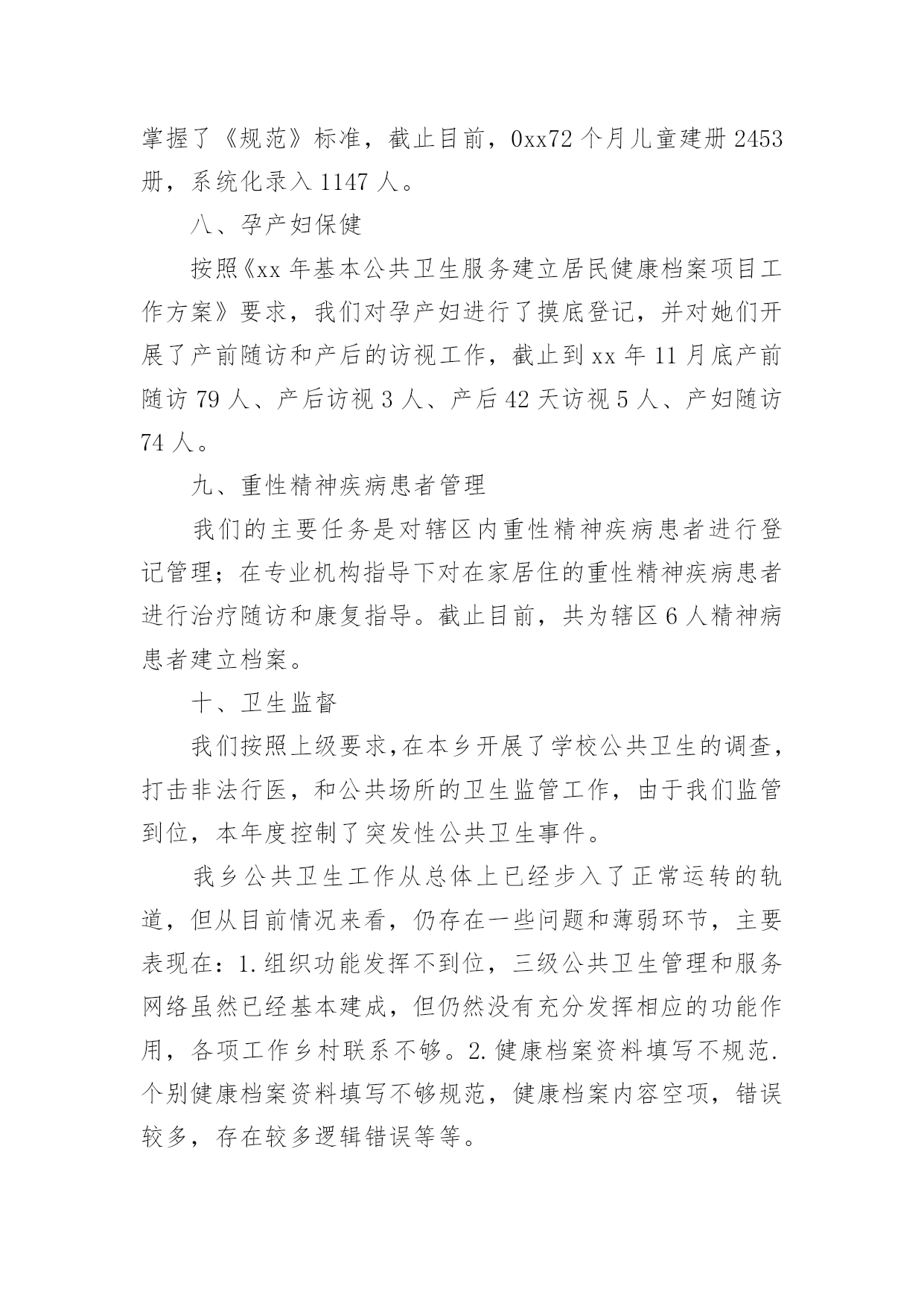 公共卫生个人工作总结最新总结就是把一个时段的学习、工作或其完成情况进行一次全面系统的总结,通过它可以正确认识以往学习和工作中的优缺点,让我们抽出时间写写总结吧。你想知道总结怎么写吗?以下是小编帮大家整理的公共卫生个人工作总结最新,供大家参考借鉴,希望可以帮助到有需要的朋友。公共卫生个人工作总结最新1一直以来,本人在党组织和单位领导的培养教育下,在同事们的支持下,始终以一名党员的标准来严格要求自己,牢记自己使命和责任,坚持全心全意为人民服务的宗旨,在自己平凡的岗位上,遵纪守法,爱岗敬业,努力拼搏,任劳任怨,得到了领导、同志们的赞誉,为峡口镇的卫生事业的发展以及经济建设作出了应有的贡献。一、爱岗敬业,尽显党员风范。一年来,带领公共卫生科工作人员认真研读《国家基本公共卫生服务规范》,召开乡村医生培训,拟定各项规章制度,制定工作方案,想尽一切办法认真落实14大项46小项的基本公共卫生服务,得到老百姓的认可,将基本公共卫生服务逐渐成为了一项老百姓看得见摸得着的惠民工程。二、身先士卒,争做疫情防控的“逆行者”。一场百年不遇的.重大疫情不期而至,面对疫情,他毅然选择了逆向而行。从1月27日下午接到县卫健局的指示精神,连续在一线岗位上坚守45天,肩负着全镇的疫情处理,信息上报工作及协调工作,全镇共有确诊病例1例,疑似患者5例,县级留观人员3例,密切接触者55人,均按照国家、省、市、县疫情防控要求认真管理落实到位,入户开展流行病学调查50余次,撰写流调报告20余份。发放隔离观察告知书20份,宣传资料50余份,免费发放口罩500余个,体温计150余支,开展终末消毒20次,协助开展高风险返乡人员管控100余人,组织开展复工体检1000余人。三、刻苦学习,勇做技术尖兵。技术水平是做好工作的坚强后盾,没有技术就谈不上为人民服务,坚持刻苦学习是我一贯的作风。今年参与了本科文凭的学习,积极参加市、县级知识竞赛,带队参加县疫情防控应急演练竞赛取得第二名,撰写流调报告个人成绩第一。除了积极钻研业务知识外,还积极学习电脑按照及网络信息化知识,一直兼职我院的网络管理员,各科室以及村卫生室的电脑、打印机、网络出现问题,随叫随到,从无怨言。四、廉洁自律,树行业新风尚。我在分管后勤、财务工作、党建及党风廉政建设中,始终坚持以自律为本,一廉洁奉公为起点,正确处理“自律”和“他律”的关系,在实际工作中严格遵守法纪,时刻以典型题材警示自己,不断强化廉洁自律意识,努力做到“自重、自省、自警、自励”,树立了财务工作者的良好形象,始终以饱满的精神状态投入到每一项工作中。总之虽有进步,但还存在一定的不足。我将在以后的工作中,按照有关安排严格要求自己,做好本职工作,积极进取。同时,拓宽知识视野,认真学习,进一步提高党的思想政治理论水平,为我县卫生事业做出应有的贡献。公共卫生个人工作总结最新2xx年,我院在县卫生局的正确领导下,严格执行《国家基本公共卫生(xx年版)服务规范》,及卫生局各类文件精神,严抓基本公共卫生服务项目工作,充分调动全乡医务人员工作积极性和主动性,取得了较好效果,现将我院基本公共卫生服务项目工作总结汇报如下:一、居民健康档案工作根据《xx年基本公共卫生服务建立居民健康档案项目工作方案》要求,我院在卫生局的统一部署下,成立了以院长为组长的领导小组,并安排一名班子成员负责公共工作,实行乡包村、,落实工作责任,为确保居民健康档案工作的顺利进行,截止xx年11月底,我院共建立居民健康纸质档案14012份,并录入居民电子健康档案13022份。二、老年人健康管理工作根据《xx年基本公共卫生服务建立居民健康档案项目工作方案》要求,我院开展了老年人健康管理服务项目,结合建立居民健康档案对我乡65岁及以上老年人进行登记管理,并对所有登记管理的老年人免费进行一次健康危险因素调查和一般体格检查及空腹血糖测试,并提供自我保健及伤害预防、自救等健康指导;对发现已确诊的高血压和2型糖尿病患者纳入相应的慢性病患者进行管理;对存在危险因素且未纳入其他疾病管理的老年居民进行定期随访,并告知该居民一年后进行下一次免费健康检查。截止xx年11月,我院共登记管理65岁及以上老年3012人。并录入居民电子健康档案1690份。三、慢病管理工作1、高血压患者管理一是通过开展35岁及以上居民首诊测血压;居民诊疗过程测血压;健康体检测血压;和健康档案建立过程中询问等方式发现高血压患者。二是对确诊的高血压患者进行登记管理,并提供面对面随访,每次随访询问病情测量血压,对用药、饮食、运动、心理等提供健康指导。三是对已经登记管理的高血压患者进行一次免费的健康体检(含一般体格检查和随机血糖测试。截止xx年11月,我院共登记管理并提供随访高血压患者为1376人。录入居民电子健康档案684人。2、2型糖尿病患者管理一是通过健康