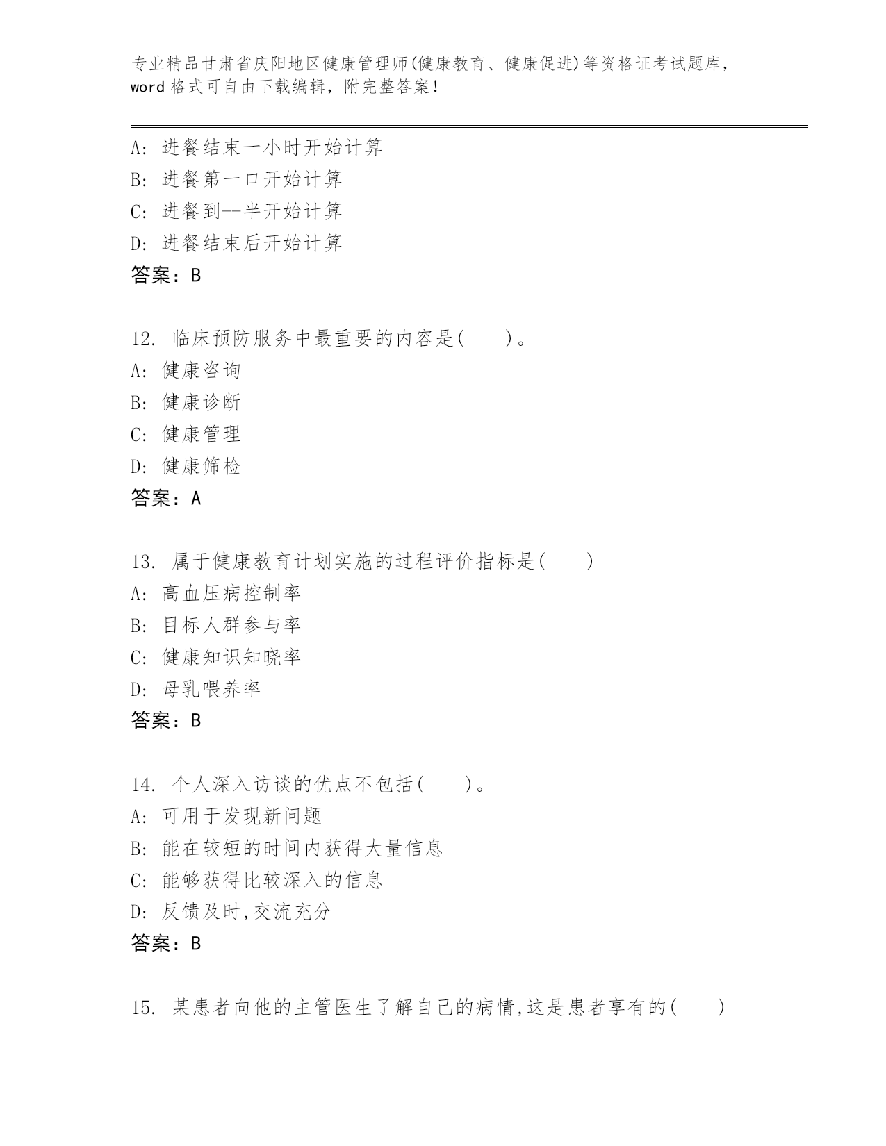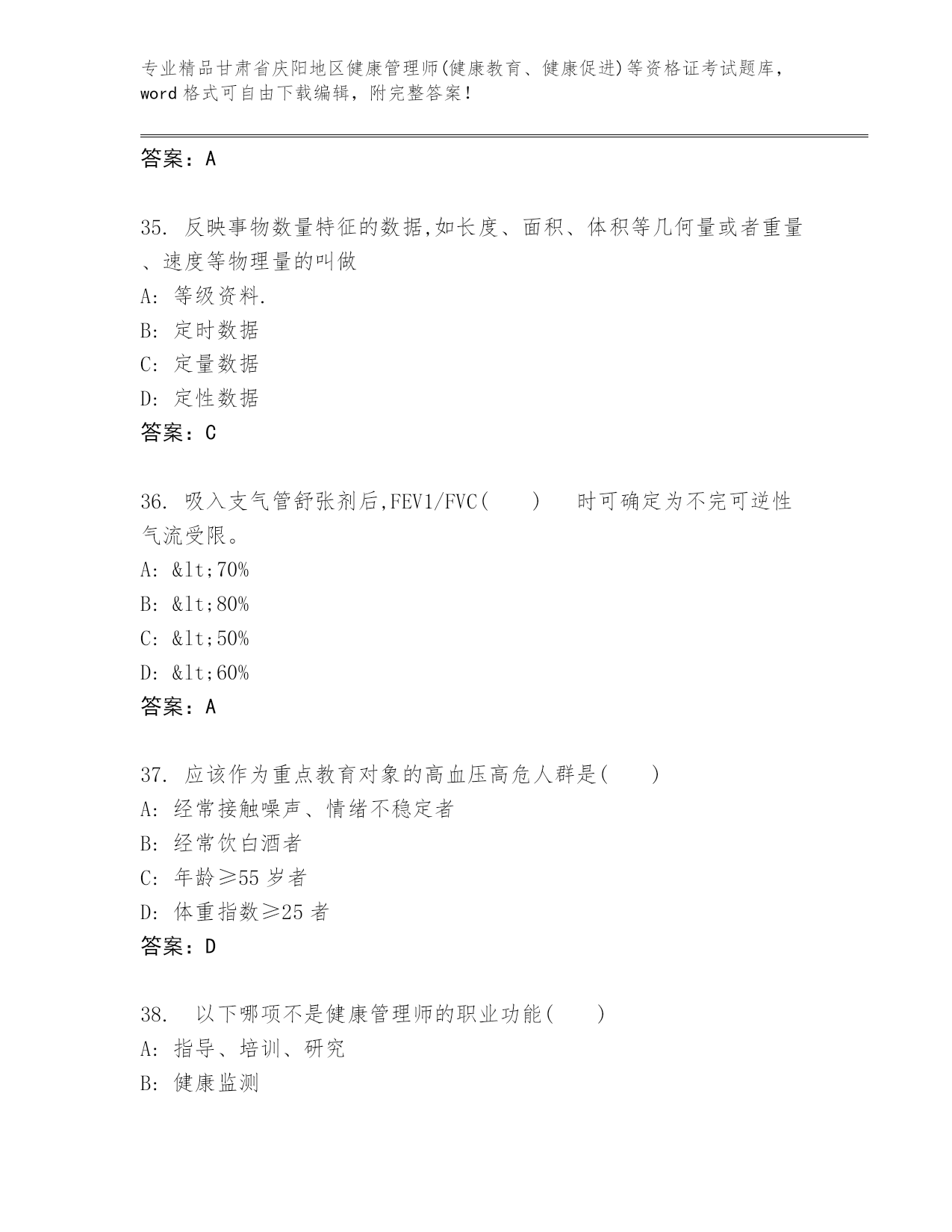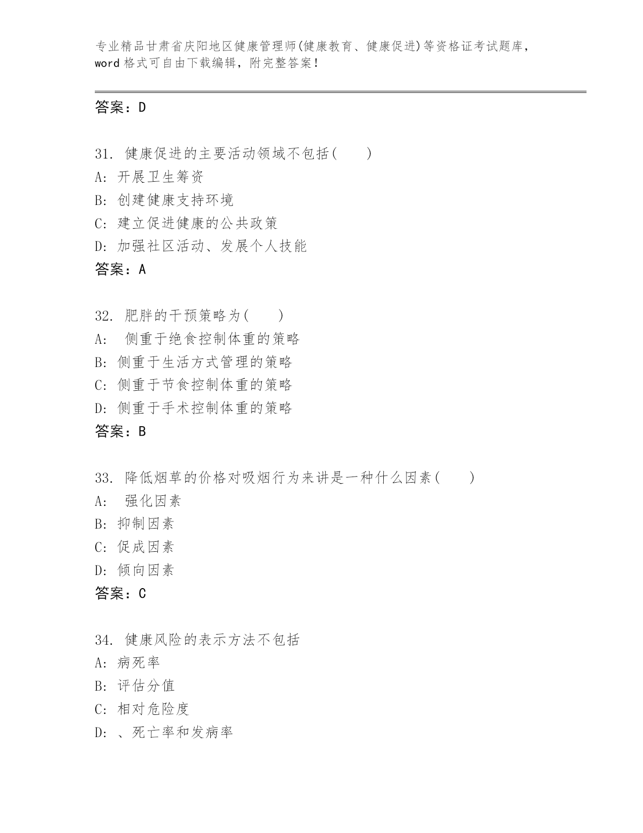 精心整理甘肃省庆阳地区健康管理师(健康教育、健康促进)等资格证考试王牌题库带答案(精练).docx