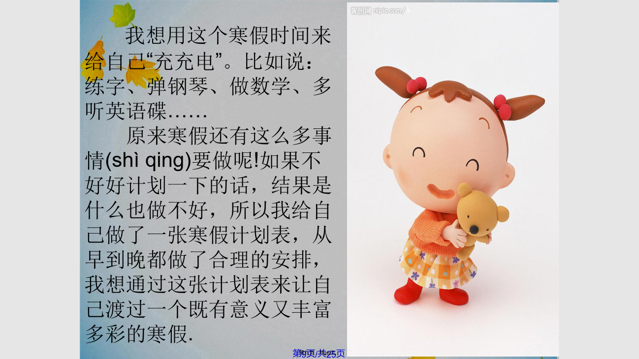 这个(zhège)暑假你这样做了吗?多锻炼身体去学习(xuéxí)自己的兴趣爱好帮父母(fùmǔ)干家务和家人(jiārén)共享美好时光去名胜古迹(míngshènggǔjī)旅游很怀念每天早上(zǎoìshang)钻在暖哄哄的被窝里睡懒觉很怀念(huáiniàn)坐在电视前很怀念在外面旅游(lǚyóu)的日子以《我的假期生活》为题,写一篇(yīpiān)记叙文。不少于600字我的暑假生活放假了,随着下课铃的一声响,我们的暑假生活就开始了。放假之后,我千方百计地争取到妈妈(māmā)的同意,终于可以轻松一天了,这天再也不用跟哑巴老师书本打交道了。第二天,我和暑假作业展开了赛跑,我在和暑假作业不断地赛跑中,一点一点地消耗它的体力,在爸爸妈妈(māmā)的帮助下,我终于赢了暑假作业,可暑假作业还有一个弟弟t老师的附加作业公式、单词、对话,日记,我不断地写,终于我过五关斩六将完成了它们。我的暑假生活是五颜六色的,不仅是写作业这一种色彩,我也有放松的时候,有的时候爸爸妈妈(māmā)带我去旅游,有的时候我与智慧的集合t电脑交交朋友。不知什么时候起,每当我睁开朦胧的睡眼时,奶奶那高音喇叭就开工了,妈妈(māmā)要上班了,快去送妈妈(māmā)一程到楼下。我无奈地三下五除二的穿上衣服,有一次,我将妈妈的小背心穿上了,刚到楼下,一个叔叔望着我梧嘴偷偷地笑,我心想叔叔中了五百万吧,笑得如此开心。我向叔叔问早上好,叔叔指了指我的衣服说:骋骋,你怎么一夜之间就长大了啊!你妈妈的衣服也适合你穿?我恍然大悟原来穿错了衣服,我的脸刷的一下娈成一,扭头就大步流星往家跑。我跑回的途中明白一个道理,做任何事情都应该一丝不苟。我的暑假生活不仅是这样,还做一些力所能及的家务,例如,刨土豆,洗碗小朋友们,不仅要爱学习(xuéxí),也要热爱劳动。这就是我的暑假生活,你呢?我的假期生活光阴似箭,日月如梭,愉快的假期生活很快就结束了。回顾起这个假期,有那么多愉快的事情发生(fāshēng)在我的身边,就找几件最难忘的是记录下来吧!假期生活趣事(一)——放鞭炮过年了,放鞭炮,贴对联是必不可少的。大年三十晚上7;00时,我和爸爸妈妈一起到楼下放鞭炮。到了楼下,三······二······一······。爸爸把鞭炮点着了。随着噼里啪啦的响声,我和妈妈直往后退,不到五分钟,鞭炮放完了,我们兴致勃勃的回家了。假期(jiàqī)生活趣事(二)——贴对联今天大年二十七,蹦蹦跳跳贴对联。早上九点钟,我们一家三口来贴对联。我们贴的对联是:一帆风顺年年好,万事如意步步高。横联是:迎春接福。爸爸拿着剪刀,妈妈贴对联,我剪胶布。不到十分钟,对联贴好了。我们高兴极了!假期(jiàqī)生活趣事(三)——看春节联欢晚会当····当····当钟声敲过八下后,春节联欢晚会开始了!随着音乐声,我目不转睛的盯着电视。我被这好看的节目吸引住了。春节联欢晚会有小品、舞蹈、歌曲等许多好看的节目。让我最欣赏节目是<<龙凤呈祥>>,最后摆出的造型非常像一条金色盘舞的龙,而且服装也非常漂亮。<<雀之恋>>这个舞蹈也使我非常欣赏,杨丽萍和她的舞伴在舞台上表演着美丽的孔雀舞,最后(zuìhòu)一幕使我惊呆了,杨丽萍的舞蹈最后(zuìhòu)的舞蹈造型形成了一个美丽的孔雀开屏的景象,真是好看极了!最使我欣赏的歌曲是<<中国美>>,歌曲好听极了。今天晚上的表演真精彩,真是我难忘啊!假期生活趣事(四)-----正月十五看烟花正月十五看烟花,今天是正月十五,我听妈妈说,晚上8:00有焰火晚会,晚上8:00到了,焰火晚会开始了,啪啪……,顿时,烟花铺满了整个天空,美丽的烟火升上天空,就连落下来的火星都是那么地美,图案也是那么的多姿多彩,有圆形,有花形,有心形……许多图案。五大乐章的烟花半个小时就燃放完了,到了最后,一声巨响,烟花升上天空是那么的美。8:30分烟花晚会(wǎnhuì)正式结束了。今年的正月十五看烟花,我永远都把这最美丽的场面留在心中。一个平凡的假期,竟然在我身边发生了这么多趣事。同学们,我相信,不止是我自己有这么多趣事,你们也有很多愉快的寒假趣事吧!感谢您的观看(guānkàn)!内容(nèiróng)总结