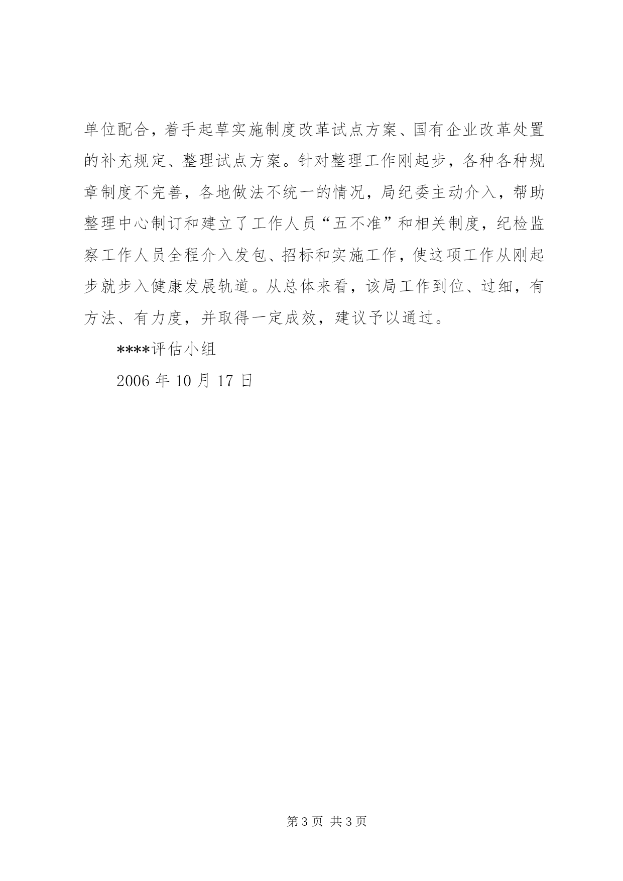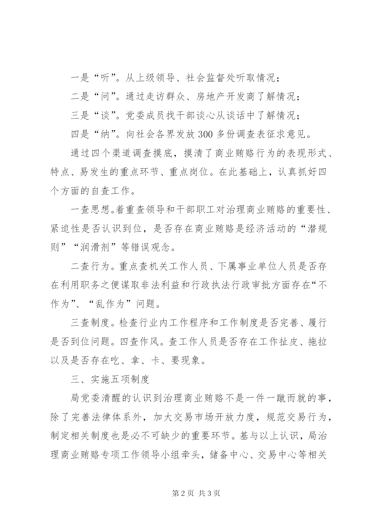 第PAGE\*Arabic\*MERGEFORMAT3页共NUMPAGES\*MERGEFORMAT3页对某局治理商业贿赂工作评估验收总结一、做好五个到位一是领导认识到位。通过学习中央治理商业贿赂有关文件、领导重要讲话和“八荣八耻”的社会主义荣辱观,不断提高干部职工的认识,统一思想,形成共识。二是组织机构到位。为使治理商业贿赂工作有人抓有人管,该局及时成立了治理商业贿赂领导小组及其办公室。明确“一把手”为第一责任人,形成一级抓一级,一级对一级负责的工作网络。三是工作方案到位。该局把制定工作方案当作活动的关键环节来抓,指定有专人负责,并组织实施。四是思想动员到位。为使广大干部职工明确本单位开展专项治理工作的目的、范围和要求,更好地推进治理商业贿赂专项工作,该局主要领导在动员会上强调开展治理商业贿赂的重要意义,要求干部职工自觉抵制商业贿赂,增强廉洁自律意识工作,使全体干部职工对开展此项工作有了统一的认识。五是活动经费到位。该局拨出近2万元,为每名干部职工购买了学习笔记本及书籍,要求干部机关认真学习吸取教训,引以为鉴,为活动的开展提供了必要的物质保障。二、抓好四个自查为找准在商业贿赂方面存在的问题,该局通过四个渠道深入群众、基层单位进行扎实、细致的调查,一是“听”。从上级领导、社会监督处听取情况;二是“问”。通过走访群众、房地产开发商了解情况;三是“谈”。党委成员找干部谈心从谈话中了解情况;四是“纳”。向社会各界发放300多份调查表征求意见。通过四个渠道调查摸底,摸清了商业贿赂行为的表现形式、特点、易发生的重点环节、重点岗位。在此基础上,认真抓好四个方面的自查工作。一查思想。着重查领导和干部职工对治理商业贿赂的重要性、紧迫性是否认识到位,是否存在商业贿赂是经济活动的“潜规则”“润滑剂”等错误观念。二查行为。重点查机关工作人员、下属事业单位人员是否存在利用职务之便谋取非法利益和行政执法行政审批方面存在“不作为”、“乱作为”问题。三查制度。检查行业内工作程序和工作制度是否完善、履行是否到位问题。四查作风。查工作人员是否存在工作扯皮、拖拉以及是否存在吃、拿、卡、要现象。三、实施五项制度局党委清醒的认识到治理商业贿赂不是一件一蹴而就的事,除了完善法律体系外,加大交易市场开放力度,规范交易行为,制定相关制度也是必不可缺少的重要环节。基与以上认识,局治理商业贿赂专项工作领导小组牵头,储备中心、交易中心等相关单位配合,着手起草实施制度改革试点方案、国有企业改革处置的补充规定、整理试点方案。针对整理工作刚起步,各种各种规章制度不完善,各地做法不统一的情况,局纪委主动介入,帮助整理中心制订和建立了工作人员“五不准”和相关制度,纪检监察工作人员全程介入发包、招标和实施工作,使这项工作从刚起步就步入健康发展轨道。从总体来看,该局工作到位、过细,有方法、有力度,并取得一定成效,建议予以通过。****评估小组2006年10月17日