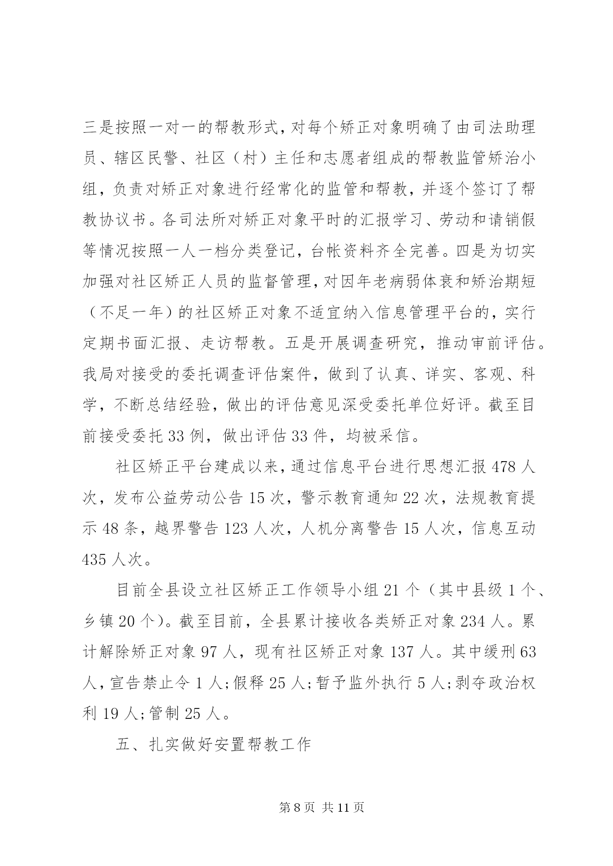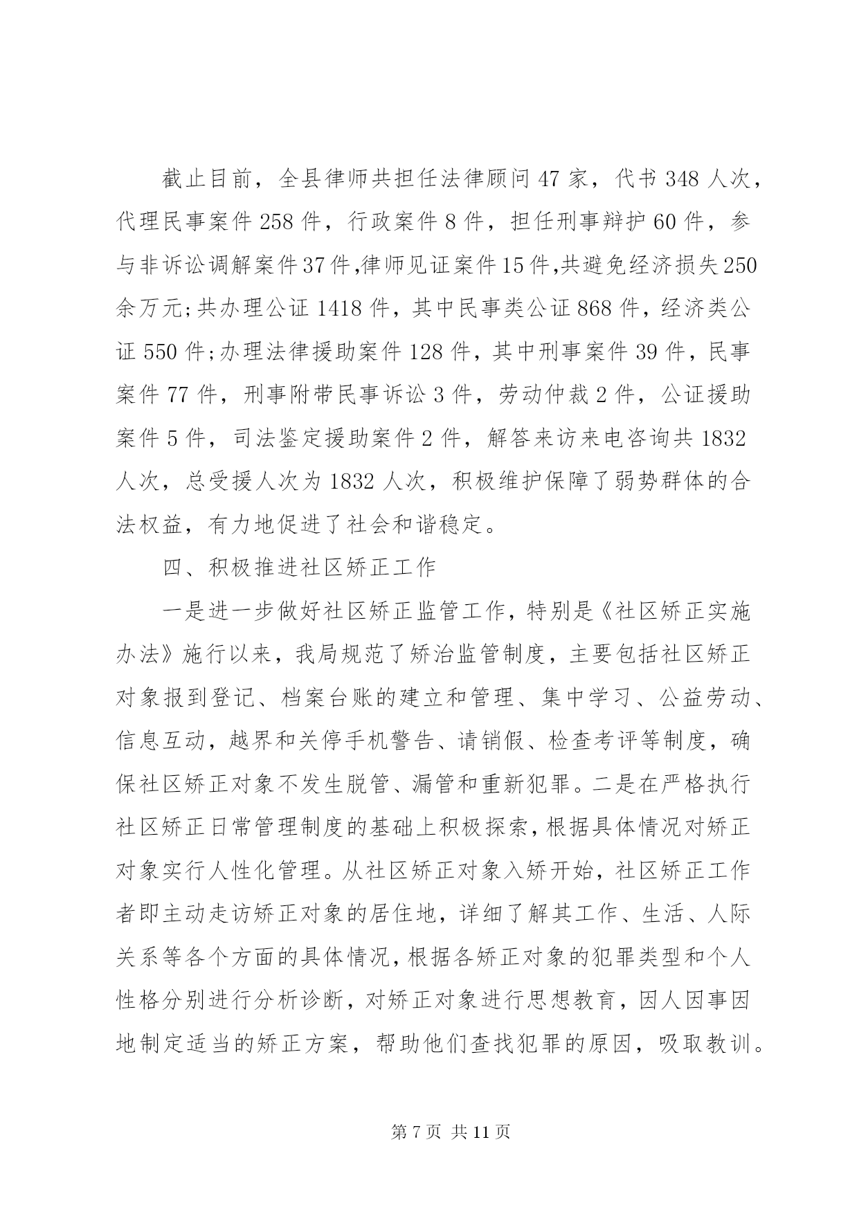 第PAGE\*Arabic\*MERGEFORMAT11页共NUMPAGES\*MERGEFORMAT11页司法局年终工作总结我县司法行政系统在县委、县政府的正确领导和市司法局的精心指导下,围绕各项任务,本着求真务实,开拓创新的工作原则,强化司法行政队伍建设,充分发挥法律保障、法律宣传和法律服务的职能作用,将司法行政工作融入到全县经济社会发展中去,为社会和谐稳定服务,为全县经济建设和精神文明建设营造良好的法律环境。一、扎实开展普法依法治理(一)认真做好"五五"普法总结表彰,全面启动"六五"普法工作认真总结并积极推广"五五"普法依法治理工作的先进经验,做好全国、全省、全市"五五"普法先进单位和先进个人的推荐表彰工作。及时召开了我县"五五"普法总结表彰暨"六五"普法规划启动工作大会,以县委县政府名义表彰了一批"五五"普法工作先进集体和先进个人。制定出台了"六五"普法规划,全面启动了"六五"普法工作。(二)加大普法宣传力度,突出法制宣传针对性和实效性,大力营造学法、守法、用法的法制环境。一是以"三下乡"活动为契机,组织普法人员深入到各乡镇、各单位利用图片展览、发放宣传资料、播放影视节目等方式开展"六五"普法启动宣传活动,让更多的群众了解我县"五五"普法所取得的成果和"六五"普法工作的要求和内容。二是利用"3.8"妇女节、"3.15"消费者权益日等节日围绕"推进法治建设,共建美好家园"主题,结合农村关注的热点难点问题,组织开展了形式多样、内容丰富、针对性强的"节日送法进农户活动周"系列普法宣传活动,进一步推动了我县农村居民的学法用法,切实提高了农村居民法律素质。三是组织法制讲师团在全县16所学校开展以"争做文明使者,弘扬法制精神,共建和谐开江"为主题的法律、安全知识进校园活动。据统计今年来全县在各类法制宣传活动中,共制作法制宣传横幅300余幅,标语1000余条,办理黑板报、专栏共计820余板,印发了16万余份30余种宣传各项法律法规的法制宣传资料,接待群众法律、法规咨询1000余人次,发送法律、法规资料12万余份,出动宣传车宣传近百台(次),法制文艺演出14场次,为中小学上法制课20次,广播、电视宣传50次,受教育群众达30万余人次。(三)围绕增强法治意识和法律素质,开展"法律六进",社会法治化管理水平取得实效。一是根据中组部、中宣部、司法部、全国普法办《关于进一步加强领导干部学法用法,提高依法执政能力的意见》和市法治办的要求,我县下发了《关于加强领导干部学法用法意见》,制定了党委(党组)中心组学法和集体学法制度,进一步规范了领导干部学法用法制度。二是党委(党组)中心学习组都按要求制定了法律法规的学习计划并认真抓好落实,使领导干部学法、用法活动得到了有效开展。三是县委组织部、人事局、县委党校等有关部门把领导干部的法制教育纳入干部教育培训的主渠道,在每次干部培训中都安排了法制培训内容,进一步推动领导干部学法用法活动的深入开展。四是加大青少年的法制宣传教育。与县教育局进行了认真磋商根据人员变动情况及时调整充实了各中小学法制副校长,同时要求各中小学继续认真贯彻法制教育"四落实",结合中小学生心理特点开展多种形式的法制教育活动。五是结合普法依法治理结对帮扶、"民主法治示范村"创建、"千名干部下基层"、矛盾纠纷排查调处等工作,各单位和各乡镇开展了大规模的送法进乡村、进社区和进家庭活动。着重帮助各村(社区)继续落实完善"五个一"工程(一个法制宣传栏、一个固定的法制教育阵地、一个法律图书角、一支法制宣传教育骨干队伍、每户一个法律明白人),开展"五到户"活动(普法骨干包到户、法制资料送到户、法律服务便民卡发到户、矛盾纠纷调到户、法律服务帮到户),把常用法律法规和群众生产生活密切相关的法律法规知识送到广大居民农户手中,进一步增强居民农户的法律意识。六是加强企业经营管理人员的法制宣传教育。以法制宣传月、周、日活动为契机深入各企业、厂矿开展法制宣传教育,重点加强企业法律法规、安全生产、诚实守信、维护职工权益等方面的法律法规;七是加强农民法制宣传教育。在对农民普法过程中,县法治办有针对性地开展农村法制宣传教育,采取在普法中调解纠纷,在调解纠纷中普法的办法,对排查出的家庭纠纷、土地纠纷、山林纠纷、婚姻纠纷等突出问题逐一进行实地调解,邀请当地群众、特别是当地村干部、党员及各家各户当家人参与,对广大群众进行《土地法》、《治安管理处罚法》、《婚姻法》等与群众生产生活息息相关的法律法规教育,让群众在调解中受到教育,在教育中解决问题。(四)强化措施,深入推进法治县创建工作进程一是健全制度,全面树立"法治"意识。通过建立健全制度化建设将各项工作落到实处,建立了较完整的规章制度,把各项工作限定在规章制度的框架下操作运行,避免领导"一言堂"和"家长制