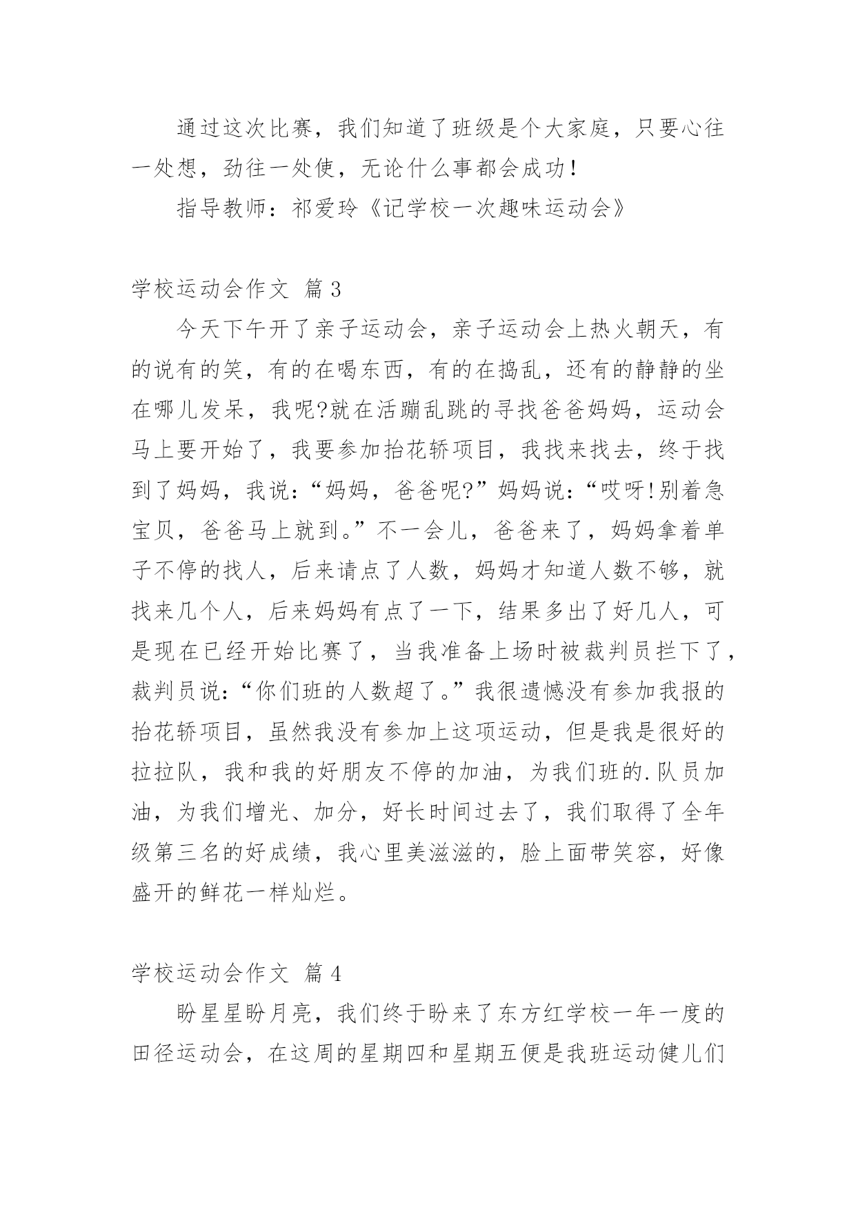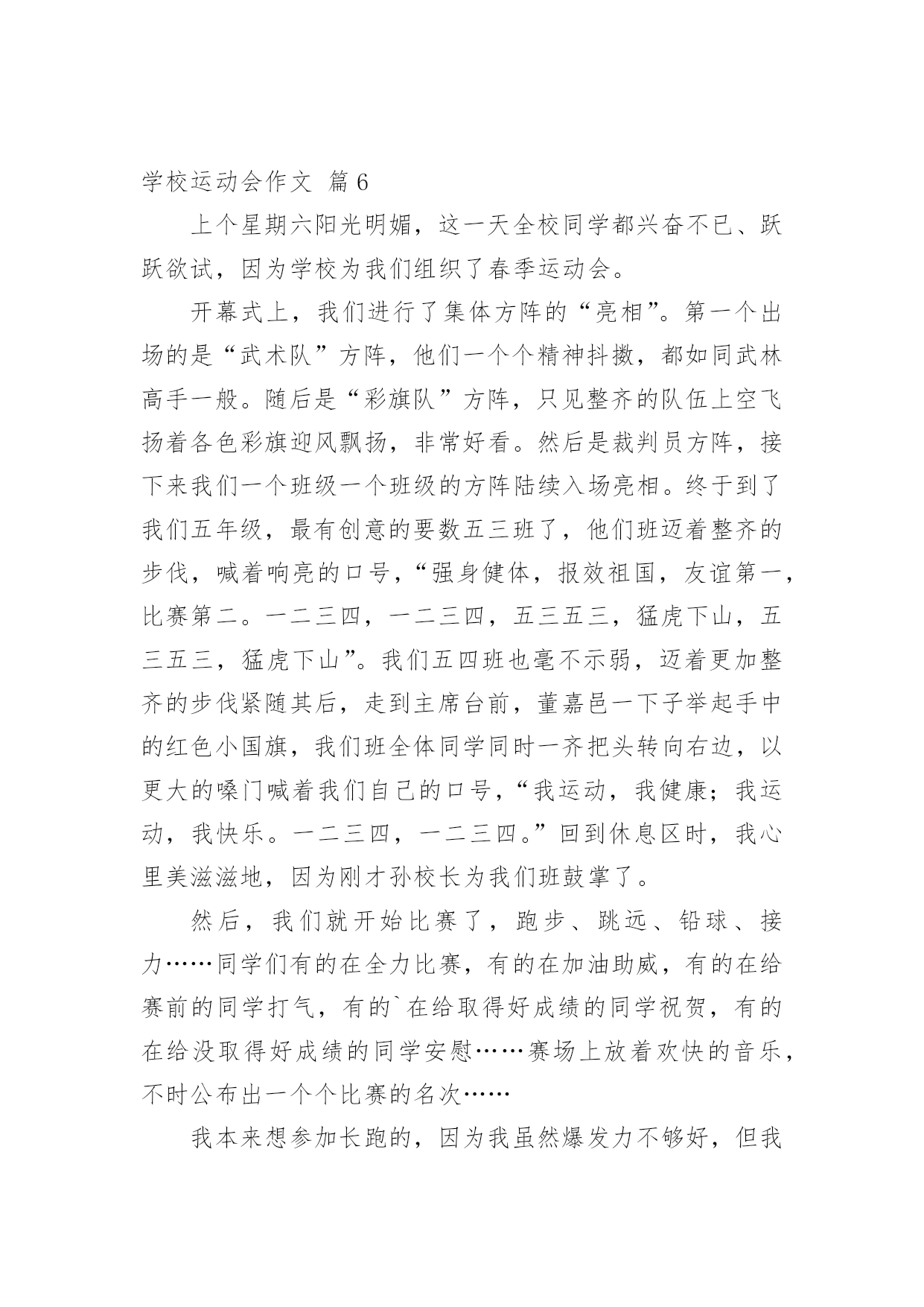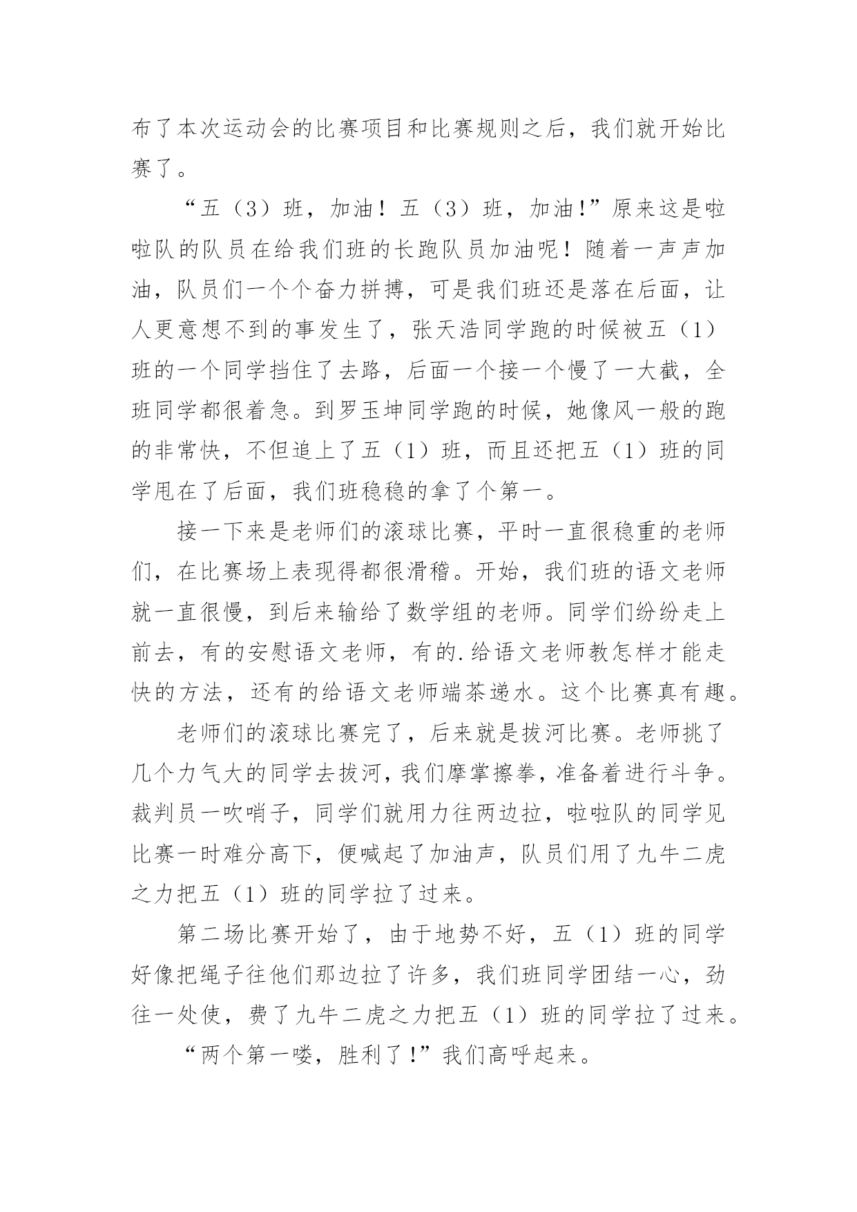学校运动会作文实用的学校运动会作文在平日的学习、工作和生活里,大家对作文都再熟悉不过了吧,作文一定要做到主题集中,围绕同一主题作深入阐述,切忌东拉西扯,主题涣散甚至无主题。怎么写作文才能避免踩雷呢?以下是小编为大家整理的学校运动会作文7篇,供大家参考借鉴,希望可以帮助到有需要的朋友。学校运动会作文篇1我们盼星星,盼月亮,终于盼来了一年一度的趣味运动会。为什么不直呼“运动会”,而是叫“趣味运动会”呢?你们先别急,且听我慢慢道来。不一会儿,运动会开始了,经过了开幕式,令人跃跃欲试的比赛也向我们迎来,第一个比赛项目是跳绳跑接力。“砰”的一声枪响,同学们如离弦的箭般“飞”离了起跑点,脚像燕子点水似的,刚着地又离开了地面。绳子在脚下一闪而过,几乎分辨不清。在这其中最快的就数唐海荣了,只见她如同一只出笼的小鸟,脚下生风,绳舞飞扬。“加油!加油!”拉拉队早已按捺不住了。加油声、喝彩声在操场上回荡……运动会还有一个令我难忘的比赛项目——呼啦圈接力。我也是其中参赛的一名运动员,此时此刻我的心中真是“十五个吊桶打水——七上八下”。一下子就轮到了我们四个班的.激烈比赛,我的心仿佛悬到了嗓子眼,因为我们班已经在几个接力比赛中输给了别的班,如果这次再输,那可就……“嘘——”还没等我想完,随着一声哨响,比赛开始了,只见汪星宇同学如同发射的火箭,“嗖。”的一下便遥遥领先,尽管如此,但由于有像张涵熙这样的笨拙分子在,我们班最后还是败北了,这让我知道了团结力量大。这次的运动会不仅有充满趣味的袋鼠跳、推小车等的种种活动,还有一个最精彩的拔河比赛。比赛在我们的兴奋、激动与紧张中开始了,“四(2)班加油!四(2)班加油!”随着拉拉队的加油声,我们都用着九牛二虎之力拔着,最卖力的当然就是我们班的“重量级秘密武器”王铭硕,瞧!他那拼命三郎的架势,在气势上我想我们已经比过别的班了。大家竭尽全力用力拔着,使出了全身吃奶的力气,大干一场后,你们猜花落谁家?呵呵,不卖关子了!拔河比赛的冠军本来就是非我们莫属的。经过这个趣味运动会后,我们每个人脸上都写满了快乐,尽管我们在整个运动会中只得了第三名。学校运动会作文篇2星期四,我们学校开了趣味运动会,可有趣了,要不怎么会叫趣味运动会呢!不信,那就跟我一起重温一下运动会上比赛的趣味吧!首先举行的是本次运动会的开幕典礼,典礼上,校长宣布了本次运动会的比赛项目和比赛规则之后,我们就开始比赛了。“五(3)班,加油!五(3)班,加油!”原来这是啦啦队的队员在给我们班的长跑队员加油呢!随着一声声加油,队员们一个个奋力拼搏,可是我们班还是落在后面,让人更意想不到的事发生了,张天浩同学跑的时候被五(1)班的一个同学挡住了去路,后面一个接一个慢了一大截,全班同学都很着急。到罗玉坤同学跑的时候,她像风一般的跑的非常快,不但追上了五(1)班,而且还把五(1)班的同学甩在了后面,我们班稳稳的拿了个第一。接一下来是老师们的滚球比赛,平时一直很稳重的老师们,在比赛场上表现得都很滑稽。开始,我们班的语文老师就一直很慢,到后来输给了数学组的老师。同学们纷纷走上前去,有的安慰语文老师,有的.给语文老师教怎样才能走快的方法,还有的给语文老师端茶递水。这个比赛真有趣。老师们的滚球比赛完了,后来就是拔河比赛。老师挑了几个力气大的同学去拔河,我们摩掌擦拳,准备着进行斗争。裁判员一吹哨子,同学们就用力往两边拉,啦啦队的同学见比赛一时难分高下,便喊起了加油声,队员们用了九牛二虎之力把五(1)班的同学拉了过来。第二场比赛开始了,由于地势不好,五(1)班的同学好像把绳子往他们那边拉了许多,我们班同学团结一心,劲往一处使,费了九牛二虎之力把五(1)班的同学拉了过来。“两个第一喽,胜利了!”我们高呼起来。通过这次比赛,我们知道了班级是个大家庭,只要心往一处想,劲往一处使,无论什么事都会成功!指导教师:祁爱玲《记学校一次趣味运动会》学校运动会作文篇3今天下午开了亲子运动会,亲子运动会上热火朝天,有的说有的笑,有的在喝东西,有的在捣乱,还有的静静的坐在哪儿发呆,我呢?就在活蹦乱跳的寻找爸爸妈妈,运动会马上要开始了,我要参加抬花轿项目,我找来找去,终于找到了妈妈,我说:“妈妈,爸爸呢?”妈妈说:“哎呀!别着急宝贝,爸爸马上就到。”不一会儿,爸爸来了,妈妈拿着单子不停的找人,后来请点了人数,妈妈才知道人数不够,就找来几个人,后来妈妈有点了一下,结果多出了好几人,可是现在已经开始比赛了,当我准备上场时被裁判员拦下了,裁判员说:“你们班的人数超了。”我很遗憾没有参加我报的抬花轿项目,虽然我没有参加上这项运动,但是我是很好的拉拉队,我和我的好朋友不停的加油,为我们班的.队员加油,为我们增光、加分,好长时间过去了,我们取得了全年级第三名的好成绩,我心里美滋滋的,脸上面带笑容,好像盛开的鲜花一样灿烂。