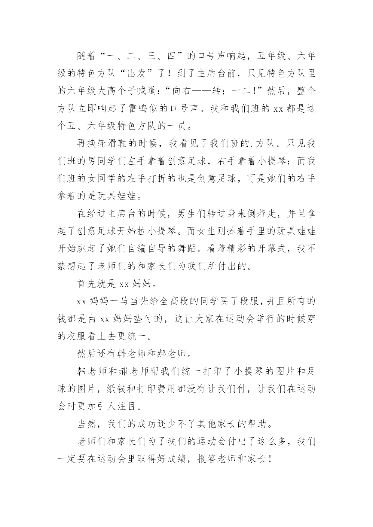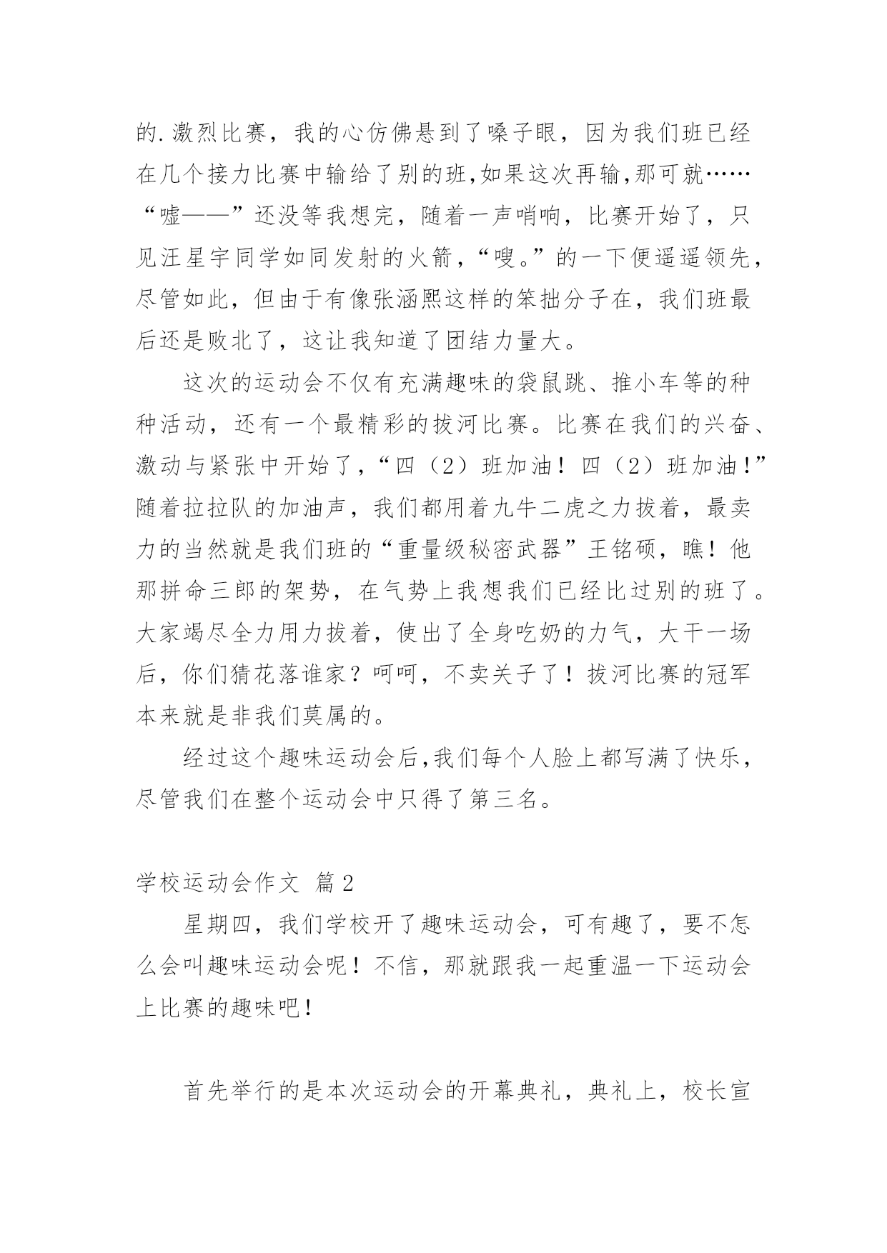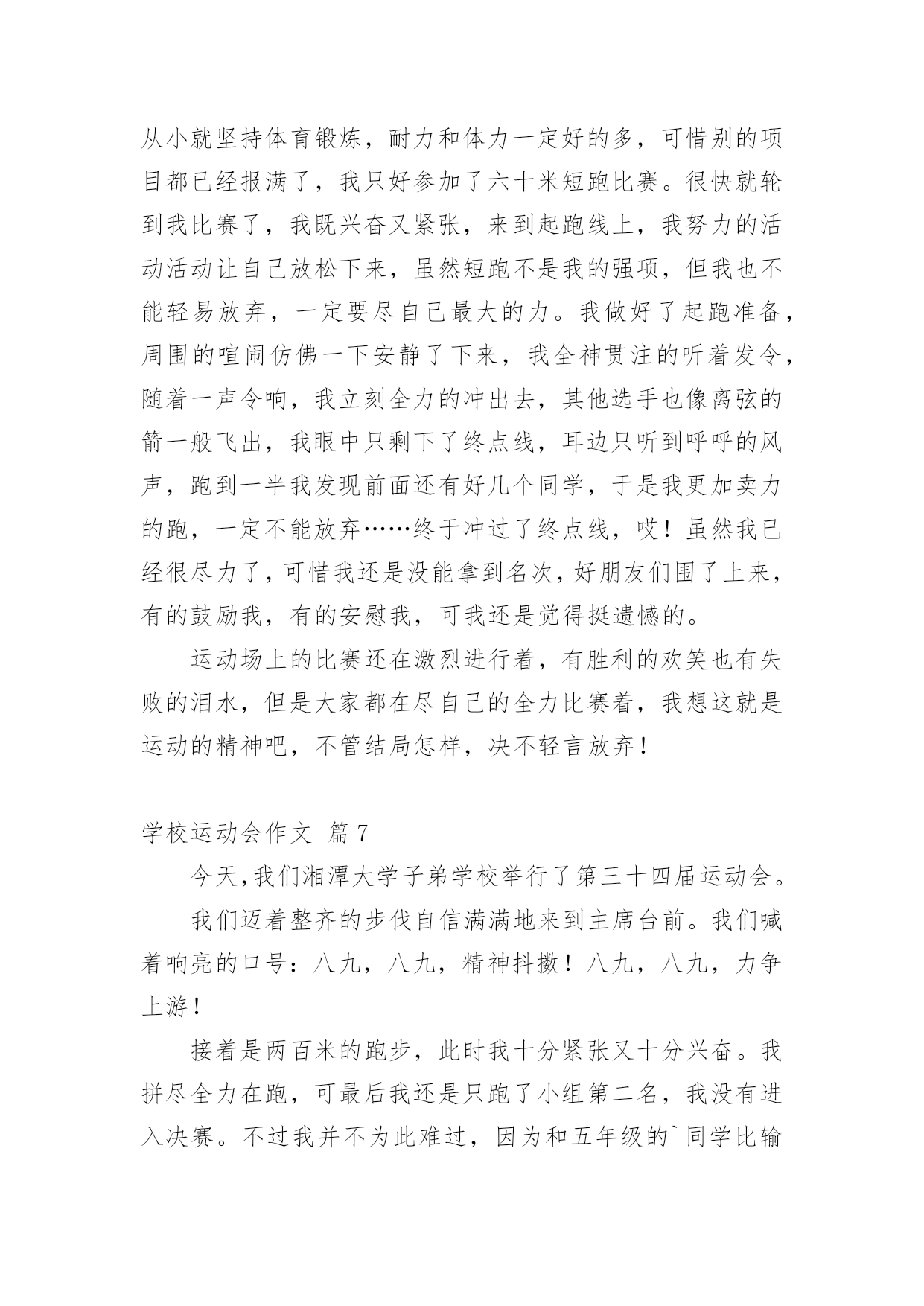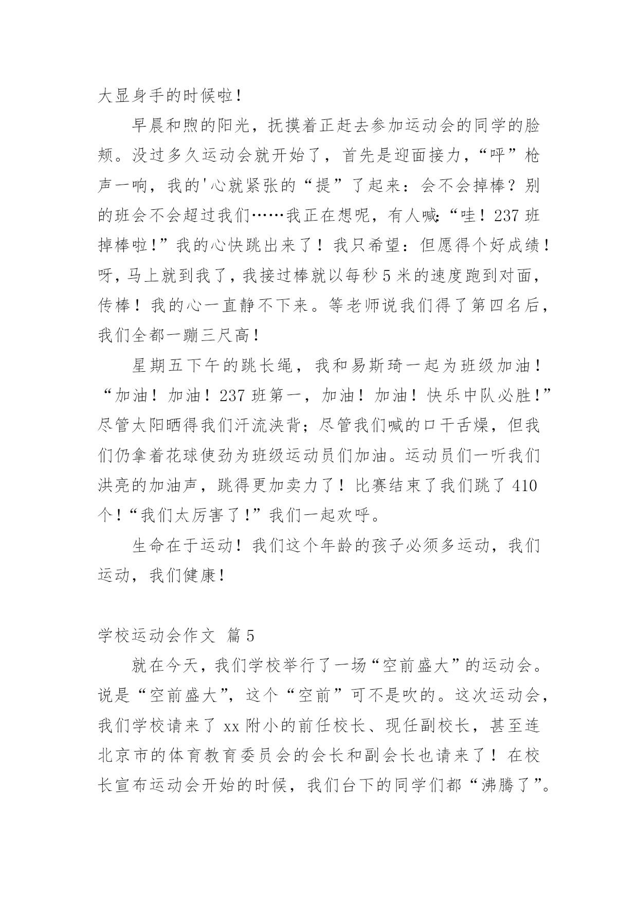 学校运动会作文实用的学校运动会作文在平日的学习、工作和生活里,大家对作文都再熟悉不过了吧,作文一定要做到主题集中,围绕同一主题作深入阐述,切忌东拉西扯,主题涣散甚至无主题。怎么写作文才能避免踩雷呢?以下是小编为大家整理的学校运动会作文7篇,供大家参考借鉴,希望可以帮助到有需要的朋友。学校运动会作文篇1我们盼星星,盼月亮,终于盼来了一年一度的趣味运动会。为什么不直呼“运动会”,而是叫“趣味运动会”呢?你们先别急,且听我慢慢道来。不一会儿,运动会开始了,经过了开幕式,令人跃跃欲试的比赛也向我们迎来,第一个比赛项目是跳绳跑接力。“砰”的一声枪响,同学们如离弦的箭般“飞”离了起跑点,脚像燕子点水似的,刚着地又离开了地面。绳子在脚下一闪而过,几乎分辨不清。在这其中最快的就数唐海荣了,只见她如同一只出笼的小鸟,脚下生风,绳舞飞扬。“加油!加油!”拉拉队早已按捺不住了。加油声、喝彩声在操场上回荡……运动会还有一个令我难忘的比赛项目——呼啦圈接力。我也是其中参赛的一名运动员,此时此刻我的心中真是“十五个吊桶打水——七上八下”。一下子就轮到了我们四个班的.激烈比赛,我的心仿佛悬到了嗓子眼,因为我们班已经在几个接力比赛中输给了别的班,如果这次再输,那可就……“嘘——”还没等我想完,随着一声哨响,比赛开始了,只见汪星宇同学如同发射的火箭,“嗖。”的一下便遥遥领先,尽管如此,但由于有像张涵熙这样的笨拙分子在,我们班最后还是败北了,这让我知道了团结力量大。这次的运动会不仅有充满趣味的袋鼠跳、推小车等的种种活动,还有一个最精彩的拔河比赛。比赛在我们的兴奋、激动与紧张中开始了,“四(2)班加油!四(2)班加油!”随着拉拉队的加油声,我们都用着九牛二虎之力拔着,最卖力的当然就是我们班的“重量级秘密武器”王铭硕,瞧!他那拼命三郎的架势,在气势上我想我们已经比过别的班了。大家竭尽全力用力拔着,使出了全身吃奶的力气,大干一场后,你们猜花落谁家?呵呵,不卖关子了!拔河比赛的冠军本来就是非我们莫属的。经过这个趣味运动会后,我们每个人脸上都写满了快乐,尽管我们在整个运动会中只得了第三名。学校运动会作文篇2星期四,我们学校开了趣味运动会,可有趣了,要不怎么会叫趣味运动会呢!不信,那就跟我一起重温一下运动会上比赛的趣味吧!首先举行的是本次运动会的开幕典礼,典礼上,校长宣布了本次运动会的比赛项目和比赛规则之后,我们就开始比赛了。“五(3)班,加油!五(3)班,加油!”原来这是啦啦队的队员在给我们班的长跑队员加油呢!随着一声声加油,队员们一个个奋力拼搏,可是我们班还是落在后面,让人更意想不到的事发生了,张天浩同学跑的时候被五(1)班的一个同学挡住了去路,后面一个接一个慢了一大截,全班同学都很着急。到罗玉坤同学跑的时候,她像风一般的跑的非常快,不但追上了五(1)班,而且还把五(1)班的同学甩在了后面,我们班稳稳的拿了个第一。接一下来是老师们的滚球比赛,平时一直很稳重的老师们,在比赛场上表现得都很滑稽。开始,我们班的语文老师就一直很慢,到后来输给了数学组的老师。同学们纷纷走上前去,有的安慰语文老师,有的.给语文老师教怎样才能走快的方法,还有的给语文老师端茶递水。这个比赛真有趣。老师们的滚球比赛完了,后来就是拔河比赛。老师挑了几个力气大的同学去拔河,我们摩掌擦拳,准备着进行斗争。裁判员一吹哨子,同学们就用力往两边拉,啦啦队的同学见比赛一时难分高下,便喊起了加油声,队员们用了九牛二虎之力把五(1)班的同学拉了过来。第二场比赛开始了,由于地势不好,五(1)班的同学好像把绳子往他们那边拉了许多,我们班同学团结一心,劲往一处使,费了九牛二虎之力把五(1)班的同学拉了过来。“两个第一喽,胜利了!”我们高呼起来。通过这次比赛,我们知道了班级是个大家庭,只要心往一处想,劲往一处使,无论什么事都会成功!指导教师:祁爱玲《记学校一次趣味运动会》学校运动会作文篇3今天下午开了亲子运动会,亲子运动会上热火朝天,有的说有的笑,有的在喝东西,有的在捣乱,还有的静静的坐在哪儿发呆,我呢?就在活蹦乱跳的寻找爸爸妈妈,运动会马上要开始了,我要参加抬花轿项目,我找来找去,终于找到了妈妈,我说:“妈妈,爸爸呢?”妈妈说:“哎呀!别着急宝贝,爸爸马上就到。”不一会儿,爸爸来了,妈妈拿着单子不停的找人,后来请点了人数,妈妈才知道人数不够,就找来几个人,后来妈妈有点了一下,结果多出了好几人,可是现在已经开始比赛了,当我准备上场时被裁判员拦下了,裁判员说:“你们班的人数超了。”我很遗憾没有参加我报的抬花轿项目,虽然我没有参加上这项运动,但是我是很好的拉拉队,我和我的好朋友不停的加油,为我们班的.队员加油,为我们增光、加分,好长时间过去了,我们取得了全年级第三名的好成绩,我心里美滋滋的,脸上面带笑容,好像盛开的鲜花一样灿烂。