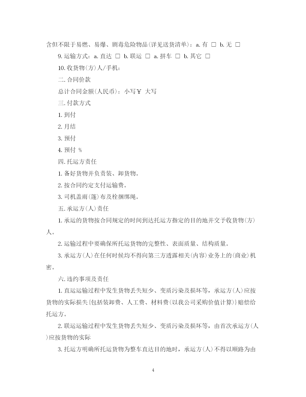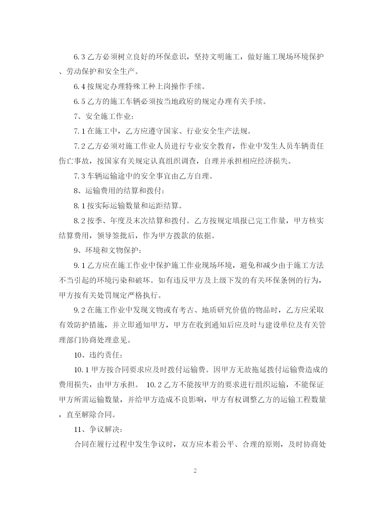 此资料由网络收集而来,如有侵权请告知上传者立即删除。资料共分享,我们负责传递知识。PAGEPAGE6机械运输合同随着煤炭工业的发展,机械化水平的不断提高,大功率,大运量机械运输设备的不断出现,签订机械运输合同需要注意什么呢?以下是范文网小编为大家整理的机械运输合同范文,欢迎参考阅读。机械运输合同范文1雇用方(甲方):劳务方(乙方):根据《中华人民共和国合同法》及有关法律法规,按照具体情况经双方协商一致,签订本劳务用工协议,双方共同遵守执行。1、机械运输项目:土方运输2、工作内容:甲方负责土方施工的测量放线、施工检查、推、平、碾、压、整修达标,乙方根据甲方指定的地点,实施土方的挖、装、运输到施工地点。3、工期:4、运输费用:4.1运输单价:挖方:3元/方,运输:1.1元/方.公里。4.2运输费用结算:数量按乙方实际完成数量,运距按甲方测定的实际运距为准。5、甲方责任5.1按本合同约定办理结算手续,及时支付土方运输费用。5.2监督乙方对劳务人员的持证上岗、培训、考核、待遇等的实施。6、乙方责任:6.1乙方必须按甲方编制的施工组织工期要求,及时组织满足所需的运输机械设备,按双方约定的时间完成土方运输任务。6.2乙方必须确保进场机械设备状况和施工人员的身体状况、相应的业务素质,满足相关工作的要求。施工机械设备必须稳定,调动更换必须经甲方同意。6.3乙方必须树立良好的环保意识,坚持文明施工,做好施工现场环境保护、劳动保护和安全生产。6.4按规定办理特殊工种上岗操作手续。6.5乙方的施工车辆必须按当地政府的规定办理有关手续。7、安全施工作业:7.1在施工中,乙方应遵守国家、行业安全生产法规。7.2乙方必须对施工作业人员进行专业安全教育,作业中发生人员车辆责任伤亡事故,按国家有关规定认真组织调查,自理并承担相应经济损失。7.3车辆运输途中的安全事宜由乙方自理。8、运输费用的结算和拨付:8.1按实际运输数量和运距结算。8.2按季、年度及末次结算和拨付。乙方按规定填报已完工作量,甲方核实结算费用,领导签批后,作为甲方拨款的依据。9、环境和文物保护:9.1乙方应在施工作业中保护施工作业现场环境,避免和减少由于施工方法不当引起的环境污染和破坏。如有违反甲方及上级下发的有关环保条例的行为,甲方按有关处罚规定严格执行。9.2在施工作业中发现文物或有考古、地质研究价值的物品时,乙方应采取有效防护措施,并立即通知甲方,甲方在收到通知后应及时与建设单位及有关管理部门协商处理意见。10、违约责任:10.1甲方按合同要求应及时拨付运输费。因甲方无故拖延拨付运输费造成的费用损失,由甲方承担。10.2乙方不能按甲方的要求进行组织运输,不能保证甲方所需运输数量,并给甲方造成不良影响,甲方有权调整乙方的运输工程数量,直至解除合同。11、争议解决:合同在履行过程中发生争议时,双方应本着公平、合理的原则,及时协商处理。协商不成的,由双方约定仲裁或约定通过诉讼解决。12合同产生与终止:本合同自甲、乙双方鉴章之日起生效,工完帐清后自动失效。13、补充协议:在合同执行中情况变化时,甲乙双方可以签订补充协议,补充协议与原合同具有同等的法律效力。14、其它双方驻工地代表:甲方:乙方:15、合同份数:本合同正本二份,由甲、乙双方各持一份,副本六份,甲、乙双方各执三份。甲方(公章):_________乙方(公章):_________法定代表人(签字):_________法定代表人(签字):__________________年____月____日_________年____月____日机械运输合同范文2依照《中华人民共和国合同法》及其它有关法律法规,遵循平等、自愿和诚信务实的原则,就货物运输协商一致订立本合同供双方遵照执行。一.运输概况1.托运方:承运方(人):2.起运日期:到达日期:3.货物起运地点:4.货物到达地点:5.运输里程共计约(参照谷歌地图;单位:公里)6.协议装载体积(单位:米)7.协议装载净重质量(可以不填或装货物前承运方可派员预估单位:吨):8.含但不限于易燃、易爆、剧毒危险物品(详见送货清单):a.有□b.无□9.运输方式:a.直达□b.联运□a.拼车□b.其它□10.收货物(方)人/手机:二.合同价款总计合同金额(人民币):小写¥大写三.付款方式1.到付2.月结3.预付4.预付%四.托运方责任1.备好货物并负责装、卸货物。2.按合同约定支付运输费。3.司机盖雨(篷)布及栓捆绑绳。五.承运方(人)责任1.承运的货物按合同规定的时间到达托运方指定的目的地并交予收货物(方)人。2.运输过程中要确保所托运货物