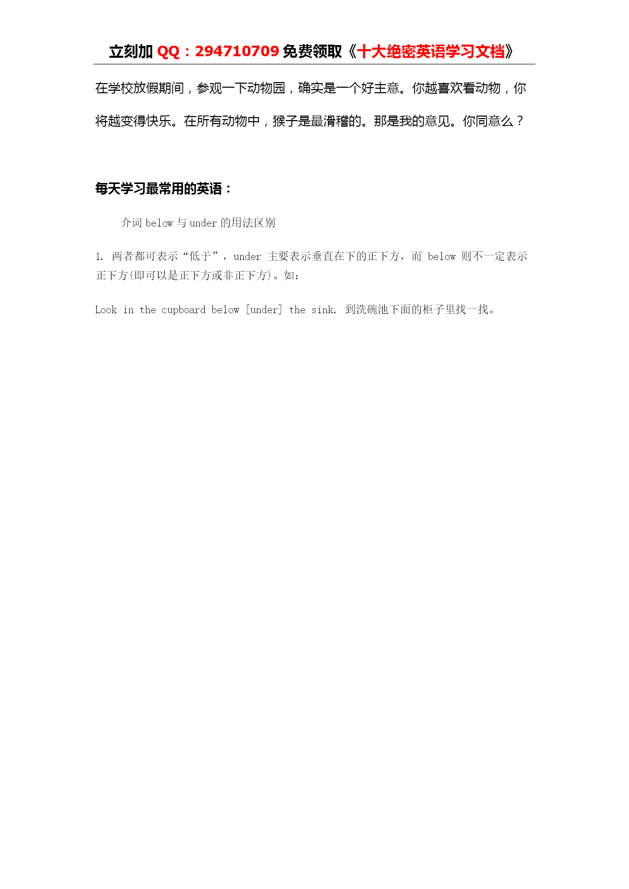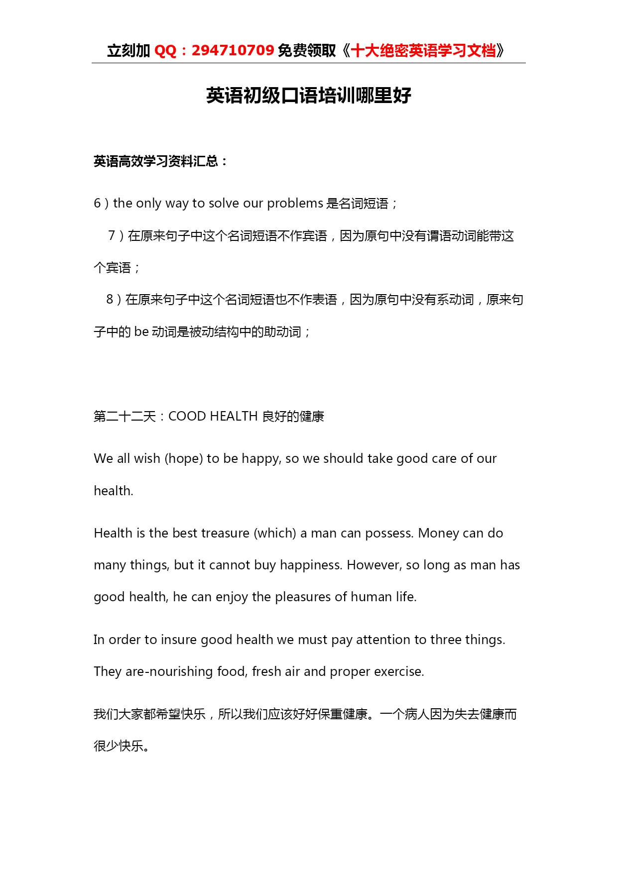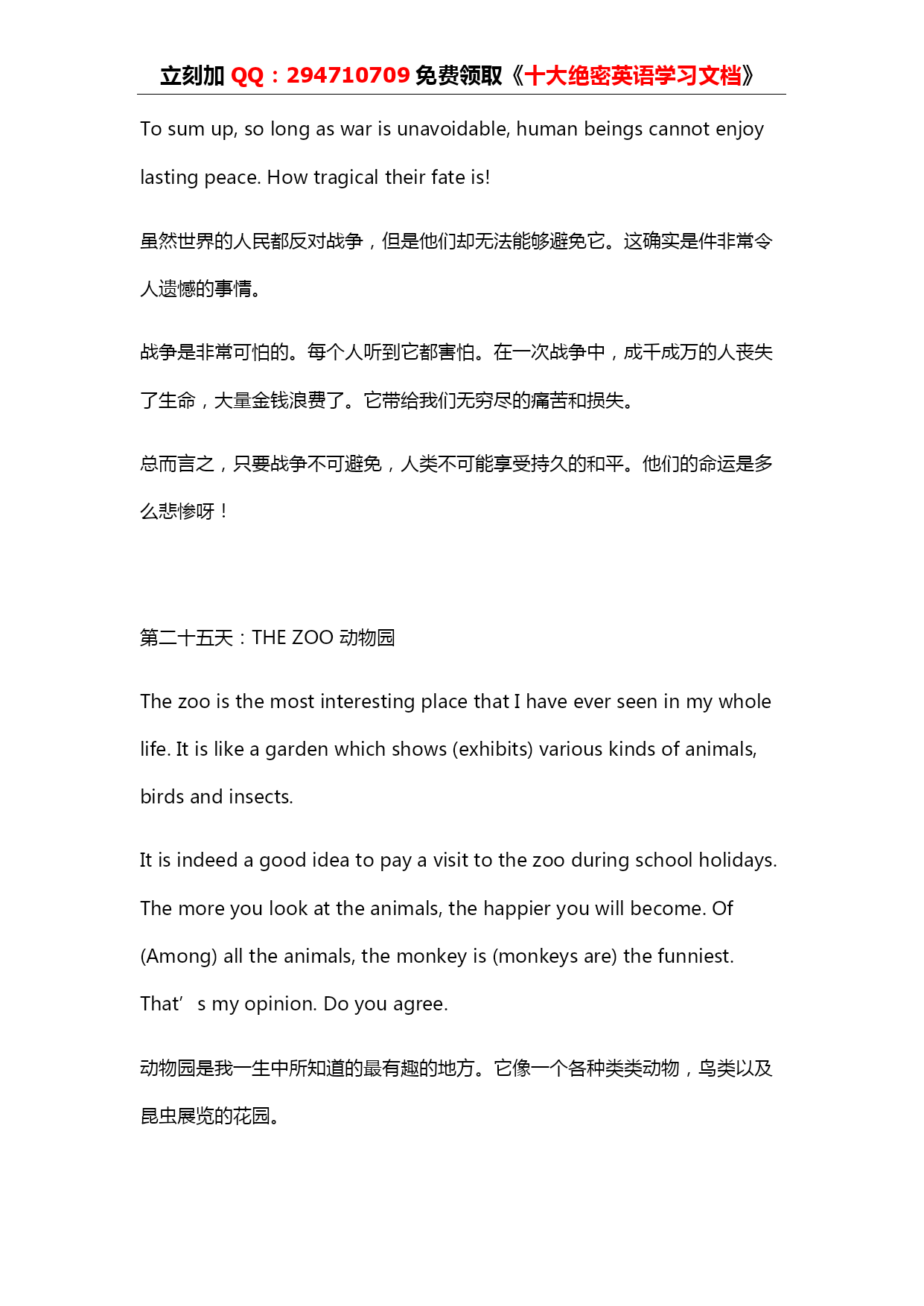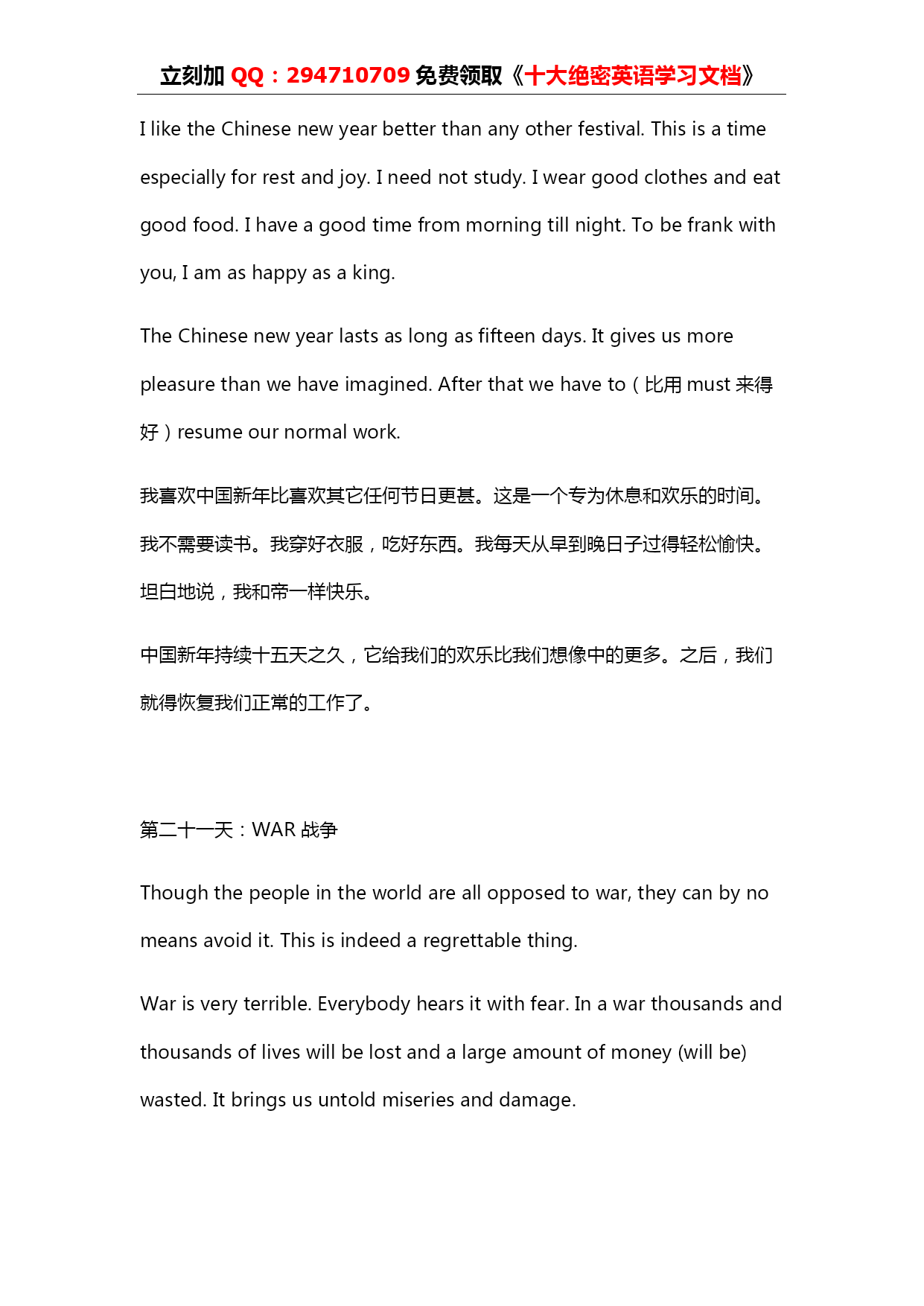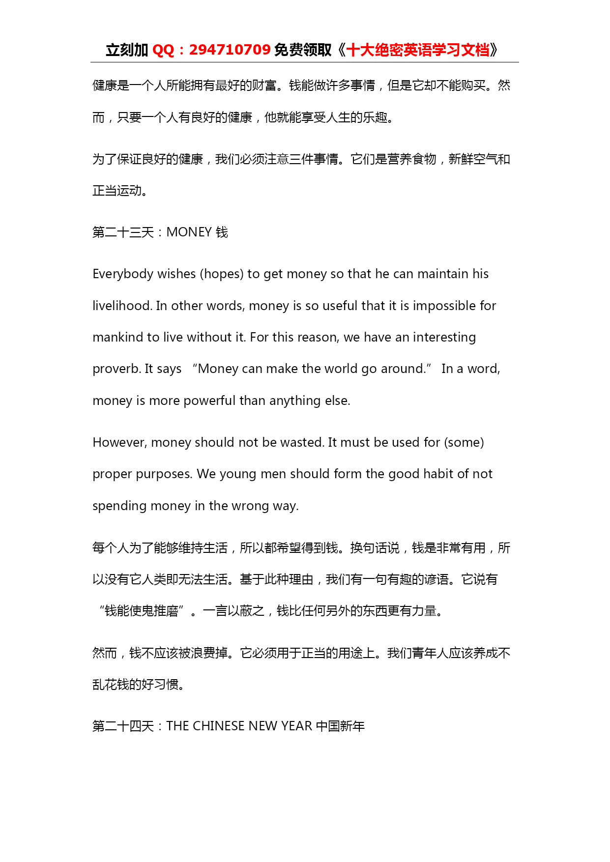 立刻加QQ:294710709免费领取《十大绝密英语学习文档》英语初级口语培训哪里好英语高效学习资料汇总:6)theonlywaytosolveourproblems是名词短语;7)在原来句子中这个名词短语不作宾语,因为原句中没有谓语动词能带这个宾语;8)在原来句子中这个名词短语也不作表语,因为原句中没有系动词,原来句子中的be动词是被动结构中的助动词;第二十二天:COODHEALTH良好的健康Weallwish(hope)tobehappy,soweshouldtakegoodcareofourhealth.Healthisthebesttreasure(which)amancanpossess.Moneycandomanythings,butitcannotbuyhappiness.However,solongasmanhasgoodhealth,hecanenjoythepleasuresofhumanlife.Inordertoinsuregoodhealthwemustpayattentiontothreethings.Theyare-nourishingfood,freshairandproperexercise.我们大家都希望快乐,所以我们应该好好保重健康。一个病人因为失去健康而很少快乐。健康是一个人所能拥有最好的财富。钱能做许多事情,但是它却不能购买。然而,只要一个人有良好的健康,他就能享受人生的乐趣。为了保证良好的健康,我们必须注意三件事情。它们是营养食物,新鲜空气和正当运动。第二十三天:MONEY钱Everybodywishes(hopes)togetmoneysothathecanmaintainhislivelihood.Inotherwords,moneyissousefulthatitisimpossibleformankindtolivewithoutit.Forthisreason,wehaveaninterestingproverb.Itsays“Moneycanmaketheworldgoaround.”Inaword,moneyismorepowerfulthananythingelse.However,moneyshouldnotbewasted.Itmustbeusedfor(some)properpurposes.Weyoungmenshouldformthegoodhabitofnotspendingmoneyinthewrongway.每个人为了能够维持生活,所以都希望得到钱。换句话说,钱是非常有用,所以没有它人类即无法生活。基于此种理由,我们有一句有趣的谚语。它说有“钱能使鬼推磨”。一言以蔽之,钱比任何另外的东西更有力量。然而,钱不应该被浪费掉。它必须用于正当的用途上。我们青年人应该养成不乱花钱的好习惯。第二十四天:THECHINESENEWYEAR中国新年IliketheChinesenewyearbetterthananyotherfestival.Thisisatimeespeciallyforrestandjoy.Ineednotstudy.Iweargoodclothesandeatgoodfood.Ihaveagoodtimefrommorningtillnight.Tobefrankwithyou,Iamashappyasaking.TheChinesenewyearlastsaslongasfifteendays.Itgivesusmorepleasurethanwehaveimagined.Afterthatwehaveto(比用must来得好)resumeournormalwork.我喜欢中国新年比喜欢其它任何节日更甚。这是一个专为休息和欢乐的时间。我不需要读书。我穿好衣服,吃好东西。我每天从早到晚日子过得轻松愉快。坦白地说,我和帝一样快乐。中国新年持续十五天之久,它给我们的欢乐比我们想像中的更多。之后,我们就得恢复我们正常的工作了。第二十一天:WAR战争Thoughthepeopleintheworldareallopposedtowar,theycanbynomeansavoidit.Thisisindeedaregrettablething.Warisveryterrible.Everybodyhearsitwithfear.Inawarthousandsandthousandsofliveswillbelostandalargeamountofmoney(willbe)wasted.Itbringsusuntoldmiseriesanddamage.Tosumup,solongaswarisuna