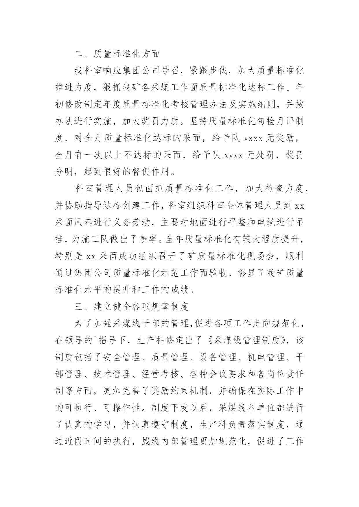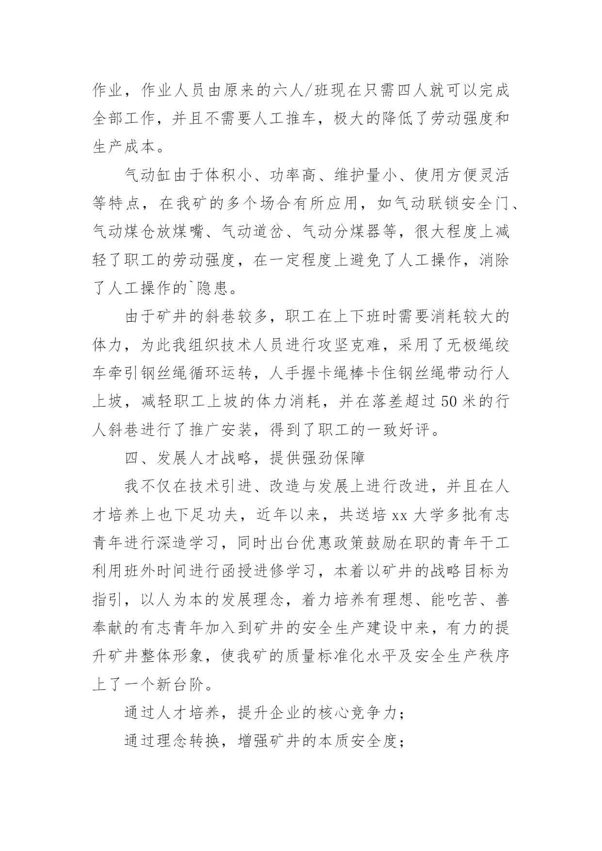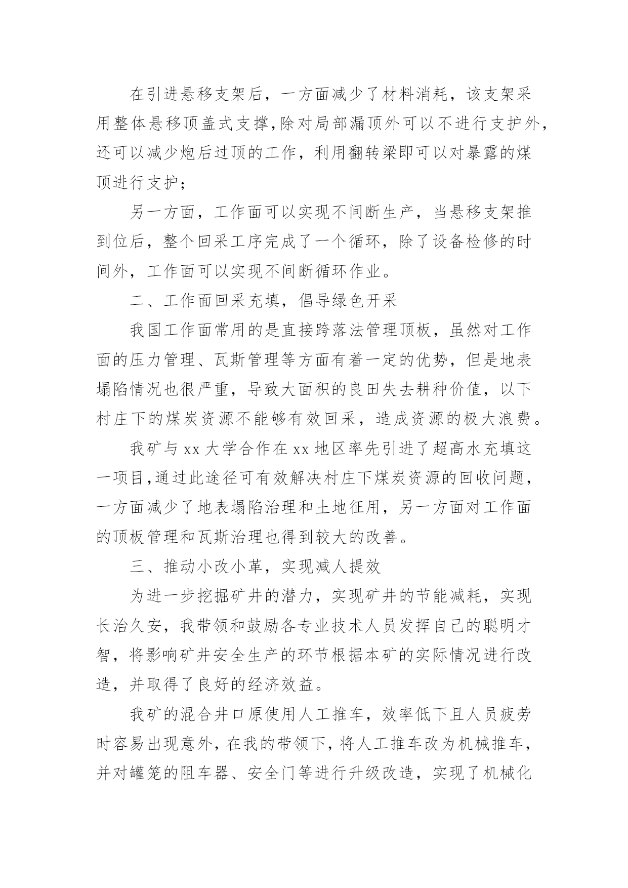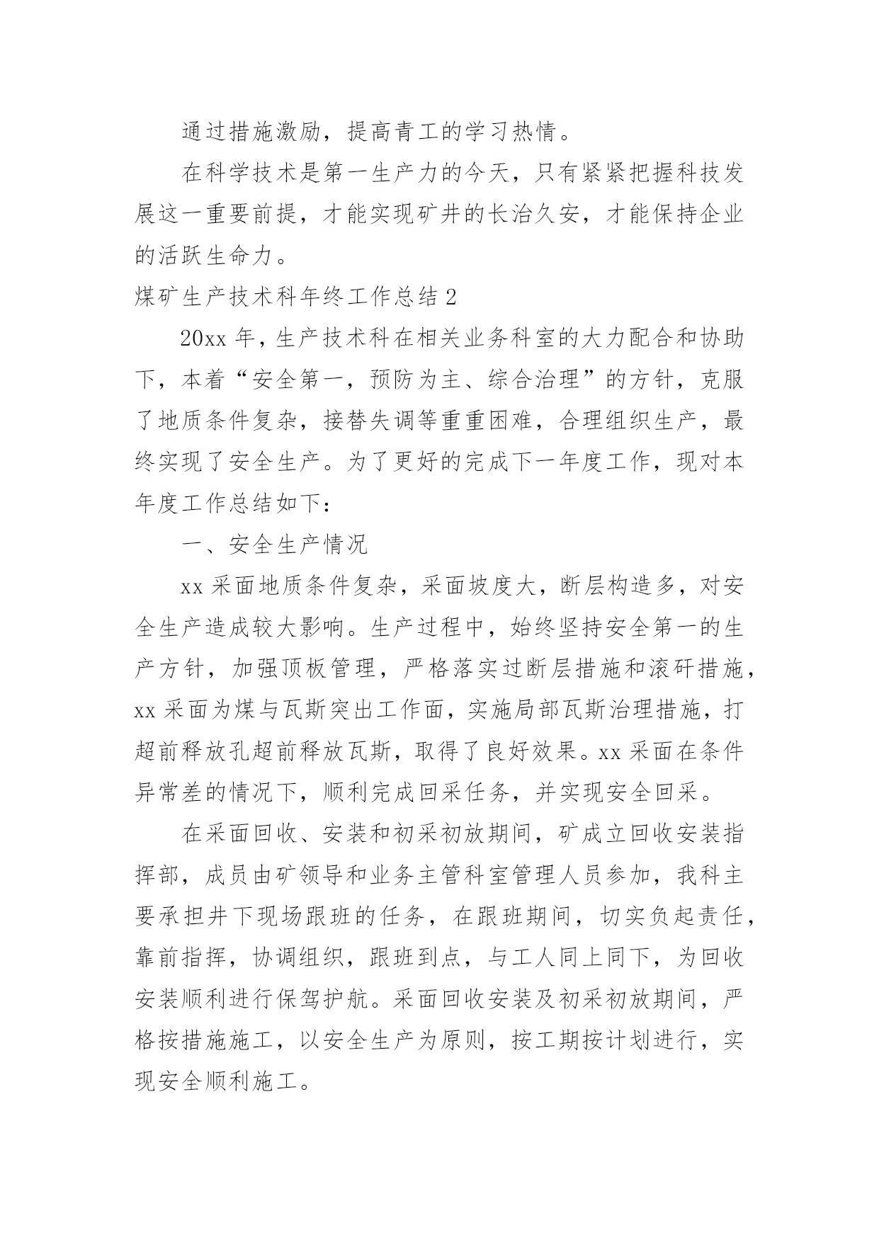 煤矿生产技术科年终工作总结煤矿生产技术科年终工作总结总结是对某一阶段的工作、学习或思想中的经验或情况进行分析研究的书面材料,通过它可以正确认识以往学习和工作中的优缺点,让我们好好写一份总结吧。总结怎么写才不会千篇一律呢?以下是小编为大家收集的煤矿生产技术科年终工作总结,欢迎阅读,希望大家能够喜欢。煤矿生产技术科年终工作总结1本人担任xx煤矿生产技术科负责人以来,从矿井的发展着手,切实把加快自主创新、引进科技成果作为转变矿井发展方式,加大新设备、新工艺的引入和使用力度,牢牢跟进煤矿的科技发展步伐,通过一年的发展,已初步将我矿打造成了xx地方煤矿的领军企业,成为集团的人才、科技输出基地,为集团的后继发展提供了强劲的活力,为企业的发展提供了有力基础。现将本人一年以来的科技工作总结如下:一、购进悬移支架,实现移架自动化我矿工作面主要以炮采为主,使用金属单体支柱配合铰接顶梁进行支护,使用该方法需要消耗大量的笆片、背板、扎绳等材料,且工作面在顶板较差时,还需要大量的木方进行接顶,每班次均需要进行移溜打柱等工作量,工人的劳动强度较大。在引进悬移支架后,一方面减少了材料消耗,该支架采用整体悬移顶盖式支撑,除对局部漏顶外可以不进行支护外,还可以减少炮后过顶的工作,利用翻转梁即可以对暴露的煤顶进行支护;另一方面,工作面可以实现不间断生产,当悬移支架推到位后,整个回采工序完成了一个循环,除了设备检修的时间外,工作面可以实现不间断循环作业。二、工作面回采充填,倡导绿色开采我国工作面常用的是直接跨落法管理顶板,虽然对工作面的压力管理、瓦斯管理等方面有着一定的优势,但是地表塌陷情况也很严重,导致大面积的良田失去耕种价值,以下村庄下的煤炭资源不能够有效回采,造成资源的极大浪费。我矿与xx大学合作在xx地区率先引进了超高水充填这一项目,通过此途径可有效解决村庄下煤炭资源的回收问题,一方面减少了地表塌陷治理和土地征用,另一方面对工作面的顶板管理和瓦斯治理也得到较大的改善。三、推动小改小革,实现减人提效为进一步挖掘矿井的潜力,实现矿井的节能减耗,实现长治久安,我带领和鼓励各专业技术人员发挥自己的聪明才智,将影响矿井安全生产的环节根据本矿的实际情况进行改造,并取得了良好的经济效益。我矿的混合井口原使用人工推车,效率低下且人员疲劳时容易出现意外,在我的带领下,将人工推车改为机械推车,并对罐笼的阻车器、安全门等进行升级改造,实现了机械化作业,作业人员由原来的六人/班现在只需四人就可以完成全部工作,并且不需要人工推车,极大的降低了劳动强度和生产成本。气动缸由于体积小、功率高、维护量小、使用方便灵活等特点,在我矿的多个场合有所应用,如气动联锁安全门、气动煤仓放煤嘴、气动道岔、气动分煤器等,很大程度上减轻了职工的劳动强度,在一定程度上避免了人工操作,消除了人工操作的`隐患。由于矿井的斜巷较多,职工在上下班时需要消耗较大的体力,为此我组织技术人员进行攻坚克难,采用了无极绳绞车牵引钢丝绳循环运转,人手握卡绳棒卡住钢丝绳带动行人上坡,减轻职工上坡的体力消耗,并在落差超过50米的行人斜巷进行了推广安装,得到了职工的一致好评。四、发展人才战略,提供强劲保障我不仅在技术引进、改造与发展上进行改进,并且在人才培养上也下足功夫,近年以来,共送培xx大学多批有志青年进行深造学习,同时出台优惠政策鼓励在职的青年干工利用班外时间进行函授进修学习,本着以矿井的战略目标为指引,以人为本的发展理念,着力培养有理想、能吃苦、善奉献的有志青年加入到矿井的安全生产建设中来,有力的提升矿井整体形象,使我矿的质量标准化水平及安全生产秩序上了一个新台阶。通过人才培养,提升企业的核心竞争力;通过理念转换,增强矿井的本质安全度;通过措施激励,提高青工的学习热情。在科学技术是第一生产力的今天,只有紧紧把握科技发展这一重要前提,才能实现矿井的长治久安,才能保持企业的活跃生命力。煤矿生产技术科年终工作总结220xx年,生产技术科在相关业务科室的大力配合和协助下,本着“安全第一,预防为主、综合治理”的方针,克服了地质条件复杂,接替失调等重重困难,合理组织生产,最终实现了安全生产。为了更好的完成下一年度工作,现对本年度工作总结如下:一、安全生产情况xx采面地质条件复杂,采面坡度大,断层构造多,对安全生产造成较大影响。生产过程中,始终坚持安全第一的生产方针,加强顶板管理,严格落实过断层措施和滚矸措施,xx采面为煤与瓦斯突出工作面,实施局部瓦斯治理措施,打超前释放孔超前释放瓦斯,取得了良好效果。xx采面在条件异常差的情况下,顺利完成回采任务,并实现安全回采。在采面回收、安装和初采初放期间,矿成立回收安装指挥部,成员由矿领导和业务主管科室管理人员参加,我科主要承担井下现场跟班的任务,在跟班期间,切实负起责任,靠前指挥,协调组织,