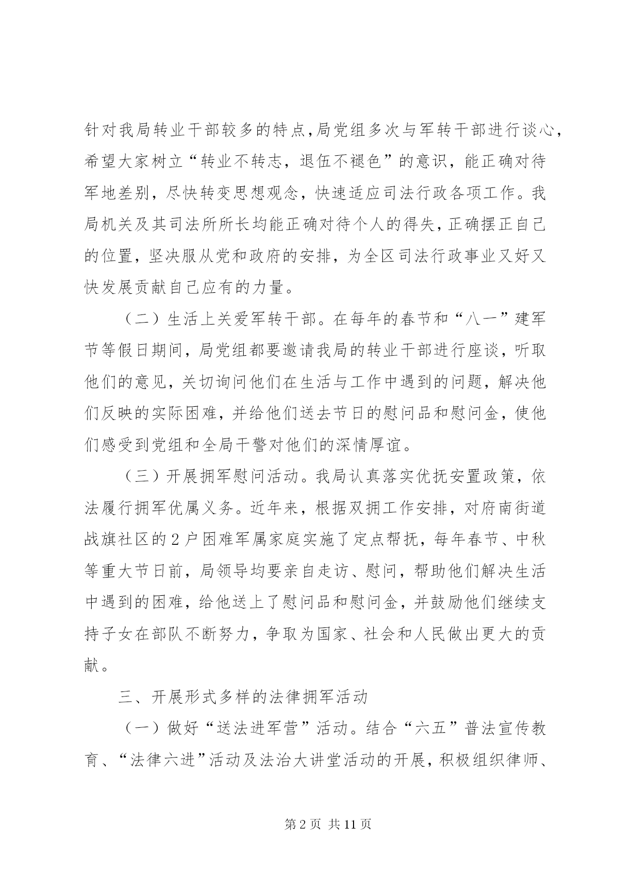 第PAGE\*Arabic\*MERGEFORMAT11页共NUMPAGES\*MERGEFORMAT11页司法局双拥工作计划精选工作计划要有集思广益的原则。要深入调查研究,广泛听取群众意见、博采众长,反对主观主义。以下是由第一pq小编为大家收集整理出来的司法局双拥工作计划,希望能够帮到大家。篇一:司法局双拥工作计划20xx年,我局在区委、区政府的领导下,按照区双拥工作领导小组办公室的要求,紧密结合司法行政工作的特点,积极开展“拥军优属、拥政爱民”活动,不断探索、创新双拥工作的新途径、新方法、新举措,拓展双拥工作的新内容、新格局、新成果,取得了显著成效。现总结如下:一、加强双拥工作组织领导我局坚持把双拥工作摆在维护国家长治久安、稳定社会、经济发展的重要位置,并纳入局党组重要议事日程,常抓不懈。我局认真落实领导责任制,专门成立了由局党组书记、局长任组长,党组成员、副局长任副组长,各业务科室负责人任成员的XX县区司法局双拥工作领导小组,并及时调整充实双拥工作领导小组成员,对全局双拥工作进行统一领导、组织和协调。形成了主要领导亲自抓,具体工作和责任明确分工到部门和个人,做到工作有计划、有部署、有检查、有落实,为开展双拥工作提供了有力的组织保障,确保拥政爱民工作与拥军优属工作协调发展。二、关心军转干部工作和生活(一)政治上关怀军转干部。我局机关目前有转业干部7人,针对我局转业干部较多的特点,局党组多次与军转干部进行谈心,希望大家树立“转业不转志,退伍不褪色”的意识,能正确对待军地差别,尽快转变思想观念,快速适应司法行政各项工作。我局机关及其司法所所长均能正确对待个人的得失,正确摆正自己的位置,坚决服从党和政府的安排,为全区司法行政事业又好又快发展贡献自己应有的力量。(二)生活上关爱军转干部。在每年的春节和“八一”建军节等假日期间,局党组都要邀请我局的转业干部进行座谈,听取他们的意见,关切询问他们在生活与工作中遇到的问题,解决他们反映的实际困难,并给他们送去节日的慰问品和慰问金,使他们感受到党组和全局干警对他们的深情厚谊。(三)开展拥军慰问活动。我局认真落实优抚安置政策,依法履行拥军优属义务。近年来,根据双拥工作安排,对府南街道战旗社区的2户困难军属家庭实施了定点帮抚,每年春节、中秋等重大节日前,局领导均要亲自走访、慰问,帮助他们解决生活中遇到的困难,给他送上了慰问品和慰问金,并鼓励他们继续支持子女在部队不断努力,争取为国家、社会和人民做出更大的贡献。三、开展形式多样的法律拥军活动(一)做好“送法进军营”活动。结合“六五”普法宣传教育、“法律六进”活动及法治大讲堂活动的开展,积极组织律师、公证员、基层法律工作者深入社区、辖区部队,采取法律知识讲座、举办法律咨询以及开展法制座谈会、调查问卷等多种形式,宣传涉军法律、法规,把普法教育、法制宣传融入到部队思想政治工作、军事训练和法制化建设当中,有力促进了部队法制化军事,营造了全社会关心支持部队建设的良好氛围。8月,新华西路街道办事处在成都jun区通信总站一营开展了“送法进军营”活动。邀请高扬律师事务所资深律师张洪为200余名官兵上了一堂贴近实际、内容丰富的法制教育课。讲座采取以案说法的形式,以通俗易懂的语言,并辅以生动的案例分析等形式,使部队官兵的维权意识及依法办事能力得到提升,受到了广大官兵的热烈欢迎。(二)抓好“涉军维权网络”工作。我局通过法律援助工作站直接为军人军属提供法律咨询、接受投诉和法律援助申请,对涉军法律援助案件简化法律援助的程序和手续,坚持优先审查、优先办理、优质服务,为涉军法律援助开辟一条快捷、便利的“绿色通道”。对涉军法律援助的个案,努力做到“应援尽援”,做好对典型的涉军维权法律援助案件的宣传。加强重点优抚对象法律援助工作,适当降低军人军属的援助“门槛”。经过近年来的努力,我局的双拥工作取得了一定成效,双拥整体水平有了新的提高。但是在看到成绩的同时,我们也存在一定的不足。我们将充分发挥部门优势,为军人、家属及军烈属等提供优质、高效的法律服务和法律保障,积极开展法律拥军,努力推进我局双拥工作再上新台阶。篇二:司法局双拥工作计划一、切实加强组织领导1、建立健全活动领导组。我局在接到市委、市政府、六安军分区《关于在全市开展创建双拥合格单位活动的实施意见》后,立即召开局党组会议,认真学习文件精神,研究我局创建工作。成立了由局长、局党组书记沈宪任组长,局党组成员任副组长的创建活动领导组,各科室负责人任领导组成员,领导组下设办公室,由局党组成员、政治处主任李健兼任办公室主任,同时确定了机关党委副书记余敏担任双拥工作联络员。印发了《市司法局20xx年创建双拥合格单位活动实施方案》。经局党组研究、制定引发了《市司法局双拥工作领导组任务、职责、制度》,进一步明确了创