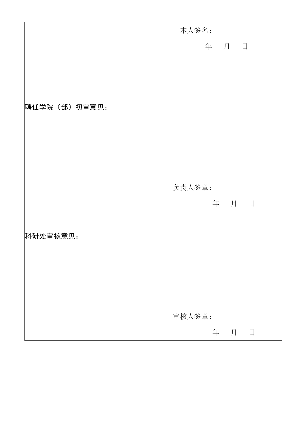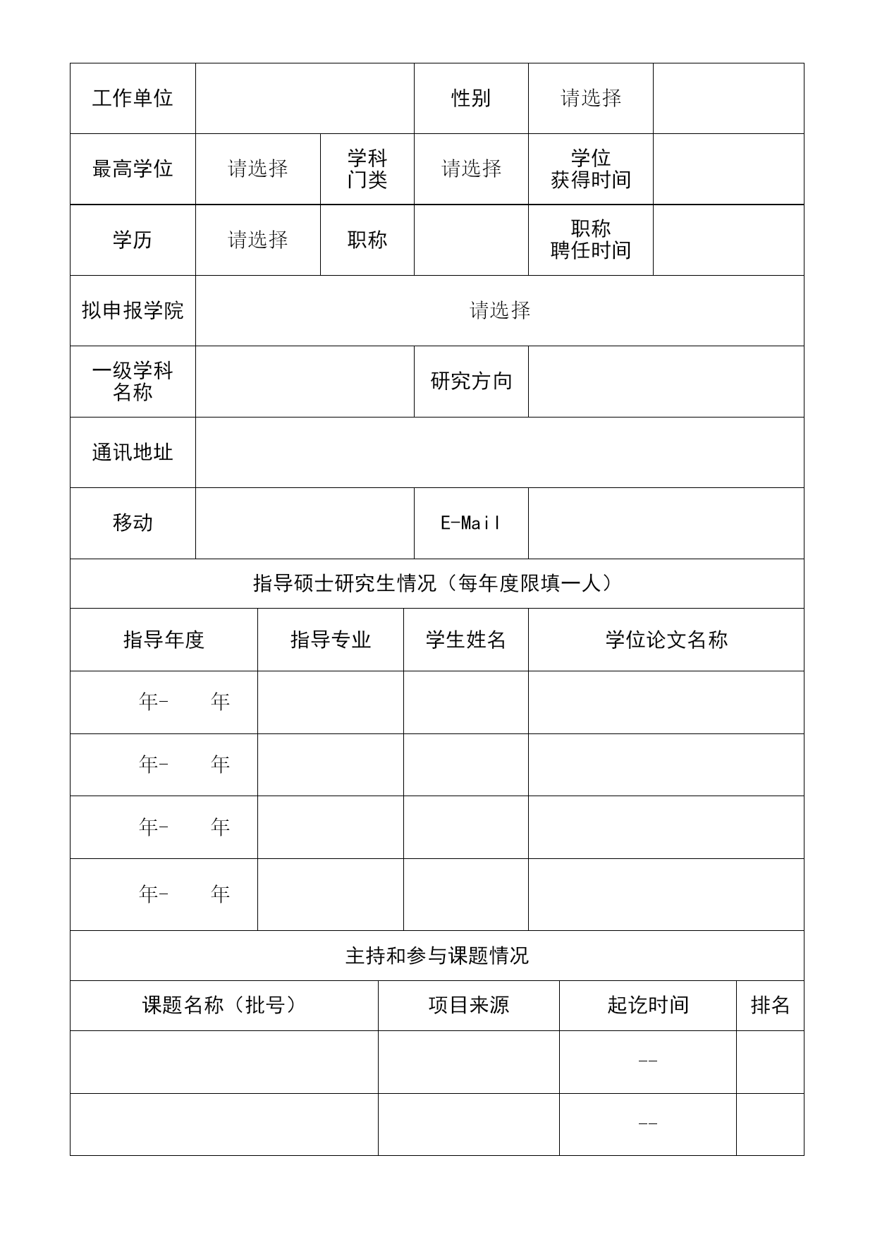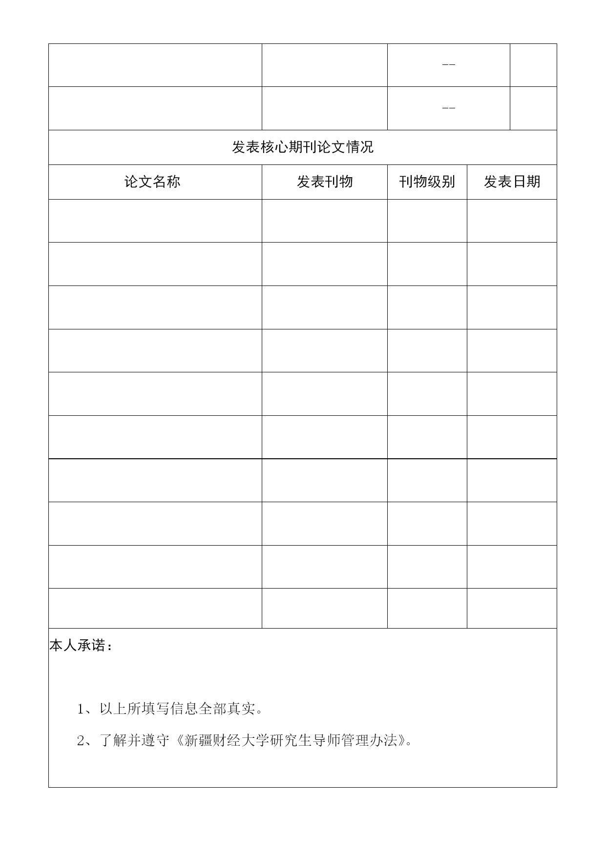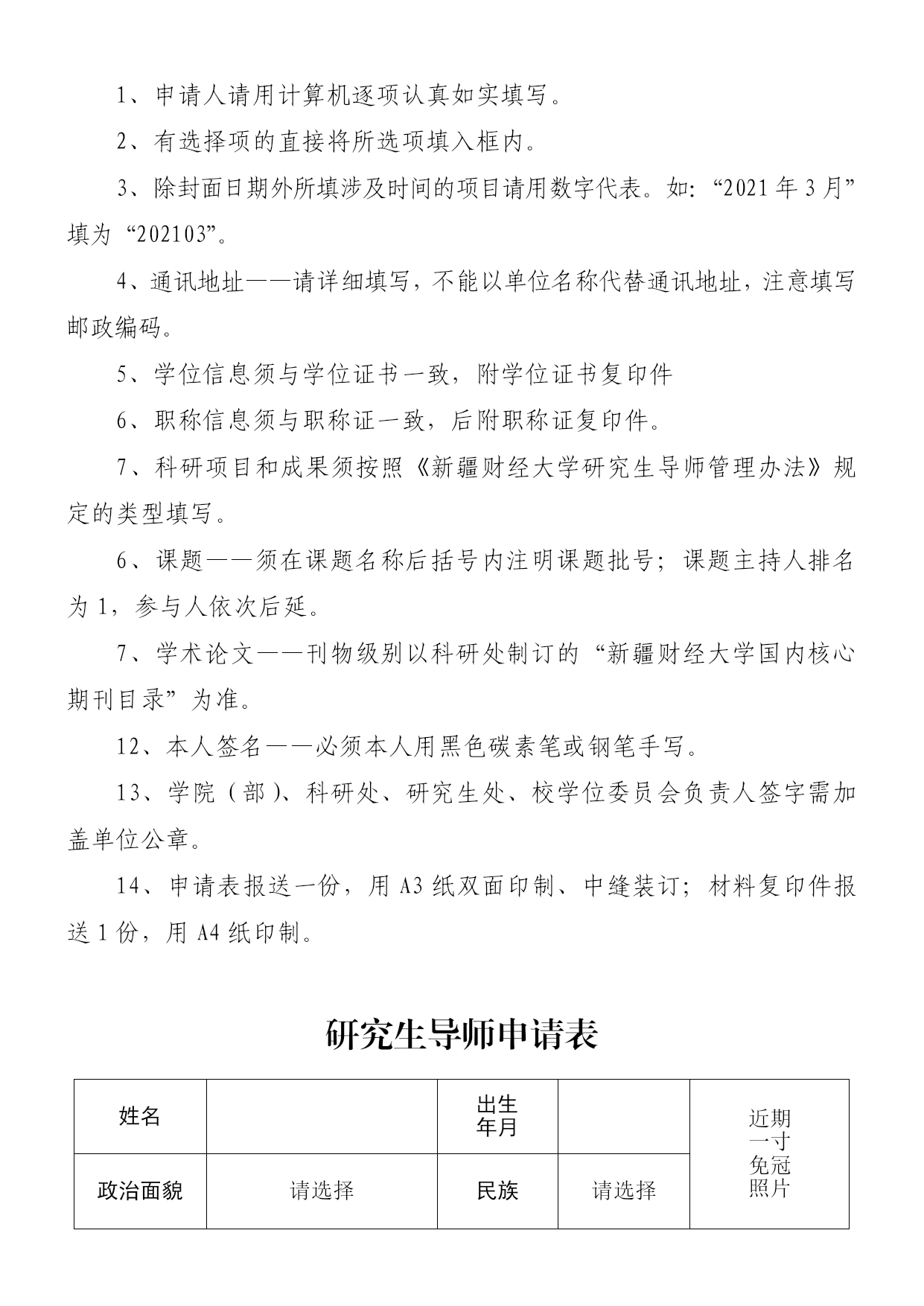 研究生导师申请表优质资料(可以直接使用,可编辑优质资料,欢迎下载)研究生导师申请表申请人姓名:FORMTEXT 所在单位:FORMTEXT 申请类别:FORMDROPDOWN新疆财经大学研究生处制表FORMTEXT2021年FORMTEXT6月填表说明1、申请人请用计算机逐项认真如实填写。2、有选择项的直接将所选项填入框内。3、除封面日期外所填涉及时间的项目请用数字代表。如:“2021年3月”填为“202103”。4、通讯地址——请详细填写,不能以单位名称代替通讯地址,注意填写邮政编码。5、学位信息须与学位证书一致,附学位证书复印件6、职称信息须与职称证一致,后附职称证复印件。7、科研项目和成果须按照《新疆财经大学研究生导师管理办法》规定的类型填写。6、课题——须在课题名称后括号内注明课题批号;课题主持人排名为1,参与人依次后延。7、学术论文——刊物级别以科研处制订的“新疆财经大学国内核心期刊目录”为准。12、本人签名——必须本人用黑色碳素笔或钢笔手写。13、学院(部)、科研处、研究生处、校学位委员会负责人签字需加盖单位公章。14、申请表报送一份,用A3纸双面印制、中缝装订;材料复印件报送1份,用A4纸印制。研究生导师申请表姓名FORMTEXT 出生年月FORMTEXT 近期一寸免冠照片政治面貌FORMDROPDOWN民族FORMDROPDOWN工作单位FORMTEXT 性别FORMDROPDOWN最高学位FORMDROPDOWN学科门类FORMDROPDOWN学位获得时间FORMTEXT 学历FORMDROPDOWN职称FORMTEXT 职称聘任时间FORMTEXT 拟申报学院FORMDROPDOWN一级学科名称FORMTEXT 研究方向FORMTEXT 通讯地址FORMTEXT 移动FORMTEXT E-MailFORMTEXT 指导硕士研究生情况(每年度限填一人)指导年度指导专业学生姓名学位论文名称FORMTEXT 年-FORMTEXT 年FORMTEXT FORMTEXT FORMTEXT FORMTEXT 年-FORMTEXT 年FORMTEXT FORMTEXT FORMTEXT FORMTEXT 年-FORMTEXT 年FORMTEXT FORMTEXT FORMTEXT FORMTEXT 年-FORMTEXT 年FORMTEXT FORMTEXT FORMTEXT 主持和参与课题情况课题名称(批号)项目来源起讫时间排名FORMTEXT FORMTEXT FORMTEXT --FORMTEXT FORMTEXT FORMTEXT FORMTEXT FORMTEXT --FORMTEXT FORMTEXT FORMTEXT FORMTEXT FORMTEXT --FORMTEXT FORMTEXT FORMTEXT FORMTEXT FORMTEXT --FORMTEXT FORMTEXT 发表核心期刊论文情况论文名称发表刊物刊物级别发表日期FORMTEXT FORMTEXT FORMDROPDOWNFORMTEXT FORMTEXT FORMTEXT FORMDROPDOWNFORMTEXT FORMTEXT FORMTEXT FORMDROPDOWNFORMTEXT FORMTEXT FORMTEXT FORMDROPDOWN