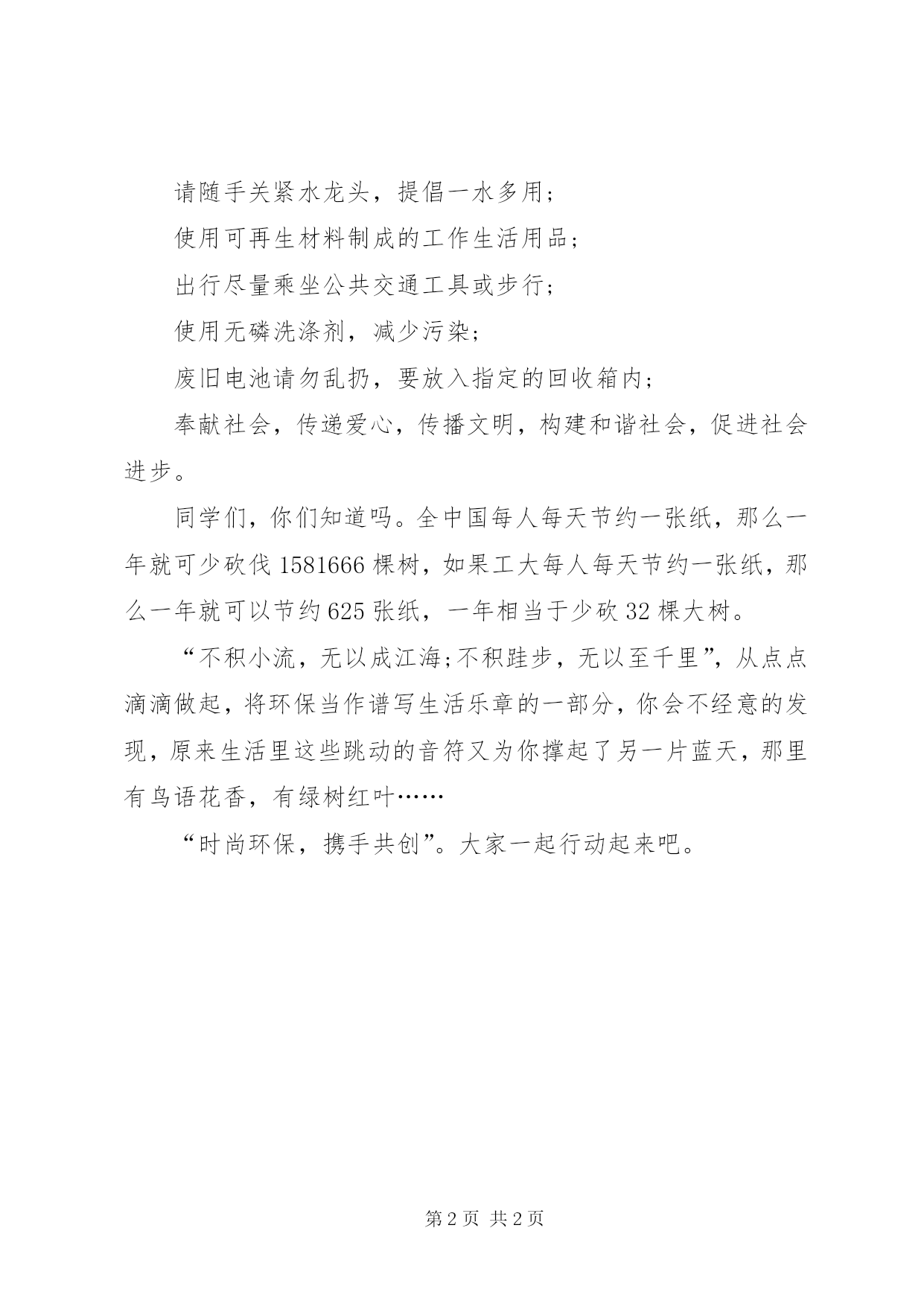 第PAGE\*Arabic\*MERGEFORMAT2页共NUMPAGES\*MERGEFORMAT2页关于校园环保的倡议书亲爱的同学们:你们好。抬头望,朵朵白云依旧点缀着我们头顶的这片蓝天,可是,我亲爱的朋友,当你独自一人踏在这校园里的绿茵地时;当阵阵花香迎面扑鼻而来时;当那片片黄叶随风飘落时;当洁白的雪花扬洒在你的肩上时,你是否有些许的欣慰,抑或是淡淡的感伤,在每一天上帝赐予你的864秒中,你是否曾舍得用其中的一秒来留意、思索一下你身边所有的一切。来到工大,曾经的梦成为了现实,但同时还有更多的梦需要我们去实现。拥有美好的校园环境,是我们的共同心愿。用心去关注环境的变化,用热情去传播环保的观念,用行动肩负起环保的重任,也是每一个工大学子的使命。党的十七大提出,必须把建设资源节约型、环境友好型社会放在工业化、现代化发展战略的突出位置,落实到每个单位、每个家庭。在此,我们向全校同学发出以下倡议:倡导文明行为,不随地吐痰,不乱扔脏物,不践踏草坪;节约用电,随手关灯、关掉长时间待机的电脑;节约资源,复印纸张双面使用,能用一张不用两张;请随手关紧水龙头,提倡一水多用;使用可再生材料制成的工作生活用品;出行尽量乘坐公共交通工具或步行;使用无磷洗涤剂,减少污染;废旧电池请勿乱扔,要放入指定的回收箱内;奉献社会,传递爱心,传播文明,构建和谐社会,促进社会进步。同学们,你们知道吗。全中国每人每天节约一张纸,那么一年就可少砍伐1581666棵树,如果工大每人每天节约一张纸,那么一年就可以节约625张纸,一年相当于少砍32棵大树。“不积小流,无以成江海;不积跬步,无以至千里”,从点点滴滴做起,将环保当作谱写生活乐章的一部分,你会不经意的发现,原来生活里这些跳动的音符又为你撑起了另一片蓝天,那里有鸟语花香,有绿树红叶……“时尚环保,携手共创”。大家一起行动起来吧。