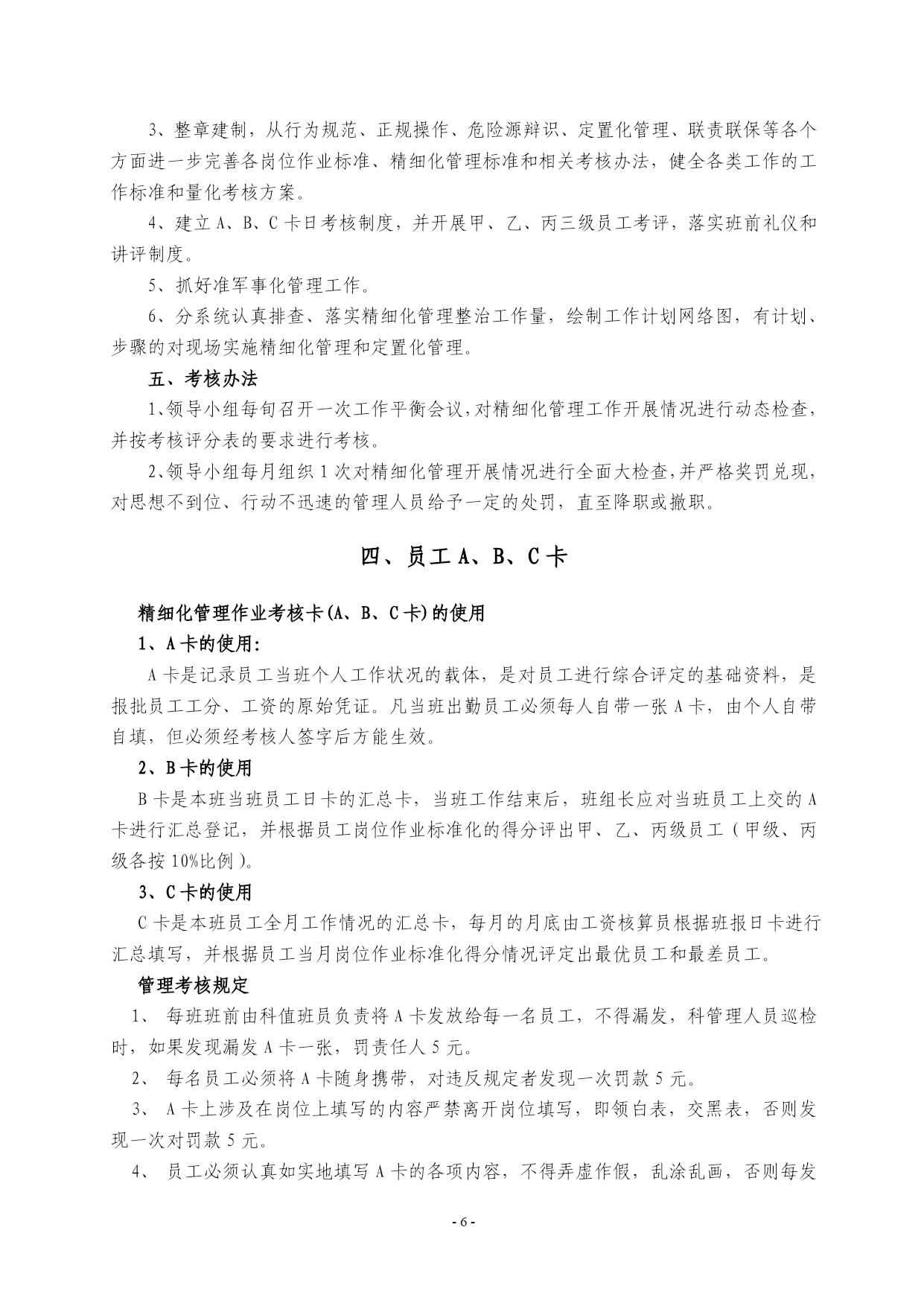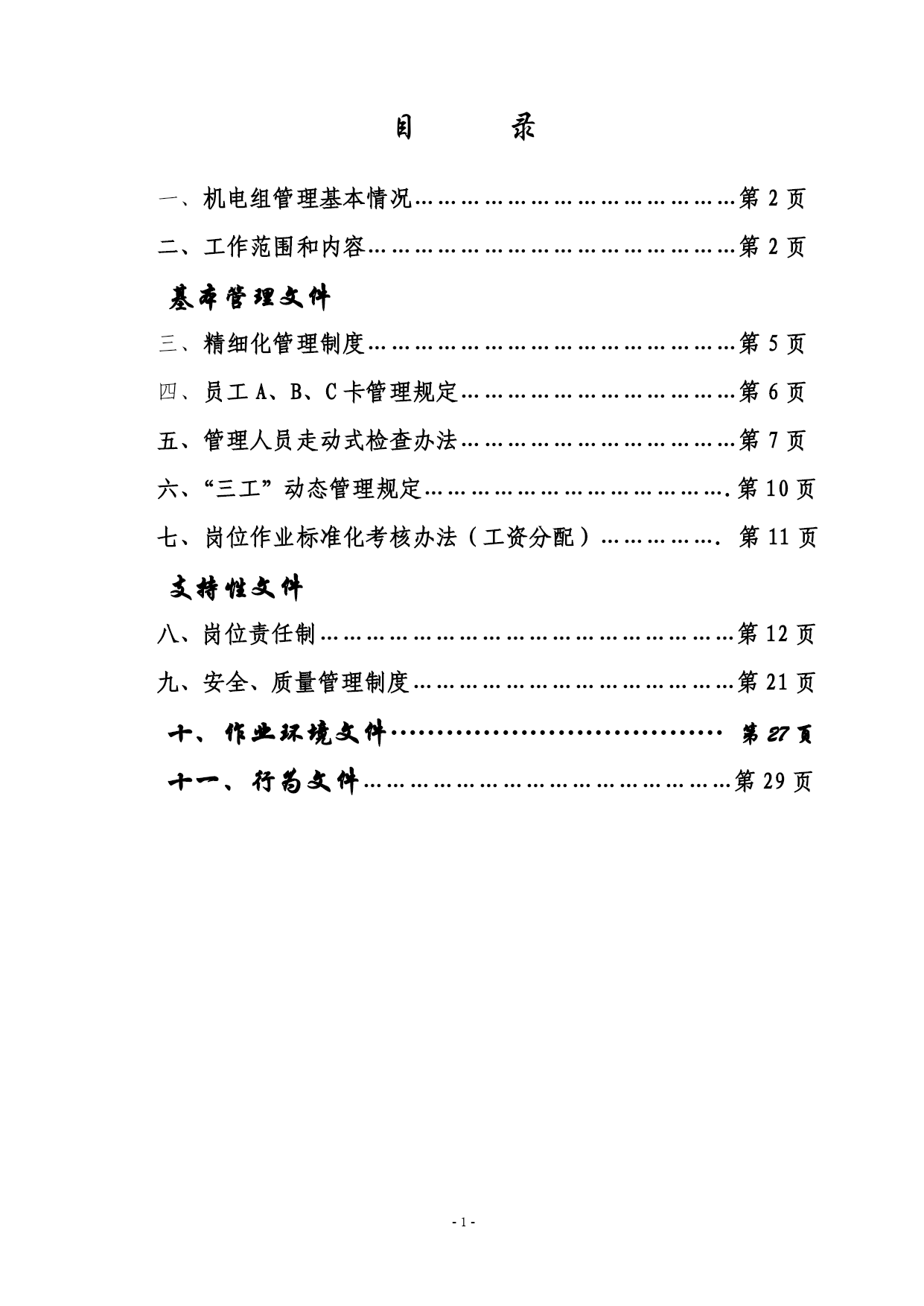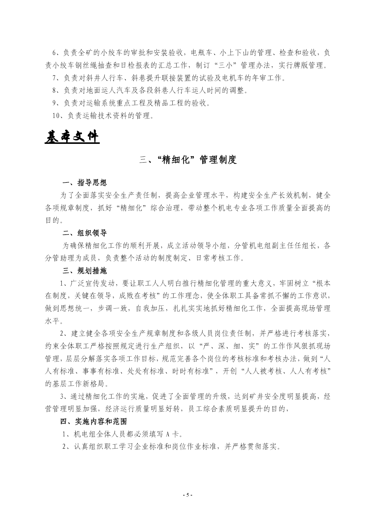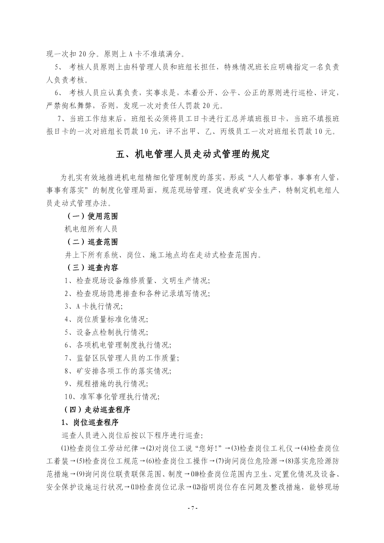 PAGE-31-华丰煤矿生产部机电组“精细化”管理制度汇编二00五年十月目录一、机电组管理基本情况……………………………………二、工作范围和内容…………………………………………基本管理文件三、精细化管理制度…………………………………………四、员工A、B、C卡管理规定………………………………五、管理人员走动式检查办法………………………………六、“三工”动态管理规定………………………………….七、岗位作业标准化考核办法(工资分配)…………….支持性文件八、岗位责任制………………………………………………九、安全、质量管理制度……………………………………十、作业环境文件………………………………十一、行为文件…………………………………………一、机电组管理基本情况按照矿规定,设科长1人,分管副科长4人,工程师1人,下属7个专业化管理小组,在册43人。其中:李子峰:生产部副主任,负责机电组的全面管理工作。王继华:主任助理,分管设备组(8人)和专业组(8人)。张义:主任助理,分管资料室、大型固定设备组(5人)。李衍炳:主任助理,分管电气测试组,全矿高压和地面低压供电(5人)。于永华:副主任,分管运输组(4人)。赵兴来:工程师,分管机电设计组(3人)。杨洪志:主任助理,分管外供组(3人)。二、工作范围和内容机电组是一个职能管理部门,对全矿的机电、运输业务负责统一领导,建立煤矿机电、运输工作的正常秩序,做到科学管理、合理使用、计划检修、安全运转。具体负责矿产公司范围内的机电、运输业务保安和职能管理。其中:专业组:1、主要负责全矿井下6KV以下的电器设备、风电闭锁、煤电钻、信号、电机综保及皮带综保,采掘设备和采区运输皮带及各类机械设备(包括40KW及以下绞车)、小型电器及电缆悬挂的防爆性能质量的监督检查和考核,负责充电室矿灯及充电架的质量检查和考核。2、负责矿产公司范围内的所有小型电器建帐、编号和调剂使用管理和修复后的质量验收工作。3、主要负责全矿井下接地、漏电、过流三大保护的监督检查,采区低压供电审批、负荷调整及过流保护的整定计算和灵敏效验计算工作。每月绘制一份低压供电系统图。4、负责矿产公司范围内的橡套电缆(6mm2以上的)进行编号,建帐和调剂使用管理及修复后的质量验收工作。5、负责有关采掘运技术管理规定的制定和监督落实,严格执行矿及专业的各项规章制度,并对违反制度的人或事提出处罚意见。6、每月进行一次检漏继电器人工远方试验,每季度一次的接地摇测,每半年一次的井下采变所的低压馈电开关的过流试验。并对试验结果进行分析,指导工区进行整改。7、负责有关采掘运方面的质量认证资料的管理,负责防爆合格证及采掘运各类保护的试验资料的收集、整理和管理。设备组:1、围绕矿产公司的生产,积极做好生产接续设备的准备和回撤工作,并做好准确的记录。2、抓好设备的基础管理及有关各类台帐的管理,定期核对。3、做好季节性的设备准备和调剂工作,避免出现因设备管理不周而酿成的机电事故。4、按配件管理范围、统筹按排,合理制定配件管理办法,负责编制配件月、季度计划和年度计划报分管领导批准后实施,负责非标准配件的外委加工的联系工作。5、负责机运专业材料计划的编制上报工作6、抓好矿产公司各专业维修组的管理和考核,并负责监督其维修质量及修复设备的验收发放。7、抓好矿产公司设备租赁和租赁设备的管理,杜绝设备的无偿占用,提高设备利用率,降低设备占用资金8、负责矿产公司各项工程设备的成本预算的制定,为领导决策提供可靠的依据。9、负责各机电单位修旧利废的考核验收。资料室、大型固定设备组:1、负责机电专业技术资料的存档和保管工作。2、按时组织固定设备的质量检查,存在的问题及时通知有关单位,限期整改,对安全保护装置要及时全面的进行检查和试验,做好记录,对设备存在的重大隐患要及时向有关领导汇报,并提出处理意见。3、切实搞好技术管理工作,认真做好资料的收集、绘制和存档工作,对收集起来的资料根据现场情况进行分析,特别是设备的运转日志,定期检查记录、点检记录和故障处理记录。4、做好设备的技术测定工作,对测定结果进行分析总结,做到资料存档,努力提高设备性能,做到安全、经济运行。5、抓好质量认证、质量达标的资料管理及相关工作。抓好设备的档案管理工作,搞好一机一档严格执行资料,保证资料的完整性和正确性。6、对重大的技术问题要及时给机运分公司副经理和生产部副主任汇报,制定出切实可行的措施。7、当大型固定设备发生事故时,要亲临现场进行分析,并做好分析记录。8、完成上级交办的各项临时性工作。高压供电管理及测试组:1、全面负责全矿高压供电及地