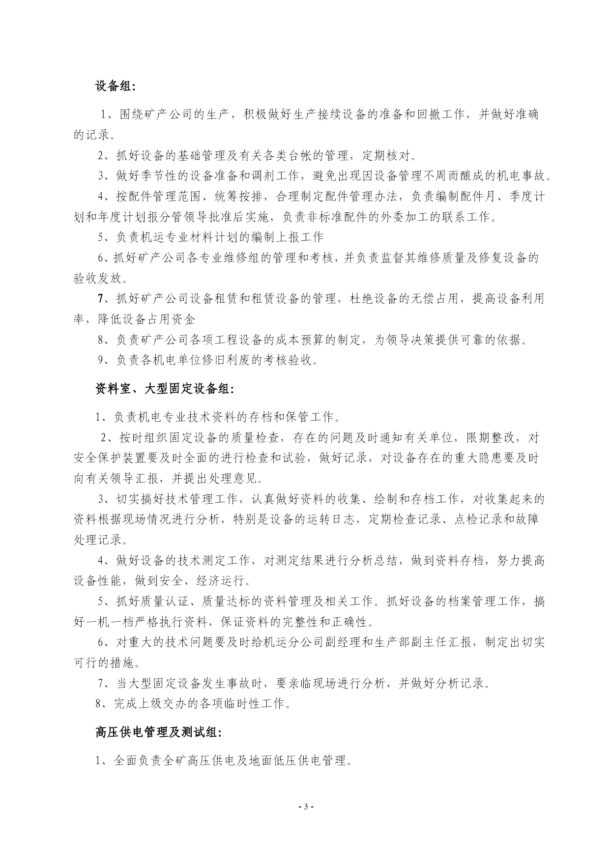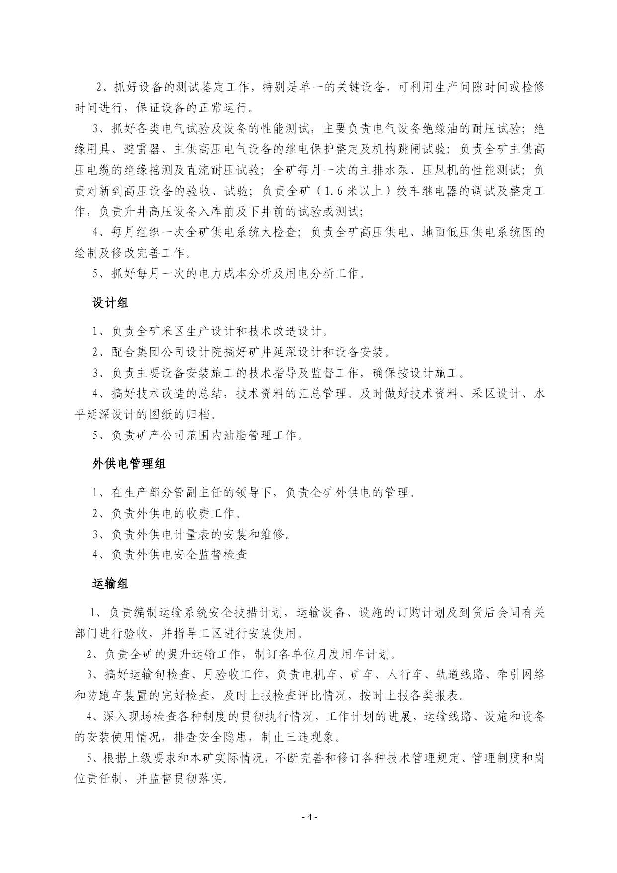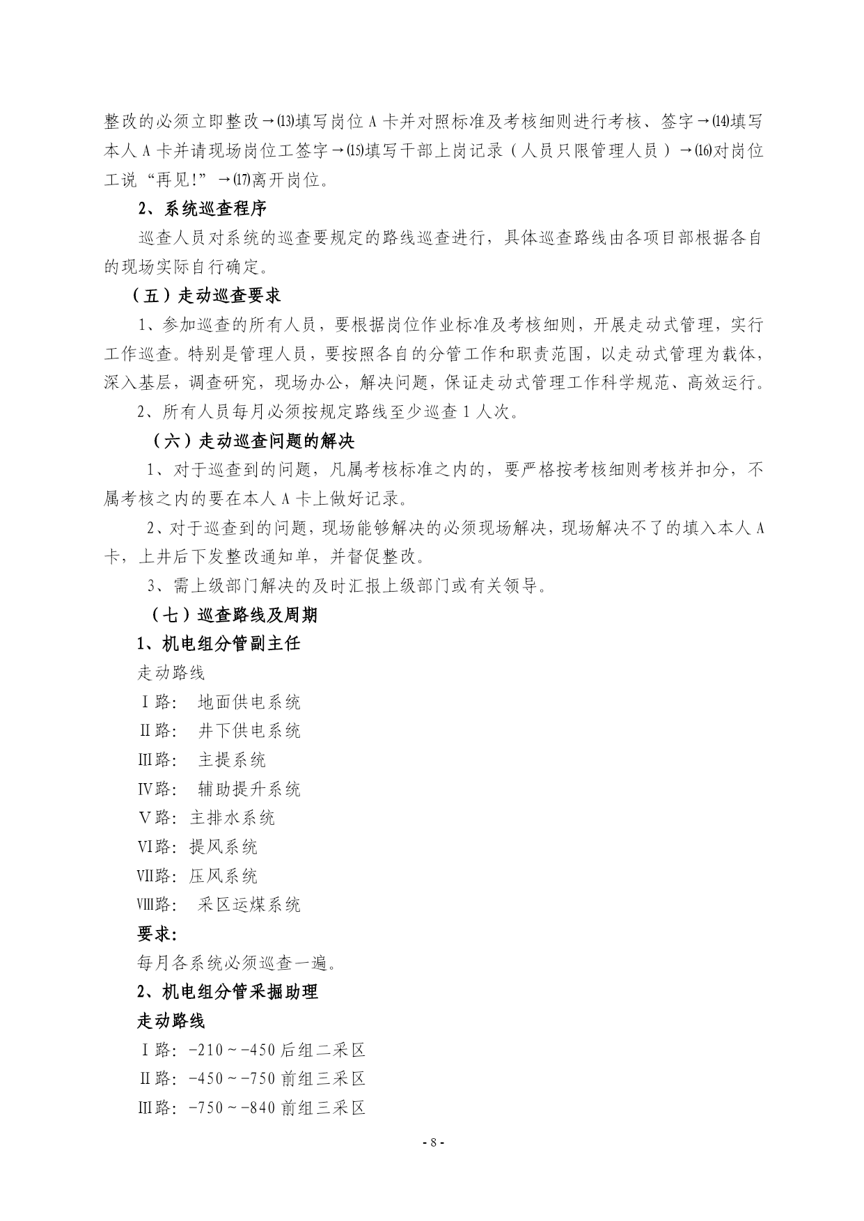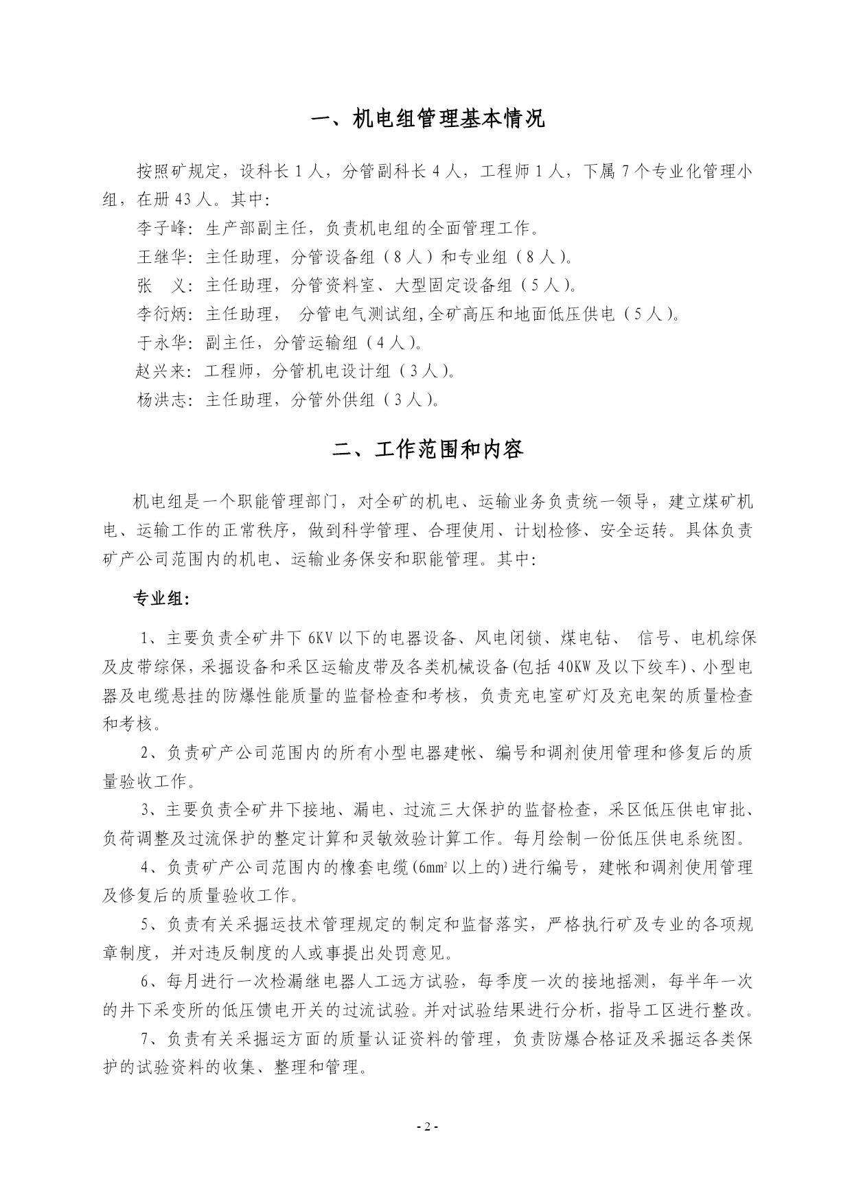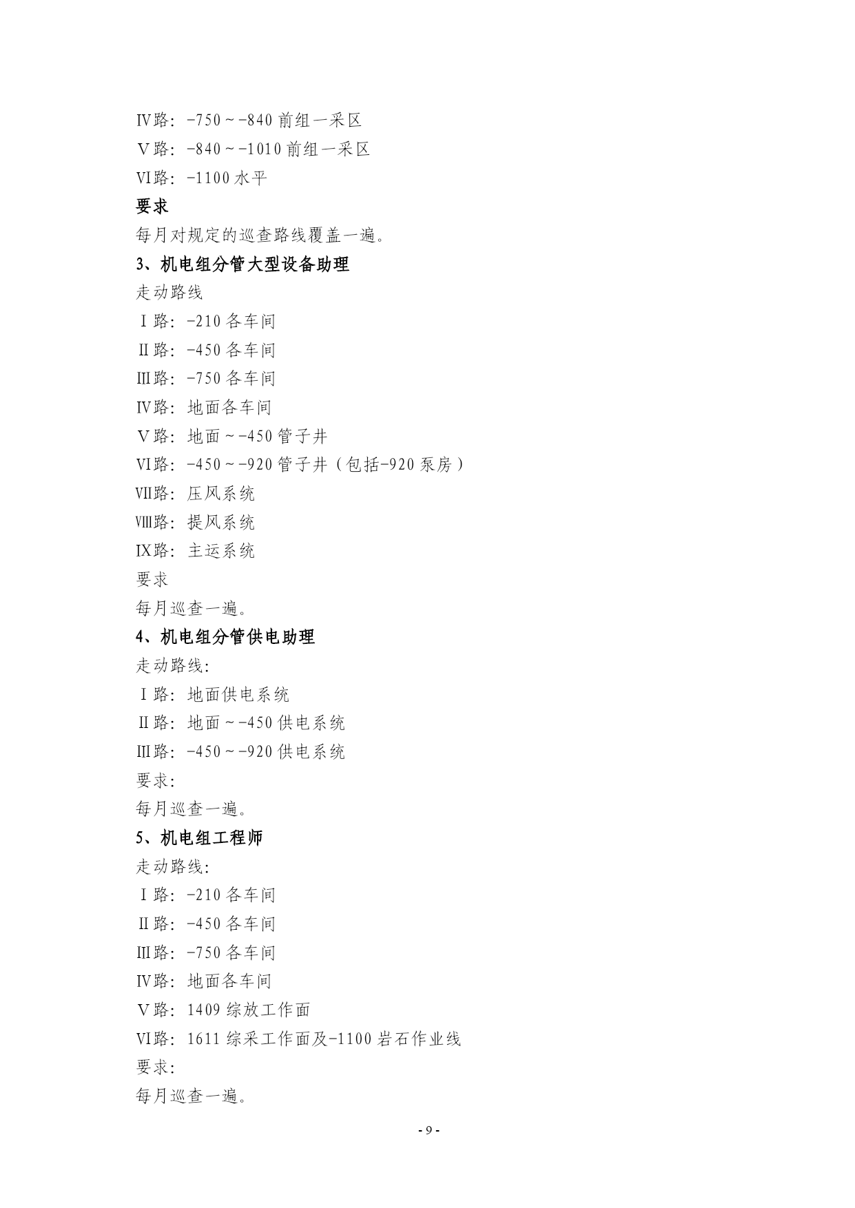 PAGE-31-华丰煤矿生产部机电组“精细化”管理制度汇编二00五年十月目录一、机电组管理基本情况……………………………………二、工作范围和内容…………………………………………基本管理文件三、精细化管理制度…………………………………………四、员工A、B、C卡管理规定………………………………五、管理人员走动式检查办法………………………………六、“三工”动态管理规定………………………………….七、岗位作业标准化考核办法(工资分配)…………….支持性文件八、岗位责任制………………………………………………九、安全、质量管理制度……………………………………十、作业环境文件………………………………十一、行为文件…………………………………………一、机电组管理基本情况按照矿规定,设科长1人,分管副科长4人,工程师1人,下属7个专业化管理小组,在册43人。其中:李子峰:生产部副主任,负责机电组的全面管理工作。王继华:主任助理,分管设备组(8人)和专业组(8人)。张义:主任助理,分管资料室、大型固定设备组(5人)。李衍炳:主任助理,分管电气测试组,全矿高压和地面低压供电(5人)。于永华:副主任,分管运输组(4人)。赵兴来:工程师,分管机电设计组(3人)。杨洪志:主任助理,分管外供组(3人)。二、工作范围和内容机电组是一个职能管理部门,对全矿的机电、运输业务负责统一领导,建立煤矿机电、运输工作的正常秩序,做到科学管理、合理使用、计划检修、安全运转。具体负责矿产公司范围内的机电、运输业务保安和职能管理。其中:专业组:1、主要负责全矿井下6KV以下的电器设备、风电闭锁、煤电钻、信号、电机综保及皮带综保,采掘设备和采区运输皮带及各类机械设备(包括40KW及以下绞车)、小型电器及电缆悬挂的防爆性能质量的监督检查和考核,负责充电室矿灯及充电架的质量检查和考核。2、负责矿产公司范围内的所有小型电器建帐、编号和调剂使用管理和修复后的质量验收工作。3、主要负责全矿井下接地、漏电、过流三大保护的监督检查,采区低压供电审批、负荷调整及过流保护的整定计算和灵敏效验计算工作。每月绘制一份低压供电系统图。4、负责矿产公司范围内的橡套电缆(6mm2以上的)进行编号,建帐和调剂使用管理及修复后的质量验收工作。5、负责有关采掘运技术管理规定的制定和监督落实,严格执行矿及专业的各项规章制度,并对违反制度的人或事提出处罚意见。6、每月进行一次检漏继电器人工远方试验,每季度一次的接地摇测,每半年一次的井下采变所的低压馈电开关的过流试验。并对试验结果进行分析,指导工区进行整改。7、负责有关采掘运方面的质量认证资料的管理,负责防爆合格证及采掘运各类保护的试验资料的收集、整理和管理。设备组:1、围绕矿产公司的生产,积极做好生产接续设备的准备和回撤工作,并做好准确的记录。2、抓好设备的基础管理及有关各类台帐的管理,定期核对。3、做好季节性的设备准备和调剂工作,避免出现因设备管理不周而酿成的机电事故。4、按配件管理范围、统筹按排,合理制定配件管理办法,负责编制配件月、季度计划和年度计划报分管领导批准后实施,负责非标准配件的外委加工的联系工作。5、负责机运专业材料计划的编制上报工作6、抓好矿产公司各专业维修组的管理和考核,并负责监督其维修质量及修复设备的验收发放。7、抓好矿产公司设备租赁和租赁设备的管理,杜绝设备的无偿占用,提高设备利用率,降低设备占用资金8、负责矿产公司各项工程设备的成本预算的制定,为领导决策提供可靠的依据。9、负责各机电单位修旧利废的考核验收。资料室、大型固定设备组:1、负责机电专业技术资料的存档和保管工作。2、按时组织固定设备的质量检查,存在的问题及时通知有关单位,限期整改,对安全保护装置要及时全面的进行检查和试验,做好记录,对设备存在的重大隐患要及时向有关领导汇报,并提出处理意见。3、切实搞好技术管理工作,认真做好资料的收集、绘制和存档工作,对收集起来的资料根据现场情况进行分析,特别是设备的运转日志,定期检查记录、点检记录和故障处理记录。4、做好设备的技术测定工作,对测定结果进行分析总结,做到资料存档,努力提高设备性能,做到安全、经济运行。5、抓好质量认证、质量达标的资料管理及相关工作。抓好设备的档案管理工作,搞好一机一档严格执行资料,保证资料的完整性和正确性。6、对重大的技术问题要及时给机运分公司副经理和生产部副主任汇报,制定出切实可行的措施。7、当大型固定设备发生事故时,要亲临现场进行分析,并做好分析记录。8、完成上级交办的各项临时性工作。高压供电管理及测试组:1、全面负责全矿高压供电及地