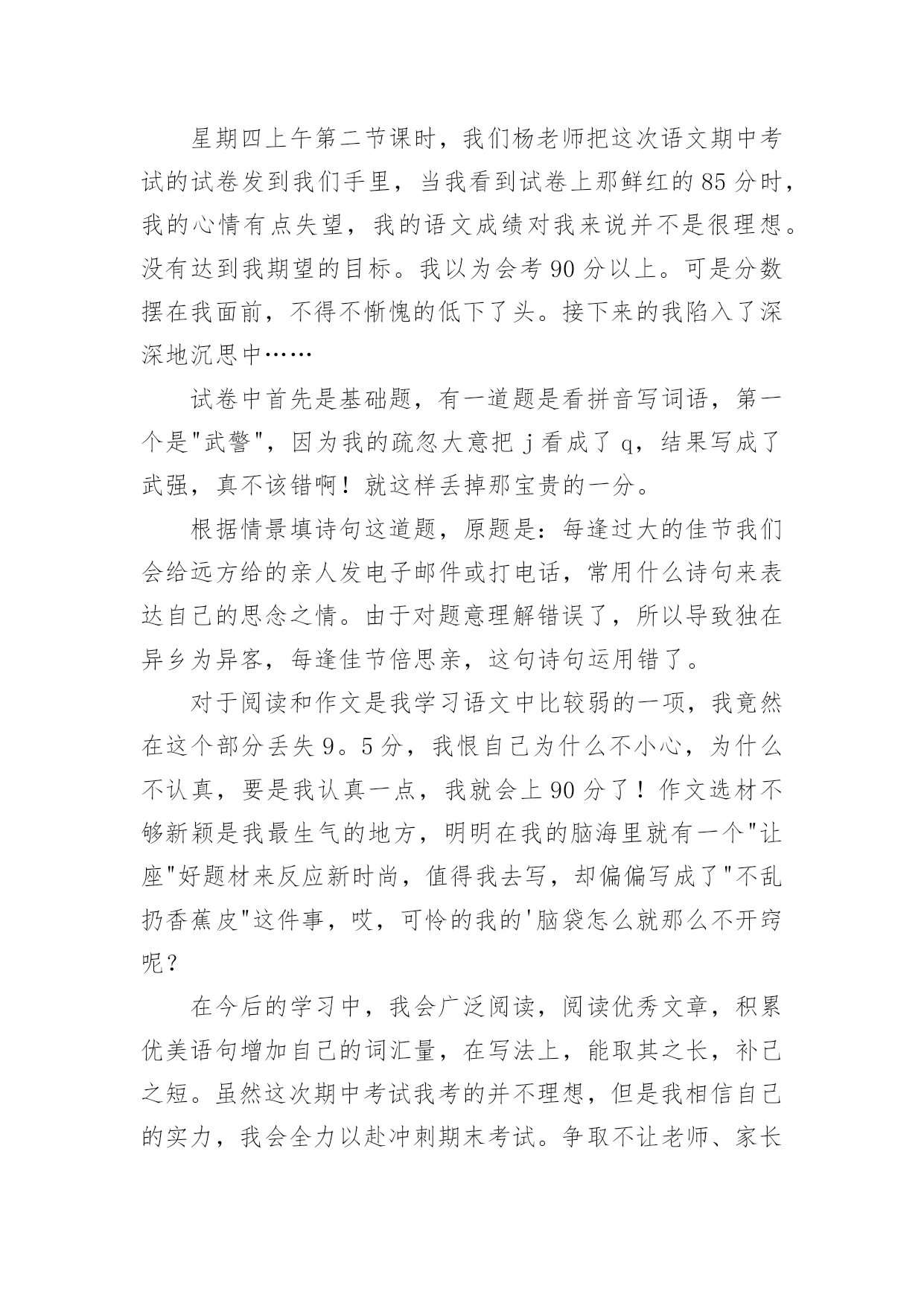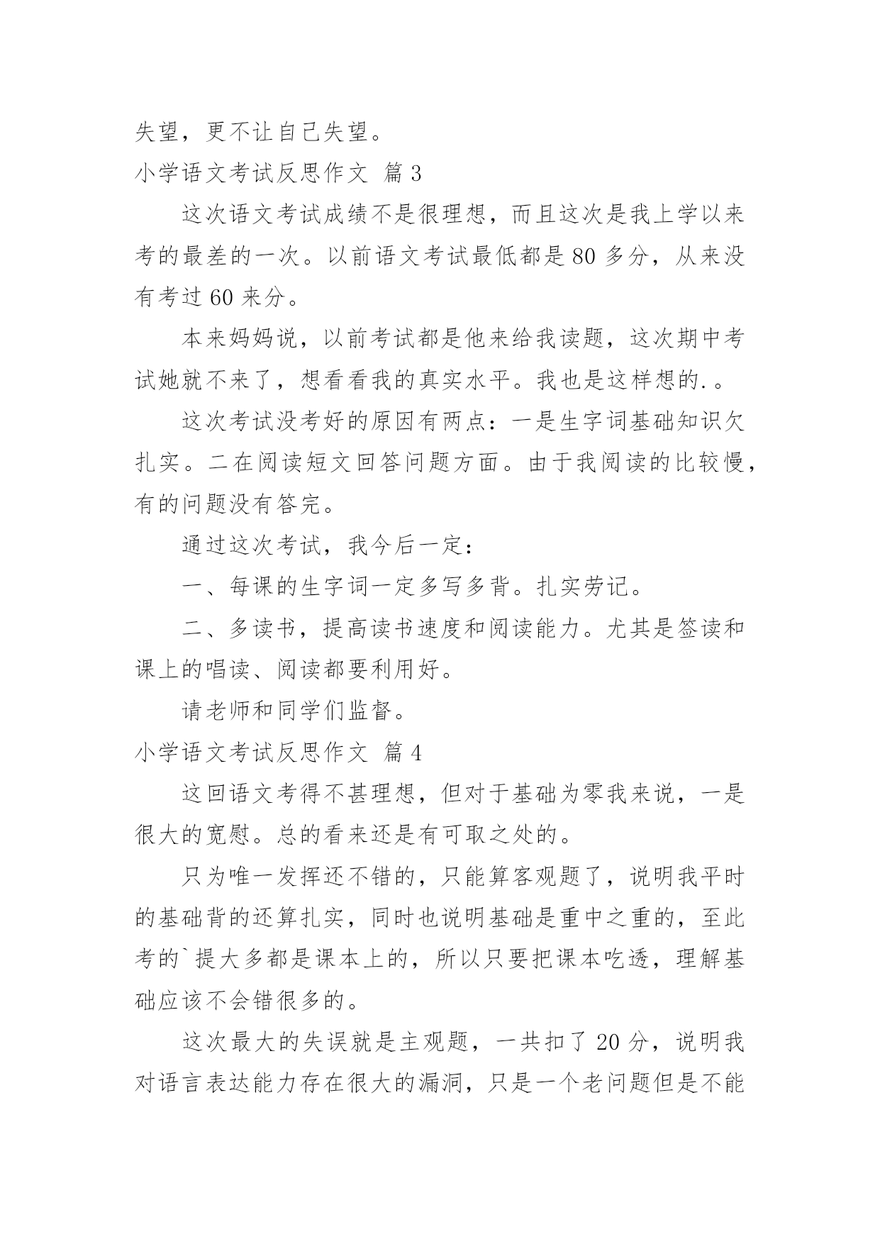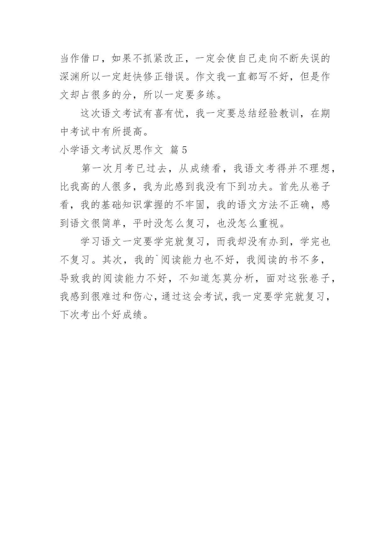 小学语文考试反思作文小学语文考试反思作文锦集5篇无论是身处学校还是步入社会,大家都写过作文,肯定对各类作文都很熟悉吧,借助作文人们可以反映客观事物、表达思想感情、传递知识信息。一篇什么样的作文才能称之为优秀作文呢?以下是小编帮大家整理的小学语文考试反思作文5篇,仅供参考,大家一起来看看吧。小学语文考试反思作文篇1今天语文老师发了一张试卷,我一猜就知道:要考试了。还是和以前一样,老师让我们看了一节课试卷,不会的可以看书。我来回看了好几遍,累了,就趴在桌子上休息。下午,开始考试了。我是第一个做完的`,我看了看正在做题的童鞋们之后,就开始检查了。检查了两遍,还是没有发现错误,我有检查了一遍,还是没有。好沮丧呀,居然没有检查出来错误,也许全对了呀!过了十分钟,收卷了。由于老师忙,这一星期没有来得及批试卷,下一星期开始批的。这节课上语文,老师让我们写词语,他批试卷。我写的时候叫上了好几个同学,都有错题。我也被叫上去了,我错的题都是粗心错的,可是我没有检查出来呀,真懊恼!以后我要更细心,更细心!小学语文考试反思作文篇2星期四上午第二节课时,我们杨老师把这次语文期中考试的试卷发到我们手里,当我看到试卷上那鲜红的85分时,我的心情有点失望,我的语文成绩对我来说并不是很理想。没有达到我期望的目标。我以为会考90分以上。可是分数摆在我面前,不得不惭愧的低下了头。接下来的我陷入了深深地沉思中……试卷中首先是基础题,有一道题是看拼音写词语,第一个是"武警",因为我的疏忽大意把j看成了q,结果写成了武强,真不该错啊!就这样丢掉那宝贵的一分。根据情景填诗句这道题,原题是:每逢过大的佳节我们会给远方给的亲人发电子邮件或打电话,常用什么诗句来表达自己的思念之情。由于对题意理解错误了,所以导致独在异乡为异客,每逢佳节倍思亲,这句诗句运用错了。对于阅读和作文是我学习语文中比较弱的一项,我竟然在这个部分丢失9。5分,我恨自己为什么不小心,为什么不认真,要是我认真一点,我就会上90分了!作文选材不够新颖是我最生气的地方,明明在我的脑海里就有一个"让座"好题材来反应新时尚,值得我去写,却偏偏写成了"不乱扔香蕉皮"这件事,哎,可怜的我的'脑袋怎么就那么不开窍呢?在今后的学习中,我会广泛阅读,阅读优秀文章,积累优美语句增加自己的词汇量,在写法上,能取其之长,补己之短。虽然这次期中考试我考的并不理想,但是我相信自己的实力,我会全力以赴冲刺期末考试。争取不让老师、家长失望,更不让自己失望。小学语文考试反思作文篇3这次语文考试成绩不是很理想,而且这次是我上学以来考的最差的一次。以前语文考试最低都是80多分,从来没有考过60来分。本来妈妈说,以前考试都是他来给我读题,这次期中考试她就不来了,想看看我的真实水平。我也是这样想的.。这次考试没考好的原因有两点:一是生字词基础知识欠扎实。二在阅读短文回答问题方面。由于我阅读的比较慢,有的问题没有答完。通过这次考试,我今后一定:一、每课的生字词一定多写多背。扎实劳记。二、多读书,提高读书速度和阅读能力。尤其是签读和课上的唱读、阅读都要利用好。请老师和同学们监督。小学语文考试反思作文篇4这回语文考得不甚理想,但对于基础为零我来说,一是很大的宽慰。总的看来还是有可取之处的。只为唯一发挥还不错的,只能算客观题了,说明我平时的基础背的还算扎实,同时也说明基础是重中之重的,至此考的`提大多都是课本上的,所以只要把课本吃透,理解基础应该不会错很多的。这次最大的失误就是主观题,一共扣了20分,说明我对语言表达能力存在很大的漏洞,只是一个老问题但是不能当作借口,如果不抓紧改正,一定会使自己走向不断失误的深渊所以一定赶快修正错误。作文我一直都写不好,但是作文却占很多的分,所以一定要多练。这次语文考试有喜有忧,我一定要总结经验教训,在期中考试中有所提高。小学语文考试反思作文篇5第一次月考已过去,从成绩看,我语文考得并不理想,比我高的人很多,我为此感到我没有下到功夫。首先从卷子看,我的基础知识掌握的不牢固,我的语文方法不正确,感到语文很简单,平时没怎么复习,也没怎么重视。学习语文一定要学完就复习,而我却没有办到,学完也不复习。其次,我的`阅读能力也不好,我阅读的书不多,导致我的阅读能力不好,不知道怎莫分析,面对这张卷子,我感到很难过和伤心,通过这会考试,我一定要学完就复习,下次考出个好成绩。