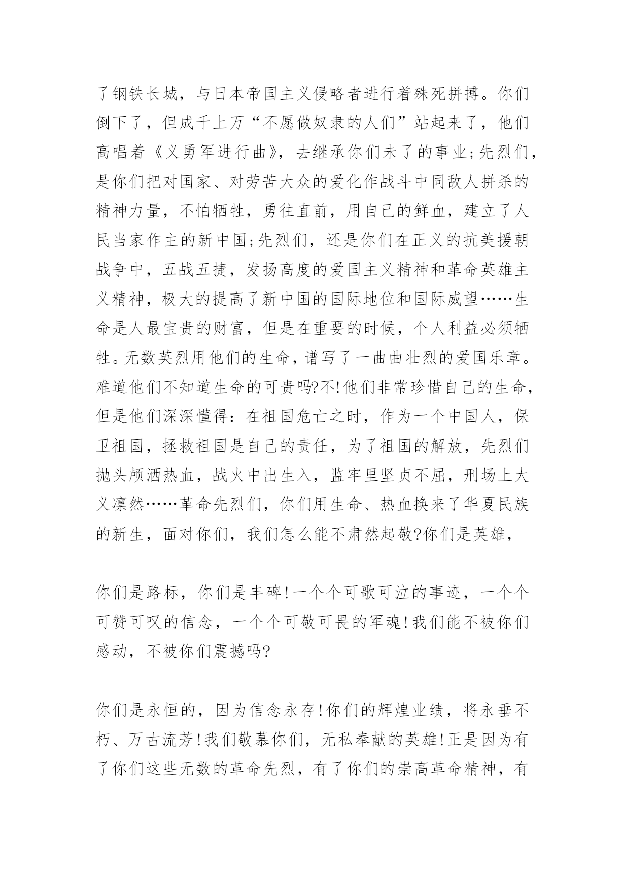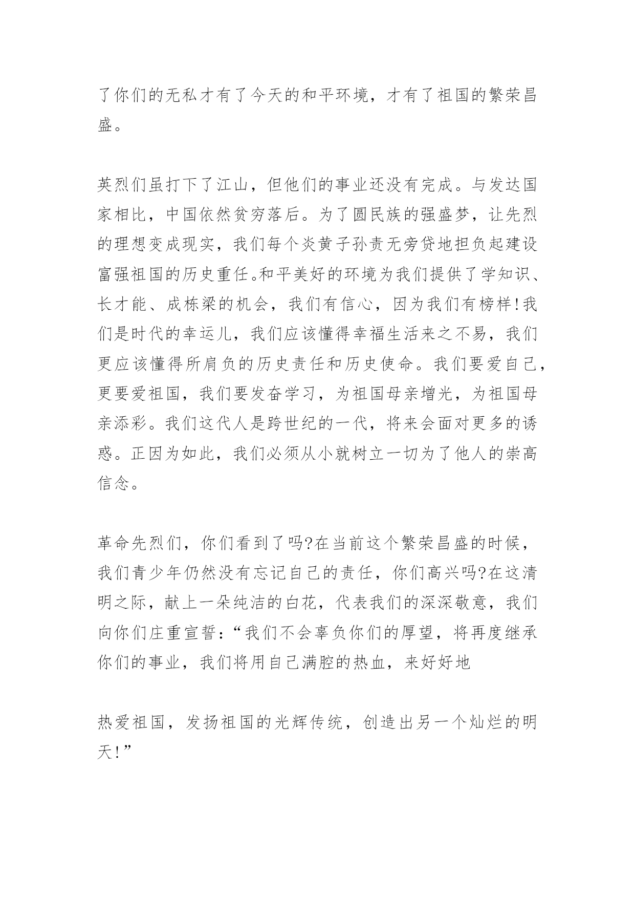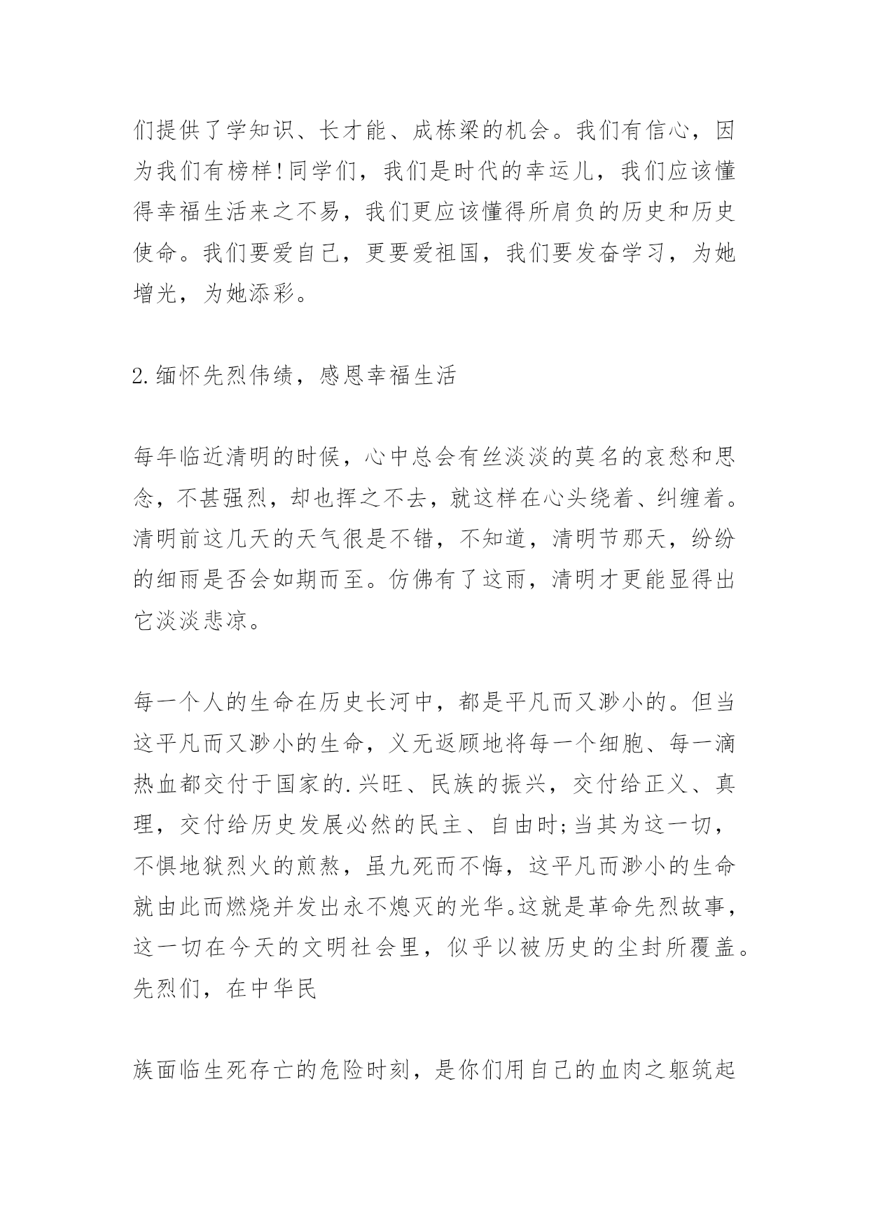 感恩幸福生活的作文感恩幸福生活的作文1.感恩幸福生活又一个清明节,又一个缅怀先烈的日子。我们来到烈士墓前,祭奠长眠在这里的先烈英灵。站在烈士墓前,我们心潮起伏,思绪万千。这里长眠着为了民族独立和国家尊严献出宝贵生命的革命先烈们。在抗日战争中,先烈们抛头颅、洒热血,为了祖国的繁荣富强献出青春和年轻的生命,在中华民族面临生死存亡的危险时刻,你们用自己的血肉之躯筑起了钢铁长城;在祖国最需要的时候,你们抛去了家庭和个人的一切,毫不犹豫,挺身而出,把宝贵的生命无私地献给了祖国和人民,把满腔的热血洒遍祖国大地。面对你们,我们怎能不肃然起敬?你们的辉煌业绩,将彪炳史册、万古流芳!你们的英名将与日月同辉,与江河共存!我们敬慕你们,无私奉献的英雄!正是因为有了你们这些无数的革命先烈,有了你们的崇高,有了你们的无私才有了今天和平的环境,才有了祖国的繁荣昌盛。战争的年代造就了烈士的坚强与勇敢,和平美好的环境为人们提供了学知识、长才能、成栋梁的机会。我们有信心,因为我们有榜样!同学们,我们是时代的幸运儿,我们应该懂得幸福生活来之不易,我们更应该懂得所肩负的历史和历史使命。我们要爱自己,更要爱祖国,我们要发奋学习,为她增光,为她添彩。2.缅怀先烈伟绩,感恩幸福生活每年临近清明的时候,心中总会有丝淡淡的莫名的哀愁和思念,不甚强烈,却也挥之不去,就这样在心头绕着、纠缠着。清明前这几天的天气很是不错,不知道,清明节那天,纷纷的细雨是否会如期而至。仿佛有了这雨,清明才更能显得出它淡淡悲凉。每一个人的生命在历史长河中,都是平凡而又渺小的。但当这平凡而又渺小的生命,义无返顾地将每一个细胞、每一滴热血都交付于国家的.兴旺、民族的振兴,交付给正义、真理,交付给历史发展必然的民主、自由时;当其为这一切,不惧地狱烈火的煎熬,虽九死而不悔,这平凡而渺小的生命就由此而燃烧并发出永不熄灭的光华。这就是革命先烈故事,这一切在今天的文明社会里,似乎以被历史的尘封所覆盖。先烈们,在中华民族面临生死存亡的危险时刻,是你们用自己的血肉之躯筑起了钢铁长城,与日本帝国主义侵略者进行着殊死拼搏。你们倒下了,但成千上万“不愿做奴隶的人们”站起来了,他们高唱着《义勇军进行曲》,去继承你们未了的事业;先烈们,是你们把对国家、对劳苦大众的爱化作战斗中同敌人拼杀的精神力量,不怕牺牲,勇往直前,用自己的鲜血,建立了人民当家作主的新中国;先烈们,还是你们在正义的抗美援朝战争中,五战五捷,发扬高度的爱国主义精神和革命英雄主义精神,极大的提高了新中国的国际地位和国际威望……生命是人最宝贵的财富,但是在重要的时候,个人利益必须牺牲。无数英烈用他们的生命,谱写了一曲曲壮烈的爱国乐章。难道他们不知道生命的可贵吗?不!他们非常珍惜自己的生命,但是他们深深懂得:在祖国危亡之时,作为一个中国人,保卫祖国,拯救祖国是自己的责任,为了祖国的解放,先烈们抛头颅洒热血,战火中出生入,监牢里坚贞不屈,刑场上大义凛然……革命先烈们,你们用生命、热血换来了华夏民族的新生,面对你们,我们怎么能不肃然起敬?你们是英雄,你们是路标,你们是丰碑!一个个可歌可泣的事迹,一个个可赞可叹的信念,一个个可敬可畏的军魂!我们能不被你们感动,不被你们震撼吗?你们是永恒的,因为信念永存!你们的辉煌业绩,将永垂不朽、万古流芳!我们敬慕你们,无私奉献的英雄!正是因为有了你们这些无数的革命先烈,有了你们的崇高革命精神,有了你们的无私才有了今天的和平环境,才有了祖国的繁荣昌盛。英烈们虽打下了江山,但他们的事业还没有完成。与发达国家相比,中国依然贫穷落后。为了圆民族的强盛梦,让先烈的理想变成现实,我们每个炎黄子孙责无旁贷地担负起建设富强祖国的历史重任。和平美好的环境为我们提供了学知识、长才能、成栋梁的机会,我们有信心,因为我们有榜样!我们是时代的幸运儿,我们应该懂得幸福生活来之不易,我们更应该懂得所肩负的历史责任和历史使命。我们要爱自己,更要爱祖国,我们要发奋学习,为祖国母亲增光,为祖国母亲添彩。我们这代人是跨世纪的一代,将来会面对更多的诱惑。正因为如此,我们必须从小就树立一切为了他人的崇高信念。革命先烈们,你们看到了吗?在当前这个繁荣昌盛的时候,我们青少年仍然没有忘记自己的责任,你们高兴吗?在这清明之际,献上一朵纯洁的白花,代表我们的深深敬意,我们向你们庄重宣誓:“我们不会辜负你们的厚望,将再度继承你们的事业,我们将用自己满腔的热血,来好好地热爱祖国,发扬祖国的光辉传统,创造出另一个灿烂的明天!”