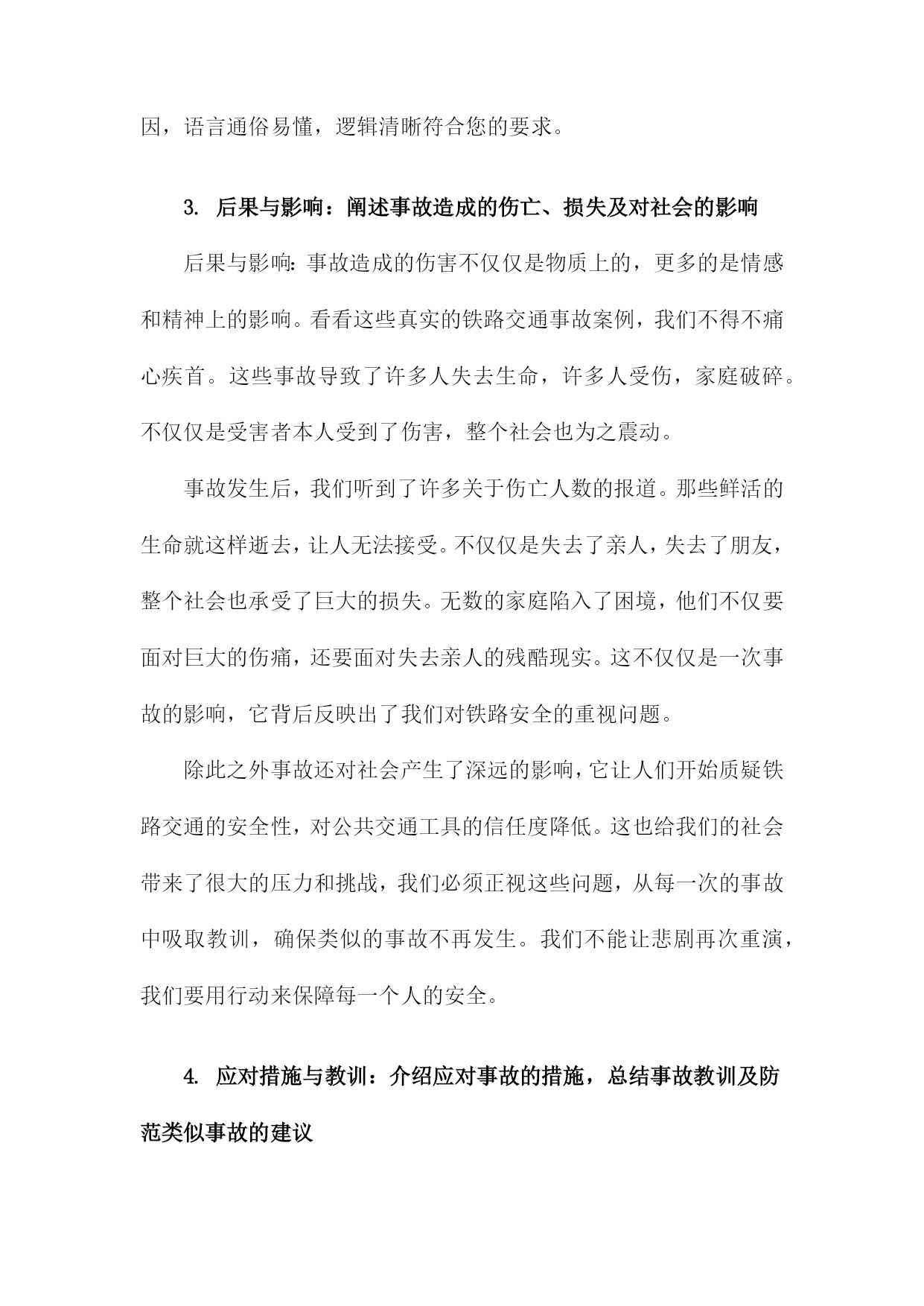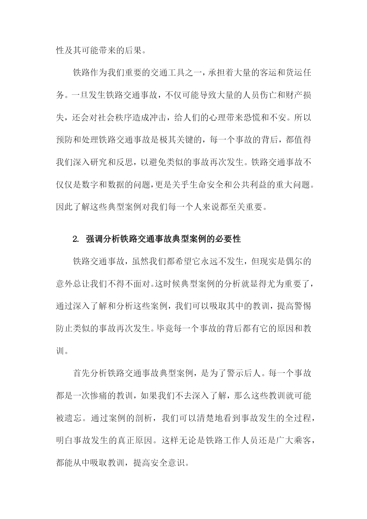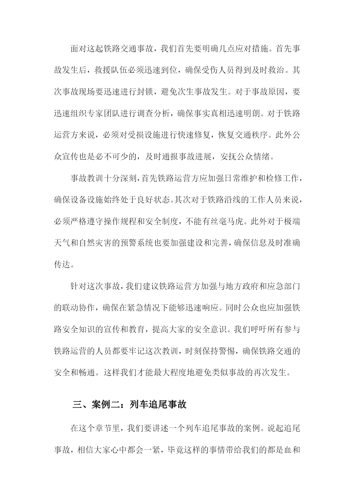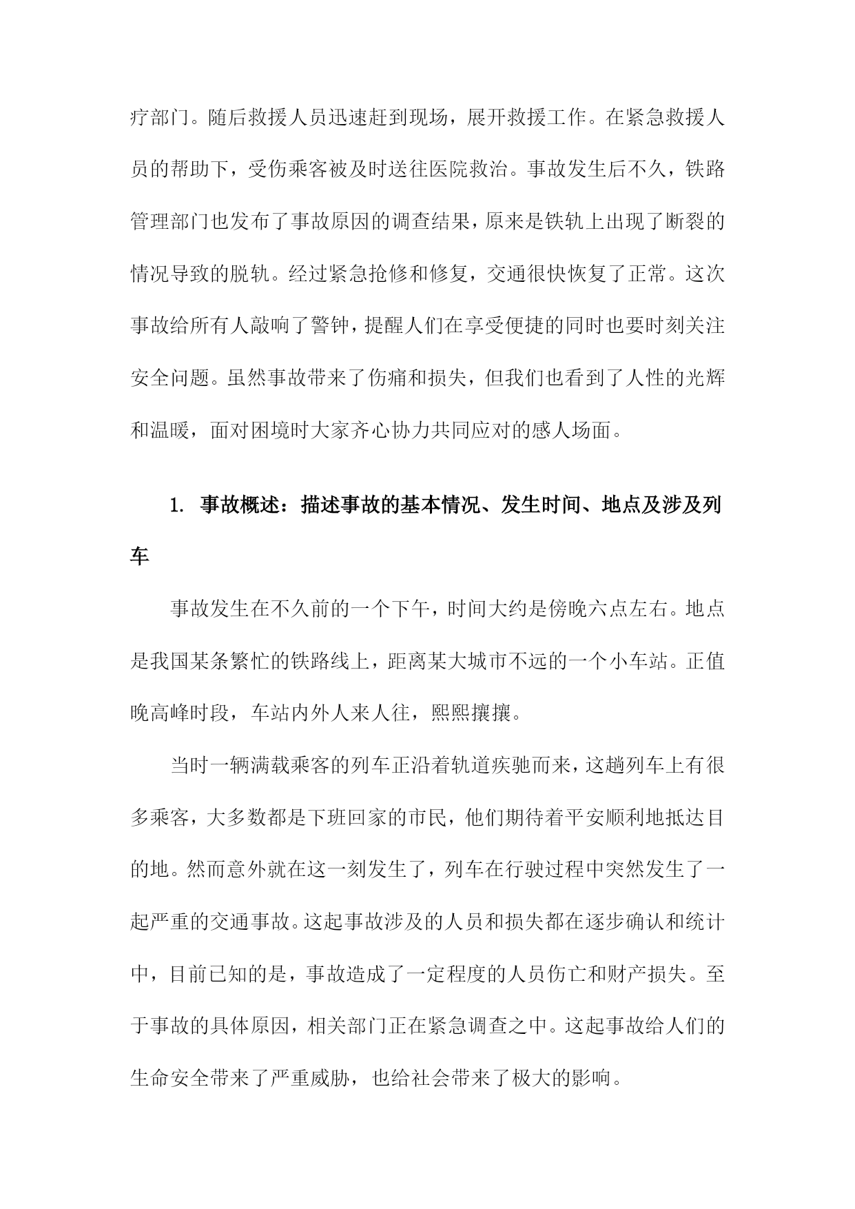 铁路交通事故典型案例一、内容描述铁路交通在我们的日常生活中扮演着重要的角色,连接着城市的每一个角落。然而事故总是难以避免,今天我们要讲述的,就是一些铁路交通事故的典型案例。这些案例都是真实发生在我们身边的,每一个事故背后,都有一个或多个令人心痛的故事。可能是列车脱轨、可能是追尾碰撞,也可能是由于人为操作失误导致的悲剧。这些事故不仅给人们的生命财产安全带来了巨大威胁,更是给社会公共安全敲响了警钟。这些案例不仅仅是对过去的回顾,更是对未来的警示。让我们共同关注铁路交通安全,避免类似的悲剧再次发生。毕竟每一条生命都是宝贵的,每一次事故都是我们不能承受的代价。接下来让我们一起深入了解这些铁路交通事故的典型案例。1.简述铁路交通事故的重要性及其对社会的影响在我们的日常生活中,铁路交通事故的影响是不容忽视的。每一次铁路事故的发生,都会牵动无数人的心,对社会的安全、秩序和人们的心理造成一定影响。接下来我们就来了解一下关于铁路交通事故的典型案例,不过在讲案例之前,我们得先明白铁路交通事故的重要性及其可能带来的后果。铁路作为我们重要的交通工具之一,承担着大量的客运和货运任务。一旦发生铁路交通事故,不仅可能导致大量的人员伤亡和财产损失,还会对社会秩序造成冲击,给人们的心理带来恐慌和不安。所以预防和处理铁路交通事故是极其关键的,每一个事故的背后,都值得我们深入研究和反思,以避免类似的事故再次发生。铁路交通事故不仅仅是数字和数据的问题,更是关乎生命安全和公共利益的重大问题。因此了解这些典型案例对我们每一个人来说都至关重要。2.强调分析铁路交通事故典型案例的必要性铁路交通事故,虽然我们都希望它永远不发生,但现实是偶尔的意外总让我们不得不面对。这时候典型案例的分析就显得尤为重要了,通过深入了解和分析这些案例,我们可以吸取其中的教训,提高警惕防止类似的事故再次发生。毕竟每一个事故的背后都有它的原因和教训。首先分析铁路交通事故典型案例,是为了警示后人。每一个事故都是一次惨痛的教训,如果我们不去深入了解,那么这些教训就可能被遗忘。通过案例的剖析,我们可以清楚地看到事故发生的全过程,明白事故发生的真正原因。这样无论是铁路工作人员还是广大乘客,都能从中吸取教训,提高安全意识。其次分析典型案例有助于找出铁路系统的漏洞和不足,铁路是一个庞大的交通系统,任何一个环节的失误都可能导致事故的发生。通过分析案例,我们可以发现系统中的薄弱环节,进而进行改进和完善。这样不仅可以提高铁路系统的安全性,也能让乘客更加安心地乘坐火车。再者案例分析有助于预防类似事故的发生,通过对事故原因进行深入分析,我们可以找到解决问题的方法,从而避免类似的事故再次发生。这不仅是对事故当事人的负责,更是对整个社会、对整个铁路交通系统的负责。铁路交通事故典型案例的分析是非常必要的,它不仅能帮助我们吸取教训、找出系统的不足,还能有效地预防类似事故的发生。让我们共同努力,通过深入分析和改进,让铁路交通更加安全、更加顺畅。二、案例一:列车脱轨事故在一个风和日丽的下午,一辆载满乘客的列车突然发生了脱轨事故。事故发生在一条弯曲的铁道上,突然间列车猛烈晃动,乘客们惊慌失措。由于列车突然脱轨,车上的乘客受伤情况较为严重。许多乘客都因为失去平衡而摔倒在车厢里,一片混乱之中。人们面对这种突发情况感到十分恐惧和无助,幸好在紧急情况下,列车工作人员迅速展开了救援行动,他们稳定了局面,并及时通知了铁路管理部门和医疗部门。随后救援人员迅速赶到现场,展开救援工作。在紧急救援人员的帮助下,受伤乘客被及时送往医院救治。事故发生后不久,铁路管理部门也发布了事故原因的调查结果,原来是铁轨上出现了断裂的情况导致的脱轨。经过紧急抢修和修复,交通很快恢复了正常。这次事故给所有人敲响了警钟,提醒人们在享受便捷的同时也要时刻关注安全问题。虽然事故带来了伤痛和损失,但我们也看到了人性的光辉和温暖,面对困境时大家齐心协力共同应对的感人场面。1.事故概述:描述事故的基本情况、发生时间、地点及涉及列车事故发生在不久前的一个下午,时间大约是傍晚六点左右。地点是我国某条繁忙的铁路线上,距离某大城市不远的一个小车站。正值晚高峰时段,车站内外人来人往,熙熙攘攘。当时一辆满载乘客的列车正沿着轨道疾驰而来,这趟列车上有很多乘客,大多数都是下班回家的市民,他们期待着平安顺利地抵达目的地。然而意外就在这一刻发生了,列车在行驶过程中突然发生了一起严重的交通事故。这起事故涉及的人员和损失都在逐步确认和统计中,目前已知的是,事故造成了一定程度的人员伤亡和财产损失。至于事故的具体原因,相关部门正在紧急调查之中。这起事故给人们的生命安全带来了严重威胁,也给社会带来了极大的影响。至于涉及的那趟列车,它是从大城市开往邻省的一趟重要班次。平日里这趟列车