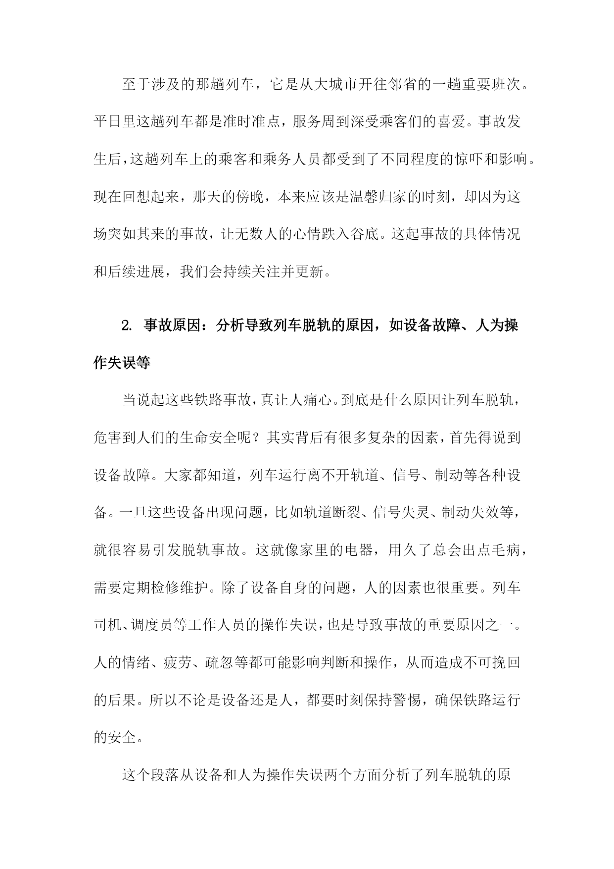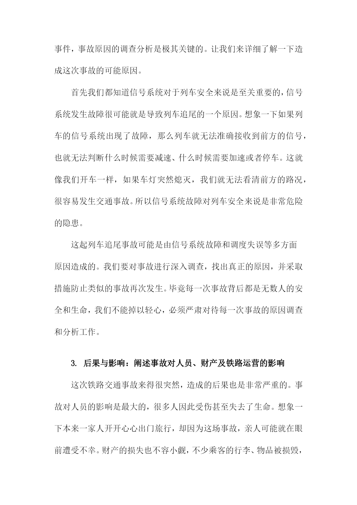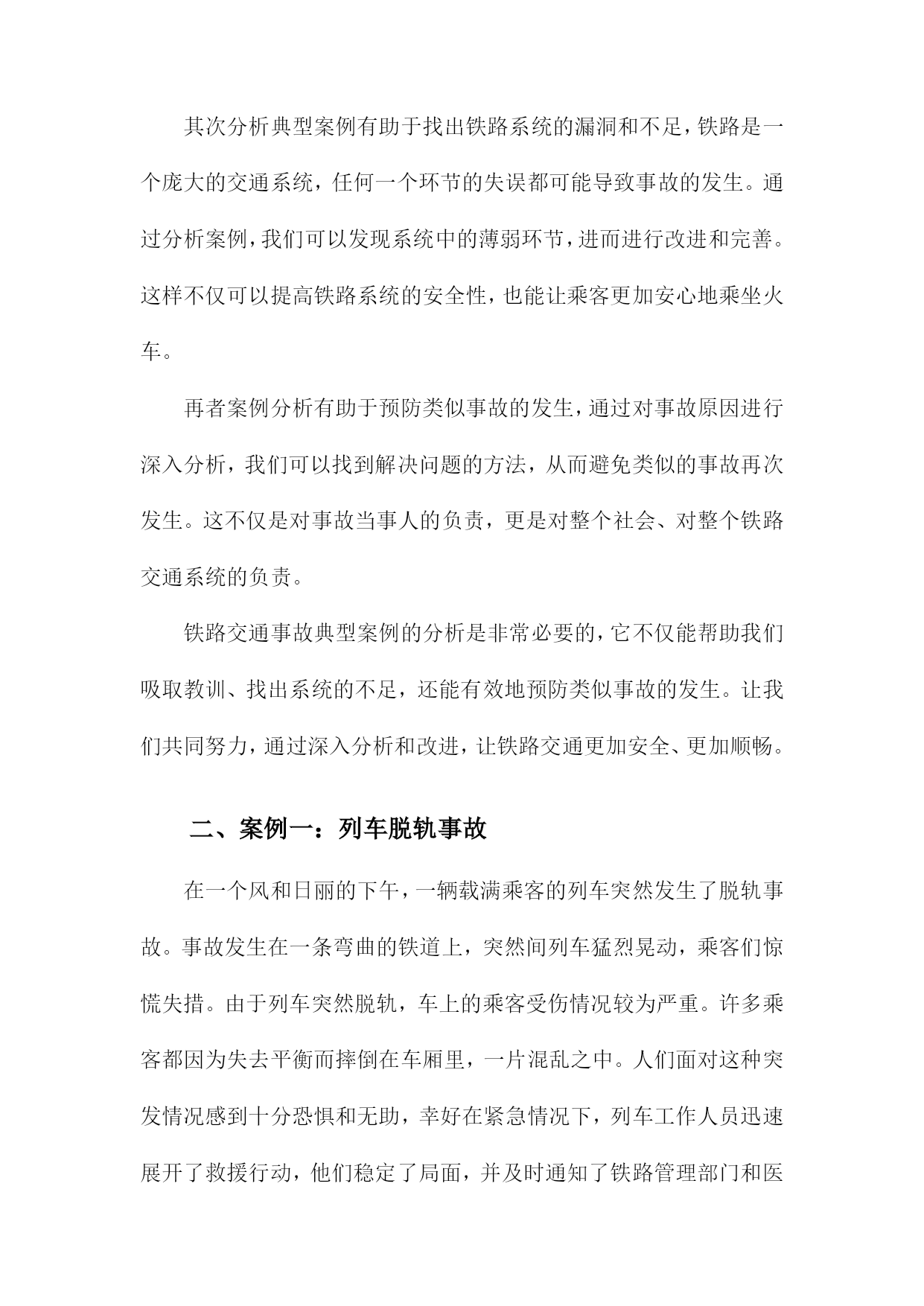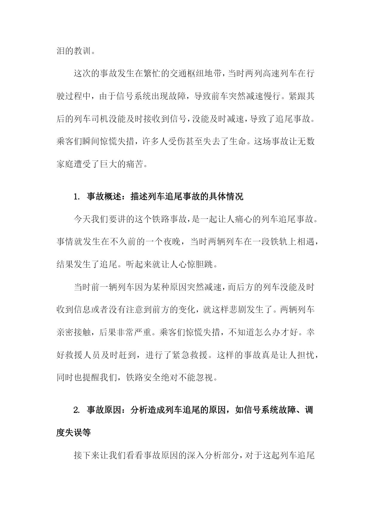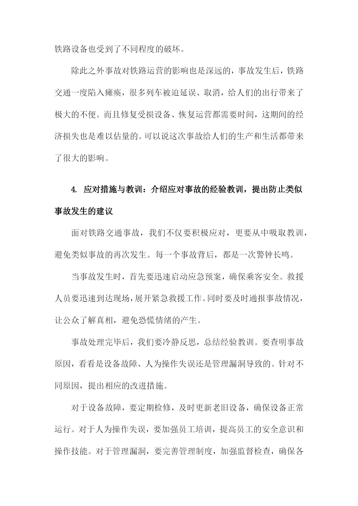 铁路交通事故典型案例一、内容描述铁路交通在我们的日常生活中扮演着重要的角色,连接着城市的每一个角落。然而事故总是难以避免,今天我们要讲述的,就是一些铁路交通事故的典型案例。这些案例都是真实发生在我们身边的,每一个事故背后,都有一个或多个令人心痛的故事。可能是列车脱轨、可能是追尾碰撞,也可能是由于人为操作失误导致的悲剧。这些事故不仅给人们的生命财产安全带来了巨大威胁,更是给社会公共安全敲响了警钟。这些案例不仅仅是对过去的回顾,更是对未来的警示。让我们共同关注铁路交通安全,避免类似的悲剧再次发生。毕竟每一条生命都是宝贵的,每一次事故都是我们不能承受的代价。接下来让我们一起深入了解这些铁路交通事故的典型案例。1.简述铁路交通事故的重要性及其对社会的影响在我们的日常生活中,铁路交通事故的影响是不容忽视的。每一次铁路事故的发生,都会牵动无数人的心,对社会的安全、秩序和人们的心理造成一定影响。接下来我们就来了解一下关于铁路交通事故的典型案例,不过在讲案例之前,我们得先明白铁路交通事故的重要性及其可能带来的后果。铁路作为我们重要的交通工具之一,承担着大量的客运和货运任务。一旦发生铁路交通事故,不仅可能导致大量的人员伤亡和财产损失,还会对社会秩序造成冲击,给人们的心理带来恐慌和不安。所以预防和处理铁路交通事故是极其关键的,每一个事故的背后,都值得我们深入研究和反思,以避免类似的事故再次发生。铁路交通事故不仅仅是数字和数据的问题,更是关乎生命安全和公共利益的重大问题。因此了解这些典型案例对我们每一个人来说都至关重要。2.强调分析铁路交通事故典型案例的必要性铁路交通事故,虽然我们都希望它永远不发生,但现实是偶尔的意外总让我们不得不面对。这时候典型案例的分析就显得尤为重要了,通过深入了解和分析这些案例,我们可以吸取其中的教训,提高警惕防止类似的事故再次发生。毕竟每一个事故的背后都有它的原因和教训。首先分析铁路交通事故典型案例,是为了警示后人。每一个事故都是一次惨痛的教训,如果我们不去深入了解,那么这些教训就可能被遗忘。通过案例的剖析,我们可以清楚地看到事故发生的全过程,明白事故发生的真正原因。这样无论是铁路工作人员还是广大乘客,都能从中吸取教训,提高安全意识。其次分析典型案例有助于找出铁路系统的漏洞和不足,铁路是一个庞大的交通系统,任何一个环节的失误都可能导致事故的发生。通过分析案例,我们可以发现系统中的薄弱环节,进而进行改进和完善。这样不仅可以提高铁路系统的安全性,也能让乘客更加安心地乘坐火车。再者案例分析有助于预防类似事故的发生,通过对事故原因进行深入分析,我们可以找到解决问题的方法,从而避免类似的事故再次发生。这不仅是对事故当事人的负责,更是对整个社会、对整个铁路交通系统的负责。铁路交通事故典型案例的分析是非常必要的,它不仅能帮助我们吸取教训、找出系统的不足,还能有效地预防类似事故的发生。让我们共同努力,通过深入分析和改进,让铁路交通更加安全、更加顺畅。二、案例一:列车脱轨事故在一个风和日丽的下午,一辆载满乘客的列车突然发生了脱轨事故。事故发生在一条弯曲的铁道上,突然间列车猛烈晃动,乘客们惊慌失措。由于列车突然脱轨,车上的乘客受伤情况较为严重。许多乘客都因为失去平衡而摔倒在车厢里,一片混乱之中。人们面对这种突发情况感到十分恐惧和无助,幸好在紧急情况下,列车工作人员迅速展开了救援行动,他们稳定了局面,并及时通知了铁路管理部门和医疗部门。随后救援人员迅速赶到现场,展开救援工作。在紧急救援人员的帮助下,受伤乘客被及时送往医院救治。事故发生后不久,铁路管理部门也发布了事故原因的调查结果,原来是铁轨上出现了断裂的情况导致的脱轨。经过紧急抢修和修复,交通很快恢复了正常。这次事故给所有人敲响了警钟,提醒人们在享受便捷的同时也要时刻关注安全问题。虽然事故带来了伤痛和损失,但我们也看到了人性的光辉和温暖,面对困境时大家齐心协力共同应对的感人场面。1.事故概述:描述事故的基本情况、发生时间、地点及涉及列车事故发生在不久前的一个下午,时间大约是傍晚六点左右。地点是我国某条繁忙的铁路线上,距离某大城市不远的一个小车站。正值晚高峰时段,车站内外人来人往,熙熙攘攘。当时一辆满载乘客的列车正沿着轨道疾驰而来,这趟列车上有很多乘客,大多数都是下班回家的市民,他们期待着平安顺利地抵达目的地。然而意外就在这一刻发生了,列车在行驶过程中突然发生了一起严重的交通事故。这起事故涉及的人员和损失都在逐步确认和统计中,目前已知的是,事故造成了一定程度的人员伤亡和财产损失。至于事故的具体原因,相关部门正在紧急调查之中。这起事故给人们的生命安全带来了严重威胁,也给社会带来了极大的影响。至于涉及的那趟列车,它是从大城市开往邻省的一趟重要班次。平日里这趟列车