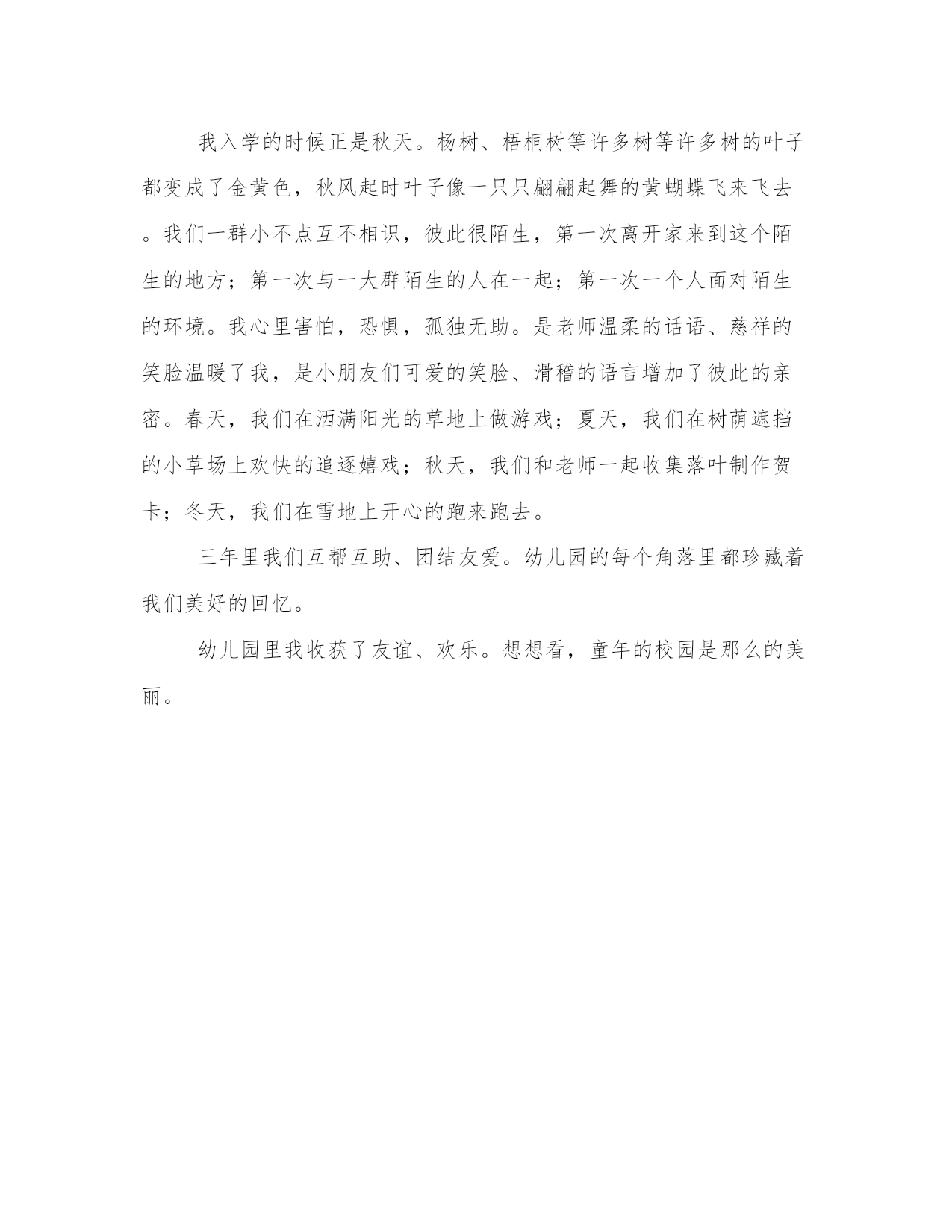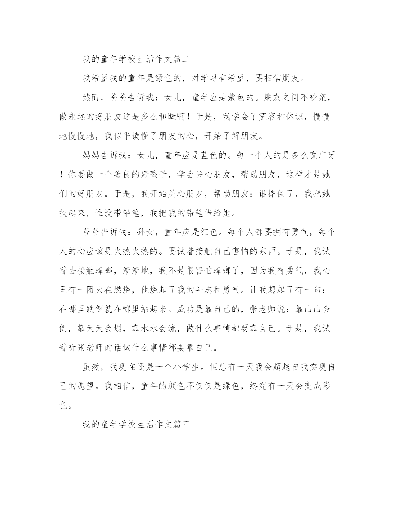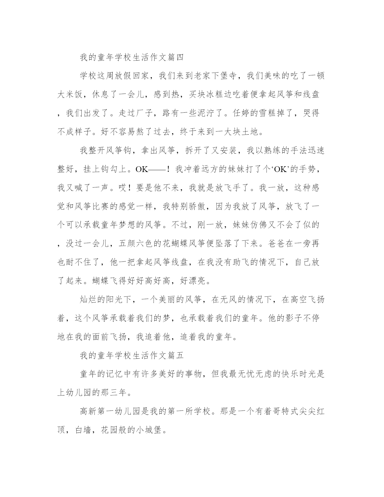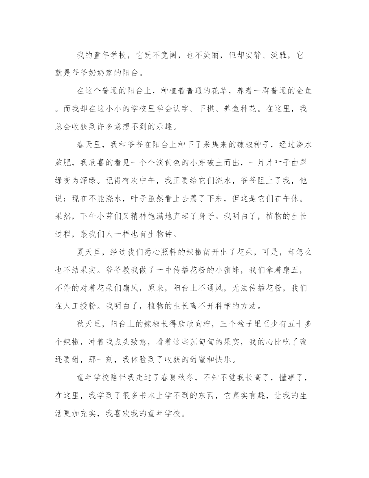 我的童年学校生活作文我的童年学校生活作文篇一每当我看到那一张大海的照片,我都会想起那次去象山在我6岁的时候,我和爸爸妈妈还有一些朋友一起驾车去象山。一路上,我心情激动极了!因为能看到大海!一到那里,我便想立刻冲到海边,可妈妈不让我去,说先把房间弄好!待会再去!我只好耐心等待。我们伴着大大小小的行李来到各自的房间。我走进去,窗户外望出去,能看到白色的沙滩和碧蓝的大海。我看的入迷了,回过神来,才知道要快点穿好泳衣,去海边玩。哇!大海好美丽哈!海水的波涛扬起水花,溅在我的脸上我尝了尝,呸呸!好咸!?太阳的光芒洒在海面上,使得海水闪闪发光,像海底藏着金子一样!我们齐心协力完成了一座城堡,城堡门前还有一座桥!夜晚,我们一行人在沙滩上散步,天空有无数颗星星。晚上的大海是那么美丽!远处的大山,一片漆黑。一些店在漆黑的夜里,特别亮堂。海水时不时地翻滚这些在城里都是看不到的。我伴随着海浪的音乐,进入了梦乡童年是那样美好,那样有趣,我快要失去它了!童年一去不复返,大家应该珍惜这段美好的时光!我的童年学校生活作文篇二我希望我的童年是绿色的,对学习有希望,要相信朋友。然而,爸爸告诉我:女儿,童年应是紫色的。朋友之间不吵架,做永远的好朋友这是多么和睦啊!于是,我学会了宽容和体谅,慢慢地慢慢地,我似乎读懂了朋友的心,开始了解朋友。妈妈告诉我:女儿,童年应是蓝色的。每一个人的是多么宽广呀!你要做一个善良的好孩子,学会关心朋友,帮助朋友,这样才是她们的好朋友。于是,我开始关心朋友,帮助朋友:谁摔倒了,我把她扶起来,谁没带铅笔,我把我的铅笔借给她。爷爷告诉我:孙女,童年应是红色。每个人都要拥有勇气,每个人的心应该是火热火热的。要试着接触自己害怕的东西。于是,我试着去接触蟑螂,渐渐地,我不是很害怕蟑螂了,因为我有勇气,我心里有一团火在燃烧,他烧起了我的斗志和勇气。让我想起了有一句:在哪里跌倒就在哪里站起来。成功是靠自己的,张老师说:靠山山会倒,靠天天会塌,靠水水会流,做什么事情都要靠自己。于是,我试着听张老师的话做什么事情都要靠自己。虽然,我现在还是一个小学生。但总有一天我会超越自我实现自己的愿望。我相信,童年的颜色不仅仅是绿色,终究有一天会变成彩色。我的童年学校生活作文篇三我的童年学校,它既不宽阔,也不美丽,但却安静、淡雅,它—就是爷爷奶奶家的阳台。在这个普通的阳台上,种植着普通的花草,养着一群普通的金鱼。而我却在这小小的学校里学会认字、下棋、养鱼种花。在这里,我总会收获到许多意想不到的乐趣。春天里,我和爷爷在阳台上种下了采集来的辣椒种子,经过浇水施肥,我欣喜的看见一个个淡黄色的小芽破土而出,一片片叶子由翠绿变为深绿。记得有次中午,我正要给它们浇水,爷爷阻止了我,他说:现在不能浇水,叶子虽然看上去蔫了下来,但这是它们在午休。果然,下午小芽们又精神饱满地直起了身子。我明白了,植物的生长过程,跟我们人一样也有生物钟。夏天里,经过我们悉心照料的辣椒苗开出了花朵,可是,却怎么也不结果实。爷爷教我做了一中传播花粉的小蜜蜂,我们拿着扇五,不停的对着花朵们扇风,原来,阳台上不通风,无法传播花粉,我们在人工授粉。我明白了,植物的生长离不开科学的方法。秋天里,阳台上的辣椒长得欣欣向柠,三个盆子里至少有五十多个辣椒,冲着我点头致意,看着这些沉甸甸的果实,我的心比吃了蜜还要甜,那一刻,我体验到了收获的甜蜜和快乐。童年学校陪伴我走过了春夏秋冬,不知不觉我长高了,懂事了,在这里,我学到了很多书本上学不到的东西,它真实有趣,让我的生活更加充实,我喜欢我的童年学校。我的童年学校生活作文篇四学校这周放假回家,我们来到老家下堡寺,我们美味的吃了一顿大米饭,休息了一会儿,感到热,买块冰糕边吃着便拿起风筝和线盘,我们出发了。走过厂子,路有一些泥泞了。任婷的雪糕掉了,哭得不成样子。好不容易熬了过去,终于来到一大块土地。我整开风筝钩,拿出风筝,拆开了又安装,我以熟练的手法迅速整好,挂上钩勾上。OK——!我冲着远方的妹妹打了个‘OK’的手势,我又喊了一声。哎!要是他不来,我就是放飞手了。我一放,这种感觉和风筝比赛的感觉一样,我特别骄傲,因为我放了风筝,放飞了一个可以承载童年梦想的风筝。不过,刚一放,妹妹仿佛又不会了似的,没过一会儿,五颜六色的花蝴蝶风筝便坠落了下来。爸爸在一旁再也耐不住了,他一把拿起风筝线盘,在我没有助飞的情况下,自己放了起来。蝴蝶飞得好好高好高,好漂亮。灿烂的阳光下,一个美丽的风筝,在无风的情况下,在高空飞扬着,这个风筝承载着我们的梦,也承载着我们的童年。他的影子不停地在我的面前飞扬,我追着他,追着我的童年。我的童年学校生活作文篇五童年的记忆中有许多美好的事物,但我最无忧无虑的快乐时光是上幼儿园的那三年。高新第一幼儿园是我的第