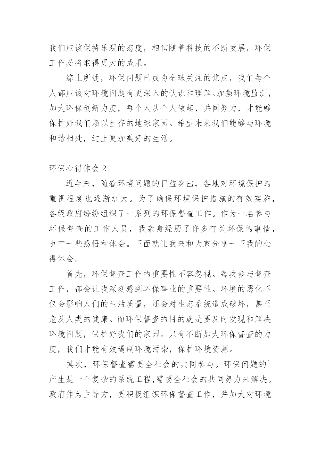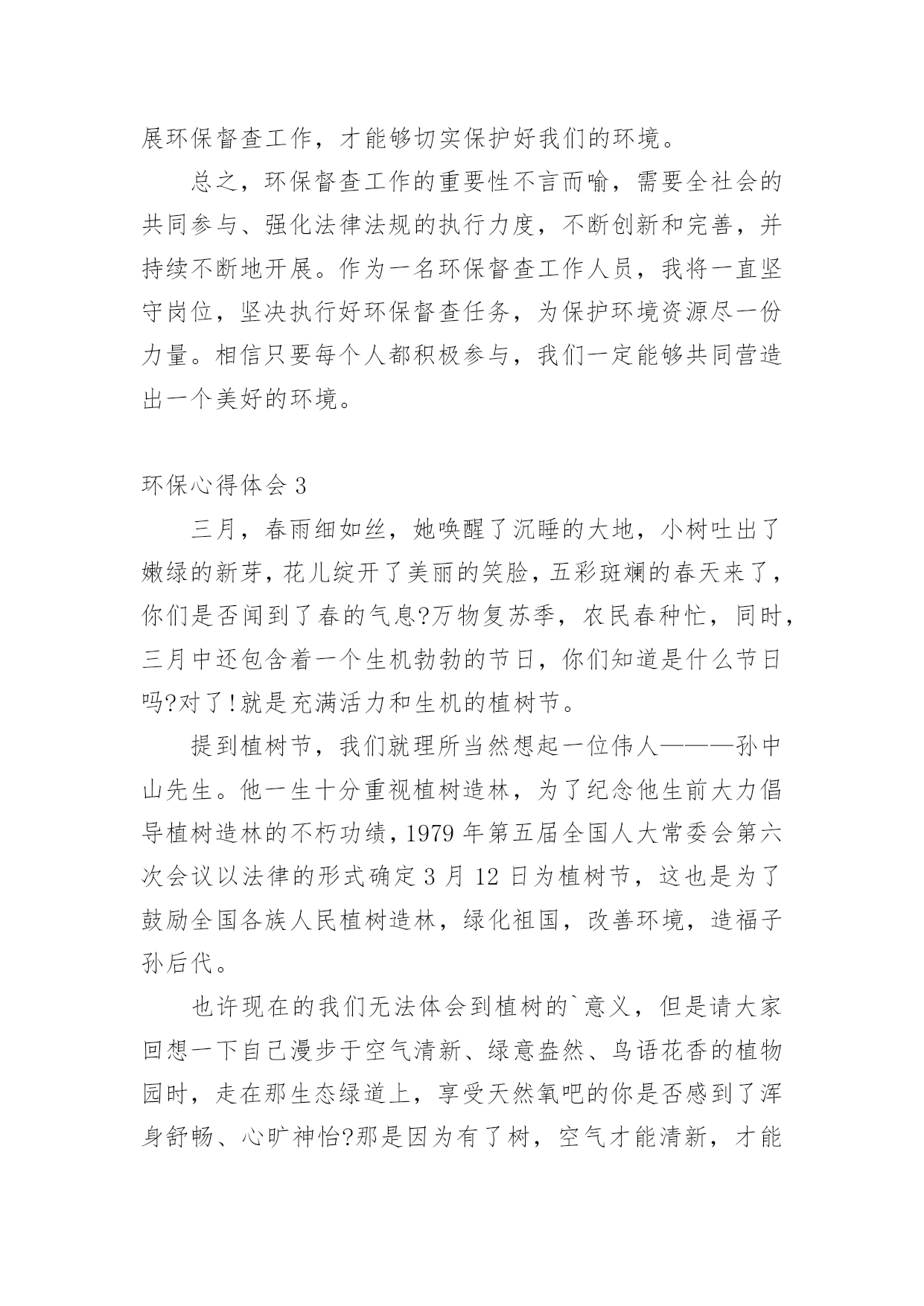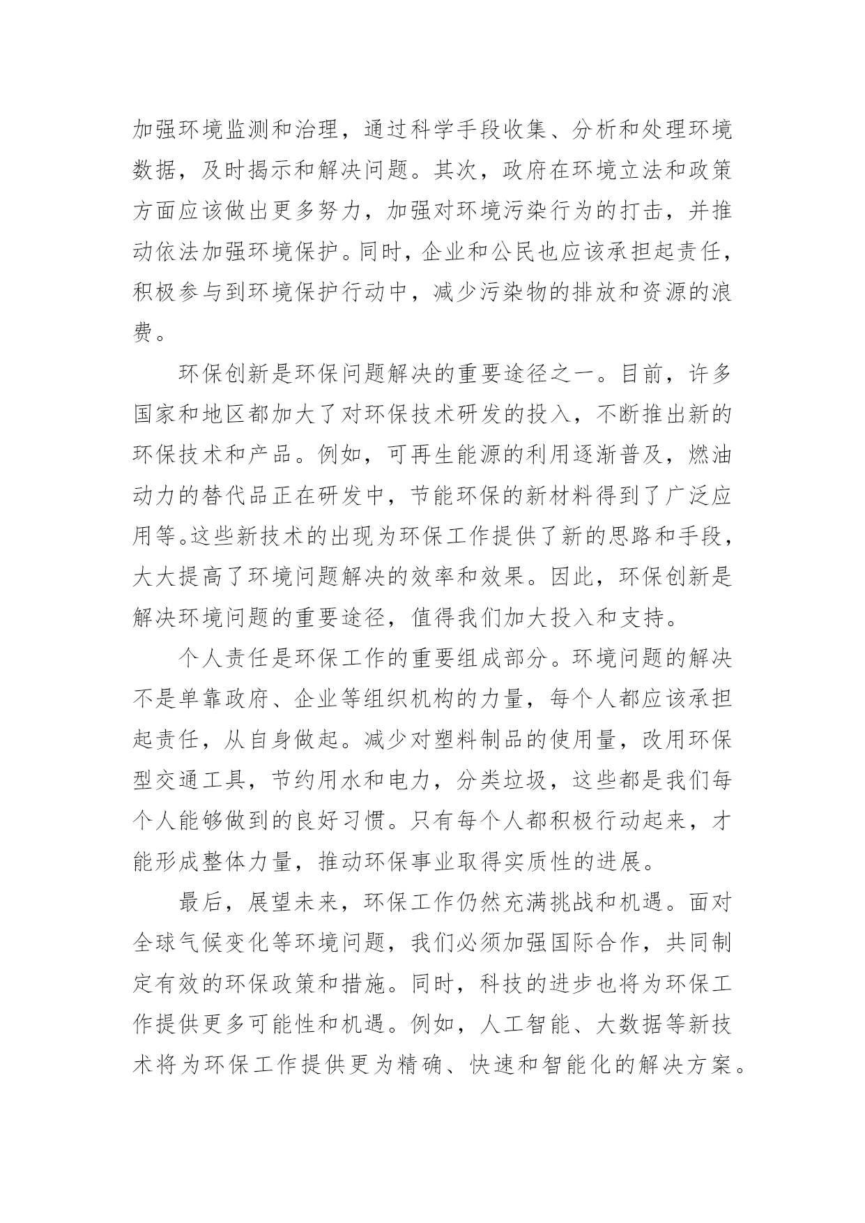 环保心得体会有了一些收获以后,就很有必要写一篇心得体会,这样就可以通过不断总结,丰富我们的思想。你想好怎么写心得体会了吗?以下是小编为大家收集的环保心得体会,欢迎大家借鉴与参考,希望对大家有所帮助。环保心得体会1近年来,环保已成为全球关注的热点话题。随着人们环保意识的觉醒和环保技术的不断发展,环境问题已成为摆在我们面前的一道严峻考题。我通过近期的环保宣传活动以及调查研究,对环保问题进行了深入思考和解析,从而深刻认识到环保的重要性。本文将分为五个部分,从环境问题的严峻性、环保的关键步骤、环保创新的重要性、个人责任和未来展望五个方面,对环保进行深入剖析和思考。首先,环境问题的严峻性引起了我的注意。调查数据显示,全球温室气体排放量不断攀升,大气污染日趋严重,水资源浪费和水污染现象频发,生物多样性急速减少等。这些问题直接威胁着人类的.生存和发展。人们应该意识到,只有保护好环境,才能保证人类能够在一个洁净、健康且可持续的环境中生活。每个人都应该把环保问题当作自己的责任,从个人做起,为改善环境状况做出自己的贡献。其次,环保的关键步骤是环境保护的根本。对环境问题进行解决和改善,需要采取一系列的措施。首先,我们应该加强环境监测和治理,通过科学手段收集、分析和处理环境数据,及时揭示和解决问题。其次,政府在环境立法和政策方面应该做出更多努力,加强对环境污染行为的打击,并推动依法加强环境保护。同时,企业和公民也应该承担起责任,积极参与到环境保护行动中,减少污染物的排放和资源的浪费。环保创新是环保问题解决的重要途径之一。目前,许多国家和地区都加大了对环保技术研发的投入,不断推出新的环保技术和产品。例如,可再生能源的利用逐渐普及,燃油动力的替代品正在研发中,节能环保的新材料得到了广泛应用等。这些新技术的出现为环保工作提供了新的思路和手段,大大提高了环境问题解决的效率和效果。因此,环保创新是解决环境问题的重要途径,值得我们加大投入和支持。个人责任是环保工作的重要组成部分。环境问题的解决不是单靠政府、企业等组织机构的力量,每个人都应该承担起责任,从自身做起。减少对塑料制品的使用量,改用环保型交通工具,节约用水和电力,分类垃圾,这些都是我们每个人能够做到的良好习惯。只有每个人都积极行动起来,才能形成整体力量,推动环保事业取得实质性的进展。最后,展望未来,环保工作仍然充满挑战和机遇。面对全球气候变化等环境问题,我们必须加强国际合作,共同制定有效的环保政策和措施。同时,科技的进步也将为环保工作提供更多可能性和机遇。例如,人工智能、大数据等新技术将为环保工作提供更为精确、快速和智能化的解决方案。我们应该保持乐观的态度,相信随着科技的不断发展,环保工作必将取得更大的成果。综上所述,环保问题已成为全球关注的焦点,我们每个人都应该对环境问题有更深入的认识和理解。加强环境监测,加大环保创新力度,每个人从个人做起,共同努力,才能够保护好我们赖以生存的地球家园。希望未来我们能够与环境和谐相处,过上更加美好的生活。环保心得体会2近年来,随着环境问题的日益突出,各地对环境保护的重视程度也逐渐加大。为了确保环境保护措施的有效实施,各级政府纷纷组织了一系列的环保督查工作。作为一名参与环保督查的工作人员,我亲身经历了许多有关环保的事情,也有一些感悟和体会。下面就让我来和大家分享一下我的心得体会。首先,环保督查工作的重要性不容忽视。每次参与督查工作,都会让我深刻感到环保事业的重要性。环境的恶化不仅会影响人们的生活质量,还会对生态系统造成破坏,甚至危及人类的健康。而环保督查的目的就是要及时发现和解决环境问题,保护好我们的家园。只有不断加大环保督查的力度,我们才能有效遏制环境污染,保护环境资源。其次,环保督查需要全社会的共同参与。环保问题的`产生是一个复杂的系统工程,需要全社会的共同努力来解决。政府作为主导方,要积极组织环保督查工作,并加大对环境问题的整治力度。企业作为主要污染源,要加强自身的环保意识,履行环境保护的责任。而普通群众也可以通过减少污染源的排放、保护环境资源等具体行动来参与环保事业。只有形成全社会共同参与的良好氛围,我们才能共同守护好我们美丽的家园。再次,环保督查工作需要强化法律法规的执行力度。在我参与的环保督查工作中,我发现有一些企业违法排放污染物,甚至存在假装整改等行为。这些都严重影响了环保督查工作的效果。因此,加强法律法规的执行力度势在必行。要加大对环境违法行为的打击力度,严惩违法者,同时加大宣传力度,提高企业和公众的环保意识。只有让违法者付出沉重的代价,我们才能更好地维护环境的美好。此外,环保督查工作需要不断创新和完善。随着环境问题的日益严重,环保督查也面临着越来越多的挑战。我们需要通过不断创新和完善,提高环境督查工作的效果。比如,利用现代科技手段,建立环境监测系统