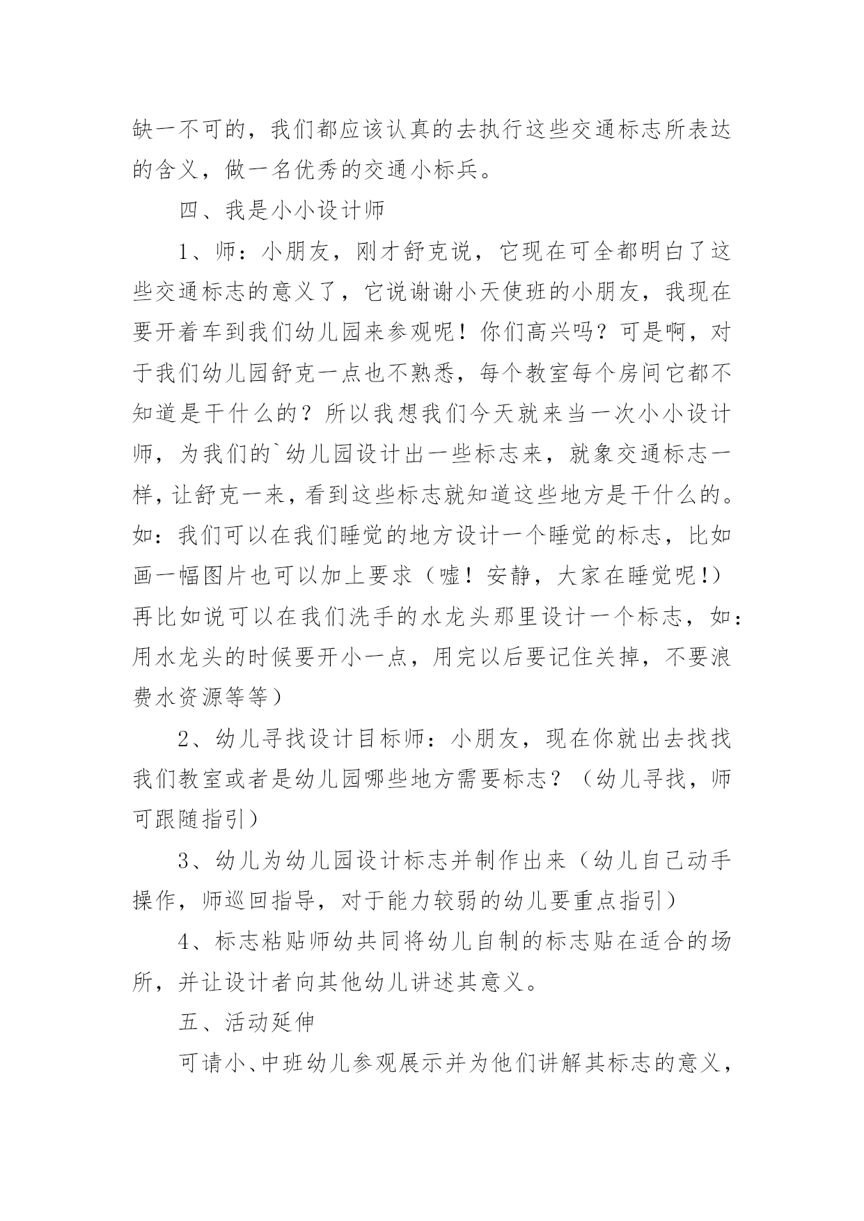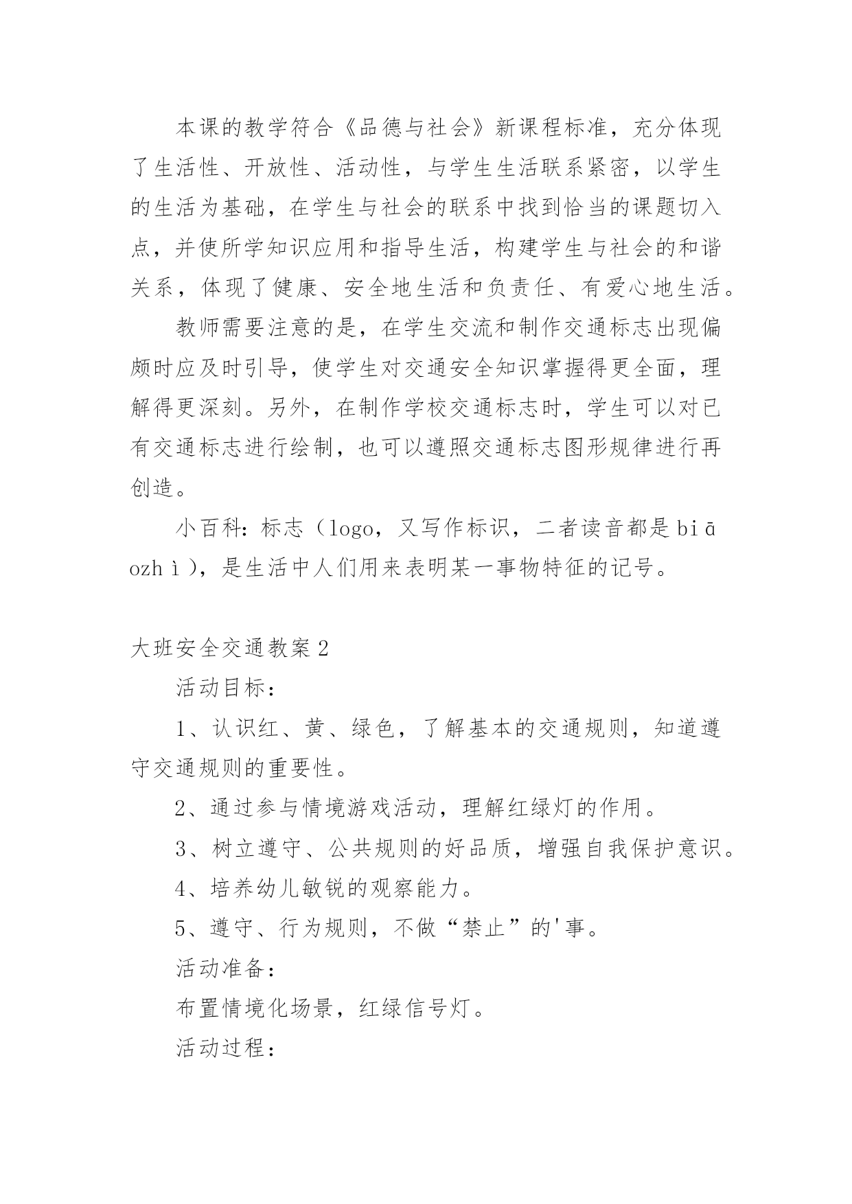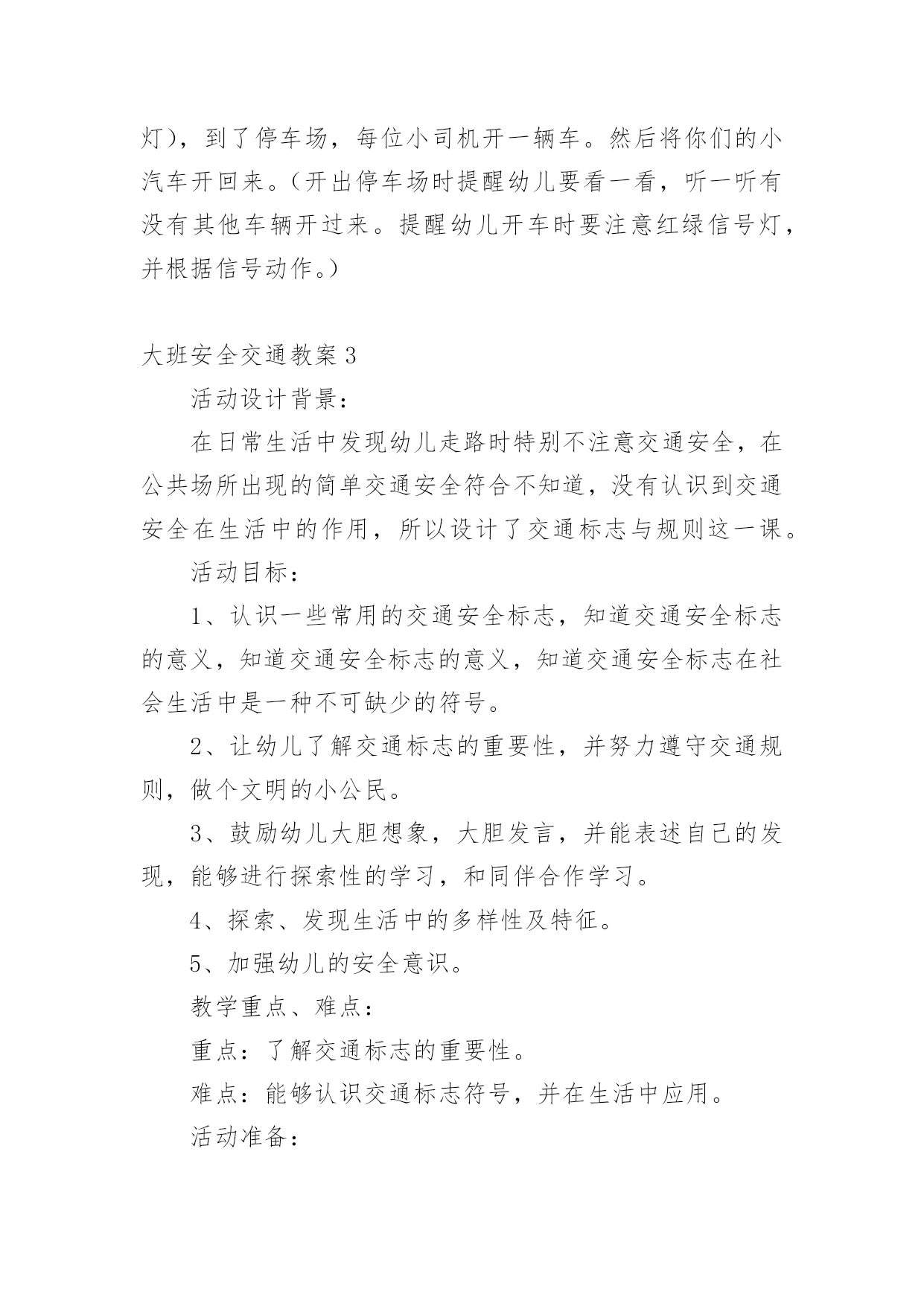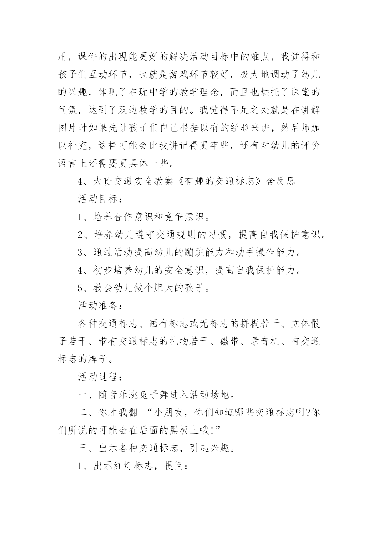 大班安全交通教案在教学工作者实际的教学活动中,时常需要编写教案,教案是教学活动的依据,有着重要的地位。那要怎么写好教案呢?下面是小编帮大家整理的大班安全交通教案,欢迎大家分享。大班安全交通教案1活动目标:1、认识常见的交通标志,知道标志是社会生活环境中不可缺少的一种符号;2、了解标志的作用和特征;3、培养幼儿的规则意识,激发幼儿对交通标志的兴趣。4、培养幼儿自我保护能力。5、增强安全意识,克制自己的好奇心,不去危险的地方玩耍。活动准备:1、准备各种交通标志图片、书籍若干。2、准备自制标志所需要的各种材料。3、小老鼠布偶一个活动过程:一、故事导入:师:小朋友,今天早上有个小动物委托我们帮他一个忙。到底是谁呢?它又遇到了什么困难呢?我们快一起来看看吧!(师出示布偶表演情景戏)师:前几天小老鼠舒克新买了一辆小汽车,这不今天早上它就开着它的小车来我们威海游玩,但是一进城,它发现我们的马路上到处有着很多它不认识的标志,这些标志它从来没有看见过,也不知道是什么意思,所以它不敢开车进城,只好来请教我们小朋友了!二、认识交通标志师:瞧!小老鼠舒克把这些交通标志都给画了下来,我们快一起来看看它们都代表着什么意思吧!(师出示各种交通标志的图片,请幼儿自由发表自己的意见,试着说出这些分别是什么标志,分别代表着什么意思)师:刚才小朋友都说出这些标志的意义,那到底说的对不对呢?慕老师来告诉你吧!(师详细讲解每个交通标志的名称及意义)游戏--我指你说:(教师可指出标志图片,让幼儿说出标志名称及含义,以让幼儿巩固复习)三、交通标志作用大师:现在我们都知道了很多交通工具的意义,那小朋友你们想象一下,如果我们生活中没有了这些交通标志,那会变成什么样子呢?(幼儿自由想象回答)师小结:交通标志在我们的生活中起着重要的作用,如果没有了交通标志,那马路上的车就会随意乱行,没有规则,互不谦让,很容易引起车祸;如果没有交通标志人们就不知道什么是停车场,那车辆就会随意停放,这对我们的行走和生活都会造成很大的影响;如果没有了交通工具,上班的时候马路就会混乱,这样会影响人们的工作的等等,所以我们可以看出交通标志是社会生活环境中不可缺少的一种符号;是缺一不可的,我们都应该认真的去执行这些交通标志所表达的含义,做一名优秀的交通小标兵。四、我是小小设计师1、师:小朋友,刚才舒克说,它现在可全都明白了这些交通标志的意义了,它说谢谢小天使班的小朋友,我现在要开着车到我们幼儿园来参观呢!你们高兴吗?可是啊,对于我们幼儿园舒克一点也不熟悉,每个教室每个房间它都不知道是干什么的?所以我想我们今天就来当一次小小设计师,为我们的`幼儿园设计出一些标志来,就象交通标志一样,让舒克一来,看到这些标志就知道这些地方是干什么的。如:我们可以在我们睡觉的地方设计一个睡觉的标志,比如画一幅图片也可以加上要求(嘘!安静,大家在睡觉呢!)再比如说可以在我们洗手的水龙头那里设计一个标志,如:用水龙头的时候要开小一点,用完以后要记住关掉,不要浪费水资源等等)2、幼儿寻找设计目标师:小朋友,现在你就出去找找我们教室或者是幼儿园哪些地方需要标志?(幼儿寻找,师可跟随指引)3、幼儿为幼儿园设计标志并制作出来(幼儿自己动手操作,师巡回指导,对于能力较弱的幼儿要重点指引)4、标志粘贴师幼共同将幼儿自制的标志贴在适合的场所,并让设计者向其他幼儿讲述其意义。五、活动延伸可请小、中班幼儿参观展示并为他们讲解其标志的意义,也可放学后让幼儿带领自己的父母去参观设计的标志。活动反思:我在教《认识交通标志》一课时,充分利用三年级学生好动、爱说的特点,从说入手,鼓励学生以自己的语言说出他们所观察、感受到的有关交通安全的情况,引导学生认识交通事故的严重危害,体验交通规则的重要性;通过交流讨论常见的交通标志,使学生树立安全意识,从而自觉遵守交通规则;在操作中了解各类交通标志的特点,以便遇到不认识的交通标志也能冷静判断,自觉遵守;最后通过为学校制作交通标志,进一步强化安全意识,并培养学生的主人翁责任感。最有效的学习是学生对学习过程的体验,它能给予学生自主构建知识和体验情感的时空,激发学生灵动思维火花。本课课前让学生实地调查,深入社会和生活得到自身的体验与感悟。课堂上充分发挥教师的引导作用,引导学生从问题入手,由浅入深地交流学习有关交通标志的知识,发挥学生的主观能动性,自主探索,寻找问题答案,充分体现了“以学生为本”的原则。并在认识的过程中,注意让交通标志指导学生的行动,强化了交通安全和自我保护意识。在应用提高阶段,激发了学生的主人翁意识,锻炼了学生的创造能力,在操作中更加深了学生对交通标志的理解和认识,内化了交通安全意识,将课堂知识学习与生活实际应用结合起来,这正是我们的教改方向。拓展延伸部分增强了学生的家庭责任感和社会责任感。本课的教学符合《