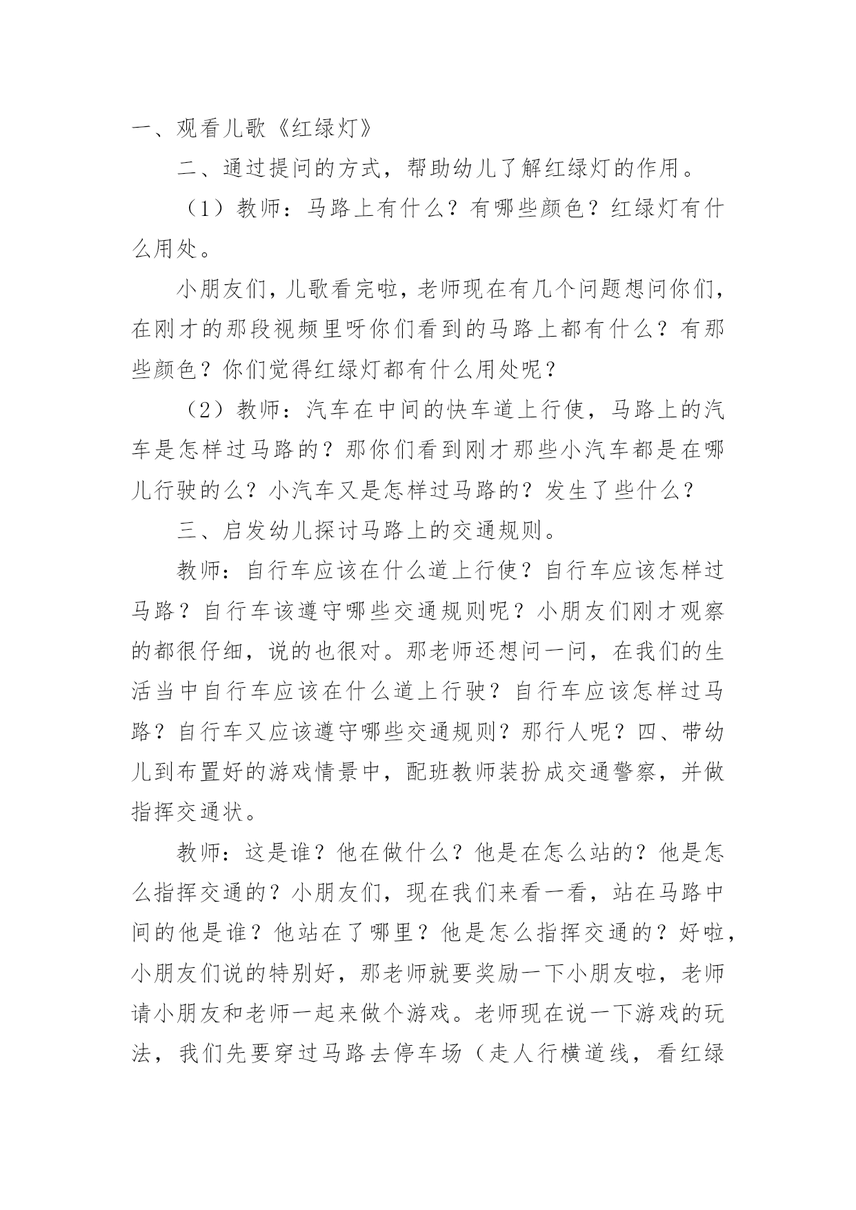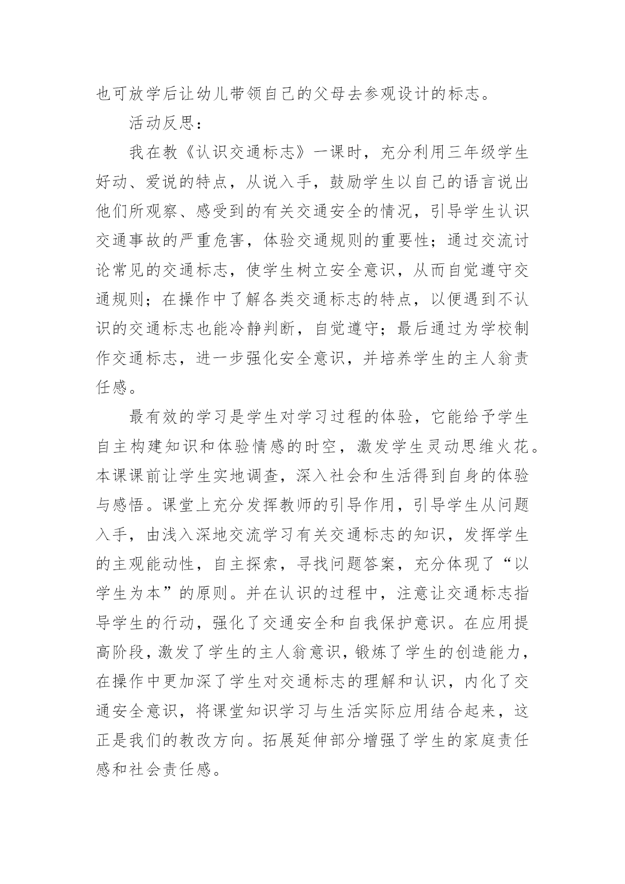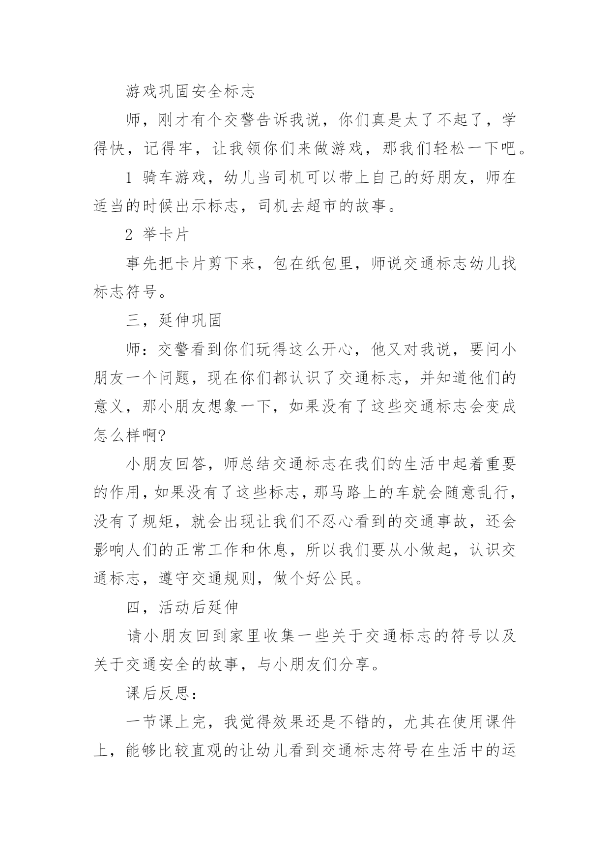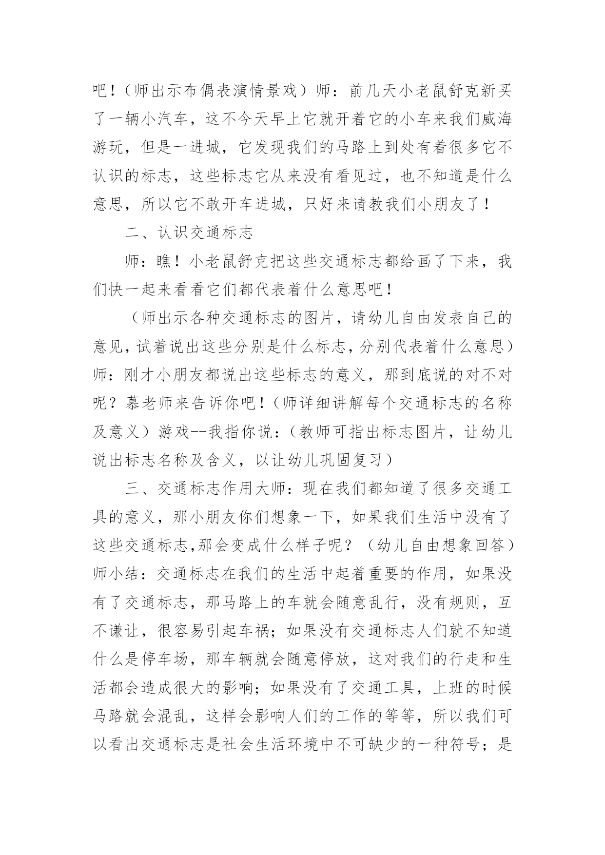 大班安全交通教案在教学工作者实际的教学活动中,时常需要编写教案,教案是教学活动的依据,有着重要的地位。那要怎么写好教案呢?下面是小编帮大家整理的大班安全交通教案,欢迎大家分享。大班安全交通教案1活动目标:1、认识常见的交通标志,知道标志是社会生活环境中不可缺少的一种符号;2、了解标志的作用和特征;3、培养幼儿的规则意识,激发幼儿对交通标志的兴趣。4、培养幼儿自我保护能力。5、增强安全意识,克制自己的好奇心,不去危险的地方玩耍。活动准备:1、准备各种交通标志图片、书籍若干。2、准备自制标志所需要的各种材料。3、小老鼠布偶一个活动过程:一、故事导入:师:小朋友,今天早上有个小动物委托我们帮他一个忙。到底是谁呢?它又遇到了什么困难呢?我们快一起来看看吧!(师出示布偶表演情景戏)师:前几天小老鼠舒克新买了一辆小汽车,这不今天早上它就开着它的小车来我们威海游玩,但是一进城,它发现我们的马路上到处有着很多它不认识的标志,这些标志它从来没有看见过,也不知道是什么意思,所以它不敢开车进城,只好来请教我们小朋友了!二、认识交通标志师:瞧!小老鼠舒克把这些交通标志都给画了下来,我们快一起来看看它们都代表着什么意思吧!(师出示各种交通标志的图片,请幼儿自由发表自己的意见,试着说出这些分别是什么标志,分别代表着什么意思)师:刚才小朋友都说出这些标志的意义,那到底说的对不对呢?慕老师来告诉你吧!(师详细讲解每个交通标志的名称及意义)游戏--我指你说:(教师可指出标志图片,让幼儿说出标志名称及含义,以让幼儿巩固复习)三、交通标志作用大师:现在我们都知道了很多交通工具的意义,那小朋友你们想象一下,如果我们生活中没有了这些交通标志,那会变成什么样子呢?(幼儿自由想象回答)师小结:交通标志在我们的生活中起着重要的作用,如果没有了交通标志,那马路上的车就会随意乱行,没有规则,互不谦让,很容易引起车祸;如果没有交通标志人们就不知道什么是停车场,那车辆就会随意停放,这对我们的行走和生活都会造成很大的影响;如果没有了交通工具,上班的时候马路就会混乱,这样会影响人们的工作的等等,所以我们可以看出交通标志是社会生活环境中不可缺少的一种符号;是缺一不可的,我们都应该认真的去执行这些交通标志所表达的含义,做一名优秀的交通小标兵。四、我是小小设计师1、师:小朋友,刚才舒克说,它现在可全都明白了这些交通标志的意义了,它说谢谢小天使班的小朋友,我现在要开着车到我们幼儿园来参观呢!你们高兴吗?可是啊,对于我们幼儿园舒克一点也不熟悉,每个教室每个房间它都不知道是干什么的?所以我想我们今天就来当一次小小设计师,为我们的`幼儿园设计出一些标志来,就象交通标志一样,让舒克一来,看到这些标志就知道这些地方是干什么的。如:我们可以在我们睡觉的地方设计一个睡觉的标志,比如画一幅图片也可以加上要求(嘘!安静,大家在睡觉呢!)再比如说可以在我们洗手的水龙头那里设计一个标志,如:用水龙头的时候要开小一点,用完以后要记住关掉,不要浪费水资源等等)2、幼儿寻找设计目标师:小朋友,现在你就出去找找我们教室或者是幼儿园哪些地方需要标志?(幼儿寻找,师可跟随指引)3、幼儿为幼儿园设计标志并制作出来(幼儿自己动手操作,师巡回指导,对于能力较弱的幼儿要重点指引)4、标志粘贴师幼共同将幼儿自制的标志贴在适合的场所,并让设计者向其他幼儿讲述其意义。五、活动延伸可请小、中班幼儿参观展示并为他们讲解其标志的意义,也可放学后让幼儿带领自己的父母去参观设计的标志。活动反思:我在教《认识交通标志》一课时,充分利用三年级学生好动、爱说的特点,从说入手,鼓励学生以自己的语言说出他们所观察、感受到的有关交通安全的情况,引导学生认识交通事故的严重危害,体验交通规则的重要性;通过交流讨论常见的交通标志,使学生树立安全意识,从而自觉遵守交通规则;在操作中了解各类交通标志的特点,以便遇到不认识的交通标志也能冷静判断,自觉遵守;最后通过为学校制作交通标志,进一步强化安全意识,并培养学生的主人翁责任感。最有效的学习是学生对学习过程的体验,它能给予学生自主构建知识和体验情感的时空,激发学生灵动思维火花。本课课前让学生实地调查,深入社会和生活得到自身的体验与感悟。课堂上充分发挥教师的引导作用,引导学生从问题入手,由浅入深地交流学习有关交通标志的知识,发挥学生的主观能动性,自主探索,寻找问题答案,充分体现了“以学生为本”的原则。并在认识的过程中,注意让交通标志指导学生的行动,强化了交通安全和自我保护意识。在应用提高阶段,激发了学生的主人翁意识,锻炼了学生的创造能力,在操作中更加深了学生对交通标志的理解和认识,内化了交通安全意识,将课堂知识学习与生活实际应用结合起来,这正是我们的教改方向。拓展延伸部分增强了学生的家庭责任感和社会责任感。本课的教学符合《
