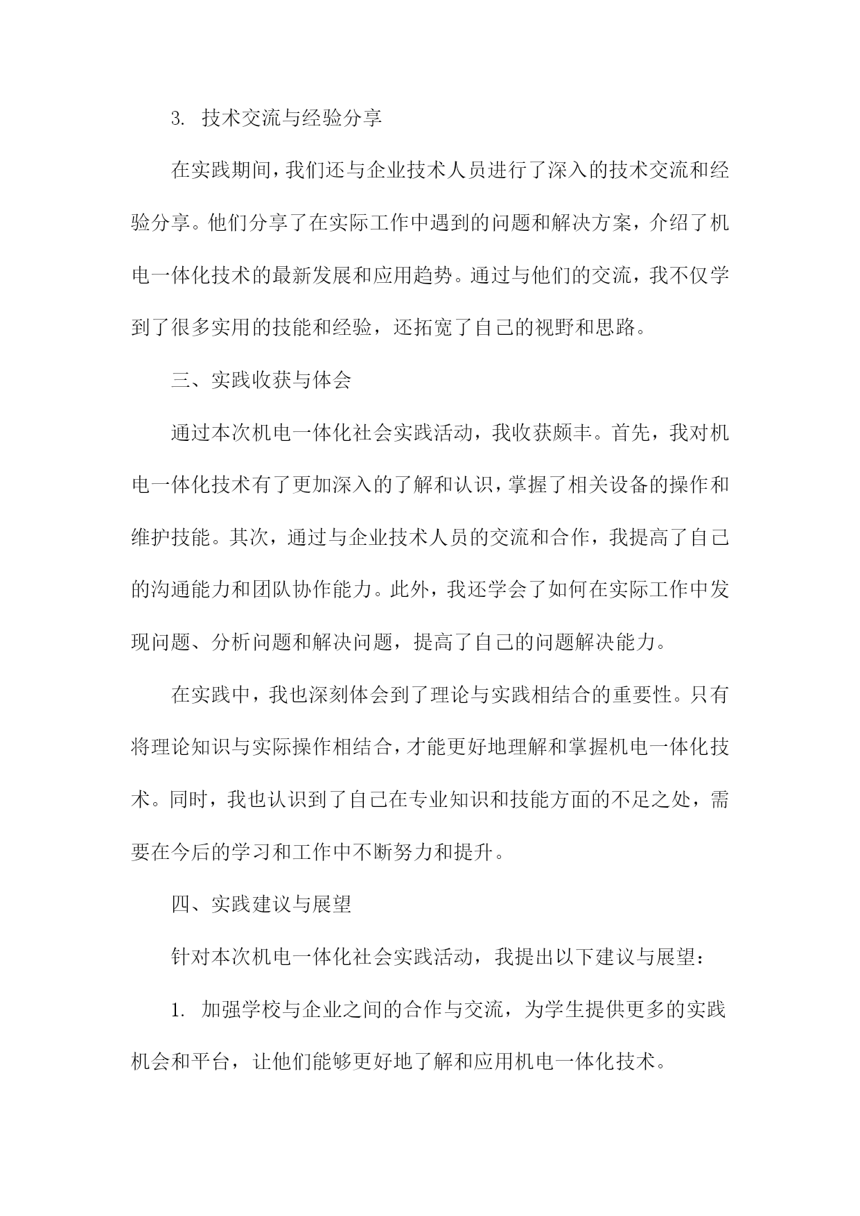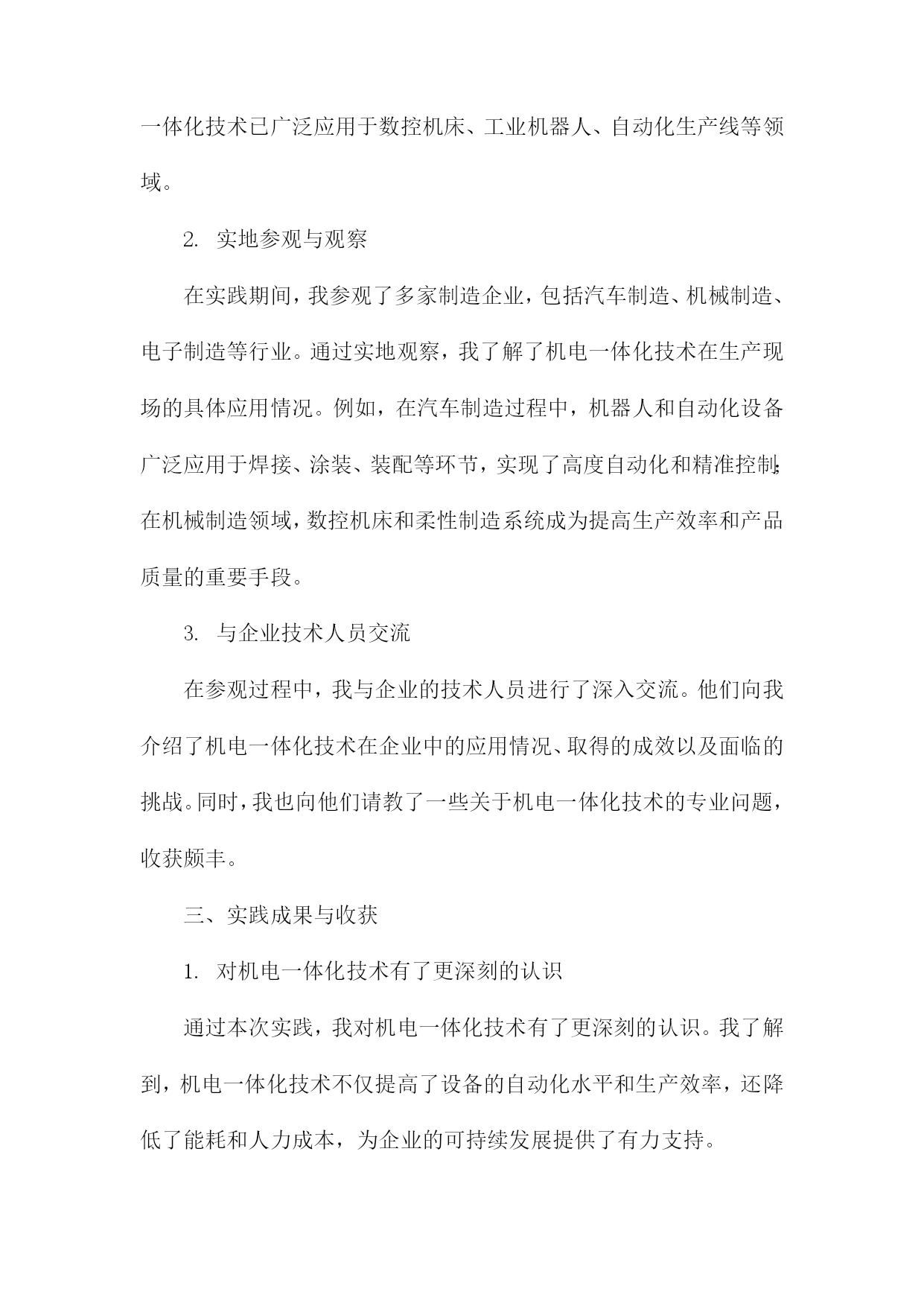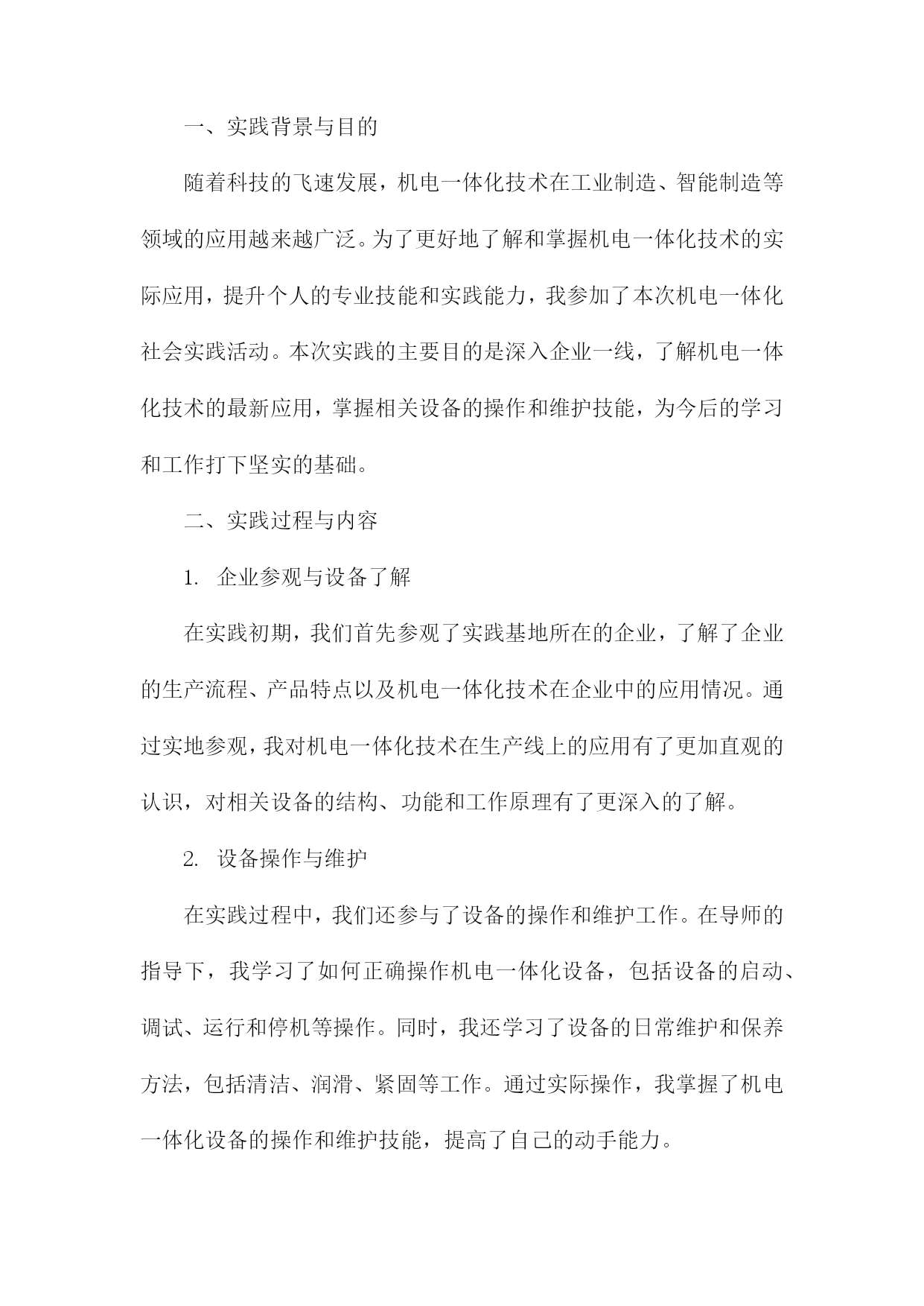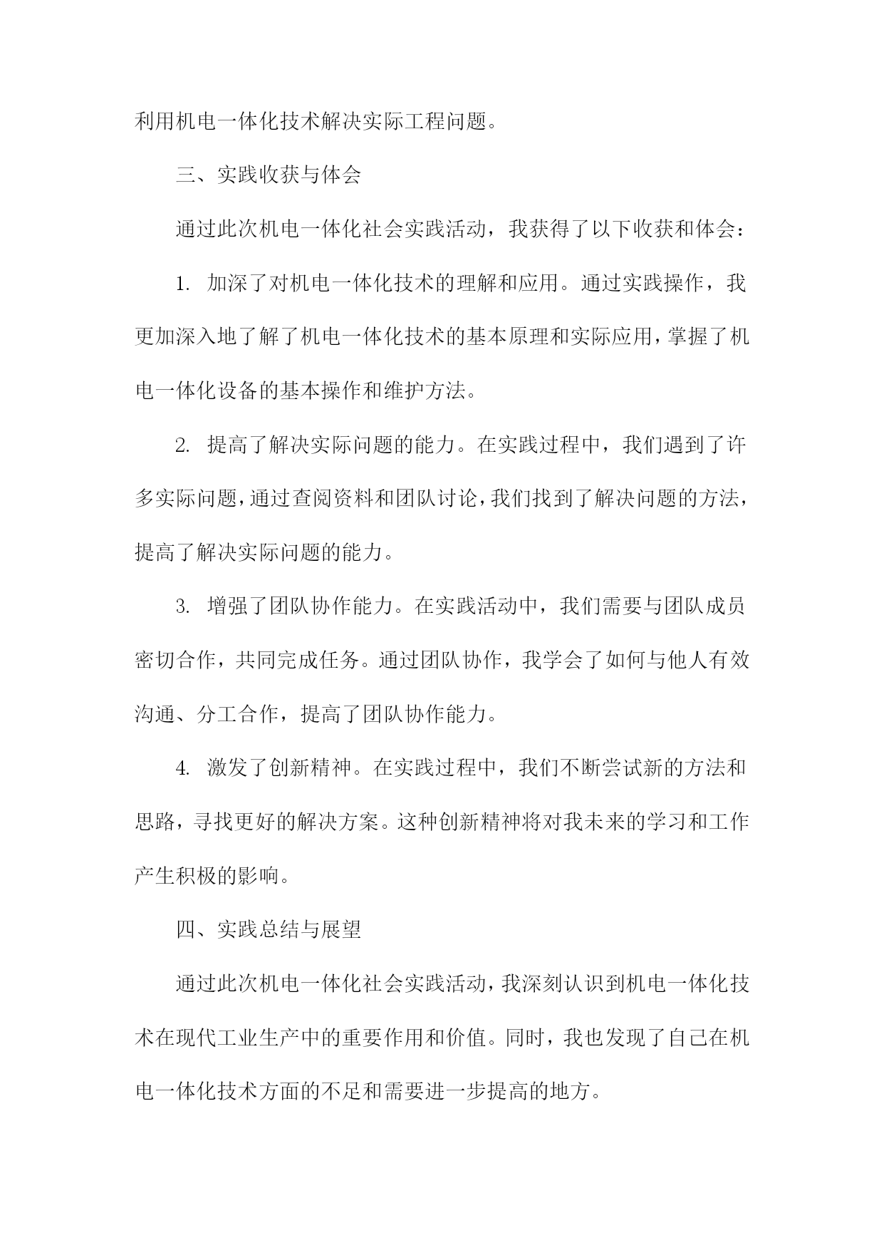机电一体化社会实践报告一、实践背景与目的随着科技的不断发展,机电一体化技术作为现代制造业的重要组成部分,其应用范围越来越广泛。为了更好地了解机电一体化技术在企业实际生产中的应用情况,提高个人的专业技能和实践能力,我参加了本次机电一体化社会实践活动。本次实践的目的在于深入企业一线,了解机电一体化设备的运行原理、维护保养以及故障排除等方面的知识,为今后的学习和工作打下坚实的基础。二、实践内容与方法本次实践活动主要围绕机电一体化设备在企业生产中的应用展开。我深入到了某机械制造企业的生产车间,对机电一体化设备的运行状况进行了观察和记录。同时,我还与企业的技术人员进行了深入交流,了解了设备的工作原理、维护保养和故障排除等方面的知识。此外,我还参与了设备的日常维护和保养工作,亲身体验了机电一体化技术在生产中的重要作用。三、实践成果与收获通过本次社会实践活动,我获得了以下成果和收获:1.了解了机电一体化设备在企业生产中的实际应用情况,对机电一体化技术有了更加深入的认识;2.掌握了机电一体化设备的运行原理、维护保养和故障排除等方面的基本知识和技能;3.提高了自己的动手能力和实践能力,增强了团队协作和沟通能力;4.增强了对机电一体化技术发展前景的信心,激发了进一步学习和研究的兴趣。四、实践总结与展望本次机电一体化社会实践活动让我深刻体会到了理论与实践相结合的重要性。通过亲身体验和实际操作,我不仅掌握了机电一体化技术的基本知识和技能,还提高了自己的动手能力和实践能力。同时,我也认识到了自己在专业技能和实践经验方面的不足,需要进一步加强学习和实践。展望未来,我将继续深入学习和研究机电一体化技术,不断提高自己的专业素养和实践能力。同时,我也将积极参与更多的社会实践活动,将所学知识运用到实际工作中,为企业的发展贡献自己的力量。五、建议与改进在本次实践活动中,我也发现了一些问题和不足之处,以下是一些建议和改进措施:1.加强与企业的沟通与合作:在实践活动开始前,应提前与企业进行充分的沟通,明确实践目标和任务,确保实践活动能够顺利进行。同时,也可以邀请企业技术人员作为实践指导,提供更为专业和具体的指导。2.多元化实践内容:本次实践主要聚焦于机电一体化设备的运行和维护,未来可以进一步拓展实践内容,如参与设备的研发、改进和创新等方面的工作,以更全面地了解机电一体化技术的应用和发展趋势。3.加强个人技能提升:针对自己在实践活动中暴露出的不足和短板,我将在今后的学习和实践中注重加强相关技能的提升和训练,如编程、调试、维修等方面的技能。4.推广实践成果:将本次实践活动的成果和经验进行总结和整理,形成报告或案例,并向更多的人群进行分享和推广,以激发更多人对机电一体化技术的兴趣和热情。通过本次机电一体化社会实践活动,我不仅获得了宝贵的实践经验,还提高了自己的专业素养和实践能力。我相信,在未来的学习和工作中,我将能够更好地运用机电一体化技术,为企业的发展和社会的进步贡献自己的力量。机电一体化社会实践报告(1)一、实践背景与目的随着科技的飞速发展,机电一体化技术在工业制造、智能制造等领域的应用越来越广泛。为了更好地了解和掌握机电一体化技术的实际应用,提升个人的专业技能和实践能力,我参加了本次机电一体化社会实践活动。本次实践的主要目的是深入企业一线,了解机电一体化技术的最新应用,掌握相关设备的操作和维护技能,为今后的学习和工作打下坚实的基础。二、实践过程与内容1.企业参观与设备了解在实践初期,我们首先参观了实践基地所在的企业,了解了企业的生产流程、产品特点以及机电一体化技术在企业中的应用情况。通过实地参观,我对机电一体化技术在生产线上的应用有了更加直观的认识,对相关设备的结构、功能和工作原理有了更深入的了解。2.设备操作与维护在实践过程中,我们还参与了设备的操作和维护工作。在导师的指导下,我学习了如何正确操作机电一体化设备,包括设备的启动、调试、运行和停机等操作。同时,我还学习了设备的日常维护和保养方法,包括清洁、润滑、紧固等工作。通过实际操作,我掌握了机电一体化设备的操作和维护技能,提高了自己的动手能力。3.技术交流与经验分享在实践期间,我们还与企业技术人员进行了深入的技术交流和经验分享。他们分享了在实际工作中遇到的问题和解决方案,介绍了机电一体化技术的最新发展和应用趋势。通过与他们的交流,我不仅学到了很多实用的技能和经验,还拓宽了自己的视野和思路。三、实践收获与体会通过本次机电一体化社会实践活动,我收获颇丰。首先,我对机电一体化技术有了更加深入的了解和认识,掌握了相关设备的操作和维护技能。其次,通过与企业技术人员的交流和合作,我提高了自己的沟通能力和团队协作能力。此外,我还学会了如何在实际工作中发现问题、分析问