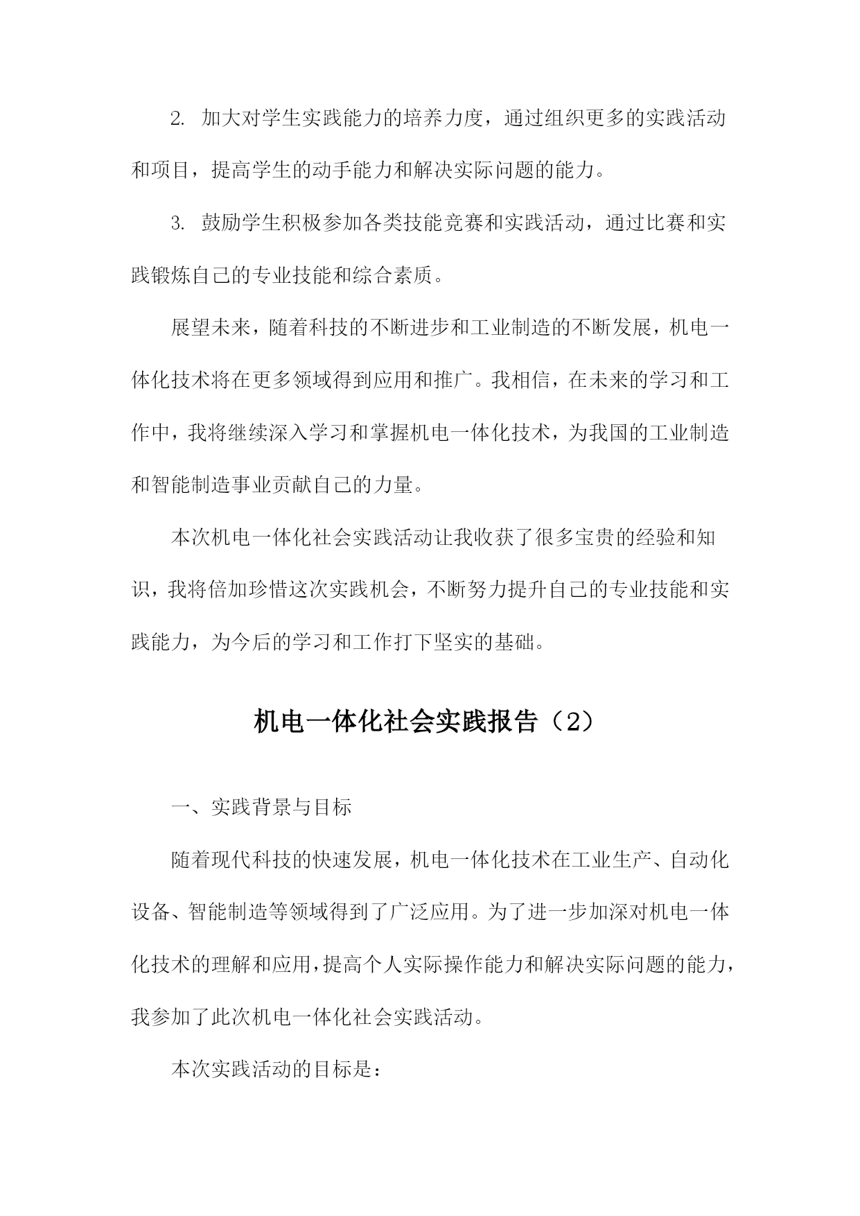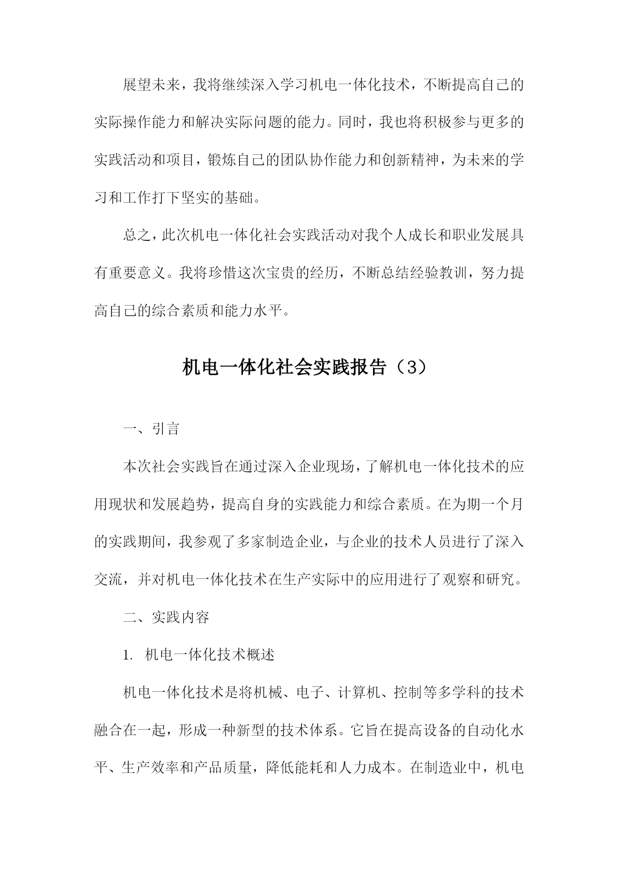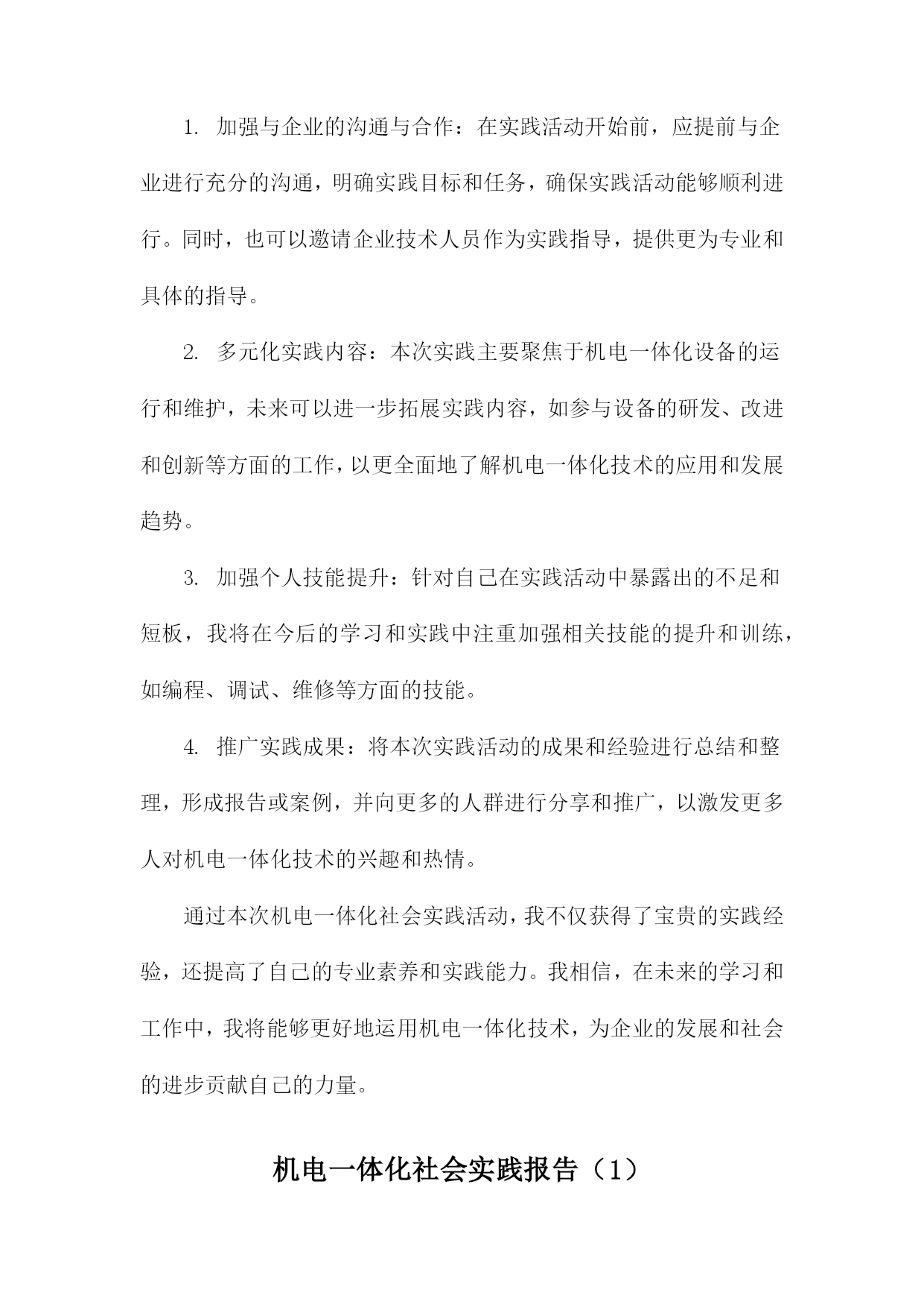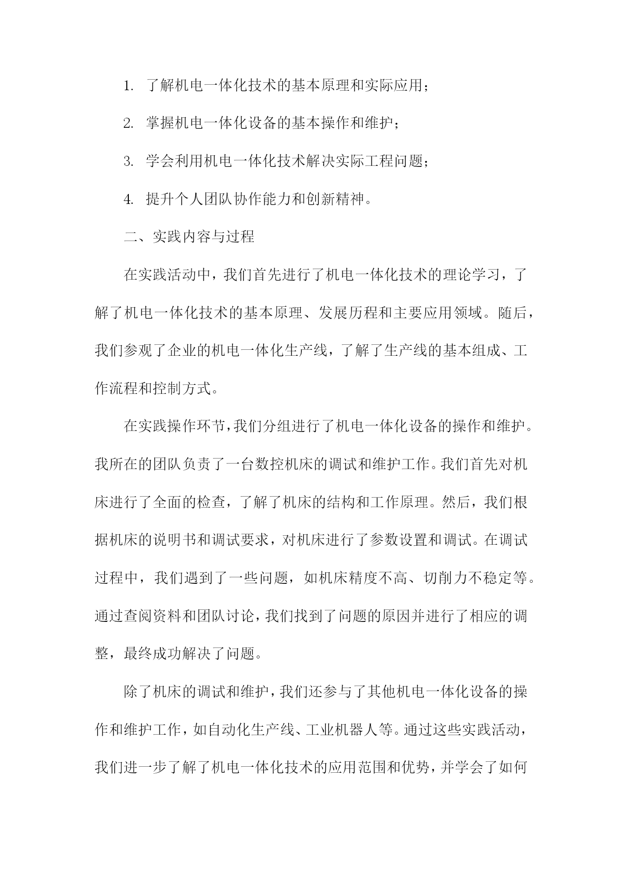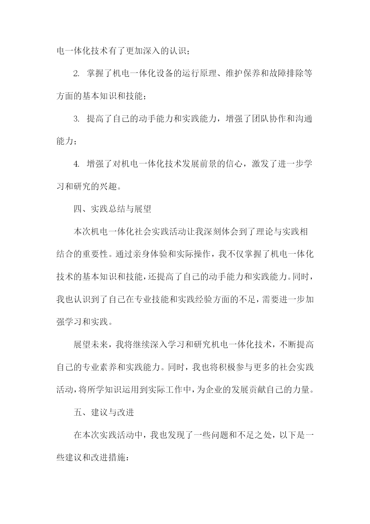 机电一体化社会实践报告一、实践背景与目的随着科技的不断发展,机电一体化技术作为现代制造业的重要组成部分,其应用范围越来越广泛。为了更好地了解机电一体化技术在企业实际生产中的应用情况,提高个人的专业技能和实践能力,我参加了本次机电一体化社会实践活动。本次实践的目的在于深入企业一线,了解机电一体化设备的运行原理、维护保养以及故障排除等方面的知识,为今后的学习和工作打下坚实的基础。二、实践内容与方法本次实践活动主要围绕机电一体化设备在企业生产中的应用展开。我深入到了某机械制造企业的生产车间,对机电一体化设备的运行状况进行了观察和记录。同时,我还与企业的技术人员进行了深入交流,了解了设备的工作原理、维护保养和故障排除等方面的知识。此外,我还参与了设备的日常维护和保养工作,亲身体验了机电一体化技术在生产中的重要作用。三、实践成果与收获通过本次社会实践活动,我获得了以下成果和收获:1.了解了机电一体化设备在企业生产中的实际应用情况,对机电一体化技术有了更加深入的认识;2.掌握了机电一体化设备的运行原理、维护保养和故障排除等方面的基本知识和技能;3.提高了自己的动手能力和实践能力,增强了团队协作和沟通能力;4.增强了对机电一体化技术发展前景的信心,激发了进一步学习和研究的兴趣。四、实践总结与展望本次机电一体化社会实践活动让我深刻体会到了理论与实践相结合的重要性。通过亲身体验和实际操作,我不仅掌握了机电一体化技术的基本知识和技能,还提高了自己的动手能力和实践能力。同时,我也认识到了自己在专业技能和实践经验方面的不足,需要进一步加强学习和实践。展望未来,我将继续深入学习和研究机电一体化技术,不断提高自己的专业素养和实践能力。同时,我也将积极参与更多的社会实践活动,将所学知识运用到实际工作中,为企业的发展贡献自己的力量。五、建议与改进在本次实践活动中,我也发现了一些问题和不足之处,以下是一些建议和改进措施:1.加强与企业的沟通与合作:在实践活动开始前,应提前与企业进行充分的沟通,明确实践目标和任务,确保实践活动能够顺利进行。同时,也可以邀请企业技术人员作为实践指导,提供更为专业和具体的指导。2.多元化实践内容:本次实践主要聚焦于机电一体化设备的运行和维护,未来可以进一步拓展实践内容,如参与设备的研发、改进和创新等方面的工作,以更全面地了解机电一体化技术的应用和发展趋势。3.加强个人技能提升:针对自己在实践活动中暴露出的不足和短板,我将在今后的学习和实践中注重加强相关技能的提升和训练,如编程、调试、维修等方面的技能。4.推广实践成果:将本次实践活动的成果和经验进行总结和整理,形成报告或案例,并向更多的人群进行分享和推广,以激发更多人对机电一体化技术的兴趣和热情。通过本次机电一体化社会实践活动,我不仅获得了宝贵的实践经验,还提高了自己的专业素养和实践能力。我相信,在未来的学习和工作中,我将能够更好地运用机电一体化技术,为企业的发展和社会的进步贡献自己的力量。机电一体化社会实践报告(1)一、实践背景与目的随着科技的飞速发展,机电一体化技术在工业制造、智能制造等领域的应用越来越广泛。为了更好地了解和掌握机电一体化技术的实际应用,提升个人的专业技能和实践能力,我参加了本次机电一体化社会实践活动。本次实践的主要目的是深入企业一线,了解机电一体化技术的最新应用,掌握相关设备的操作和维护技能,为今后的学习和工作打下坚实的基础。二、实践过程与内容1.企业参观与设备了解在实践初期,我们首先参观了实践基地所在的企业,了解了企业的生产流程、产品特点以及机电一体化技术在企业中的应用情况。通过实地参观,我对机电一体化技术在生产线上的应用有了更加直观的认识,对相关设备的结构、功能和工作原理有了更深入的了解。2.设备操作与维护在实践过程中,我们还参与了设备的操作和维护工作。在导师的指导下,我学习了如何正确操作机电一体化设备,包括设备的启动、调试、运行和停机等操作。同时,我还学习了设备的日常维护和保养方法,包括清洁、润滑、紧固等工作。通过实际操作,我掌握了机电一体化设备的操作和维护技能,提高了自己的动手能力。3.技术交流与经验分享在实践期间,我们还与企业技术人员进行了深入的技术交流和经验分享。他们分享了在实际工作中遇到的问题和解决方案,介绍了机电一体化技术的最新发展和应用趋势。通过与他们的交流,我不仅学到了很多实用的技能和经验,还拓宽了自己的视野和思路。三、实践收获与体会通过本次机电一体化社会实践活动,我收获颇丰。首先,我对机电一体化技术有了更加深入的了解和认识,掌握了相关设备的操作和维护技能。其次,通过与企业技术人员的交流和合作,我提高了自己的沟通能力和团队协作能力。此外,我还学会了如何在实际工作中发现问题、分析问