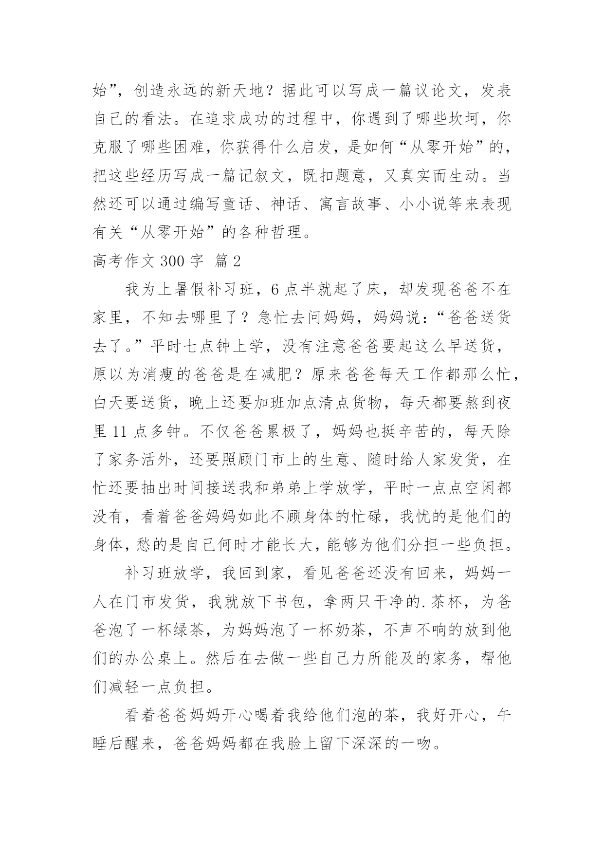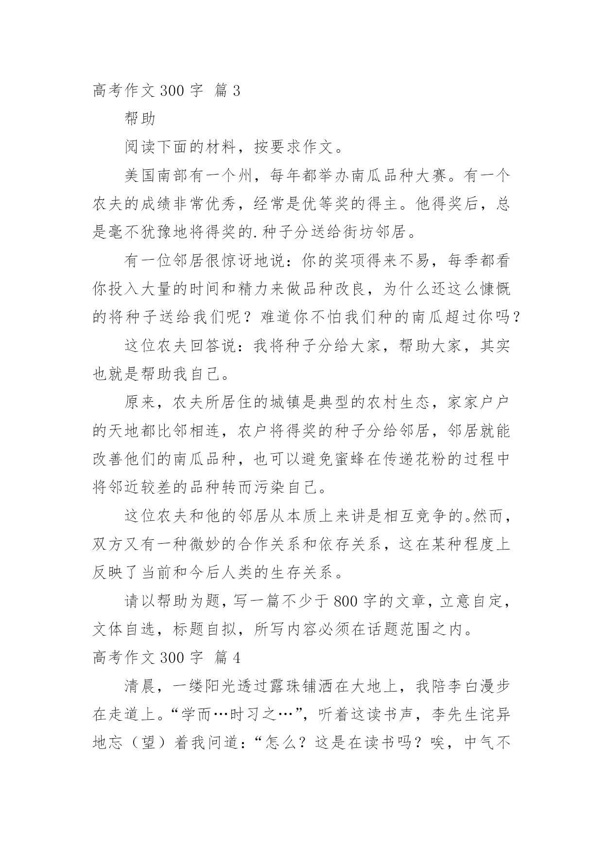 高考作文300字【推荐】高考作文300字汇总4篇在日复一日的学习、工作或生活中,大家一定都接触过作文吧,作文一定要做到主题集中,围绕同一主题作深入阐述,切忌东拉西扯,主题涣散甚至无主题。为了让您在写作文时更加简单方便,以下是小编帮大家整理的高考作文300字6篇,供大家参考借鉴,希望可以帮助到有需要的朋友。高考作文300字篇1零,是一个数学概念,在我们的习惯思维中代表着没有。然而,我们仔细一想,零并不等于什么也没有,如零度就表示一个温度值。它也不只是数学中的一个概念,在我们生活中就有“从零开始”等复杂的意蕴。从零开始,就是把过去作为起点;不能从零开始,就是超越已经走过的历史。两者说法不一,前者是假定的,后者是实在的。能否从零开始,就看你从什么角度去分析问题,是现实的还是哲学的,只要言之成理即可。我们可以选择一些被人们忽视的`、看似简单平凡的琐事小事,以“零”为切入口,写出一篇蕴涵着生活哲理的好文章。比如,成功是每个人都渴望的最美好的境界,成功意味着事业有成,人生有了收获。但要取得成功,必须经历一番风雨,经受一番磨难。如何对待这些风雨和磨难;成功以后如何看待取得的成就;是从失败中崛起,走向成功,还是忘记过去,“从零开始”,创造永远的新天地?据此可以写成一篇议论文,发表自己的看法。在追求成功的过程中,你遇到了哪些坎坷,你克服了哪些困难,你获得什么启发,是如何“从零开始”的,把这些经历写成一篇记叙文,既扣题意,又真实而生动。当然还可以通过编写童话、神话、寓言故事、小小说等来表现有关“从零开始”的各种哲理。高考作文300字篇2我为上暑假补习班,6点半就起了床,却发现爸爸不在家里,不知去哪里了?急忙去问妈妈,妈妈说:“爸爸送货去了。”平时七点钟上学,没有注意爸爸要起这么早送货,原以为消瘦的爸爸是在减肥?原来爸爸每天工作都那么忙,白天要送货,晚上还要加班加点清点货物,每天都要熬到夜里11点多钟。不仅爸爸累极了,妈妈也挺辛苦的,每天除了家务活外,还要照顾门市上的生意、随时给人家发货,在忙还要抽出时间接送我和弟弟上学放学,平时一点点空闲都没有,看着爸爸妈妈如此不顾身体的忙碌,我忧的是他们的身体,愁的是自己何时才能长大,能够为他们分担一些负担。补习班放学,我回到家,看见爸爸还没有回来,妈妈一人在门市发货,我就放下书包,拿两只干净的.茶杯,为爸爸泡了一杯绿茶,为妈妈泡了一杯奶茶,不声不响的放到他们的办公桌上。然后在去做一些自己力所能及的家务,帮他们减轻一点负担。看着爸爸妈妈开心喝着我给他们泡的茶,我好开心,午睡后醒来,爸爸妈妈都在我脸上留下深深的一吻。高考作文300字篇3帮助阅读下面的材料,按要求作文。美国南部有一个州,每年都举办南瓜品种大赛。有一个农夫的成绩非常优秀,经常是优等奖的得主。他得奖后,总是毫不犹豫地将得奖的.种子分送给街坊邻居。有一位邻居很惊讶地说:你的奖项得来不易,每季都看你投入大量的时间和精力来做品种改良,为什么还这么慷慨的将种子送给我们呢?难道你不怕我们种的南瓜超过你吗?这位农夫回答说:我将种子分给大家,帮助大家,其实也就是帮助我自己。原来,农夫所居住的城镇是典型的农村生态,家家户户的天地都比邻相连,农户将得奖的种子分给邻居,邻居就能改善他们的南瓜品种,也可以避免蜜蜂在传递花粉的过程中将邻近较差的品种转而污染自己。这位农夫和他的邻居从本质上来讲是相互竞争的。然而,双方又有一种微妙的合作关系和依存关系,这在某种程度上反映了当前和今后人类的生存关系。请以帮助为题,写一篇不少于800字的文章,立意自定,文体自选,标题自拟,所写内容必须在话题范围之内。高考作文300字篇4清晨,一缕阳光透过露珠铺洒在大地上,我陪李白漫步在走道上。“学而…时习之…”,听着这读书声,李先生诧异地忘(望)着我问道:“怎么?这是在读书吗?唉,中气不足,没有意蕴。”我慌忙解释道:“是这样的,先生,同学们积极奋考,晚上学得太累,所以精神不佳。”李先生一眼望去,同学们趴的趴着,就几个撑着脑袋在摇头晃脑地念叨着。李白一步冲入教室,拿着直尺就“啪、啪”几下,同学们一脑狐疑地望着他。李白清了清嗓子:“你们看看,这哪有一点读书人的'样?一日之际(计)在于晨,早晨就应该大声地朗读出来,就是我,也不敢不每天坚持晨读。孩子们,学习是一个循序渐进的过程,急不得,早晨再累也必须打起精神,不然一天就毁了!”“学而时习之……”,响亮的声音飘满在校园,李白也露出了满意的笑容。