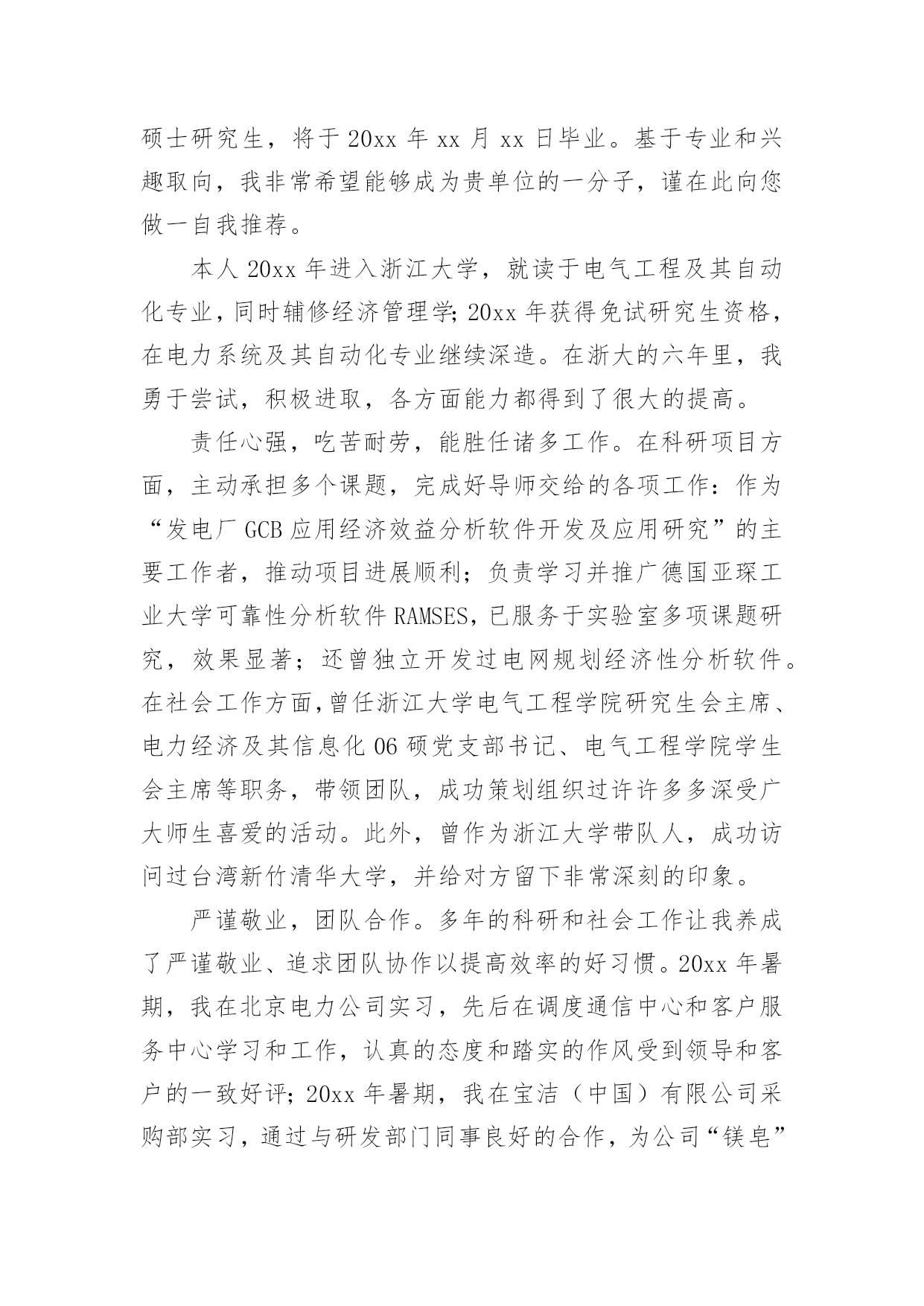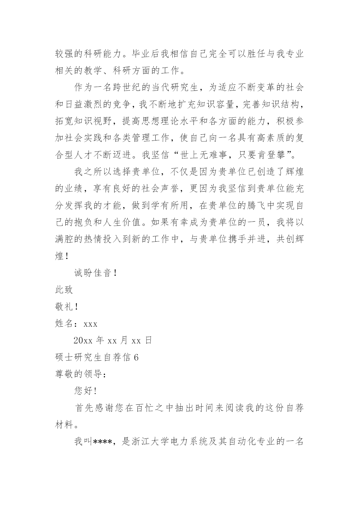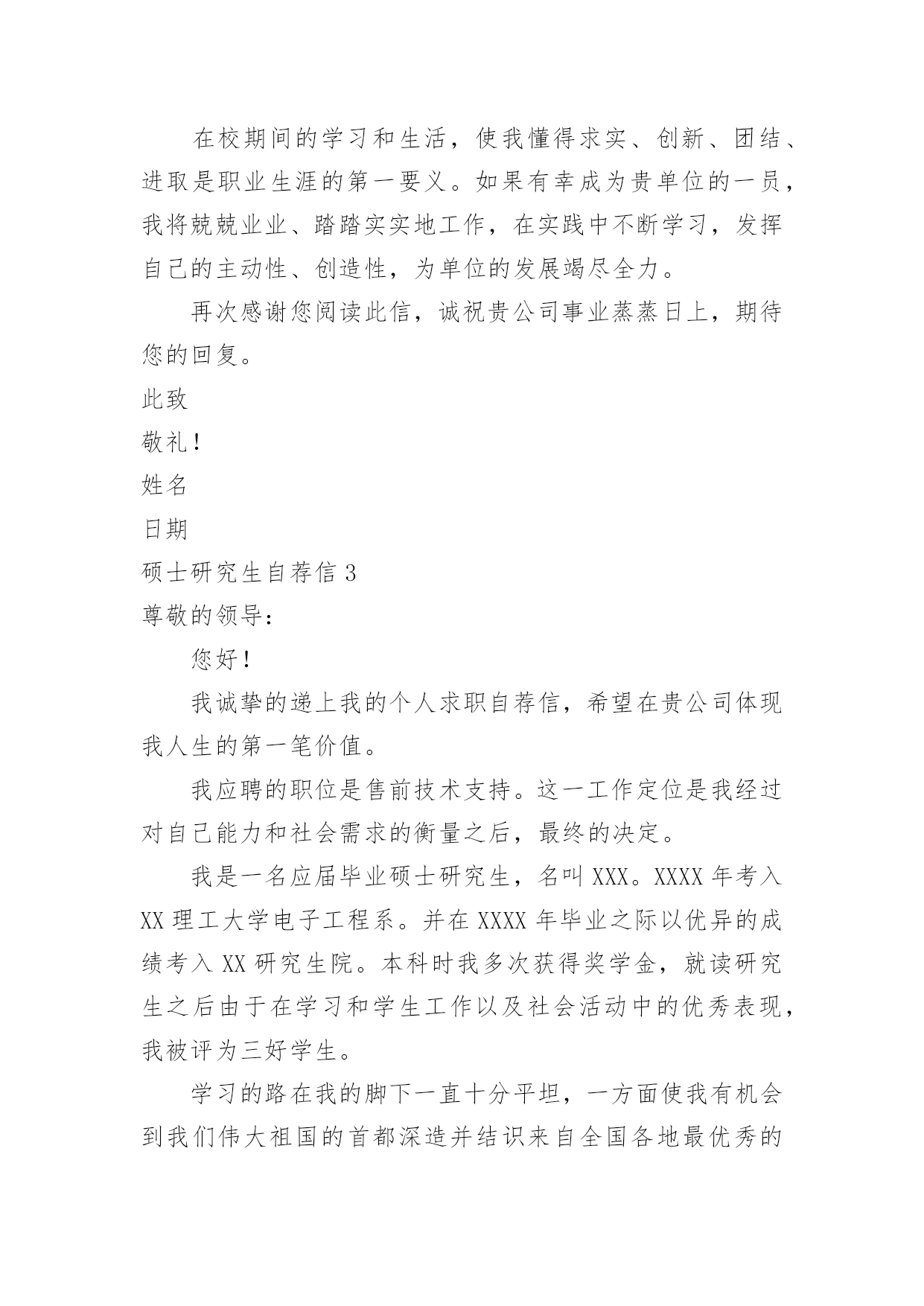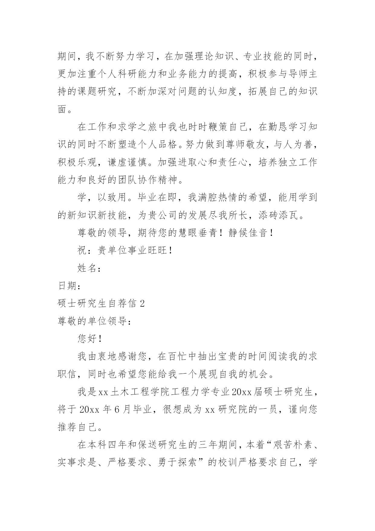 硕士研究生自荐信硕士研究生自荐信在当下的社会中,自荐信对我们的作用越来越大,要注意自荐信在写作时具有一定的格式。为了让您不再为写自荐信头疼,下面是小编精心整理的硕士研究生自荐信,希望能够帮助到大家。硕士研究生自荐信1尊敬的单位领导:您好!首先真诚地感谢您在万忙之中垂阅我的自荐书!我叫胡正,是华东理工大学先进材料与制备技术专业20xx级硕士研究生,即将于20xx年3月毕业,我衷心希望能成为贵单位的一员!20xx年我本科毕业于全国综合性重点大学湘潭大学应用化学系。在踏出校门,融入社会的两年里,我先后在宏仁集团与富士康集团工作。我在工作实践中不断的充实自己,同时我深刻认识到实践有赖于知识,深感自身专业知识的匮乏。为了掌握更多的知识,让自己走得更远更好,我在工作之余,刻苦的坚持研究生入学考试的复习,“一份耕耘,一份收获”,我最终以优异的成绩得以公费就读化工名校华东理工大学先进材料与制备技术专业。机会得来不易,研究生期间,我不断努力学习,在加强理论知识、专业技能的同时,更加注重个人科研能力和业务能力的提高,积极参与导师主持的课题研究,不断加深对问题的认知度,拓展自己的知识面。在工作和求学之旅中我也时时鞭策自己,在勤恳学习知识的同时不断塑造个人品格。努力做到尊师敬友,与人为善,积极乐观,谦虚谨慎。加强进取心和责任心,培养独立工作能力和良好的团队协作精神。学,以致用。毕业在即,我满腔热情的希望,能用学到的新知识新技能,为贵公司的发展尽我所长,添砖添瓦。尊敬的领导,期待您的慧眼垂青!静候佳音!祝:贵单位事业旺旺!姓名:日期:硕士研究生自荐信2尊敬的单位领导:您好!我由衷地感谢您,在百忙中抽出宝贵的时间阅读我的求职信,同时也希望您能给我一个展现自我的机会。我是xx土木工程学院工程力学专业20xx届硕士研究生,将于20xx年6月毕业,很想成为xx研究院的一员,谨向您推荐自己。在本科四年和保送研究生的三年期间,本着“艰苦朴素、实事求是、严格要求、勇于探索”的校训严格要求自己,学习刻苦,工作认真,成绩优秀,年年获得奖学金,并积极参加社会实践。系统地学习专业知识的同时广泛地涉猎了大量书籍,不断拓宽知识面和社会阅历,积极参与生产和科研项目。严谨敬业,团队合作。多年的科研和社会工作让我养成了严谨敬业、追求团队协作以提高效率的好习惯。20xx年暑期,我在xx公司实习,先后在调度通信中心和客户服务中心学习和工作,认真的态度和踏实的作风受到领导和客户的一致好评;20xx年暑期,我在xx有限公司采购部实习,通过与研发部门同事良好的合作,为公司xx项目的主要原料Mg(OH)2找到三家合适的供货商,并供货至今;作为“xx电力公司‘十一五’电网发展规划”的参与者,配合师兄很好地完成了负荷预测、经济分析、绘制网架示意图、编写文本等工作,使项目顺利通过上级有关部门验收。本人品学兼优,成绩显著。多年的刻苦努力,让我取得了许多成果。多次获得浙江大学优秀学生干部、三好学生、社会实践优秀个人等荣誉称号,优秀学生、研究与创新等多项奖学金,20xx年被评为xx大学优秀毕业生、优秀毕业论文。我的计算机和英语水平良好。计算机通过了计算机国家二级,能熟练地运用VB、VC、Fortran语言编制程序,并为同学和自己编制过不少实用的程序;能熟练使用AutoCAD、ANSYS、Flac、Abaqus等专业软件。英语通过了大学英语四级考试,能比较熟练的阅读行业资料。在校期间的学习和生活,使我懂得求实、创新、团结、进取是职业生涯的第一要义。如果有幸成为贵单位的一员,我将兢兢业业、踏踏实实地工作,在实践中不断学习,发挥自己的主动性、创造性,为单位的发展竭尽全力。再次感谢您阅读此信,诚祝贵公司事业蒸蒸日上,期待您的回复。此致敬礼!姓名日期硕士研究生自荐信3尊敬的领导:您好!我诚挚的递上我的个人求职自荐信,希望在贵公司体现我人生的第一笔价值。我应聘的职位是售前技术支持。这一工作定位是我经过对自己能力和社会需求的衡量之后,最终的决定。我是一名应届毕业硕士研究生,名叫XXX。XXXX年考入XX理工大学电子工程系。并在XXXX年毕业之际以优异的成绩考入XX研究生院。本科时我多次获得奖学金,就读研究生之后由于在学习和学生工作以及社会活动中的优秀表现,我被评为三好学生。学习的路在我的脚下一直十分平坦,一方面使我有机会到我们伟大祖国的首都深造并结识来自全国各地最优秀的老师和同龄人,并使我的眼界大开;另一方面也限制了我的思考,让我总是在学校温暖的怀抱里自认为是天之骄子。以为自己学习好,并一直从事学生工作就可以满足社会的需求,是个有能力的人。直到我的朋友开始走向社会。看着他们的变化,听着他们的见闻,我才意识到自己还只是一个学生,距离社会的需求还有一定的距离。所以我一直找各种机会希望在毕业前完成自身的职业化转变。XXXX